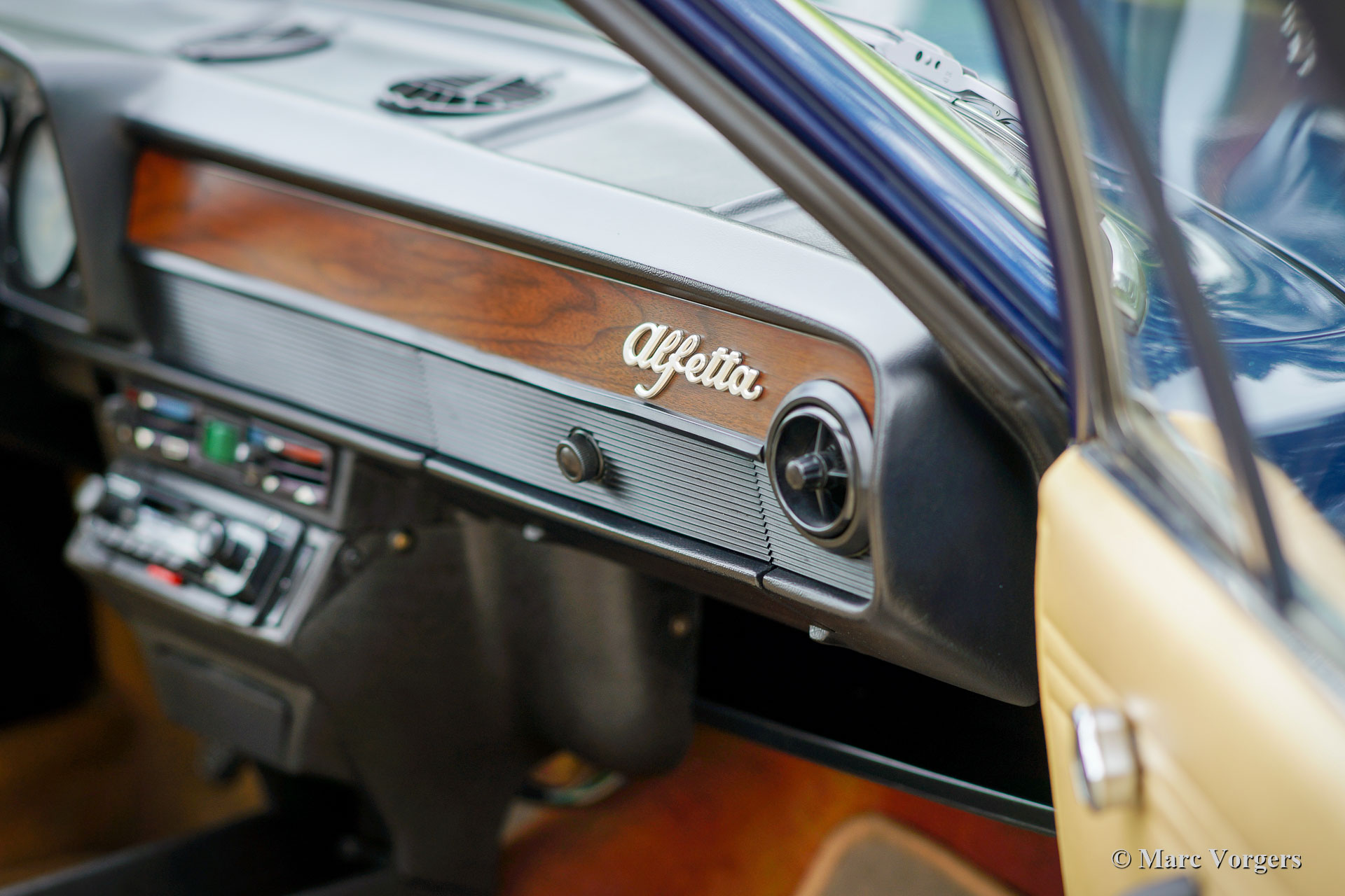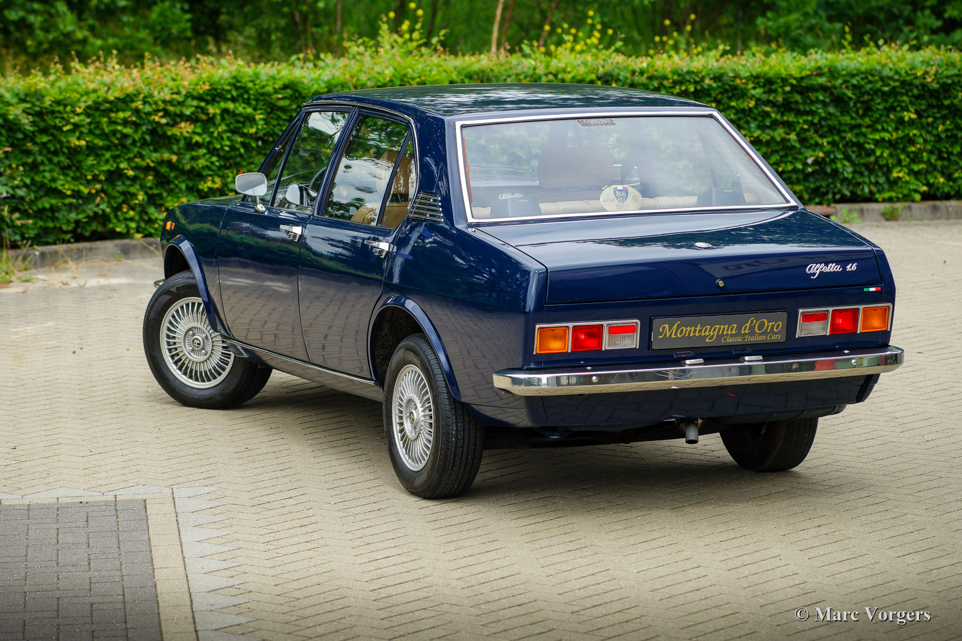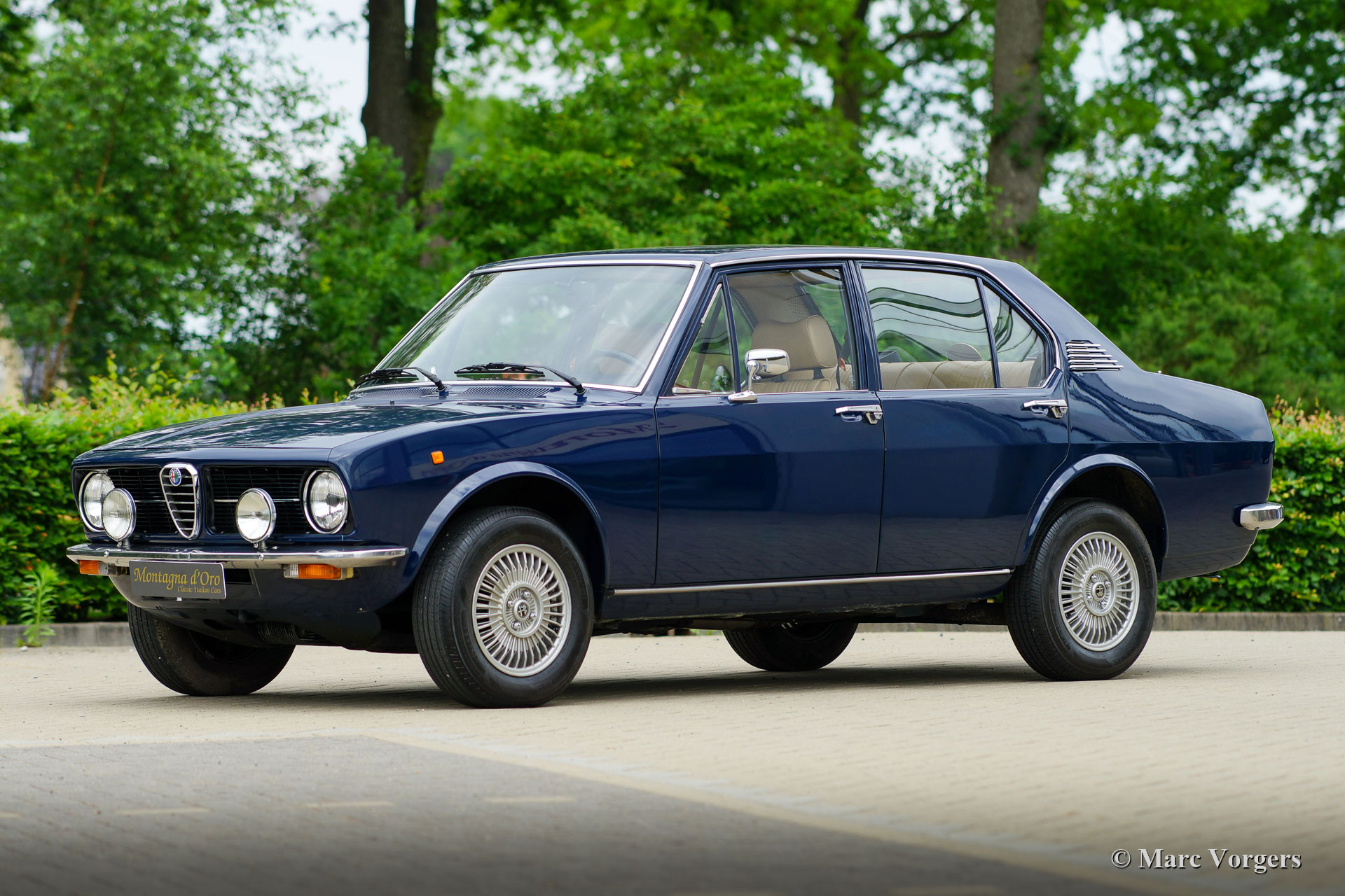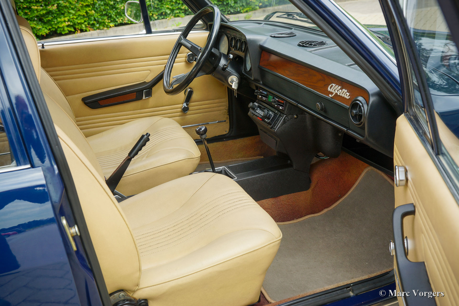 Alfa Romeo Alfetta 1600, Jahr 1976. Farbe dunkelblau (Bleu Olandese) kombiniert mit einem beigen Kunstlederinterieur, braunem Teppich und grauen Schutzmatten mit beigem Rand. Als der Alfa Romeo Alfetta 1972 vorgestellt wurde, war er die erste mittelgroße Alfa-Limousine seit zehn Jahren. Alfa Romeo führte beim Alfetta das neue hinten montierte „Transaxle“-Getriebe ein, das eine nahezu perfekte 50/50-Gewichtsverteilung ermöglichte. Zusammen mit der Einzelradaufhängung, dem sportlich-starken Aluminium-Twin-Cam-Motor, den Scheibenbremsen an allen vier Rädern und dem Fünfgang-Getriebe war die Alfetta eine echte Sportlimousine! Die hier präsentierte wunderschöne Alfetta der ersten Serie wurde in Italien aus der Autosammlung des 2. italienischen Besitzers gekauft. Das Auto wurde vor kurzem in Italien gewartet und die Vergaser gereinigt und überholt. Dieses super originale Exemplar befindet sich in einem sehr guten Zustand mit leichten Gebrauchs- und Altersspuren im Innenraum. Der Tachostand zeigt aktuell 94.989 km an. Dieser fantastische Alfa Romeo Alfetta 1600 wird geliefert mit italienischen Papieren und Dokumente (und einem Schild hinter der Heckscheibe) des Auto Moto Club Storico Italiano. Dies ist eine schwer zu findende Alfetta der ersten Serie in einem sehr schönen Originalzustand!
