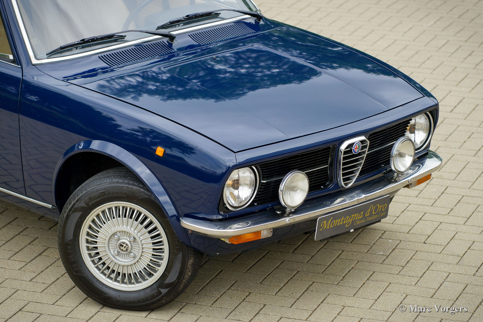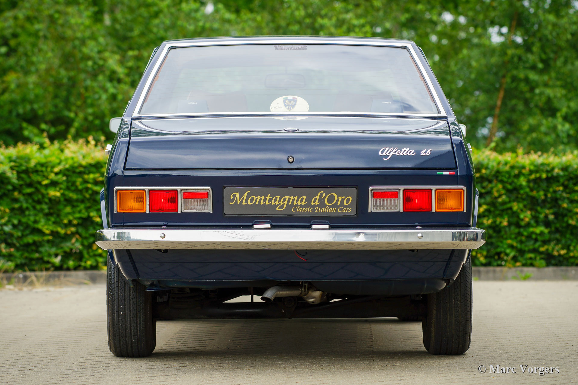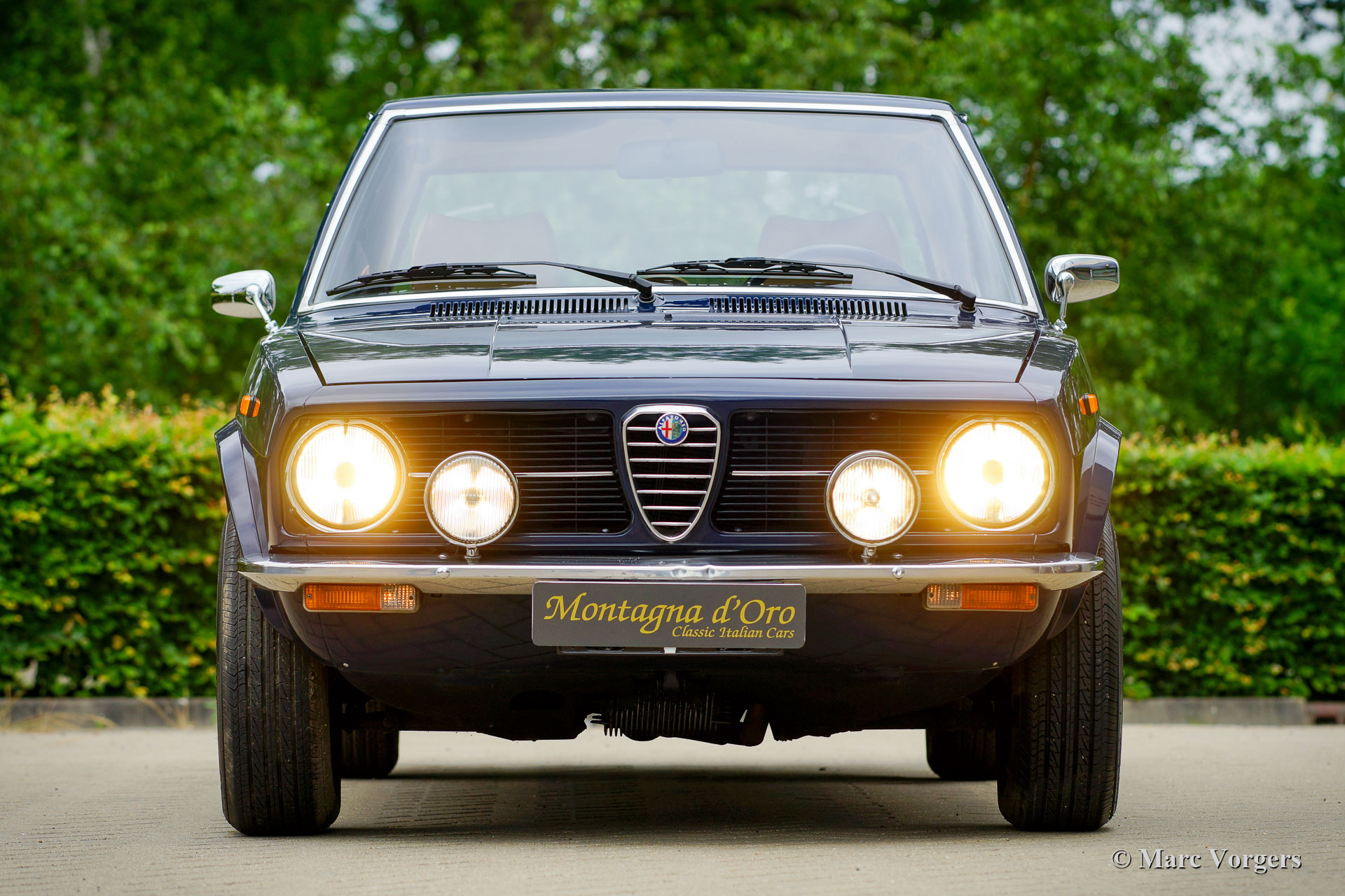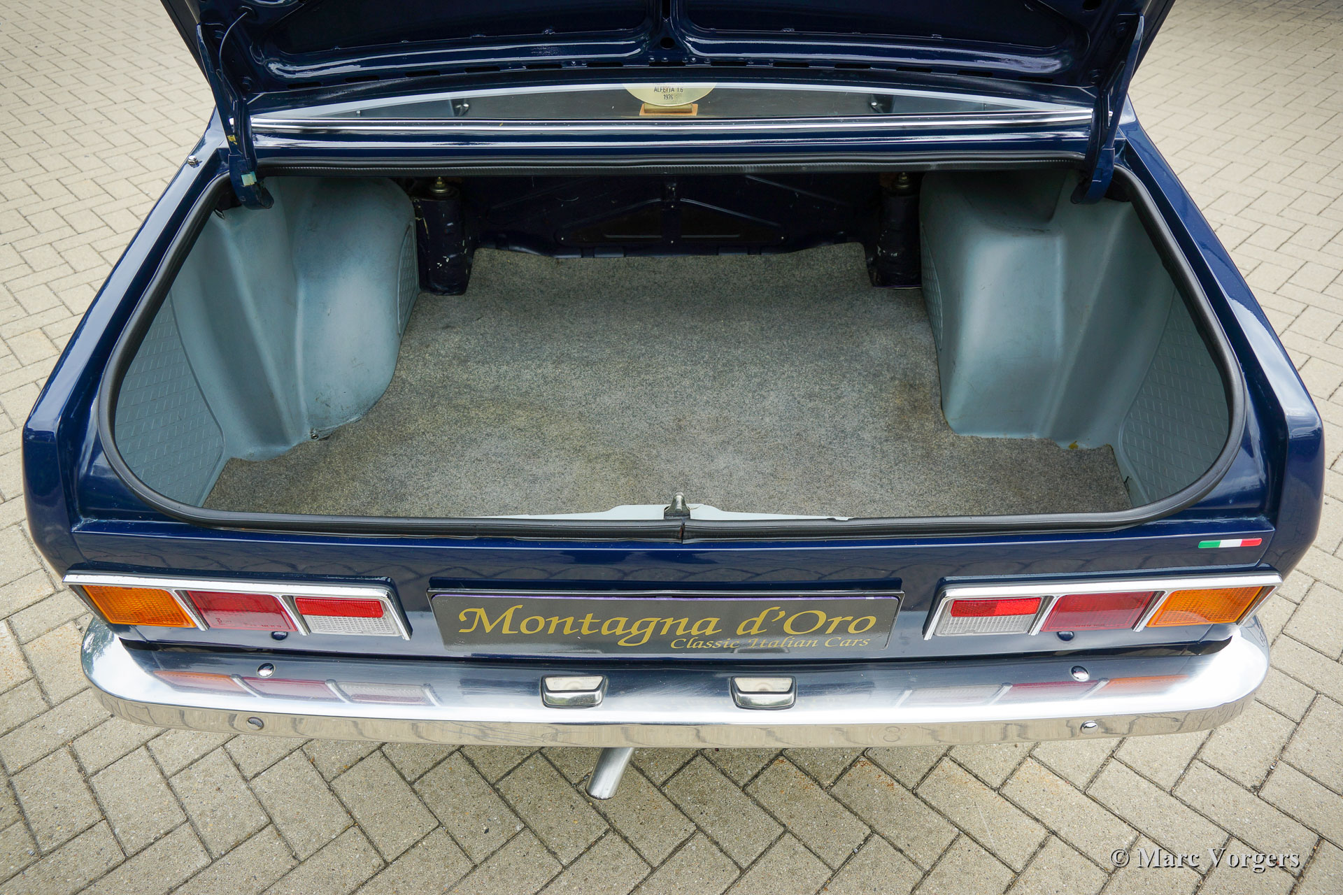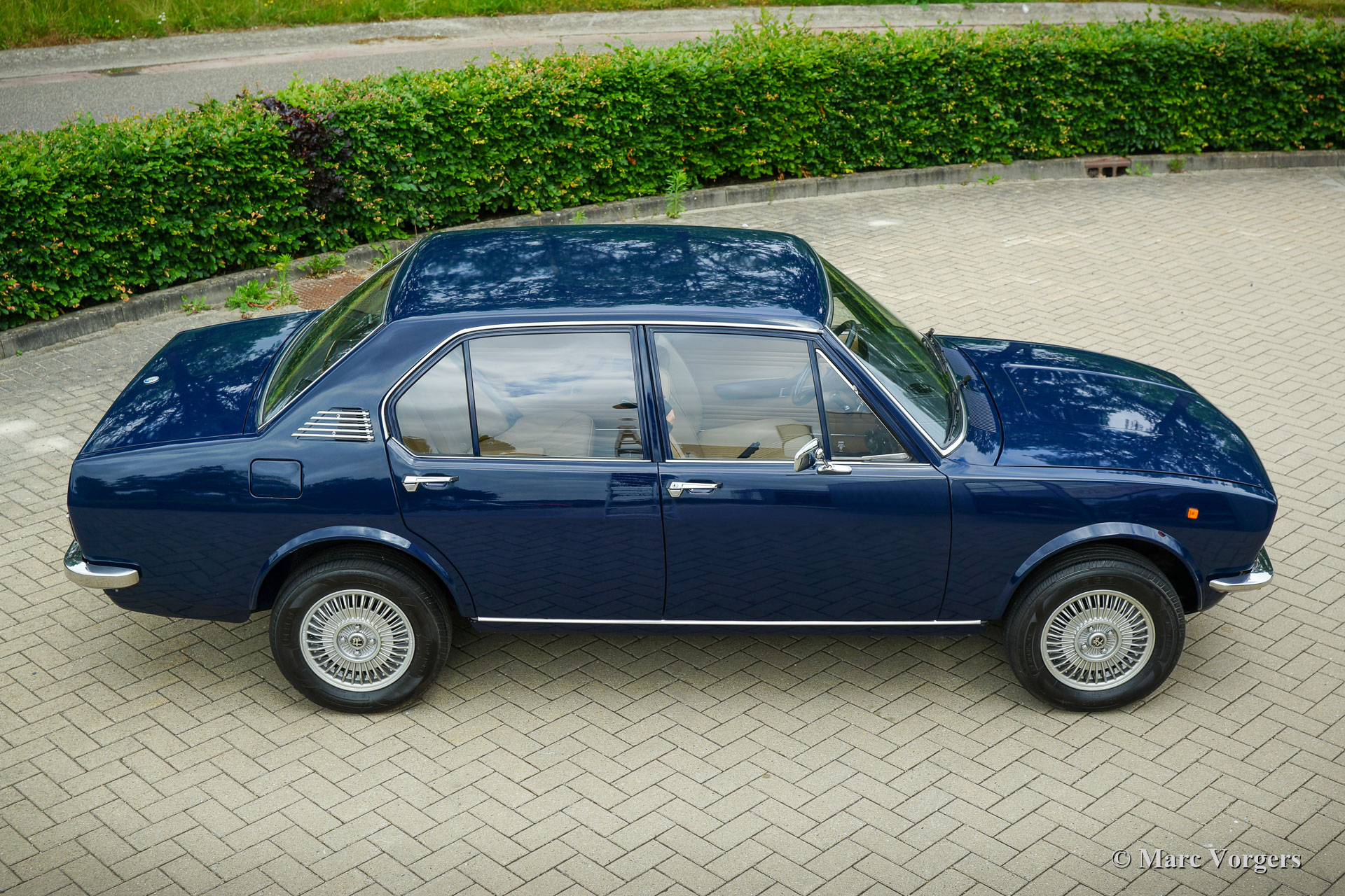 Alfa Romeo Alfetta 1600, Jahr 1976. Farbe dunkelblau (Bleu Olandese) kombiniert mit einem beigen Kunstlederinterieur, braunem Teppich und grauen Schutzmatten mit beigem Rand. Als der Alfa Romeo Alfetta 1972 vorgestellt wurde, war er die erste mittelgroße Alfa-Limousine seit zehn Jahren. Alfa Romeo führte beim Alfetta das neue hinten montierte „Transaxle“-Getriebe ein, das eine nahezu perfekte 50/50-Gewichtsverteilung ermöglichte. Zusammen mit der Einzelradaufhängung, dem sportlich-starken Aluminium-Twin-Cam-Motor, den Scheibenbremsen an allen vier Rädern und dem Fünfgang-Getriebe war die Alfetta eine echte Sportlimousine! Die hier präsentierte wunderschöne Alfetta der ersten Serie wurde in Italien aus der Autosammlung des 2. italienischen Besitzers gekauft. Das Auto wurde vor kurzem in Italien gewartet und die Vergaser gereinigt und überholt. Dieses super originale Exemplar befindet sich in einem sehr guten Zustand mit leichten Gebrauchs- und Altersspuren im Innenraum. Der Tachostand zeigt aktuell 94.989 km an. Dieser fantastische Alfa Romeo Alfetta 1600 wird geliefert mit italienischen Papieren und Dokumente (und einem Schild hinter der Heckscheibe) des Auto Moto Club Storico Italiano. Dies ist eine schwer zu findende Alfetta der ersten Serie in einem sehr schönen Originalzustand!