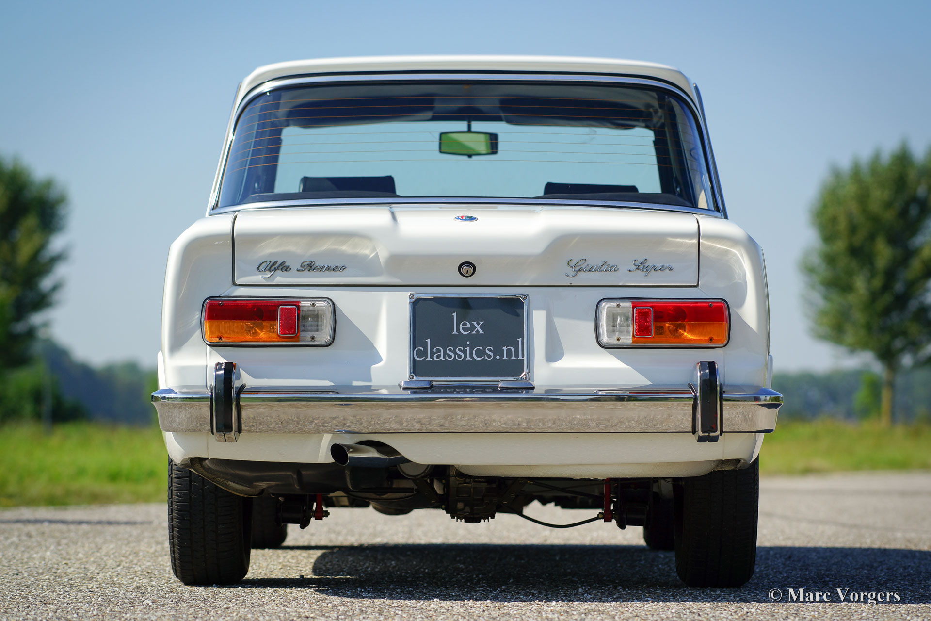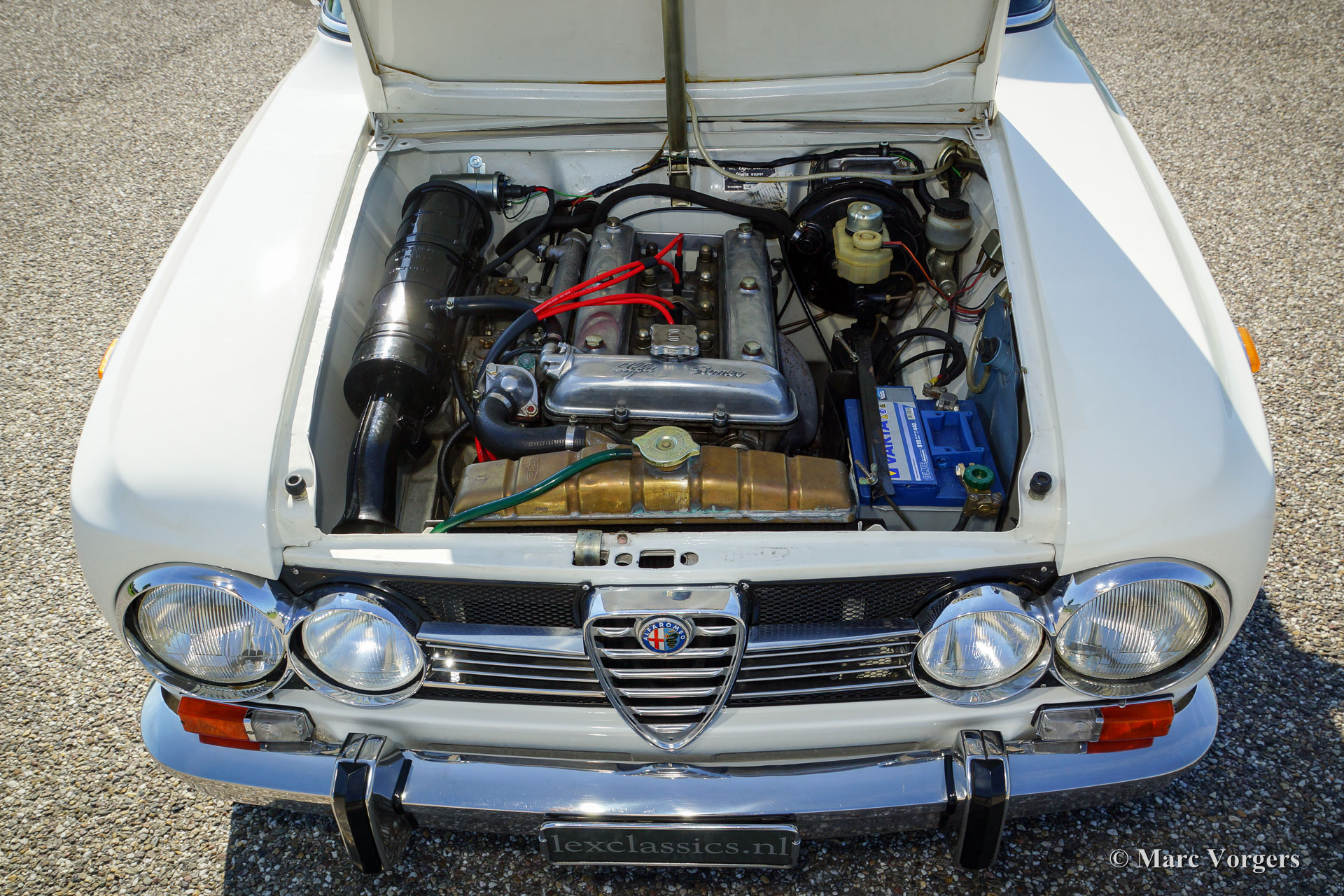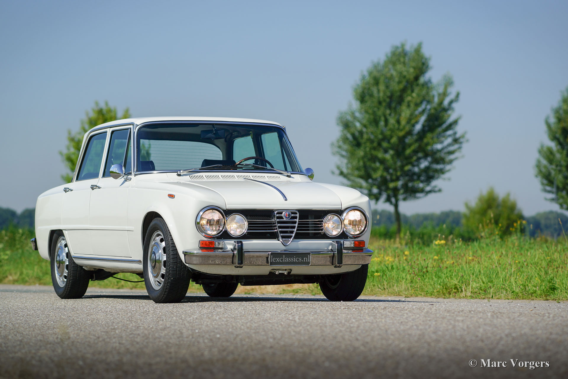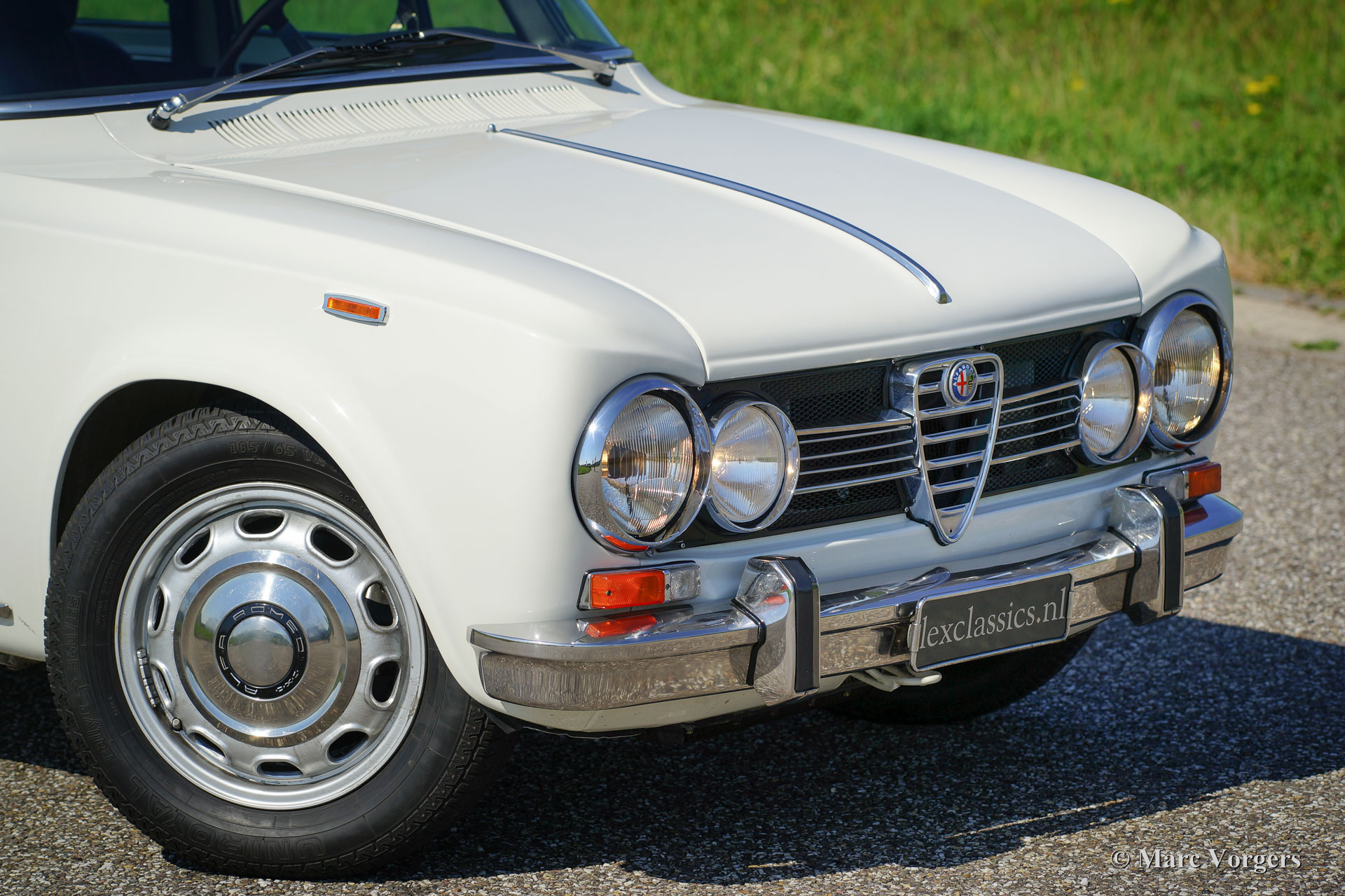 Alfa Romeo Giulia 1600 Super, Jahr 1971. Farbe Weiß (Bianco Spino) mit einem schwarzen Interieur und schwarzen Teppich. Dieser wunderschöne Alfa Romeo Giulia wurde einige Jahre her perfekt restauriert von einem deutschen Spezialisten. Bei der Restaurierung wurde der Wagen einen leistungsfähigeren Zweiliter Giulia Motor gegeben. Einige Fotos von der Restaurierung sind vorhanden. Diese Giulia ist in einem hervorragenden Top-Zustand, die Körperarbeit zeigt schöne Passungen der Blechteile, der Lack ist makellos, das Innenraum ist perfekt und unter der Motorhaube sieht alles sehr ordentlich und sauber aus. Der Zweiliter -Motor verleiht dem Fahrzeug Flügel; dieses Alfa Romeo Giulia fährt hervorragend! Das Auto verfügt über ein Lenkrad mit Holzkranz und eine fantastische Oldtimer Becker Radio. Dies ist ein Top-Exemplar!