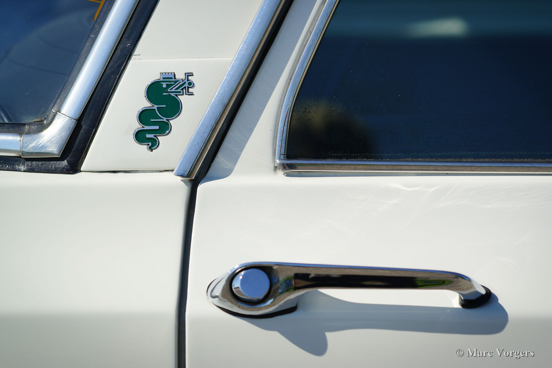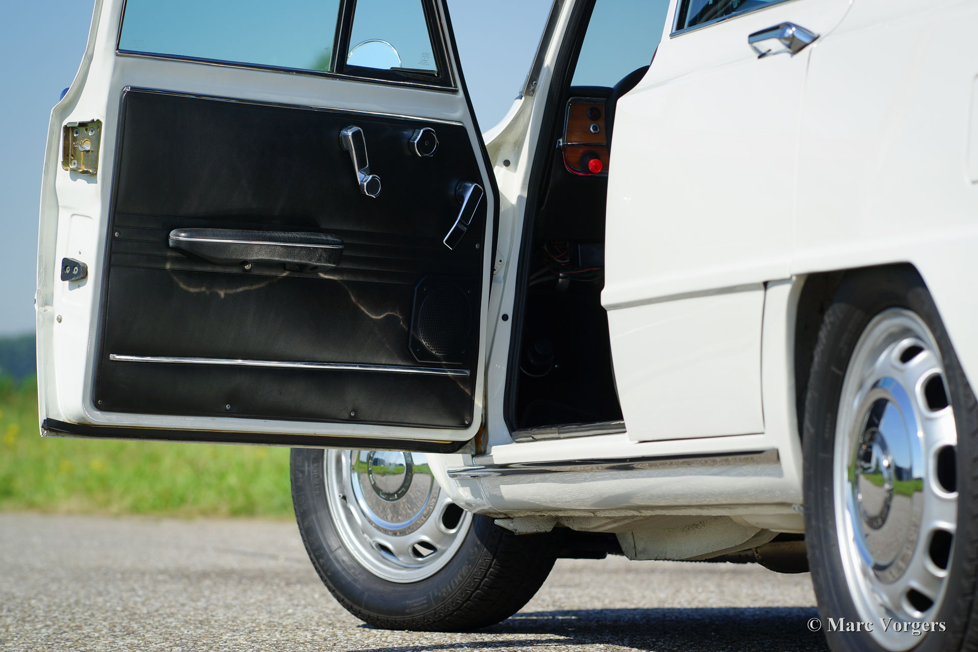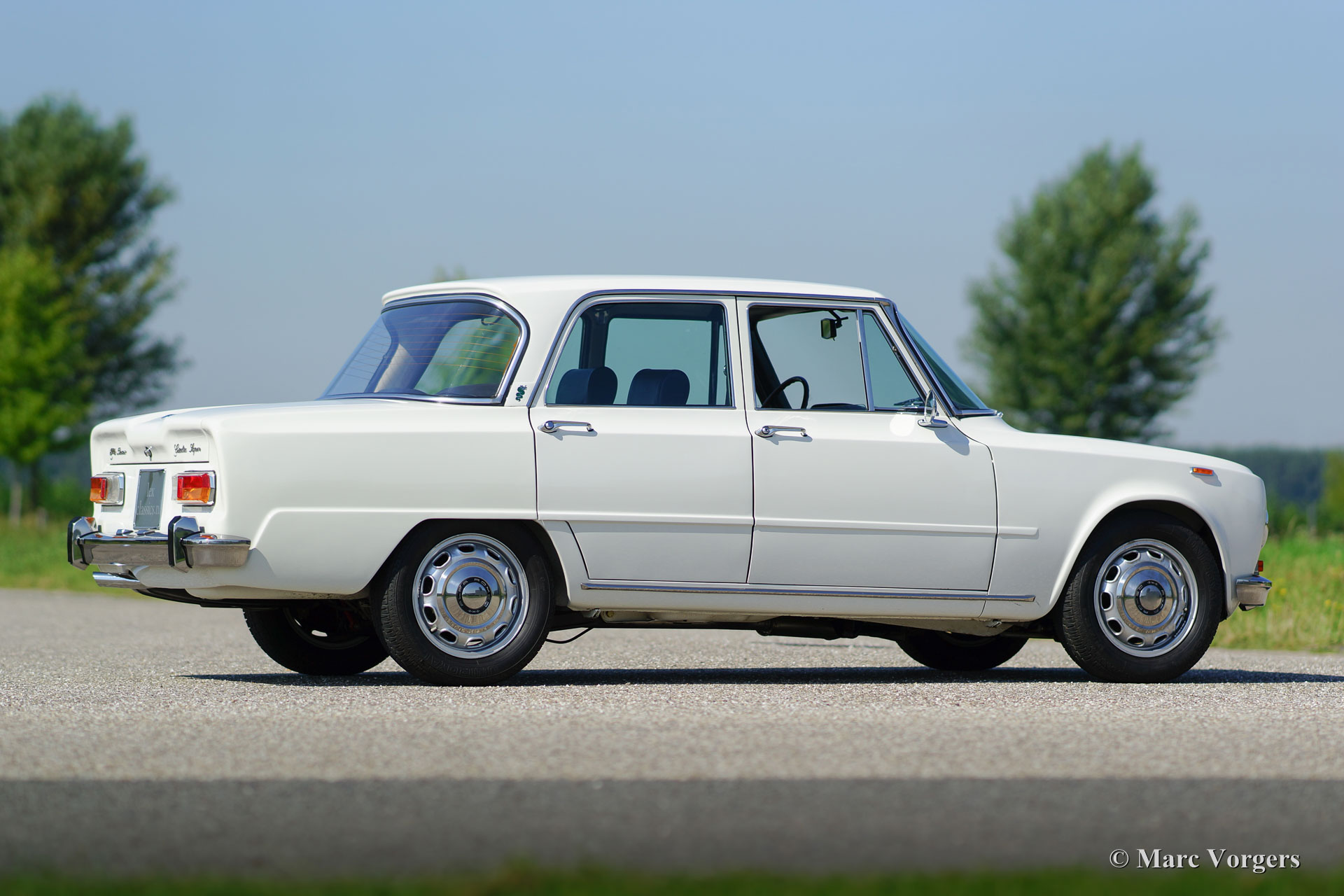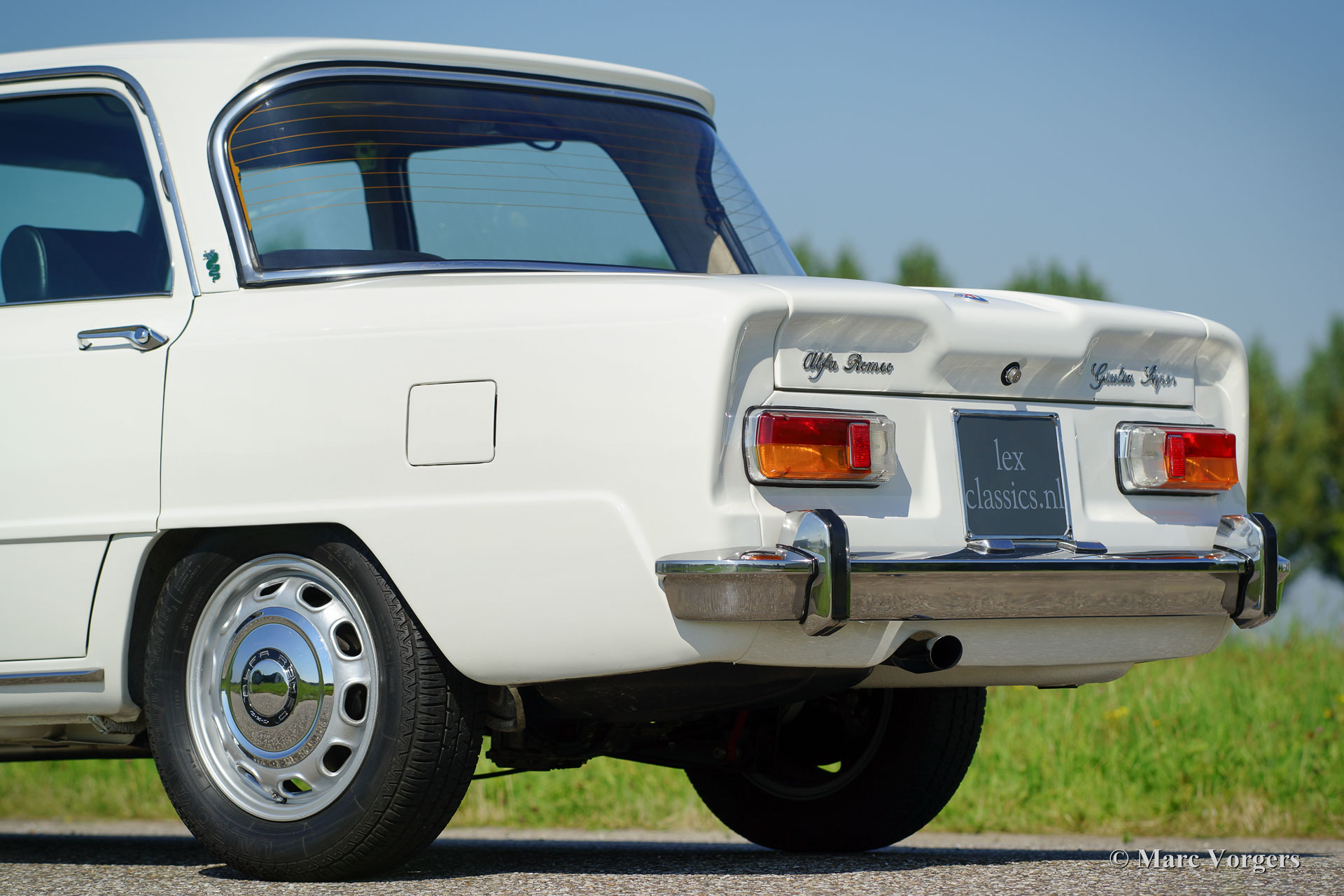 Alfa Romeo Giulia 1600 Super, Jahr 1971. Farbe Weiß (Bianco Spino) mit einem schwarzen Interieur und schwarzen Teppich. Dieser wunderschöne Alfa Romeo Giulia wurde einige Jahre her perfekt restauriert von einem deutschen Spezialisten. Bei der Restaurierung wurde der Wagen einen leistungsfähigeren Zweiliter Giulia Motor gegeben. Einige Fotos von der Restaurierung sind vorhanden. Diese Giulia ist in einem hervorragenden Top-Zustand, die Körperarbeit zeigt schöne Passungen der Blechteile, der Lack ist makellos, das Innenraum ist perfekt und unter der Motorhaube sieht alles sehr ordentlich und sauber aus. Der Zweiliter -Motor verleiht dem Fahrzeug Flügel; dieses Alfa Romeo Giulia fährt hervorragend! Das Auto verfügt über ein Lenkrad mit Holzkranz und eine fantastische Oldtimer Becker Radio. Dies ist ein Top-Exemplar!