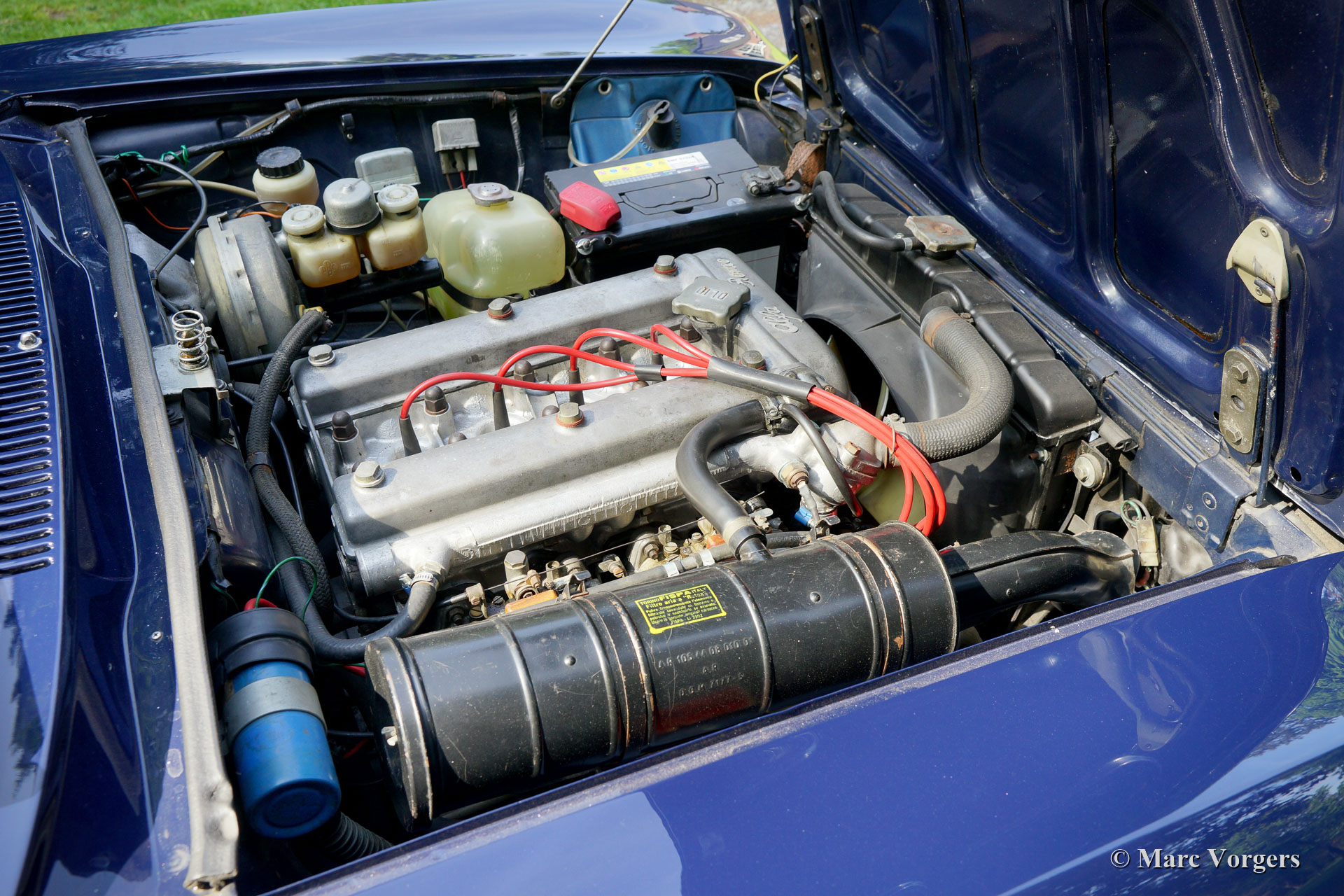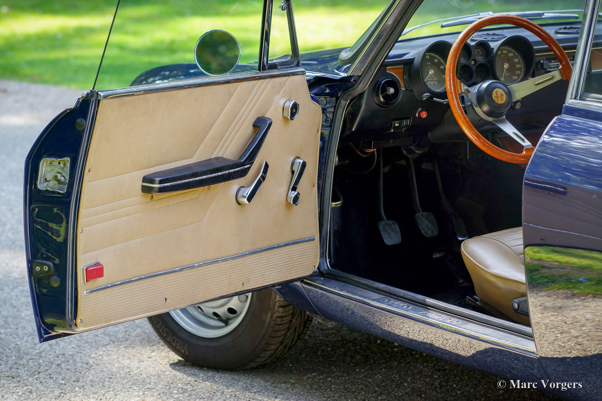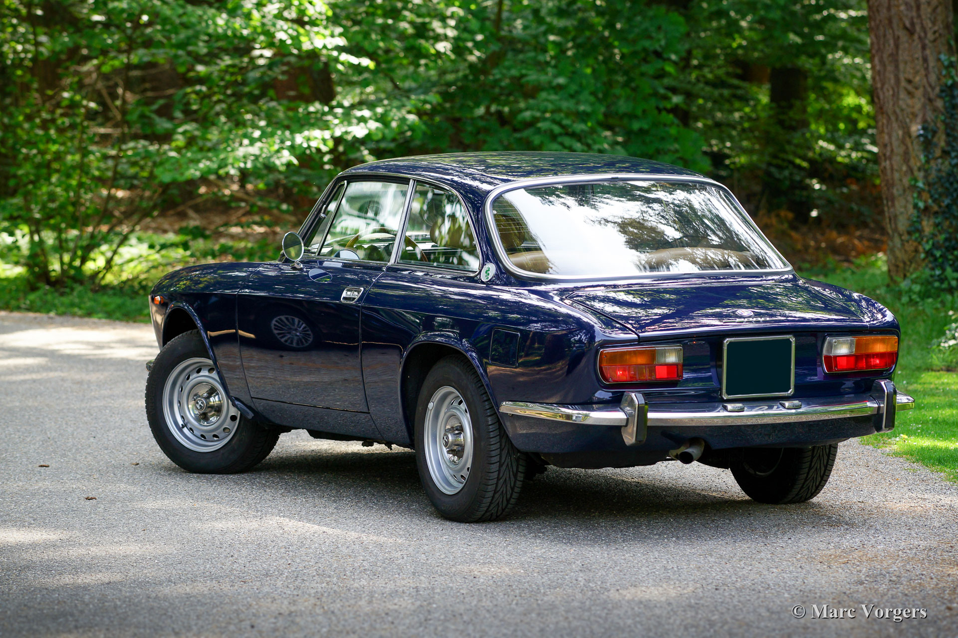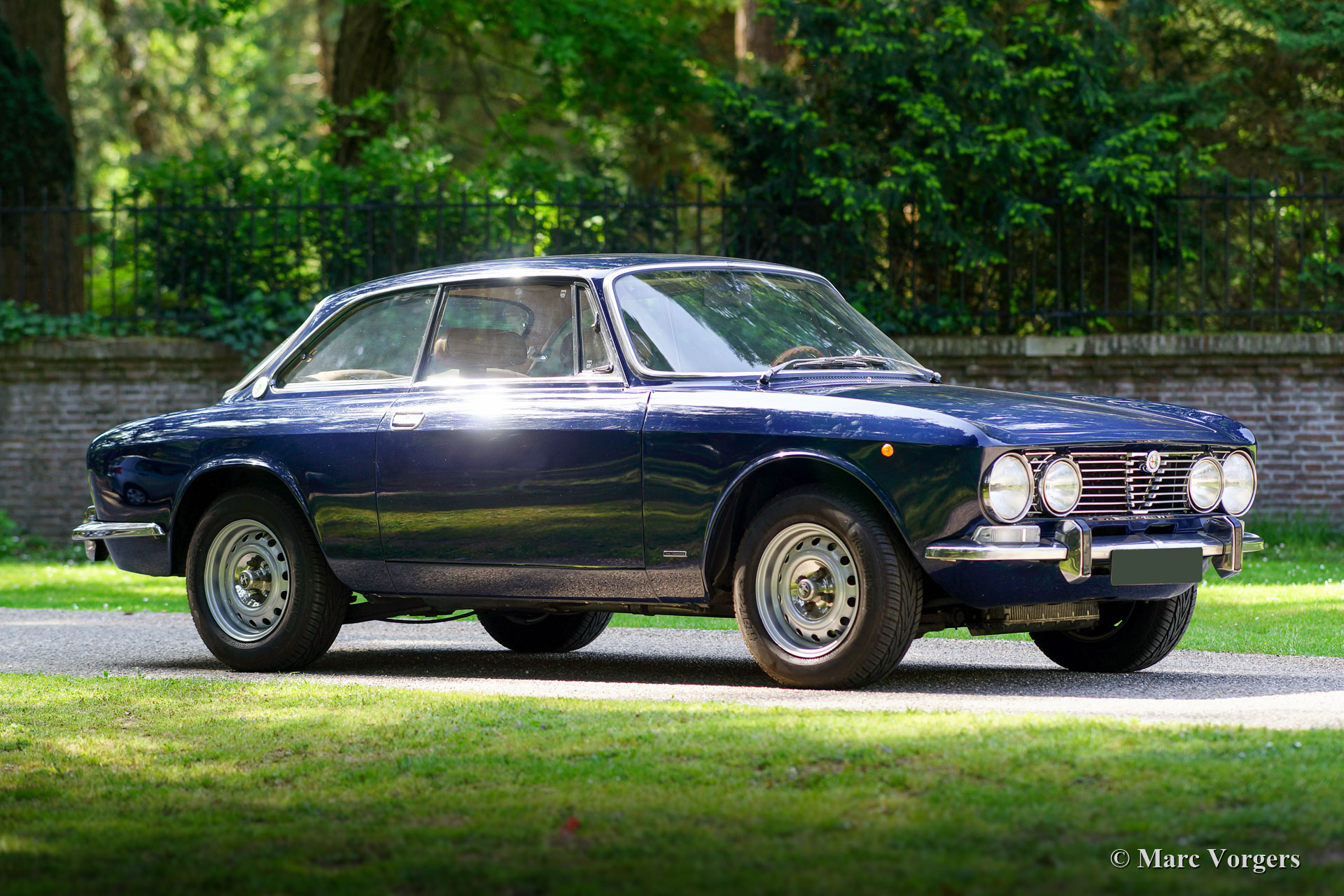 Alfa Romeo Giulia GTV 2000, jahr 1972. Farbe dunkelblau (Blu Olandese) kombiniert mit einem beigen Kunstleder Interieur und schwarzem Teppich. Dieser wunderschöne Alfa Romeo ‘Bertone’ wurde von seinem jetzigen Besitzer seit dem Jahr 2001 geschätzt. Das Auto hat mehrere Preise für Originalität auf Club- und anderen Concourse d’elegances gewonnen. Im Jahr 2005 wurde die Karosserie nach Topzustand restauriert, der blaue Lack wurde mit einer Klarlackschicht versehen und anschließend spiegelglatt poliert. Im Jahr 2009 wurden Motor und Getriebe von einem Markenspezialisten überholt. Dabei wurden ‘Fast Road‘ -Nockenwellen eingebaut. Dieser Alfa Romeo GTV 2000 zeigt alle Originaldetails, der Innenraum ist vollständig original und die Optik unter der Motorhaube hat alle Originaldetails beibehalten. Dieser GTV 2000 ist aufgrund der schönen Originalität in einem hervorragenden Zustand mit leichten Gebrauchs- und Altersspuren (Patina). Dies ist ein sehr begehrenswertes und ehrliches Exemplar und ein hervorragendes Fahrerauto!