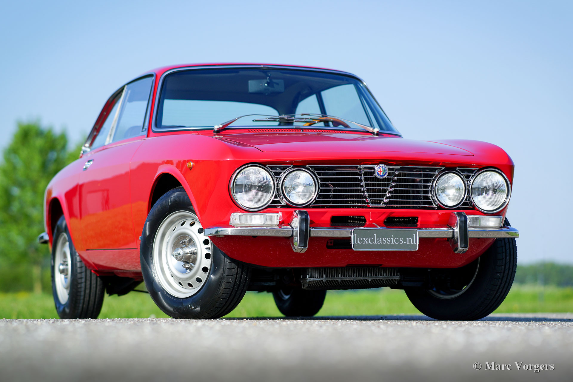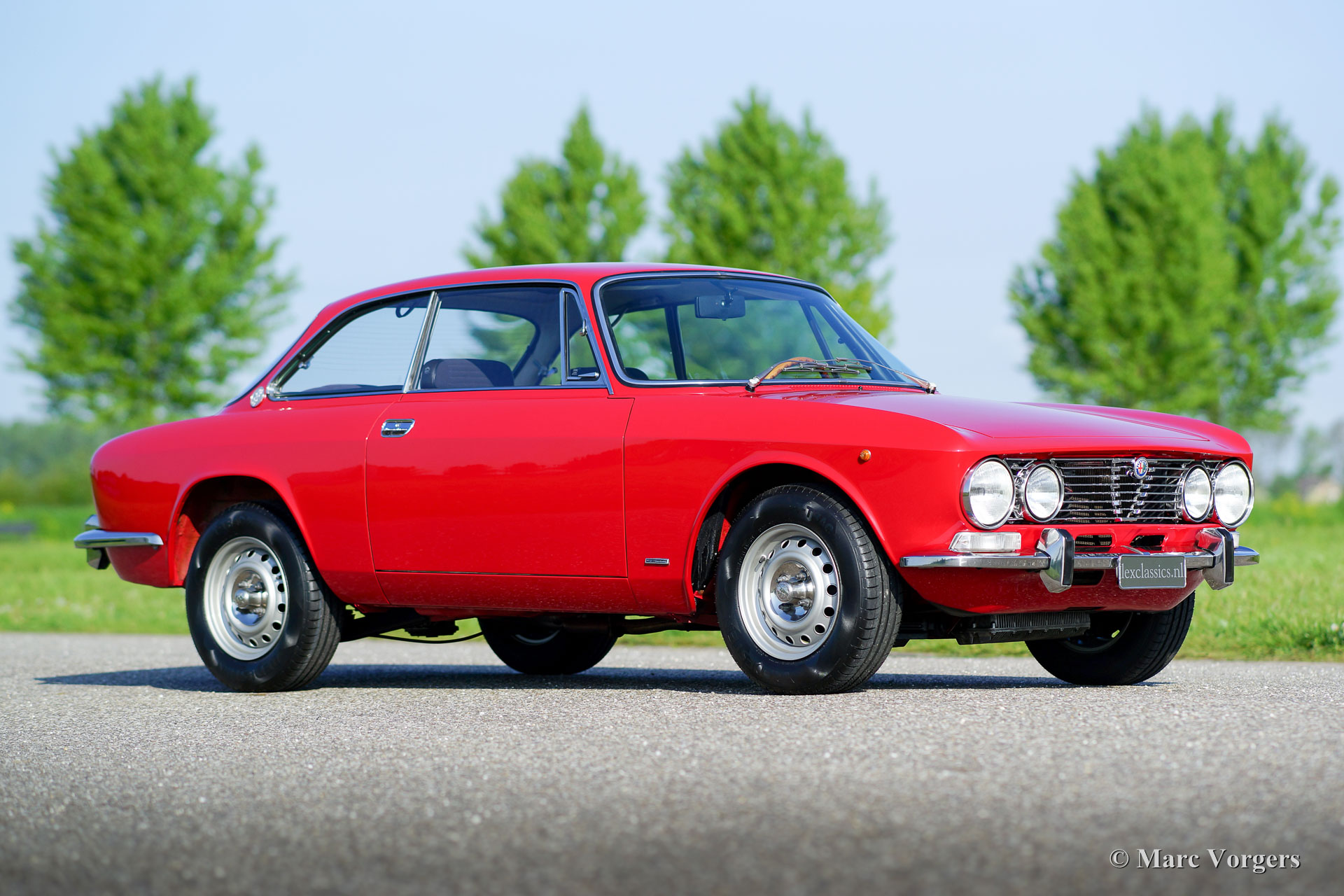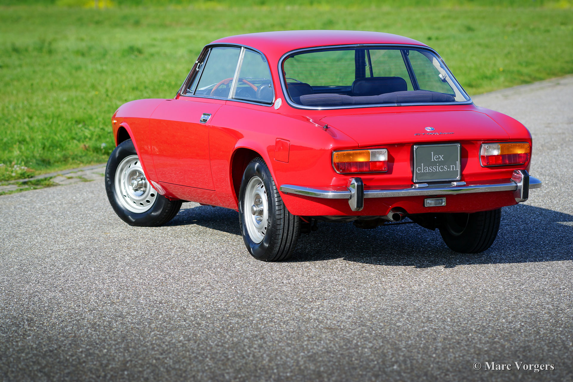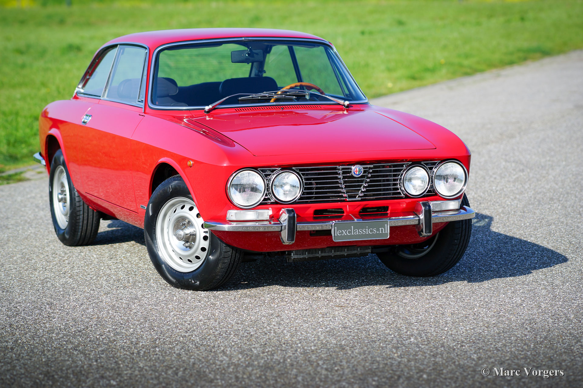 Alfa Romeo GT 1300 Junior 'Lusso', Jahr 1975. Fahrgestellnummer AR10530 * 0001302. Farbe rot (Alfa Rosso 501) mit schwarz / dunkelgrauem Kunstleder Innenraum mit Stoff Sitzverkleidungen und schwarzem Teppich. Dieser prächtige Alfa Romeo Giulia GT 1300 Junior, von Enthusiasten auch ‘Bertone‘ genannt, kommt vom ersten italienischen Besitzer! Dieser Super originale Alfa Romeo wurde vor kurzem in die Niederlande importiert. Das Auto hat von neuen nur 55.055 Kilometer gefahren! Diese Alfa feine Romeo ist in einem hervorragenden TOP-Zustand, concours! Der Körper wurde niemals angeschweißt, nichts wurde wiederhergestellt, das Auto wurde nur mal neu lackiert in der Originalfarbe! Diese wunderschöne ‘Bertone‘ zeigt alle originalen Details, die Original-Werkzeug-Set ist vorhanden wie auch die Original-Broschüren. Das Auto ist mit einer ganz schönen klassischen Grundig Radio ausgestattet. Dieser GT 1300 Junior ist ein sogenanntes ‘Lusso‘ (Deluxe) Modell. Dies ist das letzte Modell der Serie mit dem Innenraum, dem Schallschutz, dem Kühlergrill, den Rückleuchten und den Stoßfängern des Topmodell Giulia GTV 2000. Diese Art von super Originalität, und nie Restaurierte klassischen Autos in exzellenten bis Top-Zustand sind die heiligen Gral für ernsthafte Enthusiasten und Sammler. Eben eine Top-Restaurierung kann nie an den Scharm der Originalität herankommen.