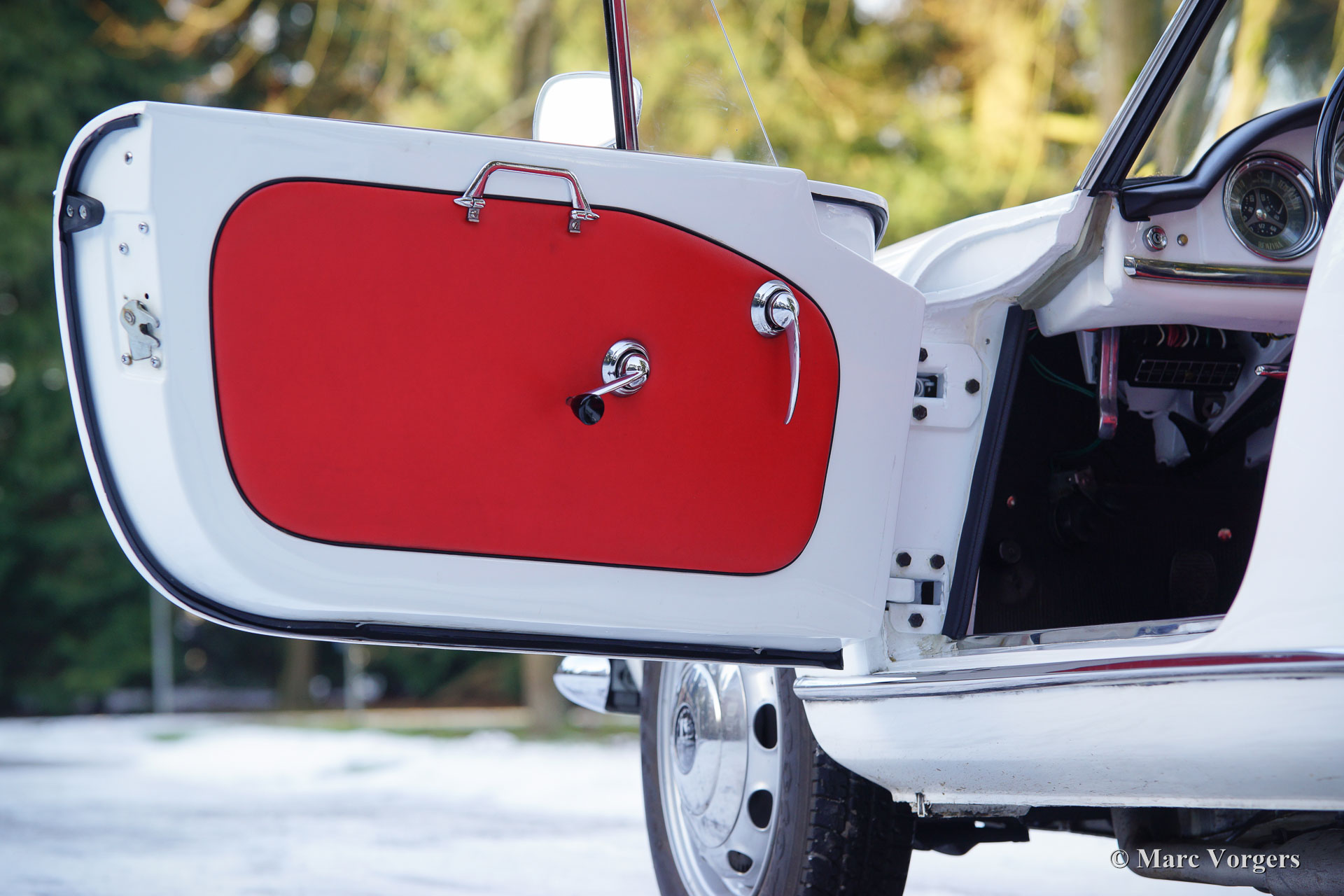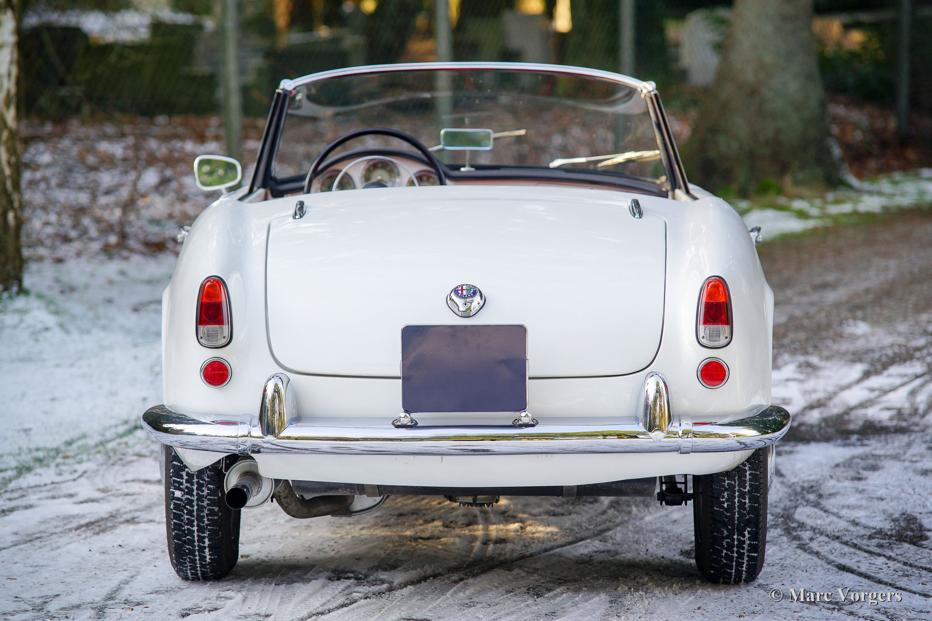 Alfa Romeo Giulietta Spider, Jahr 1960. Erster Strassenzulassung 1961. Farbe Weiß mit einem roten Interieur. Diese sehr schöne Alfa Romeo Giulietta wurde ‘body-off‘ restauriert in der Schweiz vor sieben Jahren. Das Auto ist in einem hervorragenden Zustand und das Auto fährt absolut vorbildlich! Seit dem Abschluss der Wiederherstellung hat der Wagen etwa 4000 Kilometer gefahren. Viele Fotos von dieser gründlichen Restaurierung sind vorhanden. Das Auto kommt mit seinem ursprünglichen Hardtop in Wagenfarbe.