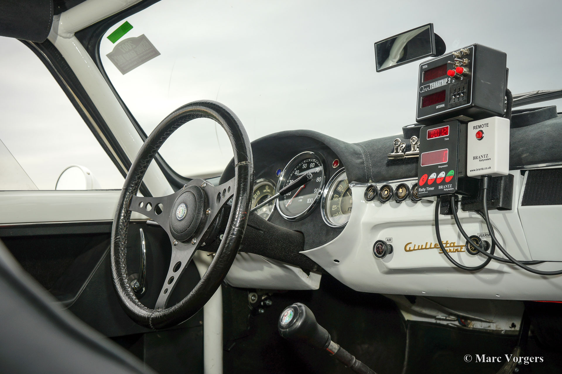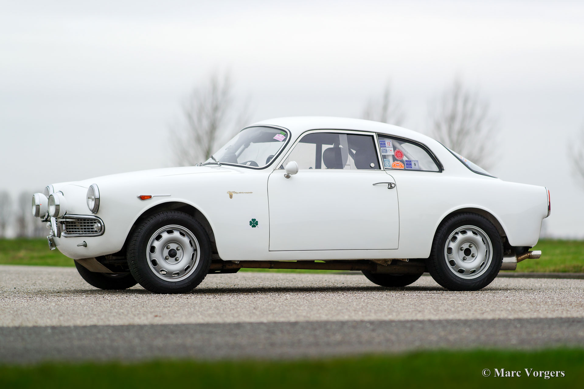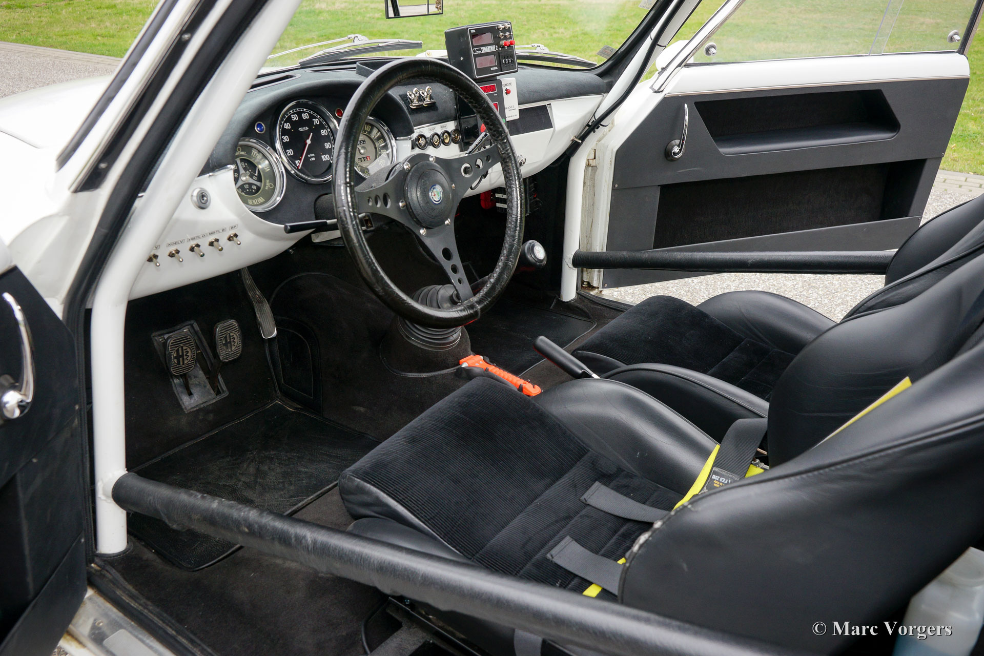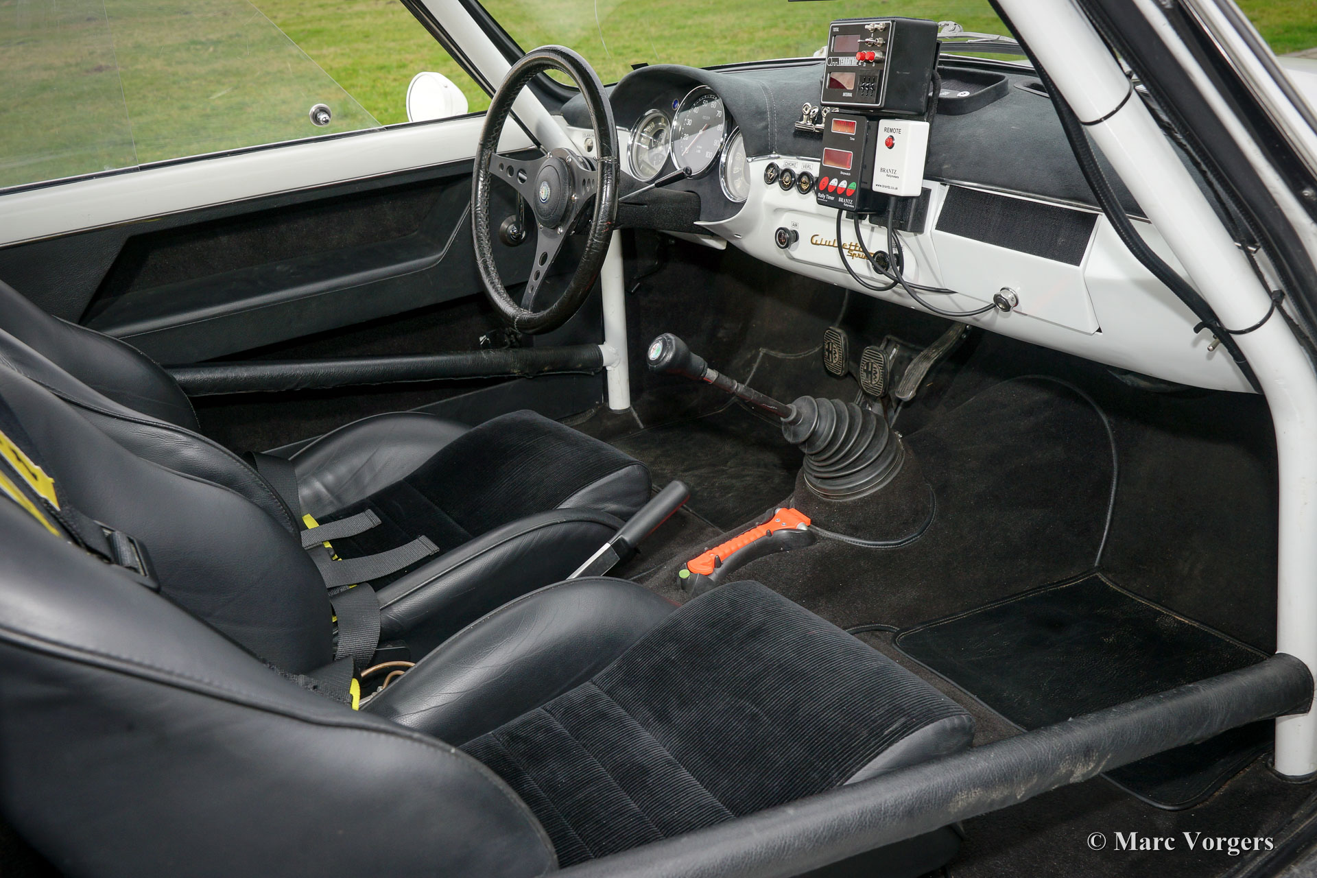 Alfa Romeo Giulietta Sprint Veloce, Jahr 1959. Fahrgestellnummer AR1493E096XX. Farbe Weiß (Sardenia White) mit schwarzem Halb-Leder Interieur und mit einem schwarzen Alcantara-Armaturenbrett. Dieser prächtige Alfa Romeo Giulietta Sprint Veloce wurde am 30. Juli 1959 gebaut. Am 1. August wurde das Auto an den ersten Besitzer in Brescia, Italien geliefert. Dieses Alfa Romeo Giulietta Rallye-Auto wurde ausgiebig für historische (Langstrecken-) Rallye-Teilnahme vorbereitet. Das Auto verfügt über einen vollen ‘Roll-Cage‘, Ölwanne- und Benzin-Tank-Schutz, einen Aluminium-Heizkörper, einen speziellen Edelstahl-Auspuff, einen Ölkühler, extra Benzinpumpe, ‘Limited-Slip‘ Differential, Schlepphaken vorne und hinten, Spezial Rally Sitze, Vierpunkt-Sicherheitsgurte, Tripmaster, zusätzliche Innenleuchten und zusätzliche Fahr- / Nebelscheinwerfer vorne. Dieser Alfa Romeo Giulietta ist ein mächtiges historisches Rallye-Auto!