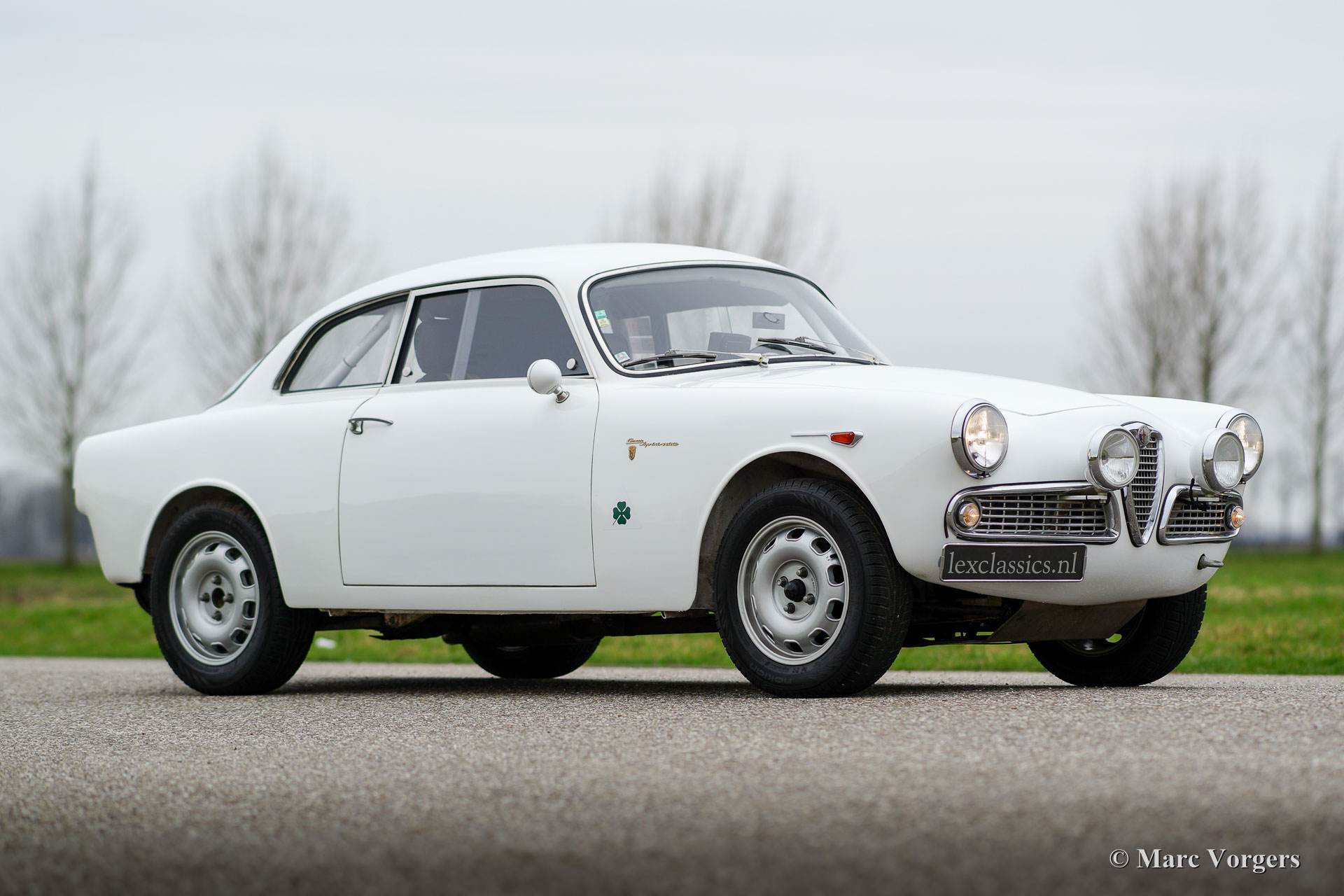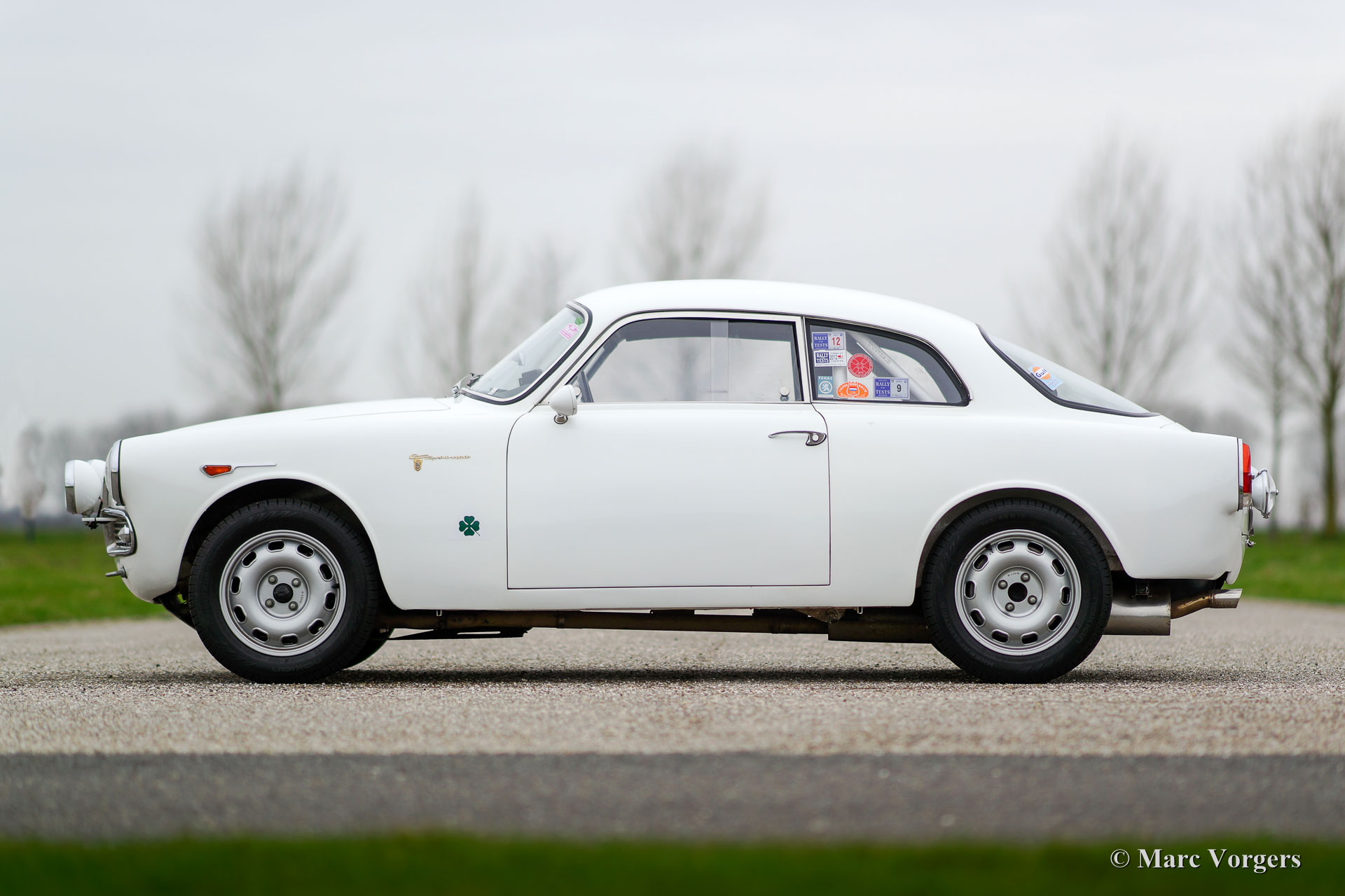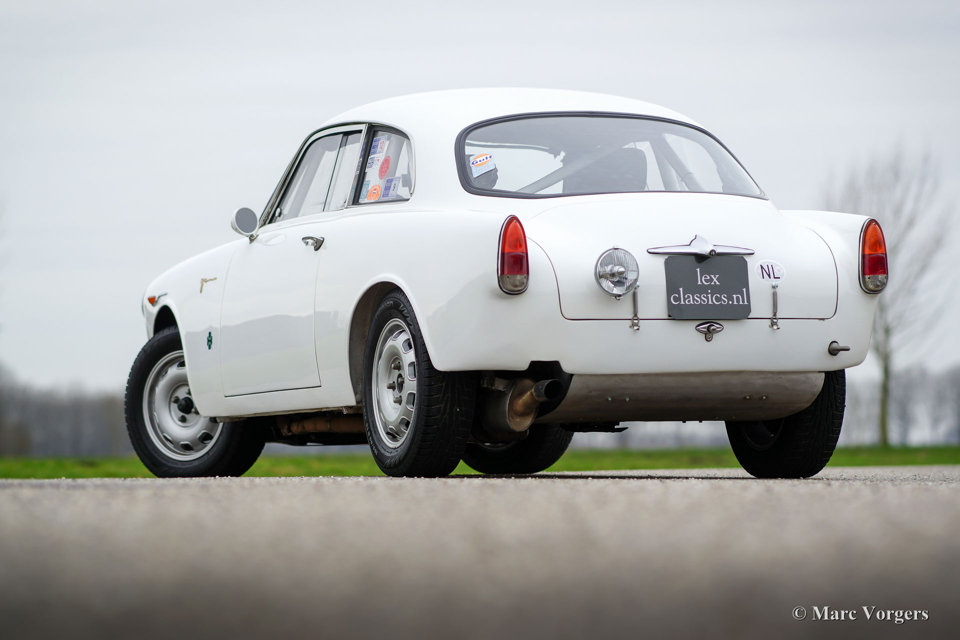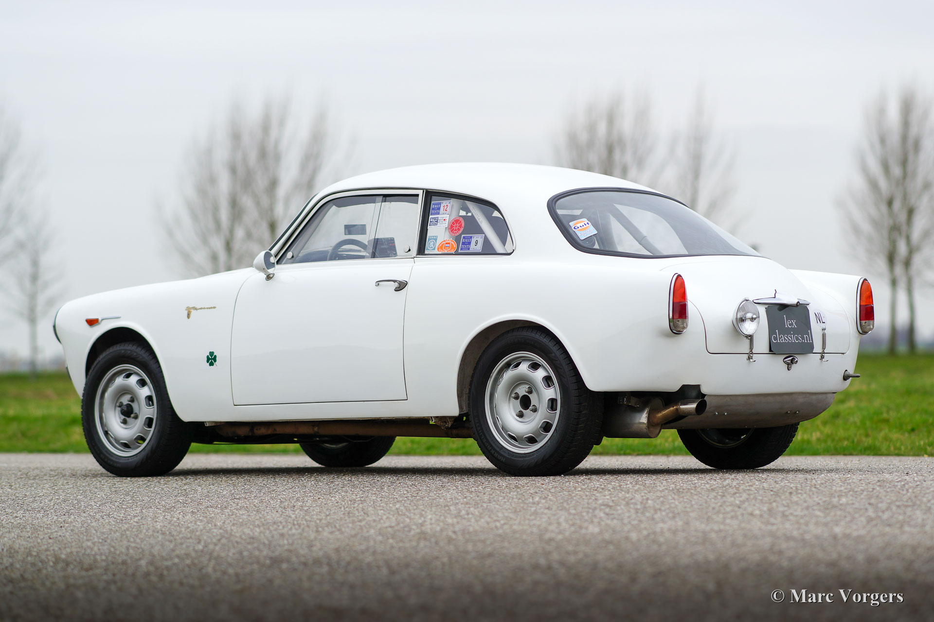 Alfa Romeo Giulietta Sprint Veloce, Jahr 1959. Fahrgestellnummer AR1493E096XX. Farbe Weiß (Sardenia White) mit schwarzem Halb-Leder Interieur und mit einem schwarzen Alcantara-Armaturenbrett. Dieser prächtige Alfa Romeo Giulietta Sprint Veloce wurde am 30. Juli 1959 gebaut. Am 1. August wurde das Auto an den ersten Besitzer in Brescia, Italien geliefert. Dieses Alfa Romeo Giulietta Rallye-Auto wurde ausgiebig für historische (Langstrecken-) Rallye-Teilnahme vorbereitet. Das Auto verfügt über einen vollen ‘Roll-Cage‘, Ölwanne- und Benzin-Tank-Schutz, einen Aluminium-Heizkörper, einen speziellen Edelstahl-Auspuff, einen Ölkühler, extra Benzinpumpe, ‘Limited-Slip‘ Differential, Schlepphaken vorne und hinten, Spezial Rally Sitze, Vierpunkt-Sicherheitsgurte, Tripmaster, zusätzliche Innenleuchten und zusätzliche Fahr- / Nebelscheinwerfer vorne. Dieser Alfa Romeo Giulietta ist ein mächtiges historisches Rallye-Auto!