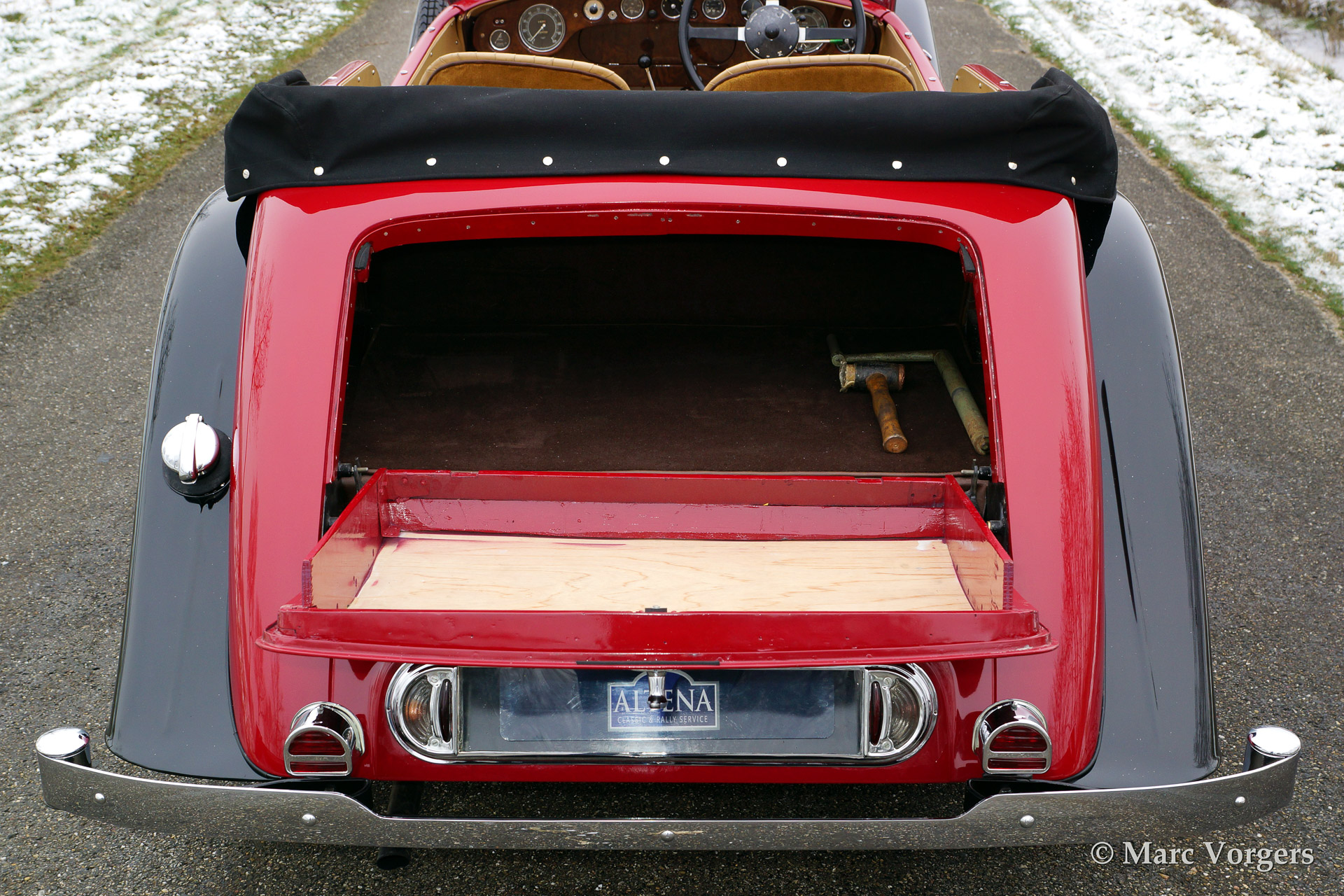 Alvis Speed 25 SB Cross & Ellis tourer, year 1938. Colour two-tone red over black with a beige (tan) leather interior. This fine automobile was extensively restored retaining all original details. In total only 391 Speed 25 chassis were built of which 220 survive today (source: Kenneth Day's 'The story of the Red Traingle', fourth edition). It is said that 39 Speed 25 chassis were clad with this Cross & Ellis tourer bodywork of which only 19 cars with original bodywork are still known to exist.