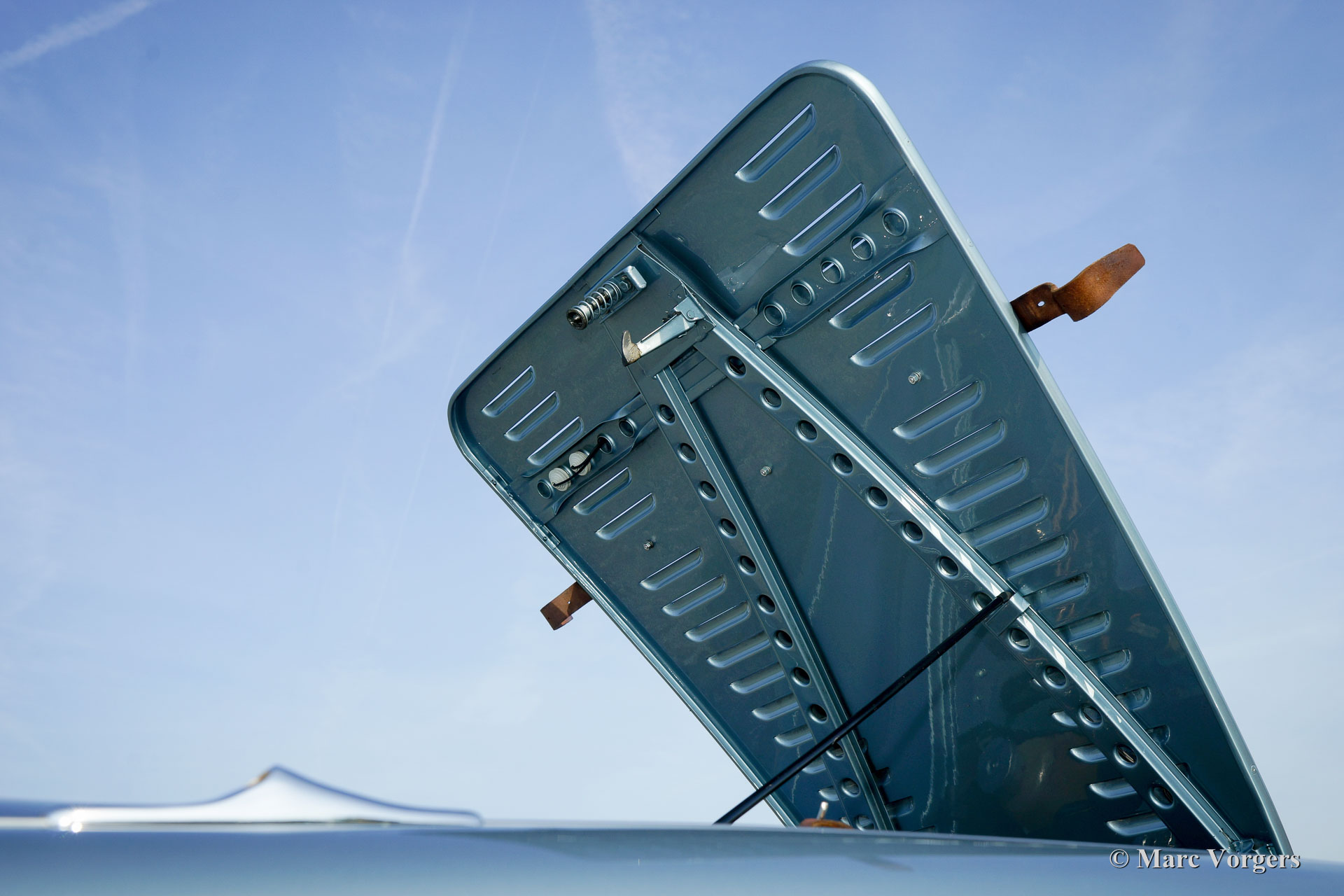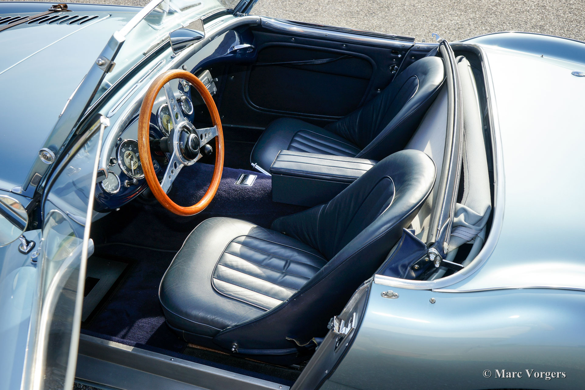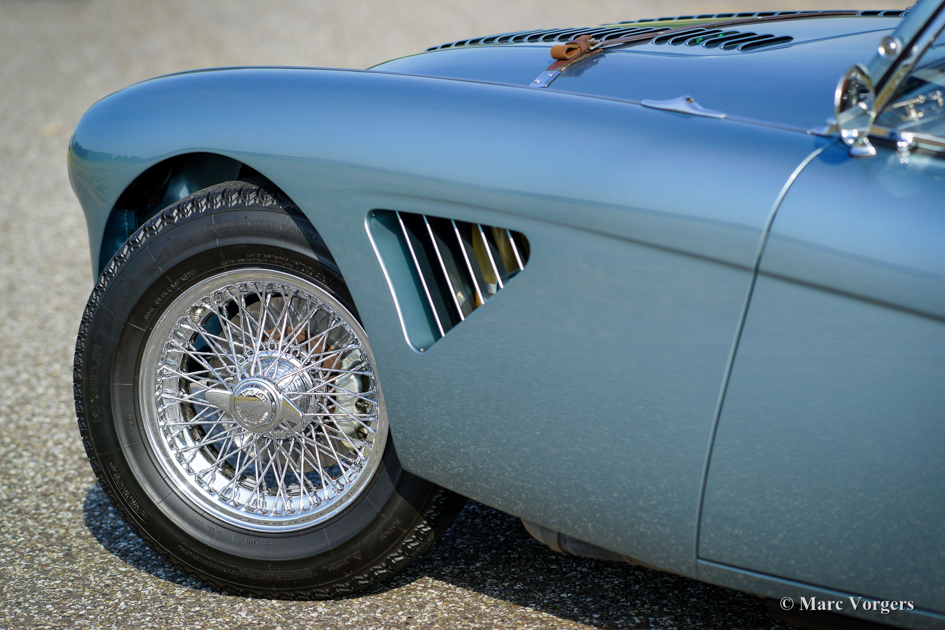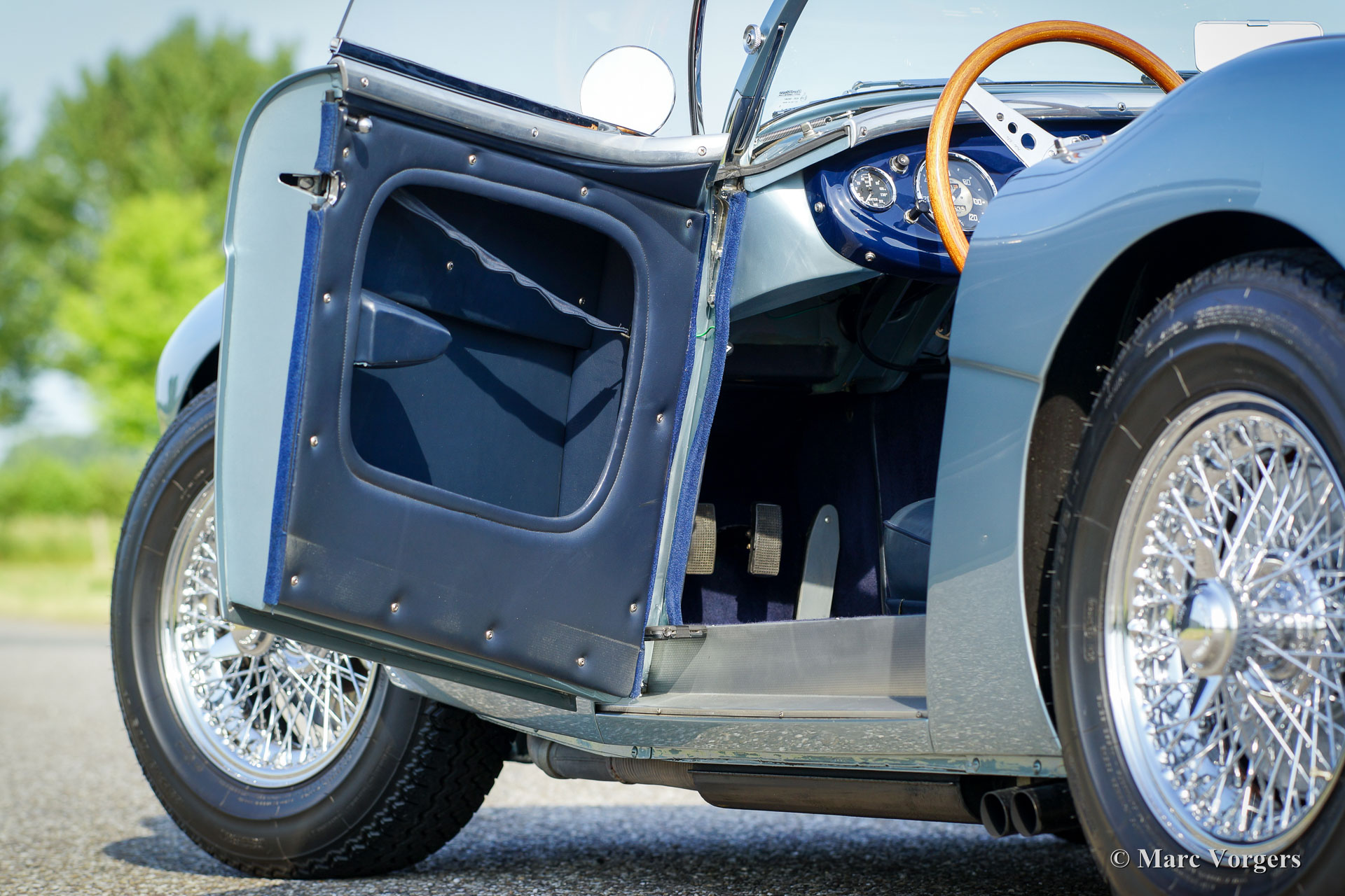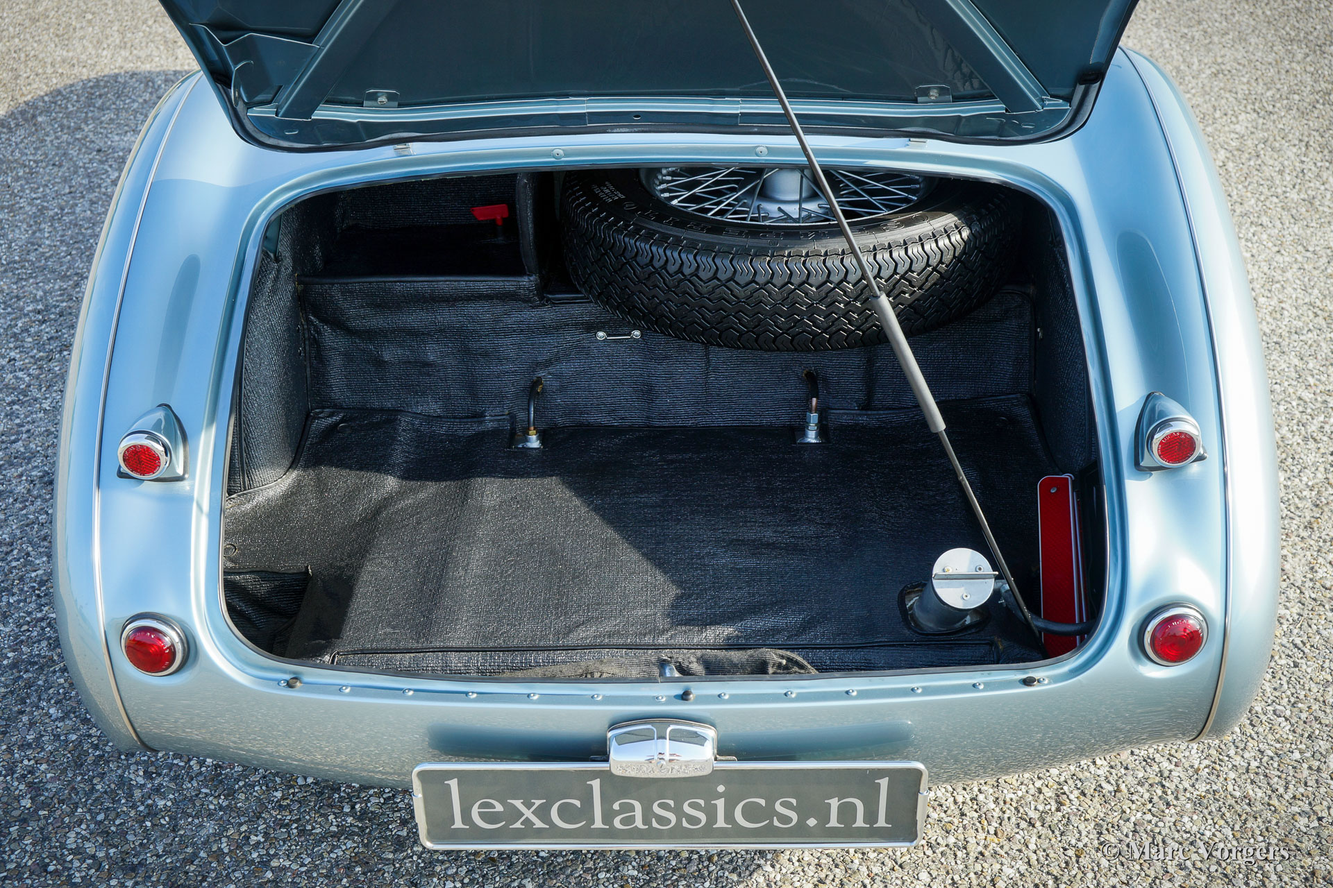 Austin Healey 100/4 (BN-1), Jahr 1954. Farbe Ice-Blue metallic mit einem dunkelblauen Leder Interieur und dunkelblauen Teppich. Ein Heritage-Zertifikat ist vorhanden, daraus erfahren wir, dass das Auto in genau dieser Farbkombination neu in die USA verkauft wurde. Im Jahr 1988 wurde der Austin Healey in die Niederlande importiert. In den Niederlanden wurde das Automobil nach hohen Standards restauriert und modifiziert. Die Restaurierung wurde im Jahr 2007 abgeschlossen und es ist eine komplette Wiederherstellungsdatei mit vielen Rechnungen vorhanden.