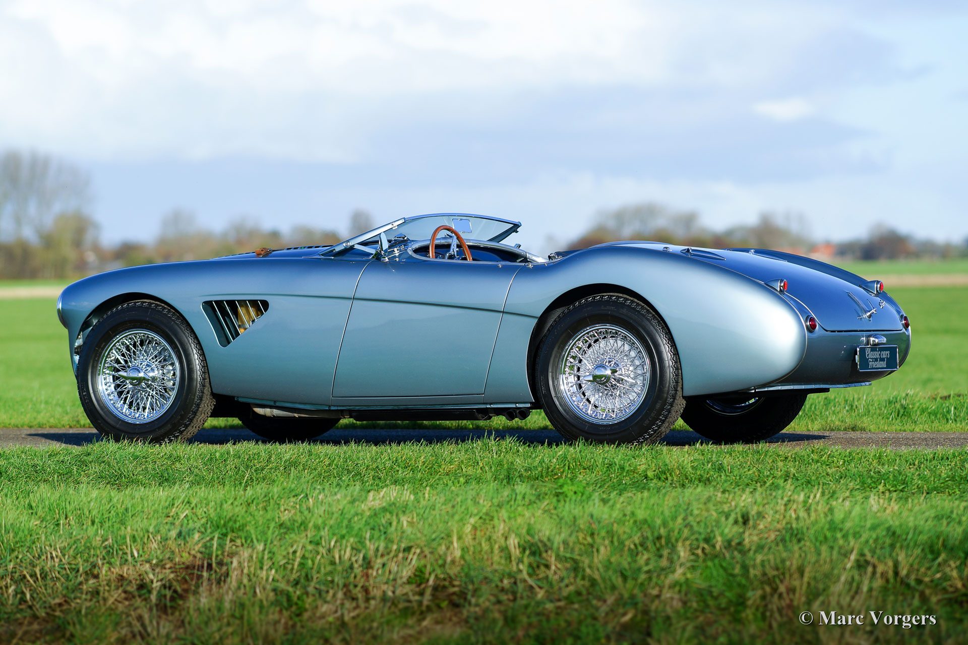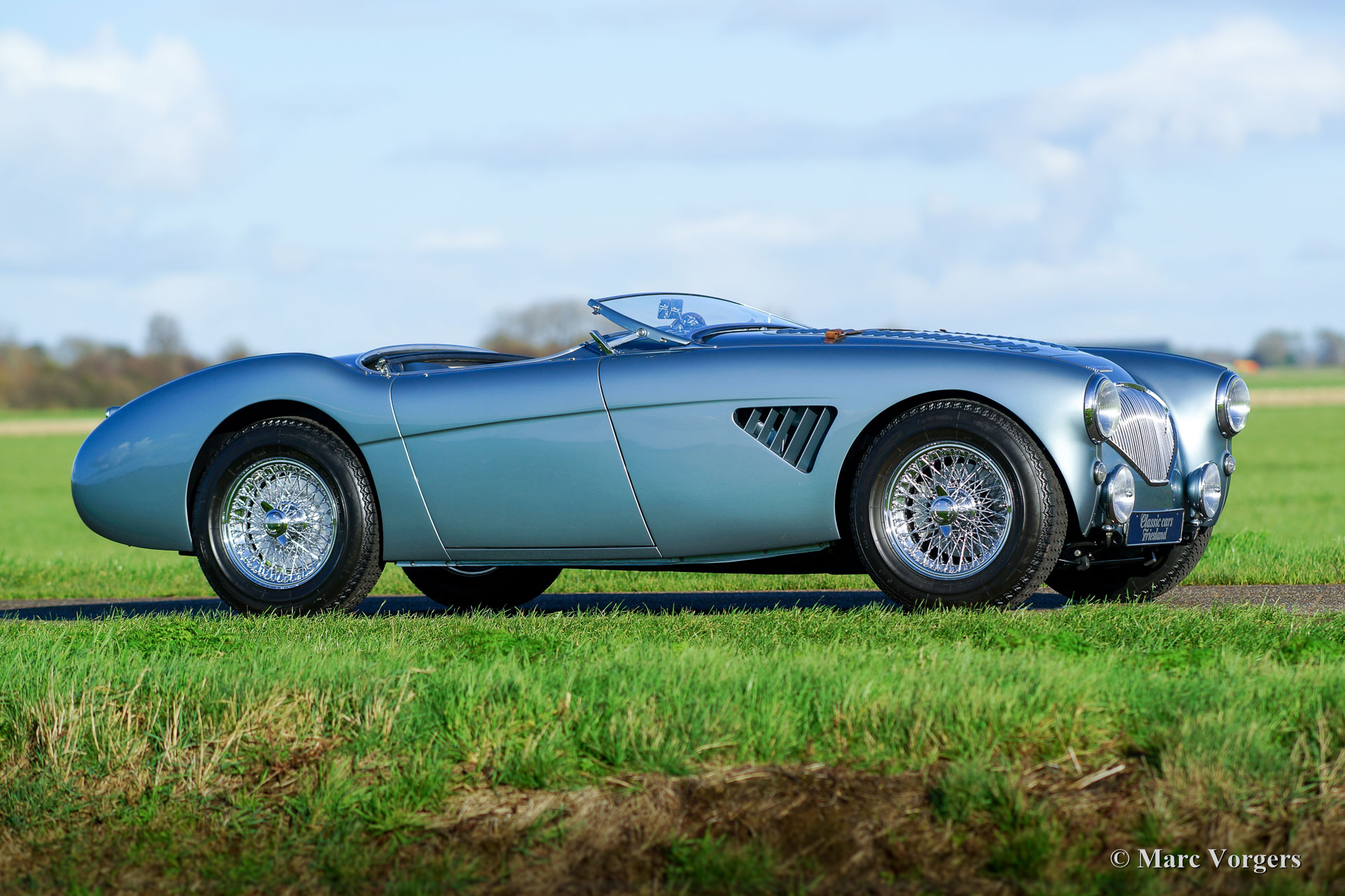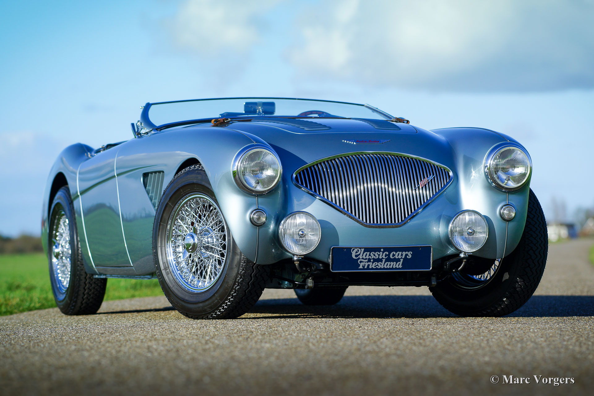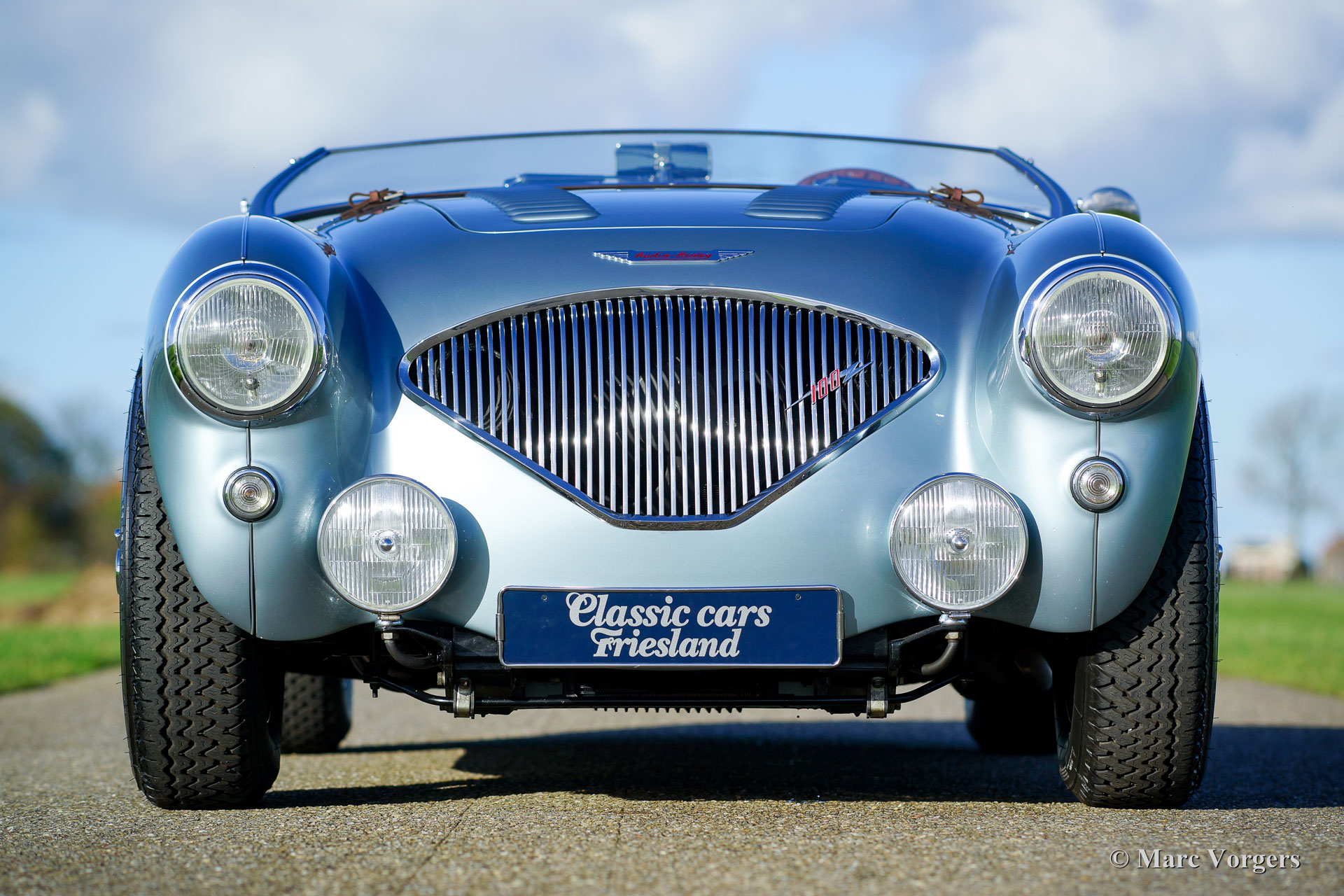 Austin Healey 100/4 'M - Le Mans', Jahr 1954. Farbe Ice-Blue metallic mit einer dunkelblauen Lederausstattung und dunkelblauem Teppich. Blaues Verdeck und eine blaue Mohair-Persenning. Dieser fantastische Austin Healey 100/4 'M' hat 'matching numbers' und 'matching colours', das Heritage Zertifikat ist vorhanden, um dies zu bestätigen. Dieser Big Healey ist in einem hervorragenden Top-Zustand; Concours! Dieses wunderschöne 100/4 'M' wurde in den Niederlanden (2004-2007) komplett und perfekt restauriert und überholt. Eine umfangreiche Datei enthält die Rechnungen zur Wiederherstellung und Überholung. Diese feine 100/4 wurde während der Restaurierung nach "M"-Spezifikationen modifiziert; Die Motorhaube erhielt Lüftungsschlitze und ein Leder-Riemen, einen Aluminium-M-Zylinderkopf, eine M-Spezifikations-Nockenwelle, eine Spezial-Zylinderkopfdichtung und ein 'M' Auspuffkrümmer. Weiter verfügt das Auto über einen Seitenauspuff, eine elektrische Benzinpumpe, einen leistungsstarken Kühler, einen elektrischen Kenlow-Lüfter, eine Wechselstrom Lichtmaschine, eine 123 elektronische Zündung, eine Aluminium-ölwanne, ein Vierganggetriebe mit Overdrive, ein ‘high-torque‘ Anlasser, Scheibenbremsen an den Vorderrädern, eine Zweikreis-Bremsanlage und verchromte Speichenräder mit Michelin-Bereifung. Das Auto wird komplett mit neuen Seitenvorhängen und dem originalen Werkzeugsatz geliefert. Dies ist ein hervorragender Austin Healey 100/4 'Le Mans' in Top-Zustand!