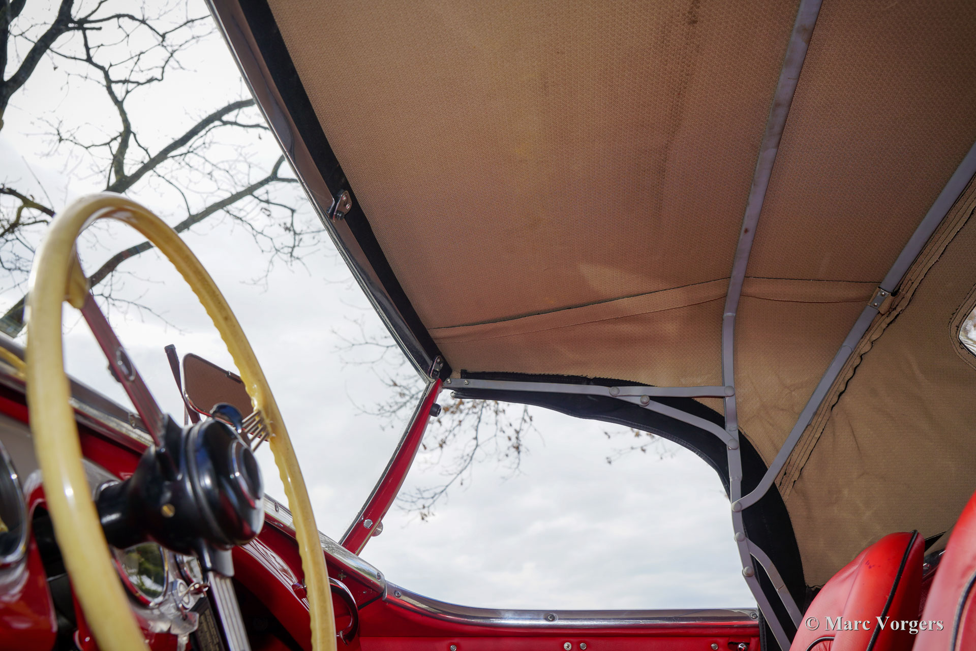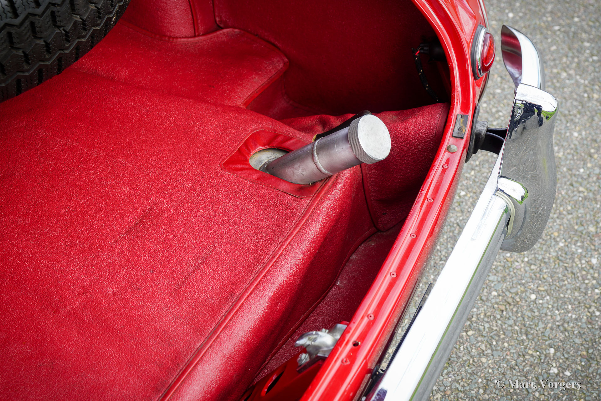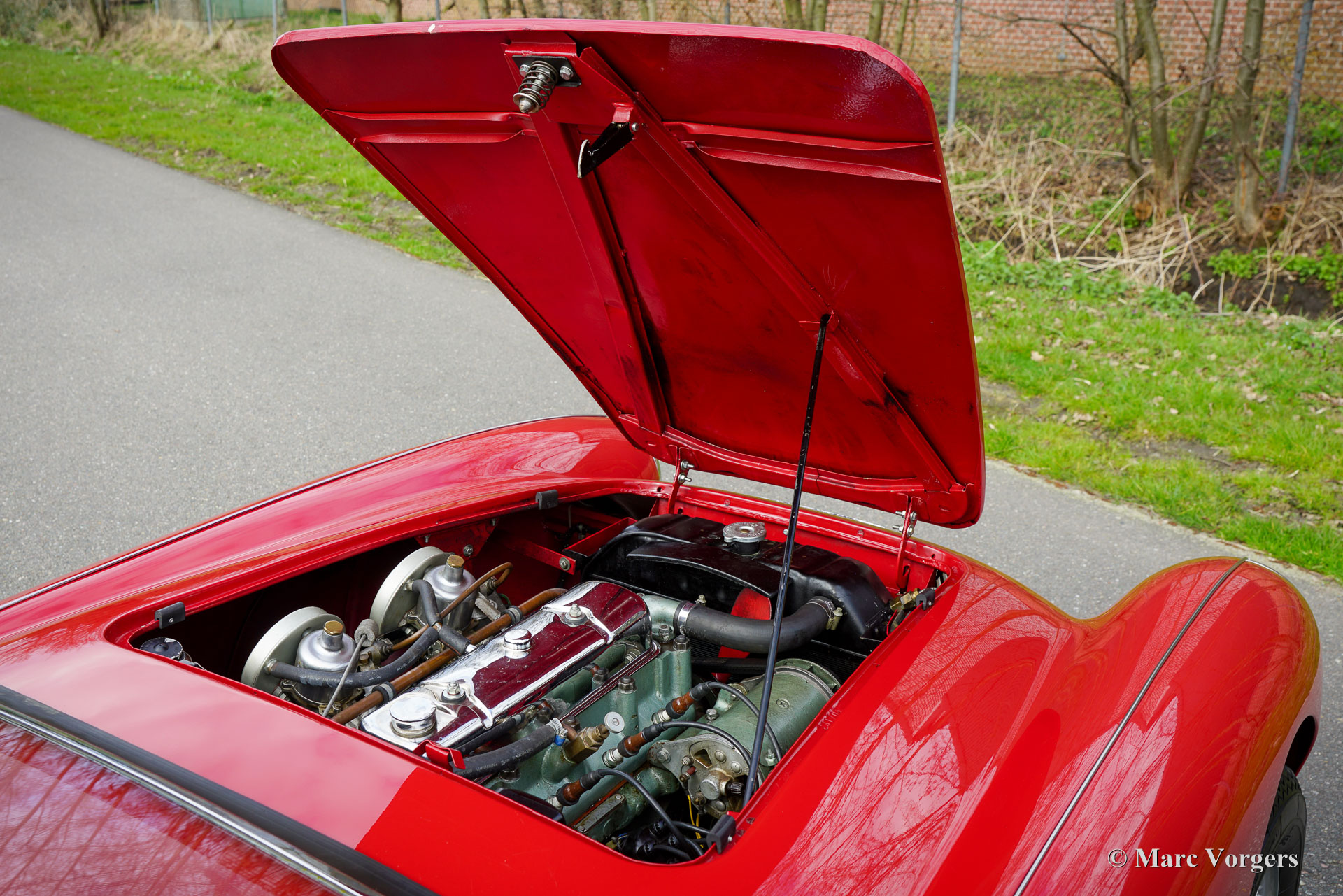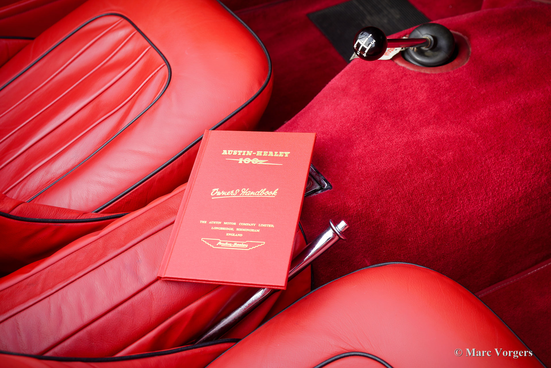 Austin Healey 100/4 (BN2), Jahr 1956. Farbe Rot kombiniert mit einer roten Innenausstattung getrimmt mit schwarzen Paspeln und rotem Teppich. Schwarzes Verdeck und Persenning. Dieser wunderschöne Austin Healey 100 „Four“ wurde in den Niederlanden neu verkauft, wo er noch immer steht. Der ursprüngliche Besitzer musste damals viel Aufmerksamkeit von den Passanten erhalten haben, denn solche exotische Sportwagen waren damals rar. Der Healey 100 ist einer der schönsten britischen Sportwagen aller Zeiten und wurde 1952 auf der „Earls Court“ Motor Show in London präsentiert. Das vorgestellte Auto ist ein BN2-Modell mit den Verbesserungen von 1955 wie besseren Bremsen und Hinterachse sowie einem Vierganggetriebe mit Overdrive, das das Dreiganggetriebe des BN1 ersetzt. Dieser Austin Healey wurde im Zeitraum 1990-1995 umfassend restauriert und seitdem nur noch selten gefahren. Das Auto wurde gemäß den ursprünglichen Werksspezifikationen restauriert und weist wundervolle Originaldetails auf. Dieser „Big Healey“ ist in einem wunderbaren und sehr guten Zustand und weist nur leichte Gebrauchsspuren auf. Der große 2600-cm³-Vierzylindermotor ist sehr leistungsstark und verleiht der 100/4 einen robusten Charakter. Dieser wunderschöne Austin Healey 100/4 BN2 ist ein fantastisches Auto für den Austin Healey-Enthusiasten, der das eher spartanische Vintage-Fahrerlebnis, die robuste Mechanik mit einem soliden metallischen Touch und das fantastische Aussehen mag!