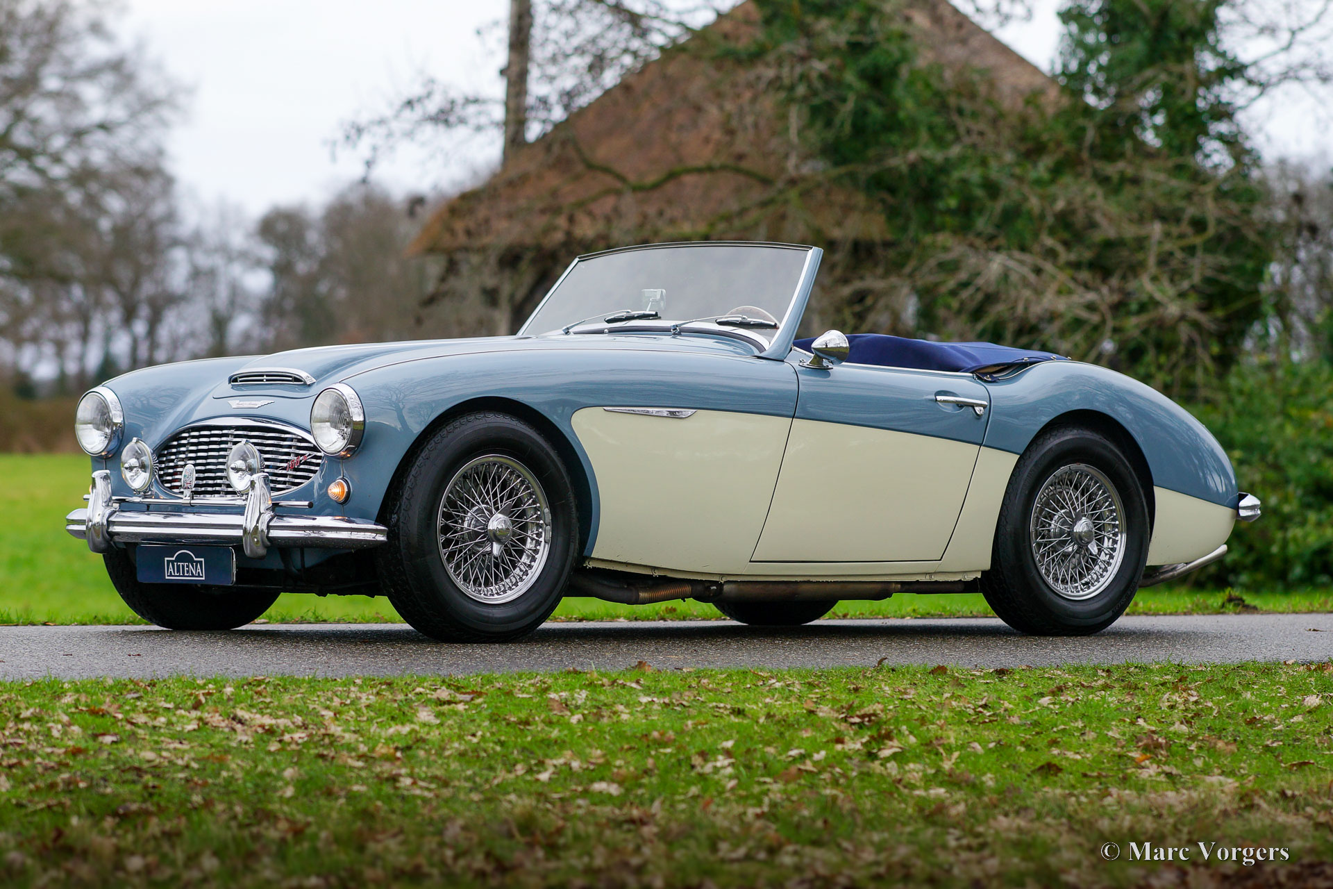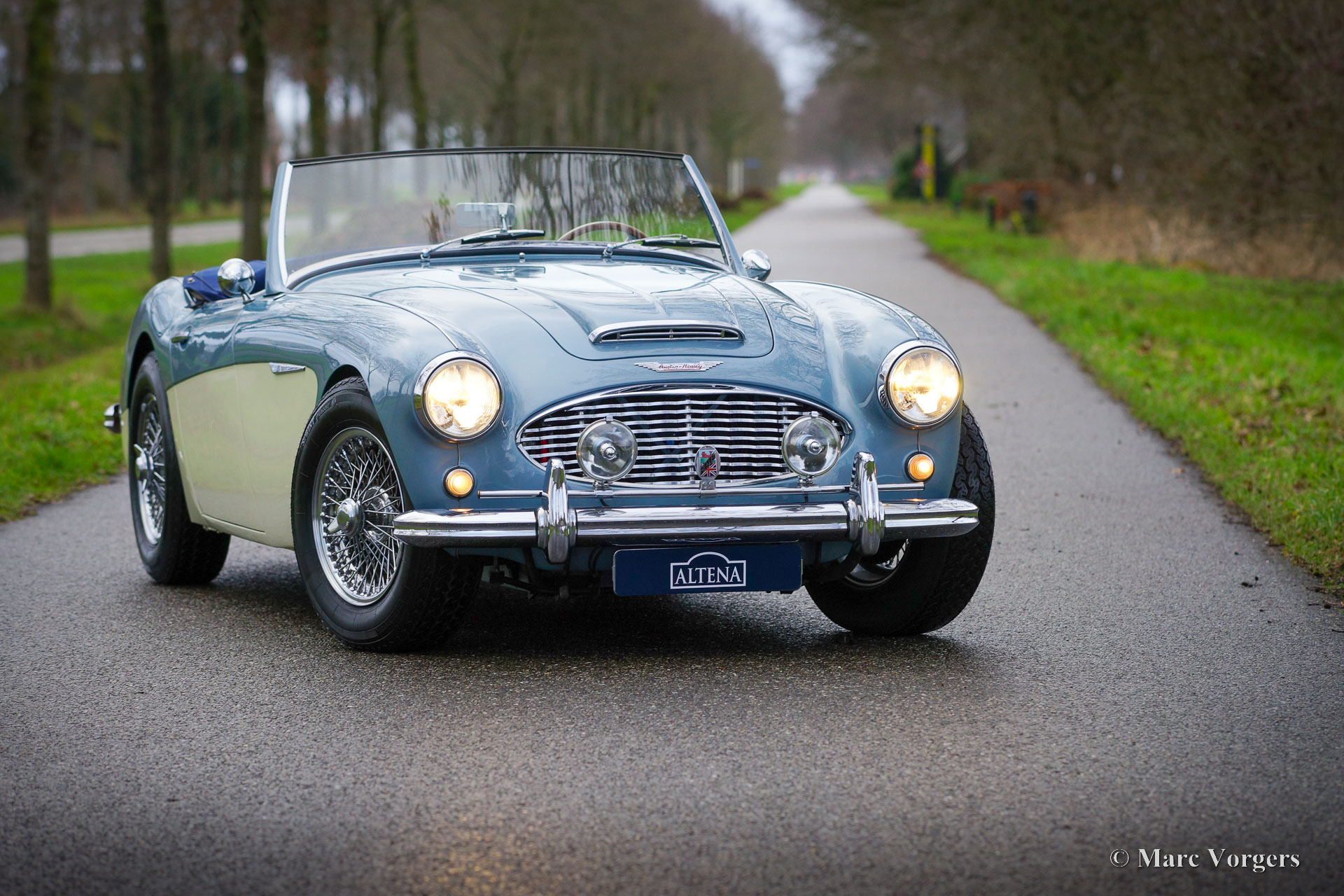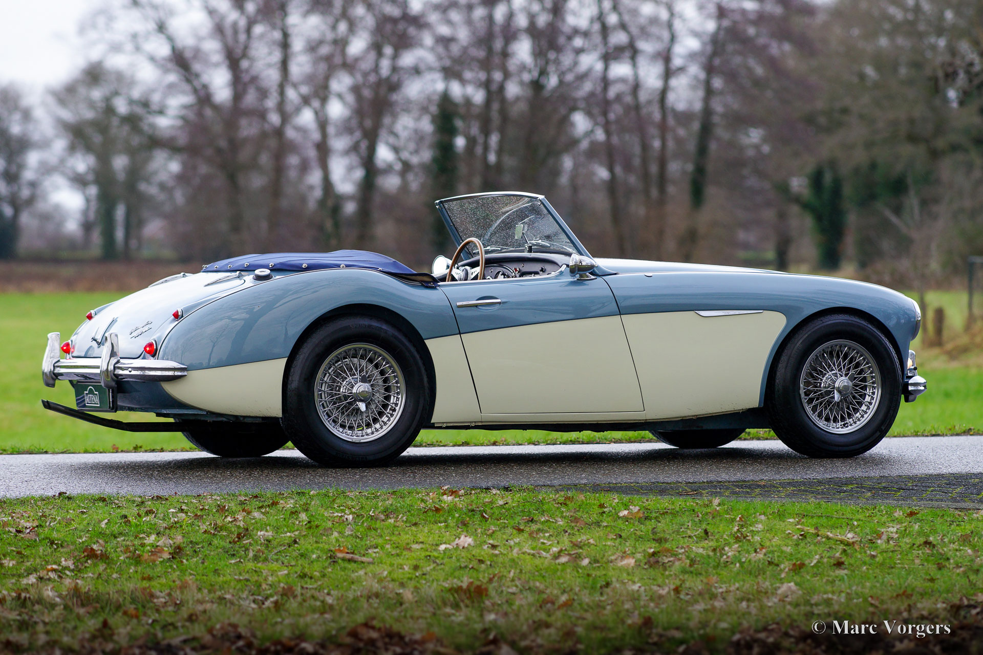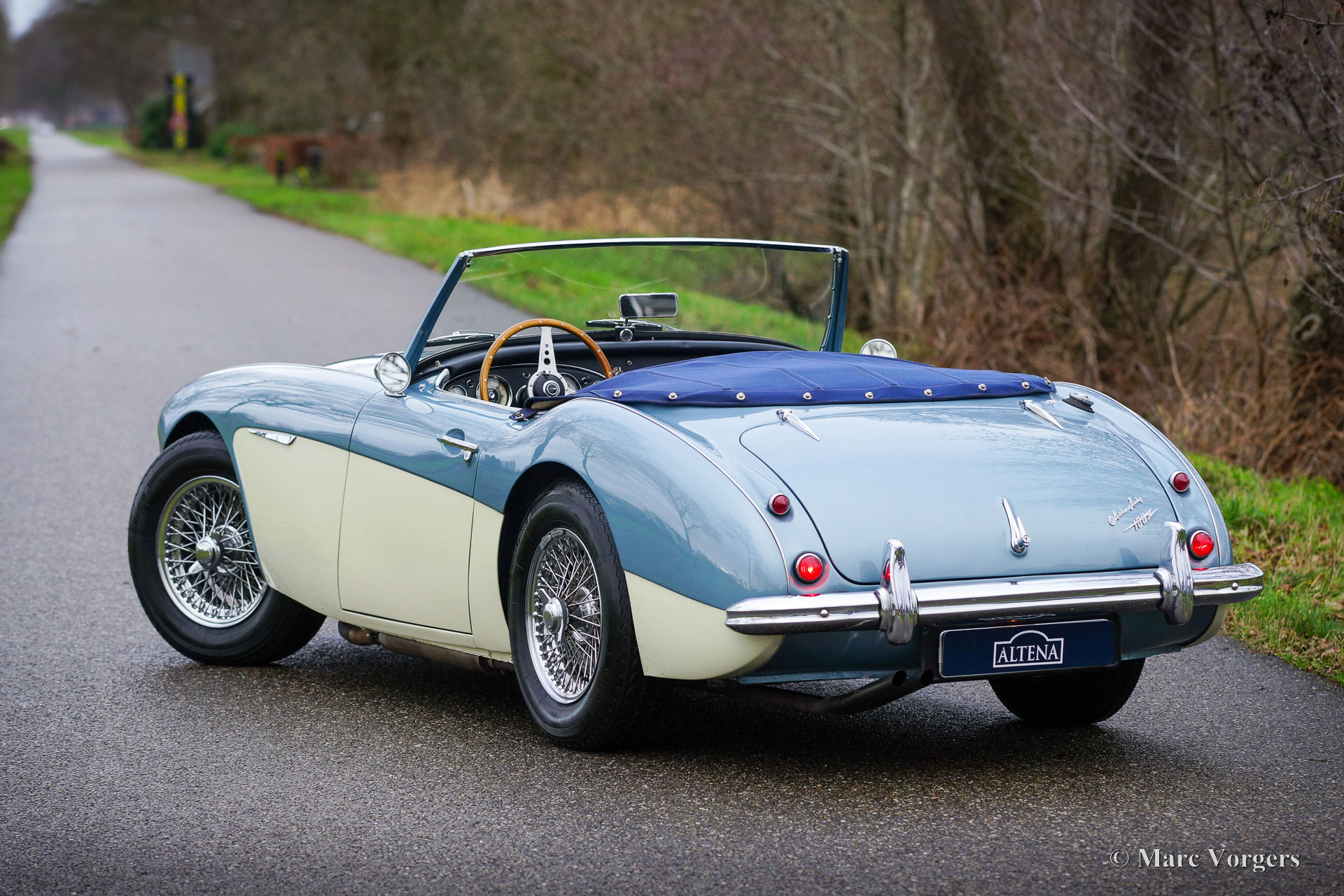 Austin Healey 100/6 BN4, Jahr 1957. Dieser wundervolle Austin Healey wurde neu in Missouri USA verkauft, der US-Originaltitel ist noch vorhanden. Farbe Ice Blue metallic über Cremeweiß kombiniert mit dunkelblauer Lederausstattung und dunkelblauem Teppich. Dunkelblaues Mohair-Verdeck und Persenning. Dieser wunderschöne Austin Healey 100-SIX wurde 1996 aus den USA in die Niederlande importiert. Nach seiner Ankunft in den Niederlanden wurde das Auto umfassend restauriert und überholt. Ein Fotobericht der Restaurierung ist vorhanden. Jetzt, über zwanzig Jahre später, befindet sich das Automobil immer noch in einem sehr guten bis hervorragenden Zustand mit nur leichten Gebrauchsspuren. Man sieht, dass die Restaurierung hochwertig ausgeführt wurde! Das Auto wurde wunderbar gewartet und gepflegt, ein Blick unter die Motorhaube bestätigt dies. Das Auto ist gut dokumentiert und die Vorbesitzer sind bekannt. Dieser ‚Big Healey‘ ist mit den folgenden Optionen ausgestattet: Overdrive, verchromte Speichenräder, Scheibenbremsen an den Vorderrädern, ein MotoLita-Lenkrad mit Holzkranz, zwei verchromte Rückspiegel im „Bullet-Stil“, eine verchromte ‚badge-bar‘, Lucas SLR576 Fernscheinwerfer und eine kleine Uhr am Fuß des Rückspiegels. Dieser Austin Healey 100-SIX ist ein prächtiger „Old School“ britischer Sportwagen in einem wunderbaren Zustand! Das Auto wird dem stolzen neuen Besitzer viel Fahrspaß und neue Abenteuer bringen!