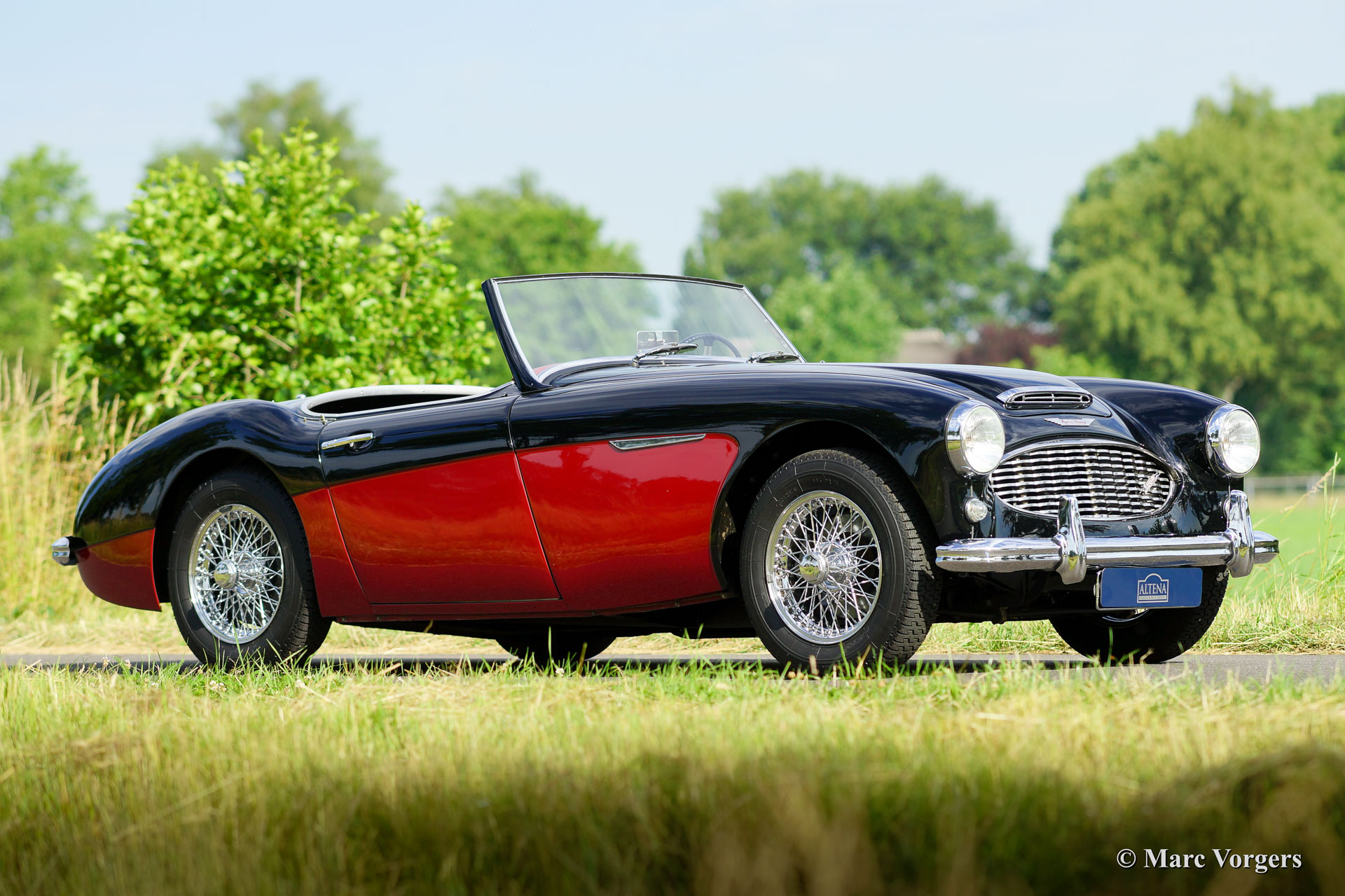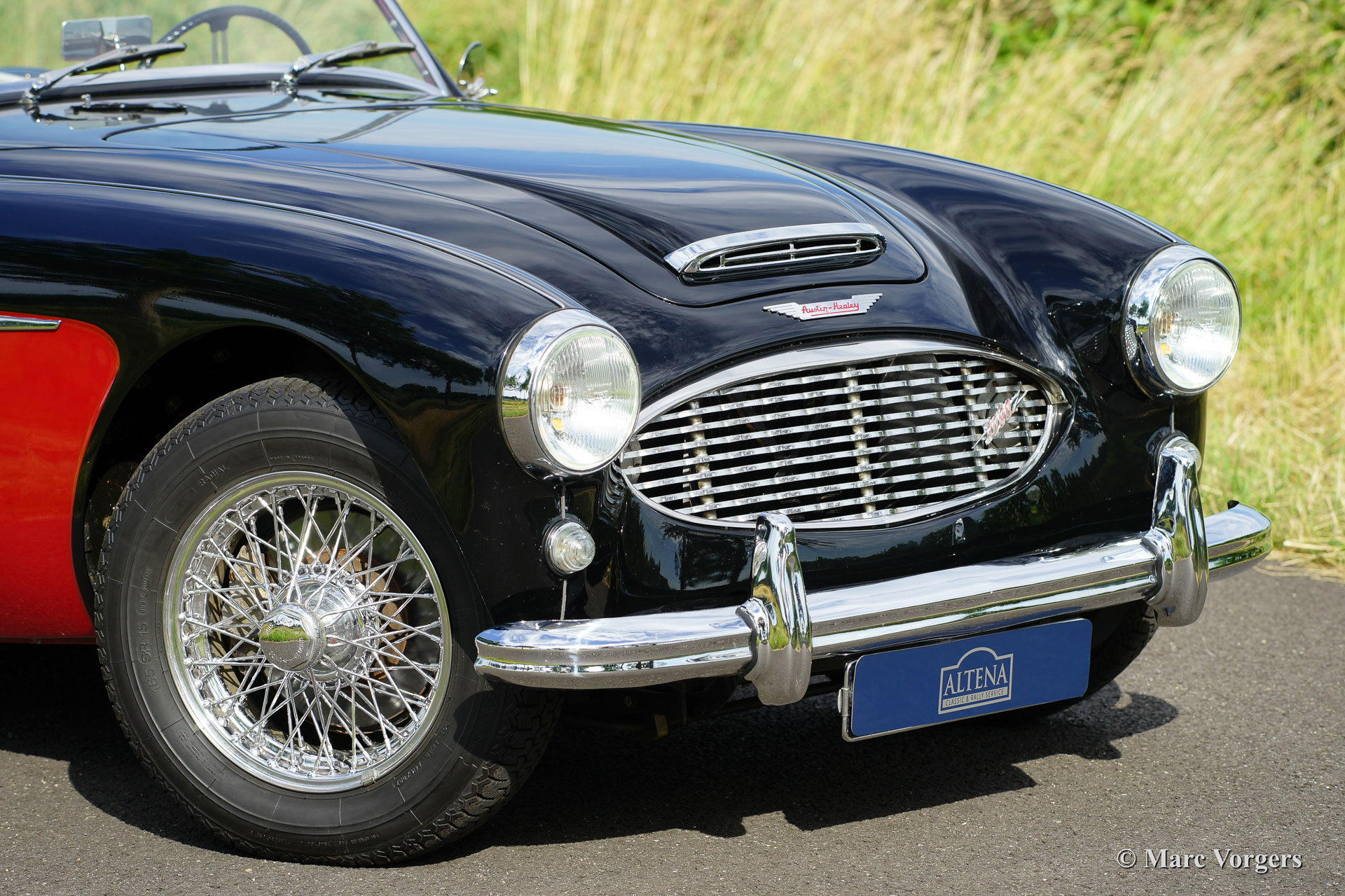 Austin Healey 3000 Mk I BN7 (Zweisitzer), Jahr 1959. Farbe schwarz über rot mit einem roten Leder-Interieur und schwarzen Teppich. Schwarz Verdeck und Verdeck Abdeckung. Diese fantastische Austin Healey Zweisitzer ist in einem hervorragenden Zustand! Das Auto wurde im Jahr 2002 von Altena Classic Service Verkauft und seitdem von dieser renommierten Garage gewartet und gepflegt. Die Service-Geschichte des autos ist bekannt und dokumentiert. Diese feine Austin Healey ist ausgestattet mit Overdrive und Chrom Speichen Räder. Der Austin Healey Mk I BN7 Zweisitzer ist relativ selten, zwischen 1959 und 1961 wurden insgesamt 2592 Linkslenker Zweisitzer gebaut.
