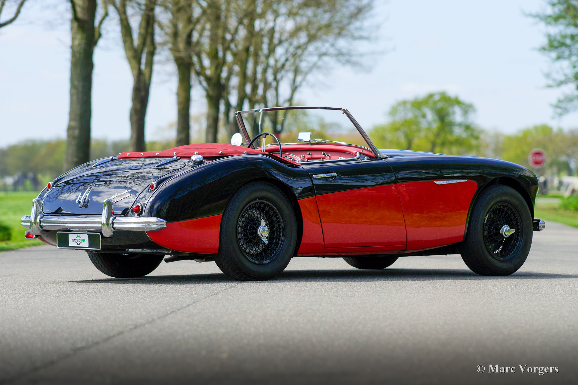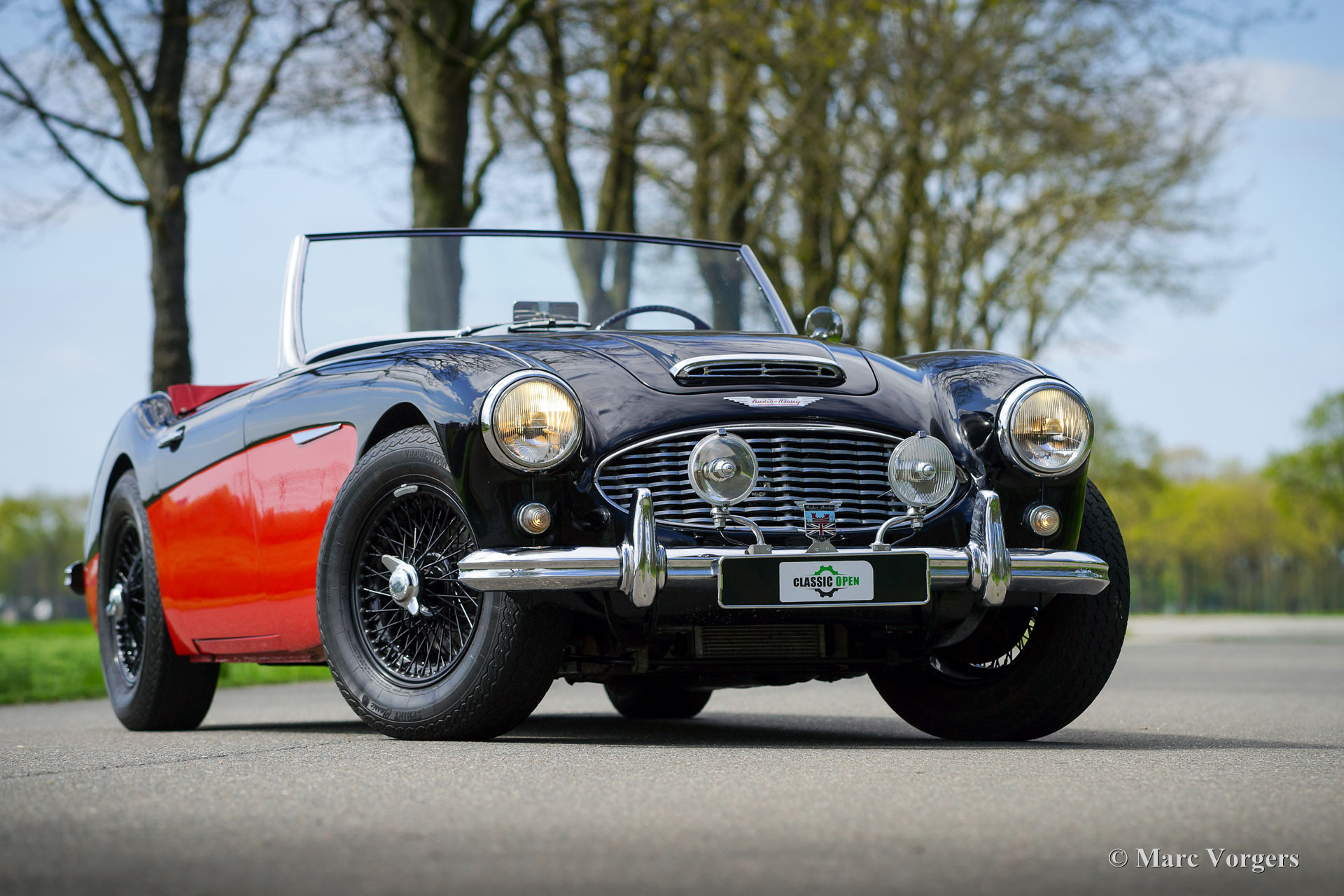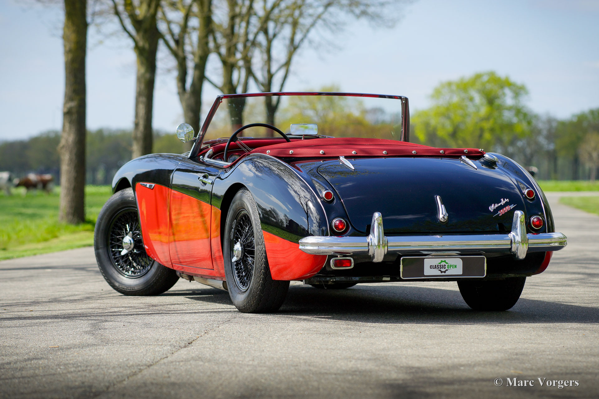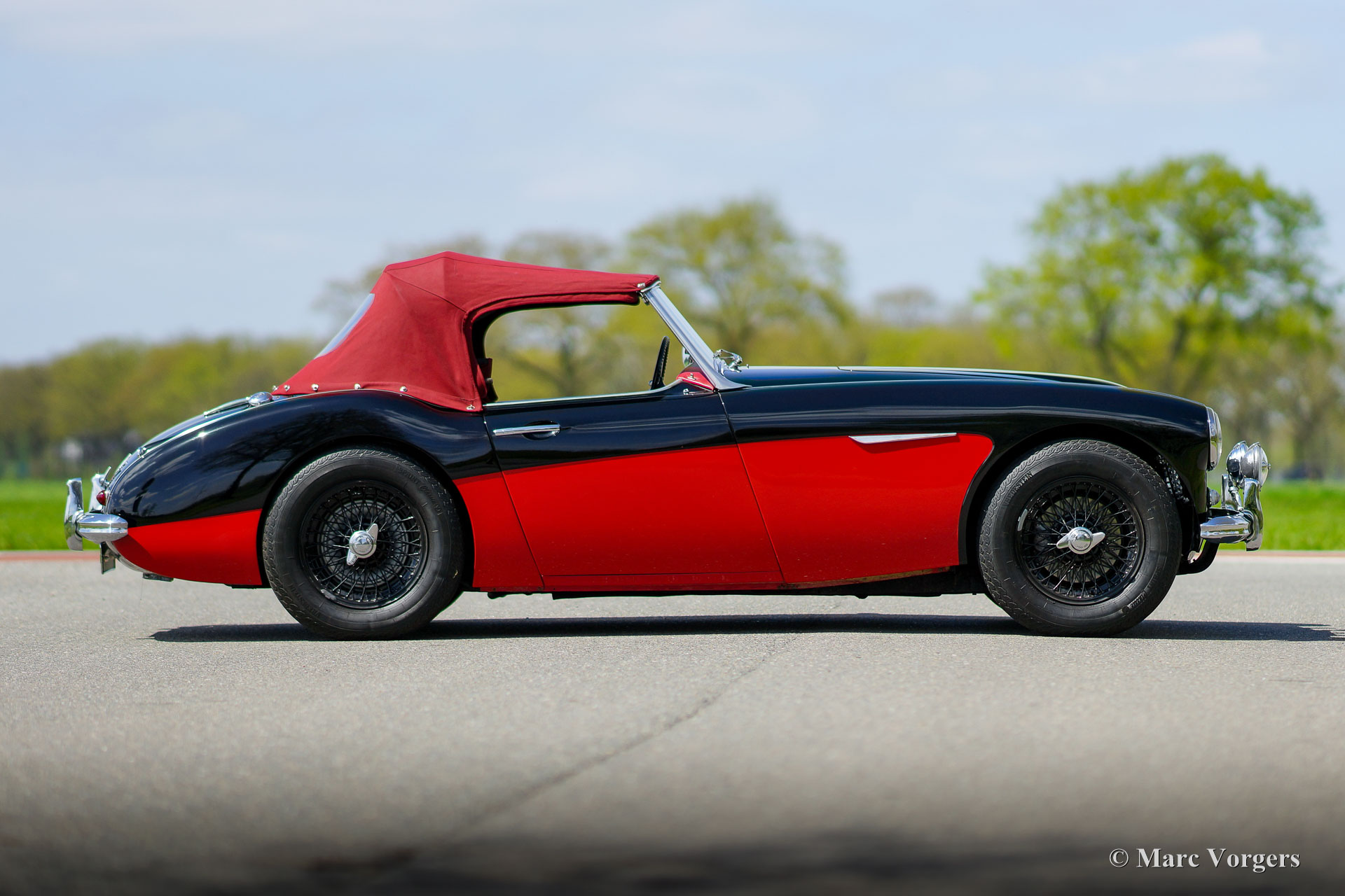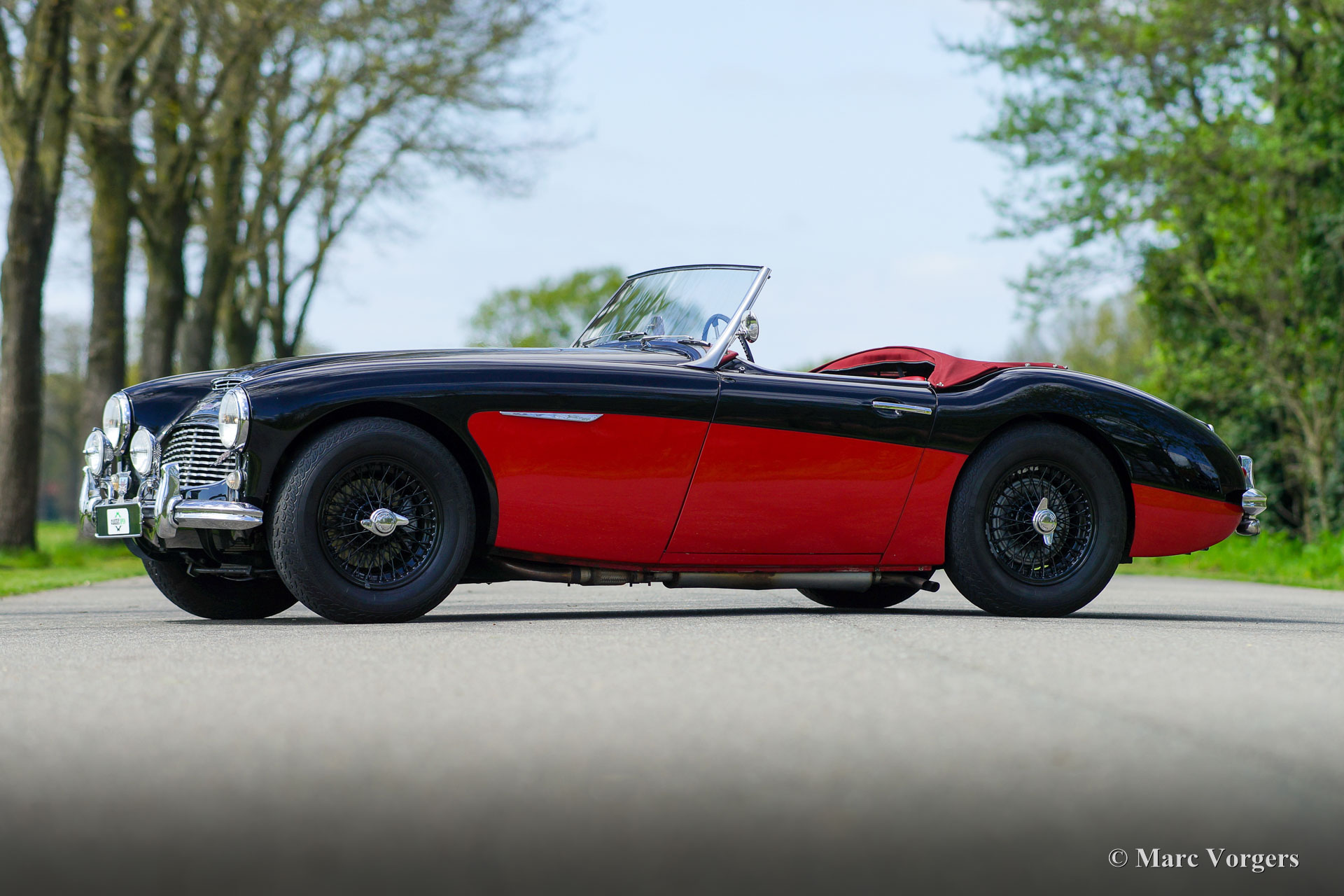 Austin Healey 3000 MK I, Jahr 1959. Farbe schwarz über rot kombiniert mit einer roten Lederausstattung getrimmt mit schwarzen Paspeln. Rotes Mohair-Verdeck und eine rote Mohair-Persenning. Dieser prächtige „Big Healey“ wurde in der jüngeren Vergangenheit umfassend restauriert und überholt. Das Auto ist in einem ausgezeichneten Zustand und das Auto fährt perfekt! Das Auto sieht in seiner schwarz-roten zweifarbigen Lackierung in Kombination mit schwarzen Speichenrädern und der roten Innenausstattung wie ein Bild aus. Der Austin Healey 3000 ist einer der legendären britischen Sportwagen, der ein sehr schönes Aussehen mit dem maskulinen Grunzen eines Reihensechszylinder-Motors kombiniert. Das Auto ist mit einem Seitenauspuff ausgestattet, der einen großartigen Soundtrack erzeugt! Darüber hinaus ist dieser Austin Healey ausgestattet mit zusätzlichen Lucas-Fernscheinwerfern (SFT576-Nebelscheinwerfer und SLR576-Fernscheinwerfer), verchromten „Knock-On“-Radmuttern, Overdrive, elektronischer Zündung, einer Wechselstrom Lichtmaschine und einem elektrischen Kühlgebläse. Dies ist ein wunderschöner Austin Healey 3000 Mk I in ausgezeichnetem Zustand. Dieses Auto ist bereit für jedes Abenteuer in den Händen eines stolzen neuen Besitzers!
