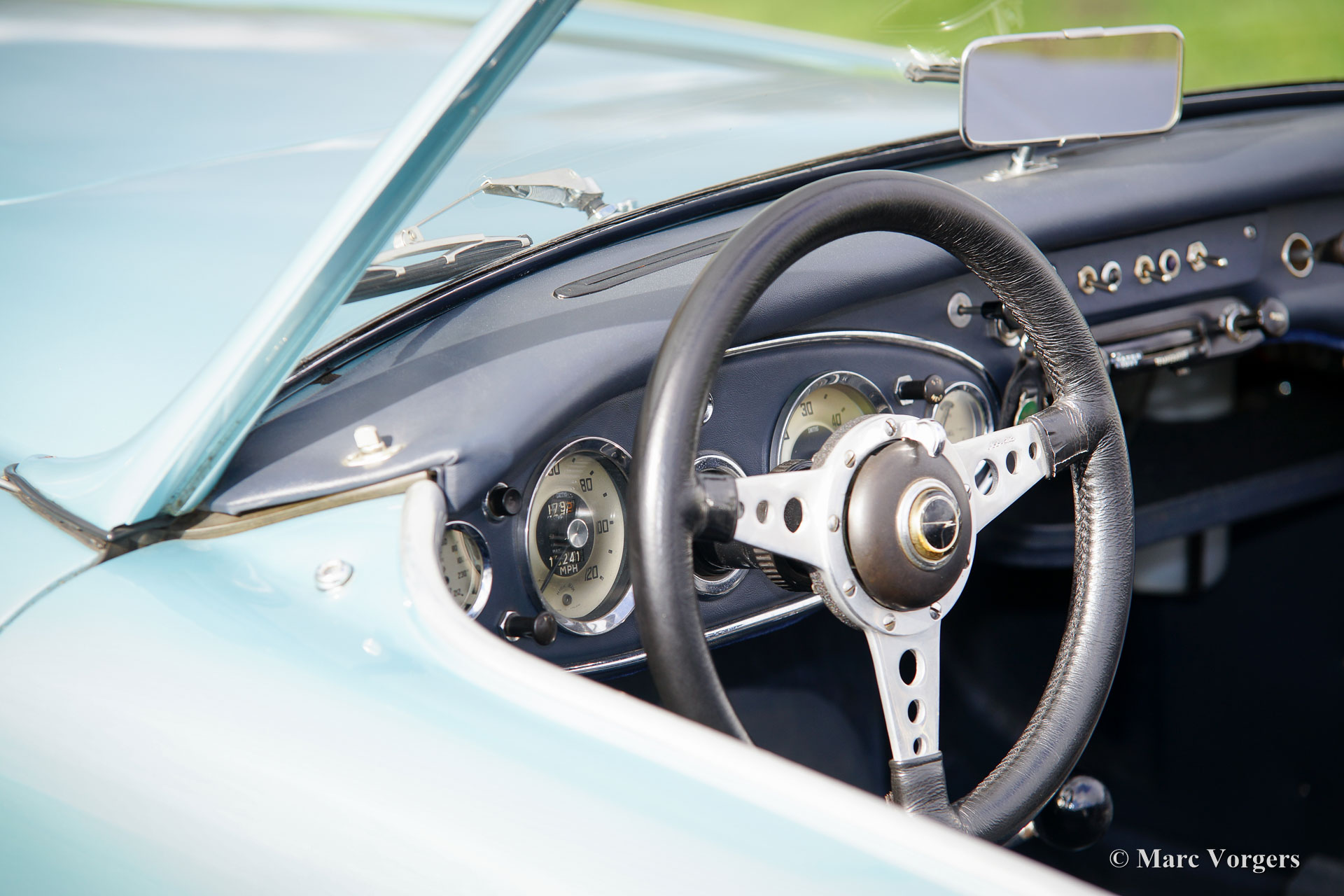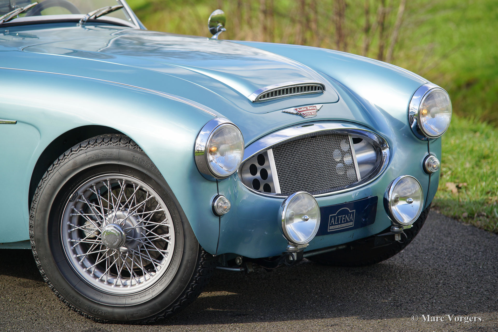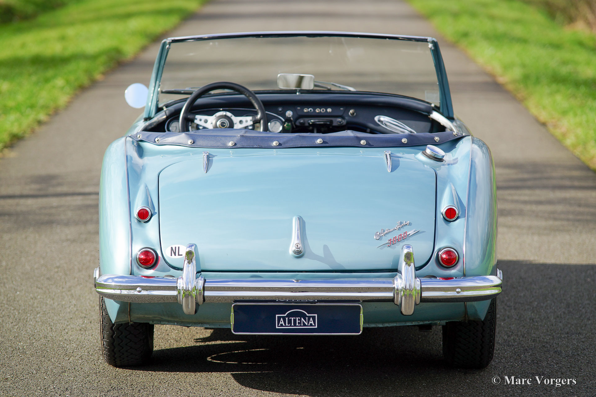 Austin Healey 3000 Mk II, Jahr 1961. Fahrgestellnummer HBT7L152XX. Farbe ‘Ice blue‘ metallic mit einem blauen Leder-Interieur, getrimmt mit weißen Paspelierung, und blauen Teppich. Blau Verdeck und Persenning. Dieses fantastische Austin Healey 3000 wurde im Jahr 2004 in die Niederlande eingeführt. Das Auto wurde in der Vergangenheit ausgiebig restauriert; eine Fotoreportage der Wiederherstellung ist auf DVD erhältlich. Dieser "Big Healey" ist in einem sehr guten Zustand und das Auto fährt perfekt! Seit dem Jahr 2005 ist das Auto gewartet und gepflegt von Altena Classic Service. Die Niederländische (Service) Geschichte is bekannt. Dieser Austin Healey ist ein richtiger Fahrer Auto mit einigen Gebrauchsspuren, der ideale Healey für Urlaubsreisen und Teilnahme an historische (Touring) Rallyes. Dies ist ein relativ seltenes 3-Vergaser-Modell mit dem schönen klassischen Armaturenbrett. Dieser Healey sieht robust und sportlich aus mit den gelöschten Standard Stoßstangen und mit dem Zusatz von Lucas Leuchten vorn und Chrom Stoßstangenhörner auf der Rückseite. Darüber hinaus ist das Auto ausgestattet mit Speichen Rädern, Overdrive und ein schönes Leder verkleidetes Motolita Sportlenkrad. Auf diesem Preisniveau ... ein Schnäppchen!