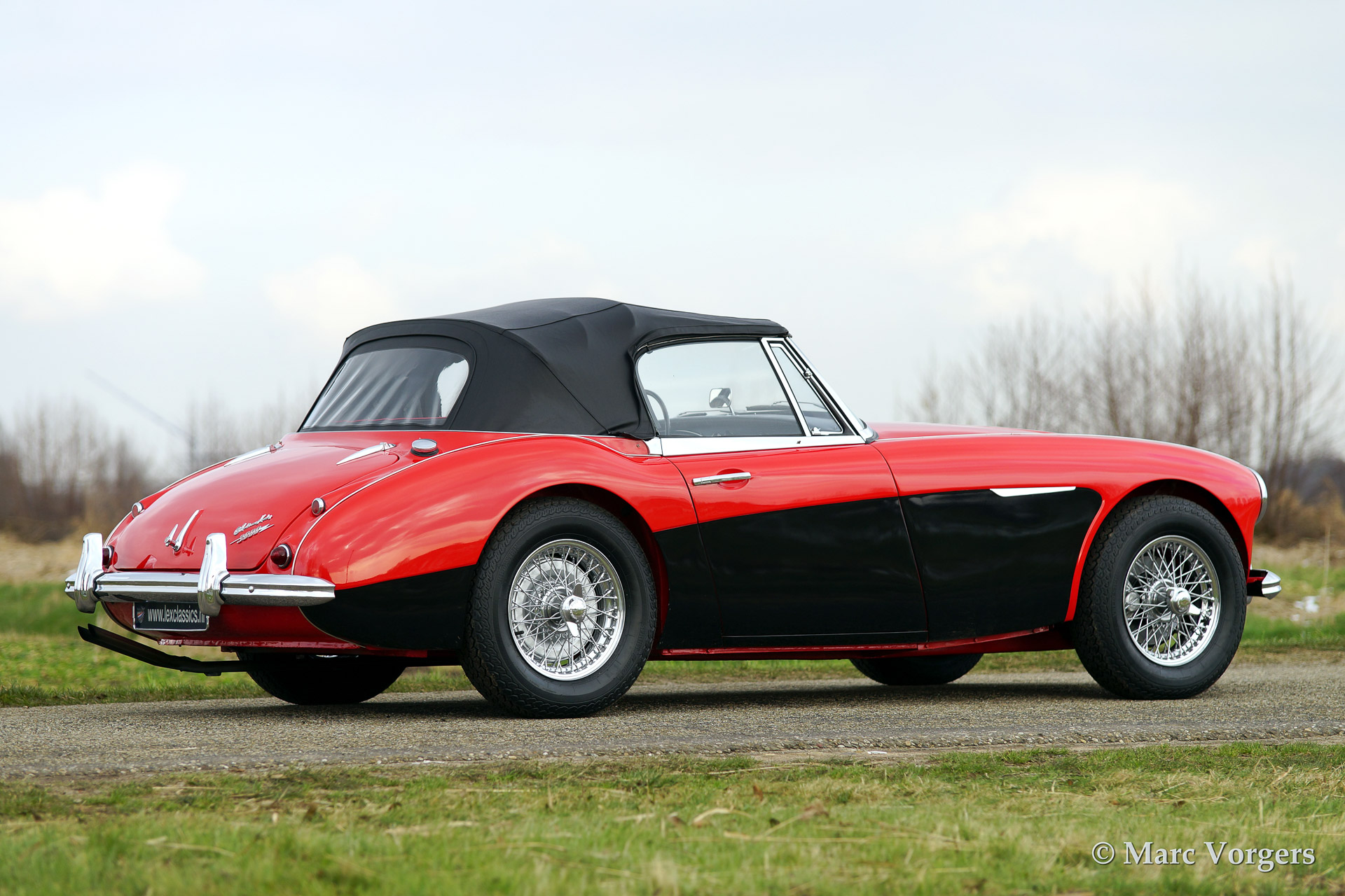 Austin Healey 3000 Mk IIa, year 1964. Colour red over black. Black leather interior trimmed with red piping. Black soft top and hood cover. This 'Big Healey' sports options like a Stainless Steel exhaust, overdrive and chrome wire wheels.