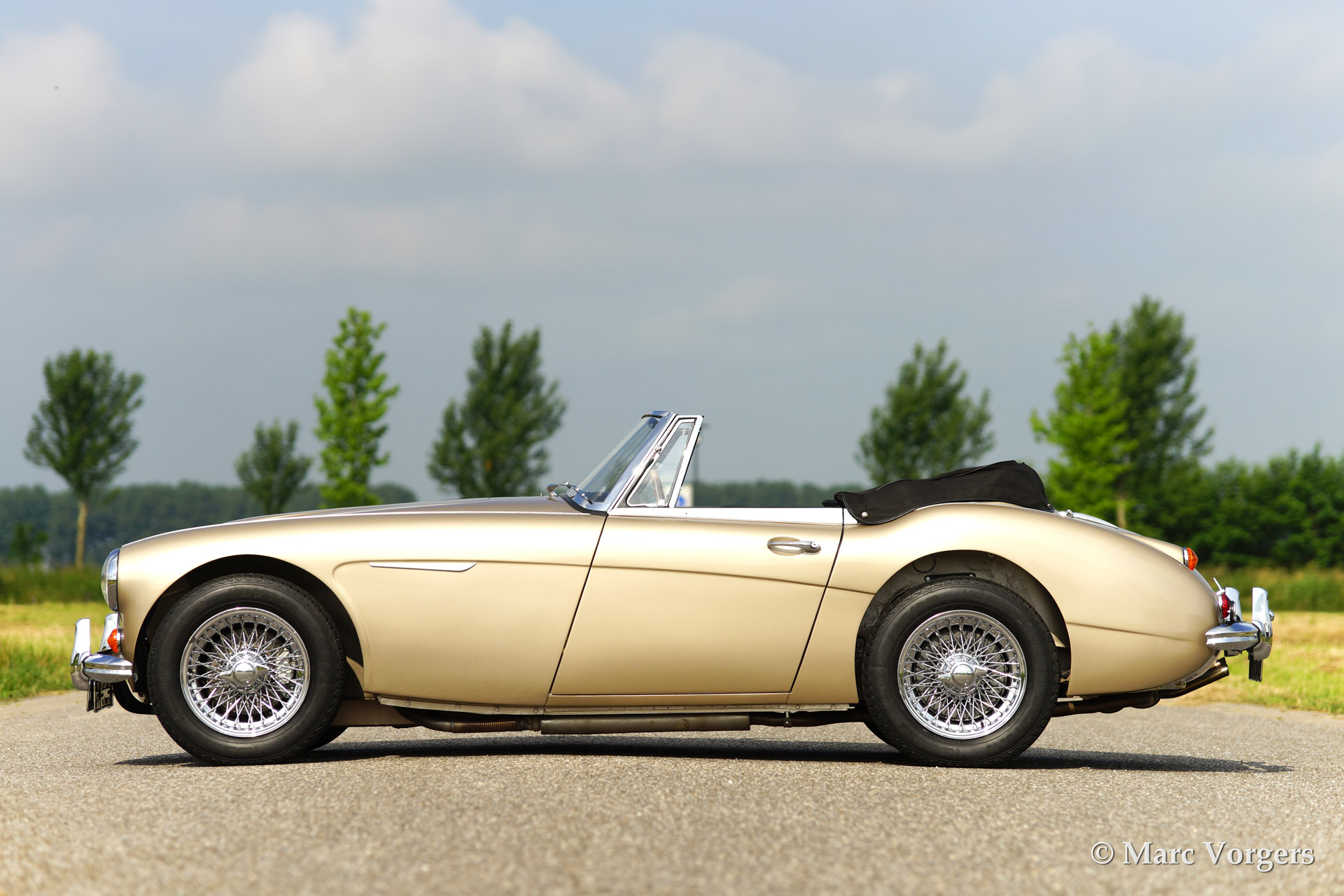 Austin Healey 3000 Mk III phase 2, year 1967. Colour Golden Beige metallic with a black leather interior piped beige. This fabulous 'Big Healey' was extensively and beautifully restored, the automobile is in concours (show) condition.