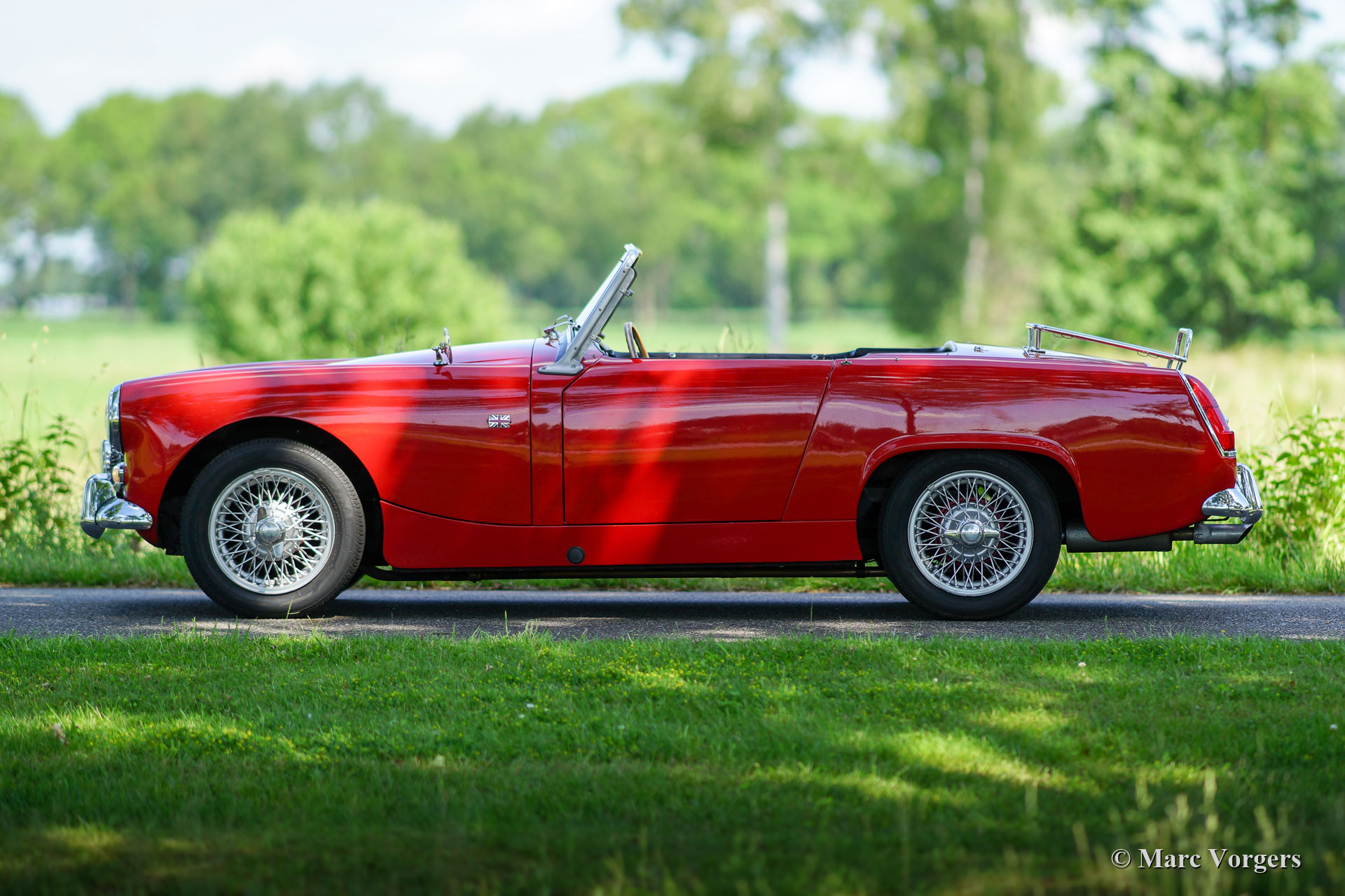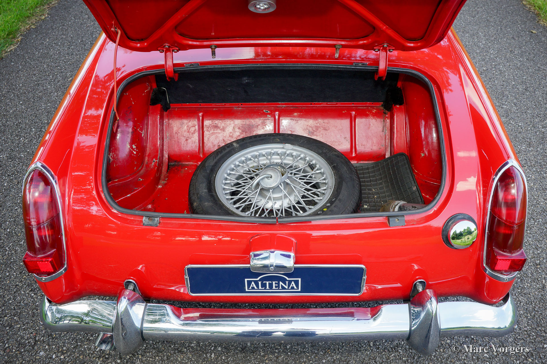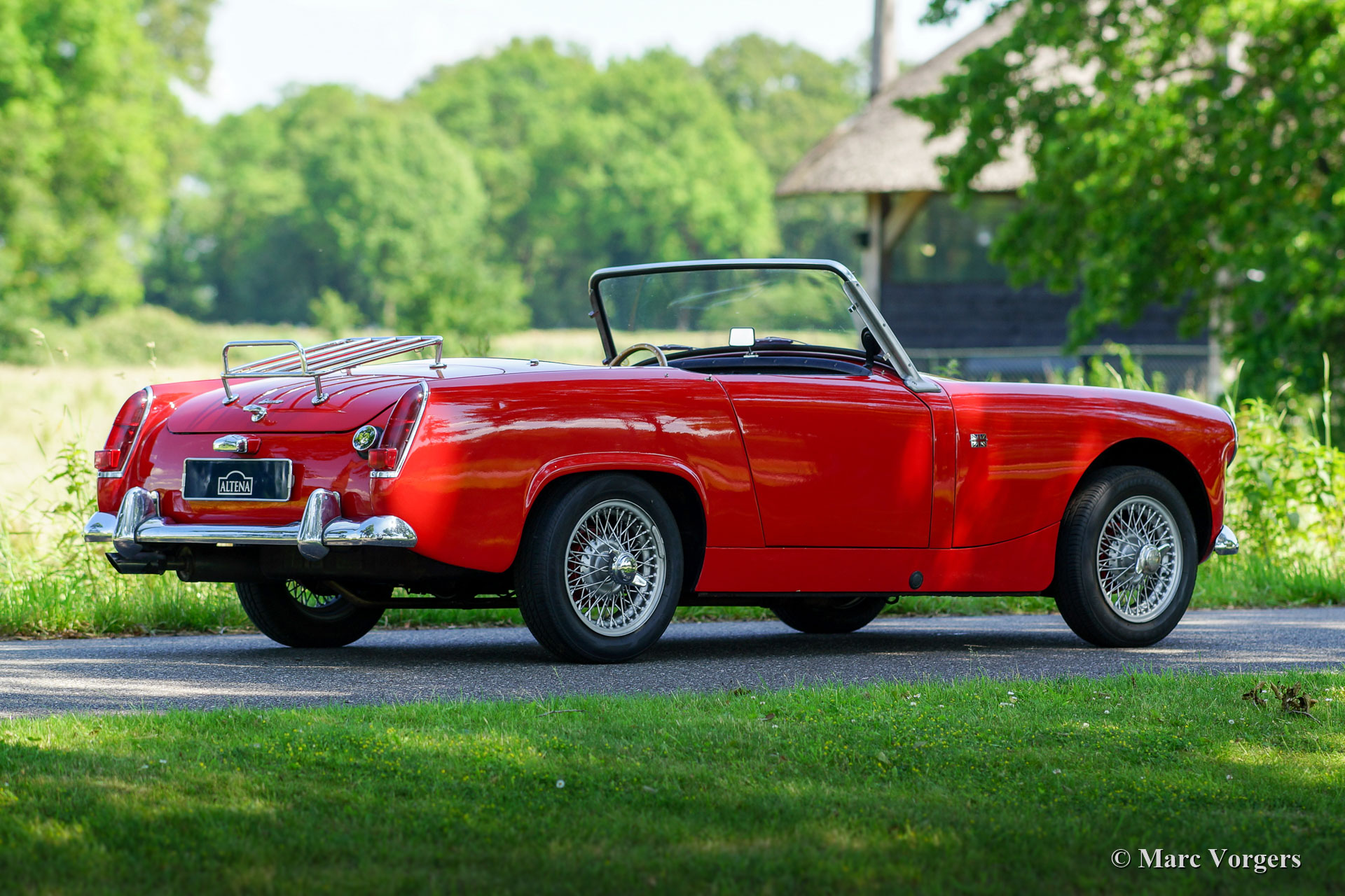 Austin Healey Sprite Mk II, Jahr 1963. Fahrgestellnummer 63HAN6L232XX. Farbe rot kombiniert mit einem schwarzen Kunstleder Interieur (mit weißen Paspeln) und schwarzem Teppich. Schwarzes Verdeck, Persenning und Seitenfenster Randen. Dieser begehrte Healey Sprite Mk II wurde aus den USA in die Niederlande importiert. Von 1995 bis zum Jahr 2000 wurde das Auto umfangreich restauriert. Die Karosserie hat eine gute Passform der Blechpaneele und der Motorraum ist sauber und gut detailliert. Der Innenraum und die Lackierung leichte Alters- und Gebrauchsspuren. Insgesamt ist dieser Austin Healey Sprite in einem sehr guten Zustand und das Auto fährt sich herrlich! Vor kurzem erhielt das Auto einen brandneuen 1275-cm³-Motor und eine elektrische Benzinpumpe. Das Auto wurde immer perfekt gewartet, Rechnungen liegen vor. Das Auto ist ausgestattet mit lackierten Speichenrädern, einem MotoLita-Sportlenkrad mit Holzkranz, zusätzlichen Fernscheinwerfern vorne, einer verchromten Gepäckablage, einer Alu-Ventildeckel und einem Edelstahl-Auspuff. Dieser schöne Healey Sprite wird mit fünf originalen Stahlrädern und dem originalen Lenkrad geliefert.