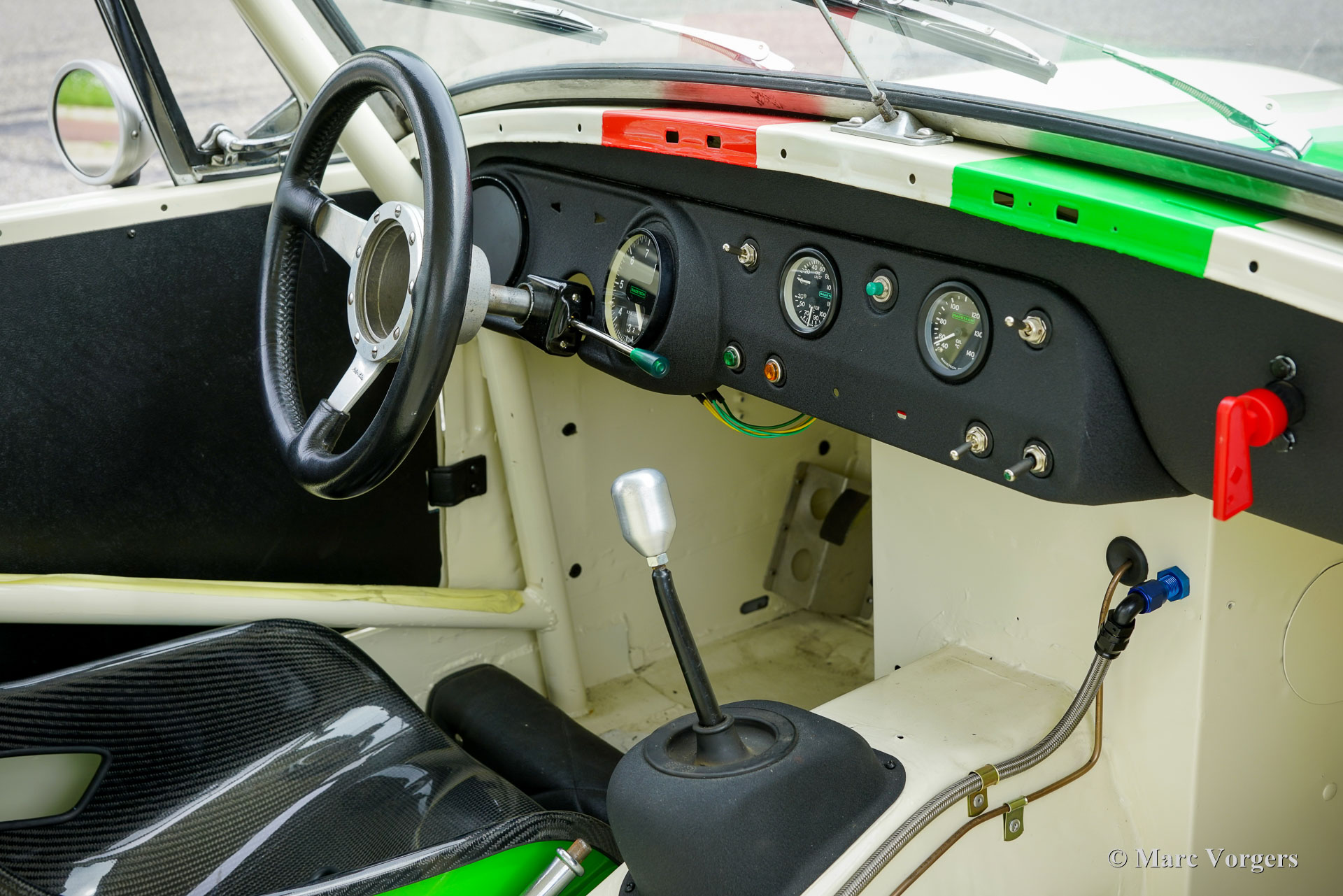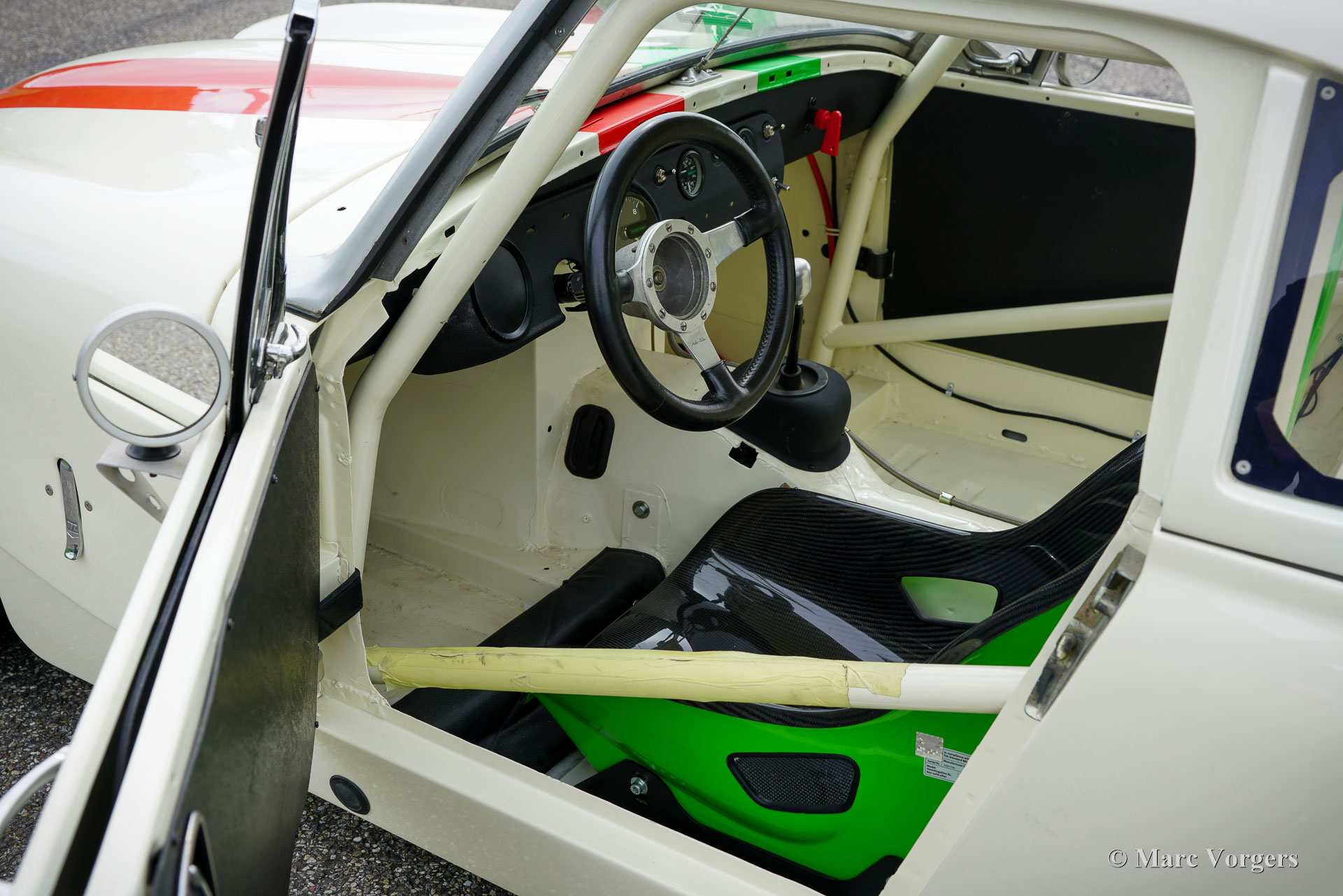 Austin Healey Sprite (MK 3) Rennwagen, Jahr 1965. Farbe cremeweiß mit roten und grünen Streifen. Blanker cremeweißer Innenraum mit schwarzem Tillet FIA-Rennschalensitz. Dieser prächtige Healey-Sprite-Rennwagen wurde Ende der 1990er Jahre mit einer brandneuen „Heritage“ Healey-Sprite-Karosserie gebaut. Nach der Fertigstellung wurde das Auto von Antonio Bertini (http://www.fisc-racing.com/drivers/bert.html) und anschließend von Michele Tommasi in den Rennserien FISC und HRDC gefahren. Im Jahr 2006 wurde das Auto von Rae Davis für die Goodwood Fordwater Trophy auf Rennen vorbereitet, bei der sich Michele Tommasi gegen viel leistungsstärkere Autos für den dritten Platz qualifizierte. Tommasi beendete dieses Rennen in der Kiesgrube nach einem großartigen Duell an der Spitze des Feldes. Seitdem fuhr der Sprite regelmäßig Rennen und wurde 2013 vom jetzigen Besitzer gekauft. Nach einigen Ausflügen auf Rennstrecken wurde das Auto zur umfassenden Restaurierung und Überholung wieder zu Rae Davis geschickt. Fast jedes Teil des Autos wurde restauriert, revidiert, erneuert und verbessert. Motorhaube, Hardtop und Kofferraumdeckel wurden durch leichtere glasfaserverstärkte (GFK) Teile von Hersteller Asley ersetzt. Die Karosserie wurde aus blankem Metall neu lackiert. Es wurde ein maßgeschneiderter vollständiger Überrollkäfig eingebaut und ein Tillet-Rennschalensitz eingebaut. Dieser beeindruckend schnelle Austin Sprite-Rennwagen kommt ohne Straßenzulassung; nur für gebrauch auf geschlossene Rennstrecken! Lesen Sie unten eine Zusammenfassung der Spezifikationen. Dieser Austin Healey Sprite ist ein „schlüsselfertiger“ Rennwagen für ein Liebhaber, der in die Welt des historischen Tourenwagenrennsports einsteigen möchte.