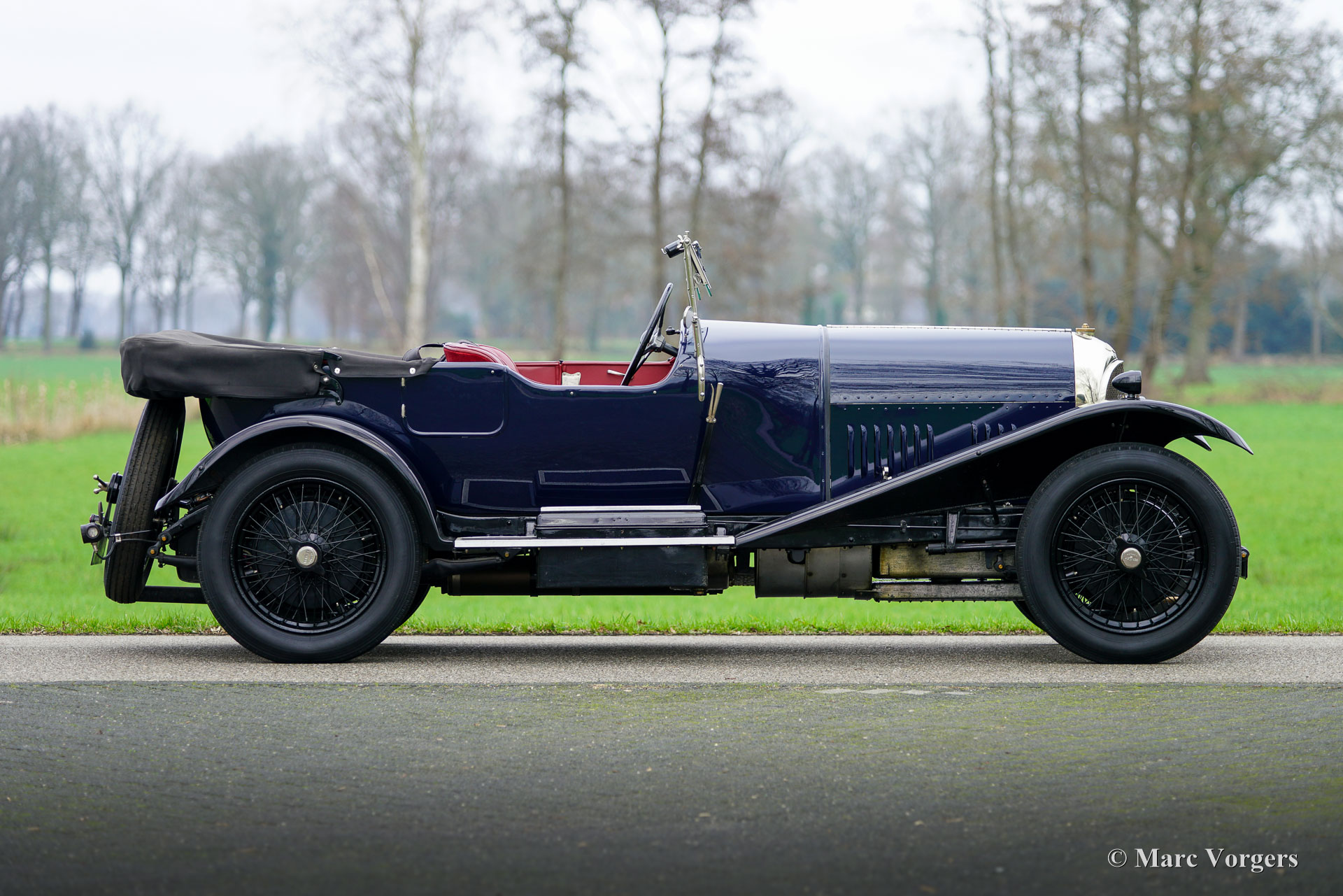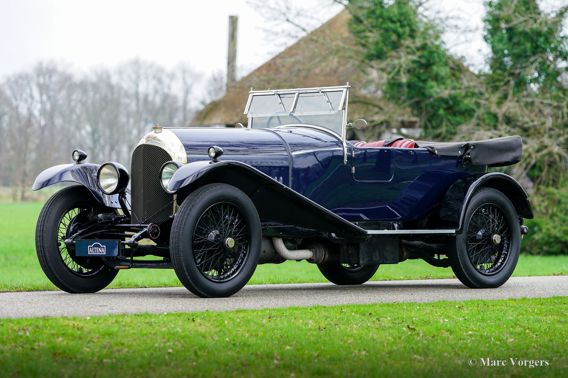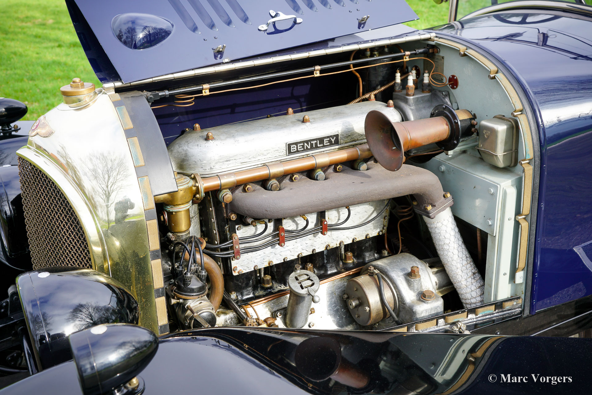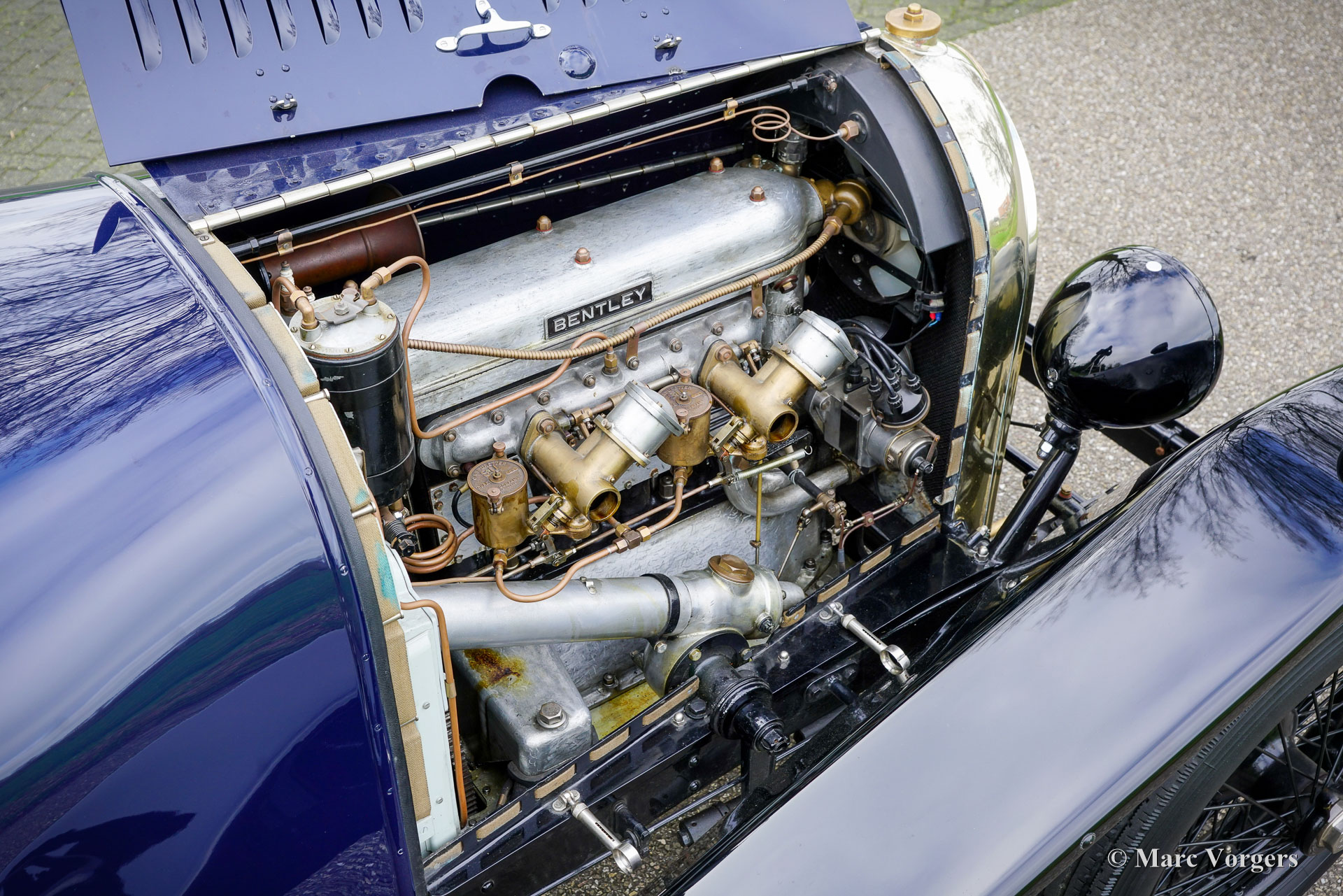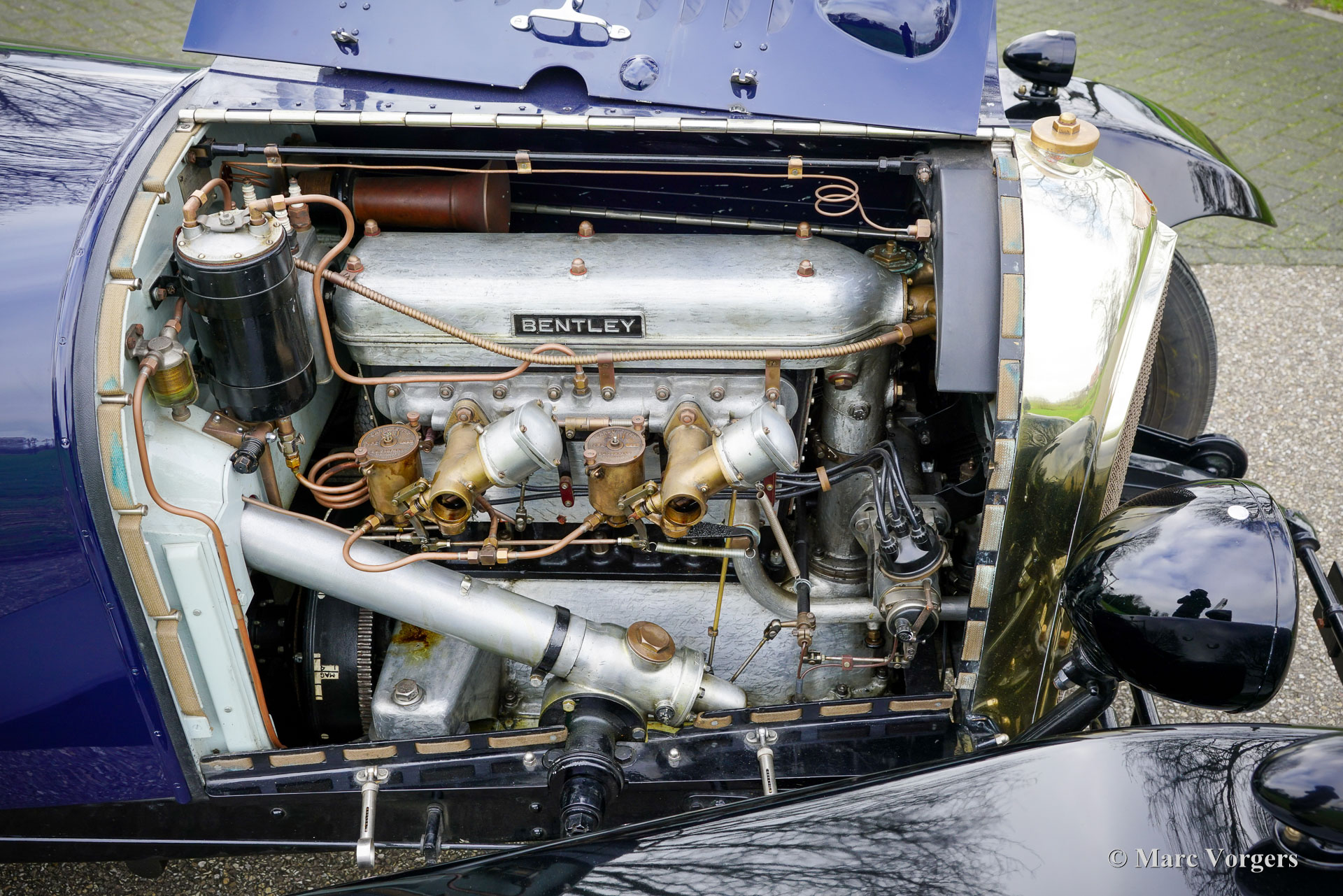 Bentley 3-Liter-Speed-Modell, Baujahr 1924. Farbe dunkelblau mit schwarzen Speichenrädern kombiniert mit einer roten Lederausstattung mit rotem Wollteppich. Schwarzes Verdeck, Verdeck Abdeckung und Persenning. Dieses originale Bentley 3-Liter ‚red badge‘ Speed-Modell mit kurzem Fahrgestell wurde im Vereinigten Königreich neu verkauft und war im Vergangenheit mit einer „Park Ward“-Karosserie ausgestattet. In späteren Jahren erhielt das Auto die aktuelle 4-Sitzer-Karosserie des offenen Tourers. Das Auto wurde von einem Bentley-Spezialisten mit Sinn für Originalität umfassend restauriert und überholt. Der Motor und alle mechanischen Teile wurden komplett überholt. Alle wichtigen Fahrgestell- und mechanischen Teile sind original ab Werk, die Nummern auf Fahrgestell, Motor, Getriebe, Lenkgetriebe und Hinterachse stimmen mit diesem Auto überein, wie es das Bentley Werk im Jahr 1924 verließ! Das Auto weist viele wundervolle Originaldetails auf, wie die bemerkenswerten Sloper-Vergaser und die mit Bentley gekennzeichneten Armaturenbrettinstrumente. Die gesamte Geschichte ist bekannt und dokumentiert, außerdem liegt ein Fotobericht der umfangreichen Restaurierung vor. Dieses Bentley 3-Litre Speed-Modell wird im Buch „Bentley The Vintage Years“ erwähnt, einem Standardwerk über Bentley von Clare Hay. Dieser herrliche Bentley 3-Liter ist in einem wunderbaren und sehr guten Zustand. Das Automobil atmet die Qualität von W.O. Bentley die er sich vorgestellt hat als er seinen „3-Liter“ entwickelte; „Ein schnelles Auto, ein gutes Auto, das Beste seiner Klasse.“ Der 3-Liter-Motor verfügte als eines der erste in der Welt über vier Ventilen pro Zylinder, Trockensumpfschmierung und einer obenliegenden Nockenwelle. Das erste 3-Liter-Chassis wurde 1919 auf der London (Olympia) Motor Show gezeigt und 1921 erstmals an Kunden ausgeliefert. Zwischen der Show und 1921 war viel Arbeit nötig, um die Verfeinerung zu verbessern. Als W.O. schrieb später: „Ich hasse Lärm um des Lärms willen. 70 Meilen pro Stunde in der Stille sind weitaus mehr lobenswert als laute 80 Meilen pro Stunde.“ Der 3-Liter wurde von der Automobilpresse sehr gut aufgenommen. Sammy Davis von Autocar schrieb: „Für den Mann, der ein wirklich sportliches, leichtes Auto für den Einsatz auf einer Kontinentaltour sucht – wo Geschwindigkeitsbegrenzungen nicht eingehalten werden dürfen – ist der 3-Liter-Bentley zweifellos das Auto schlechthin.“ ” Von Anfang an wurde der robuste und leistungsstarke 3-Liter-Bentley bei Wettbewerben und Rennen eingesetzt. Der 3-Liter gewann unzählige Rennen, unter anderem die legendären 24 Stunden von Le Mans in den Jahren 1924 und 1927. Ein Privatbesitzer (John Duff) stellte 1925 am Steuer eines Bentleys 3-Liter auch 21 Weltrekorde in 24 Stunden auf. Zwischen 1921 und 1929 wurden insgesamt 1622 Bentley 3-Liter-Modelle hergestellt. Dieses Bentley 3-Liter-Modell ist ein großartiges Produkt dieser abenteuerlichen frühen Bentley Motors-Periode. Ein wunderbares Sammlerstück und eine Traummaschine für Oldtimer-Bentley-Fahrer und Bentley-Enthusiasten.