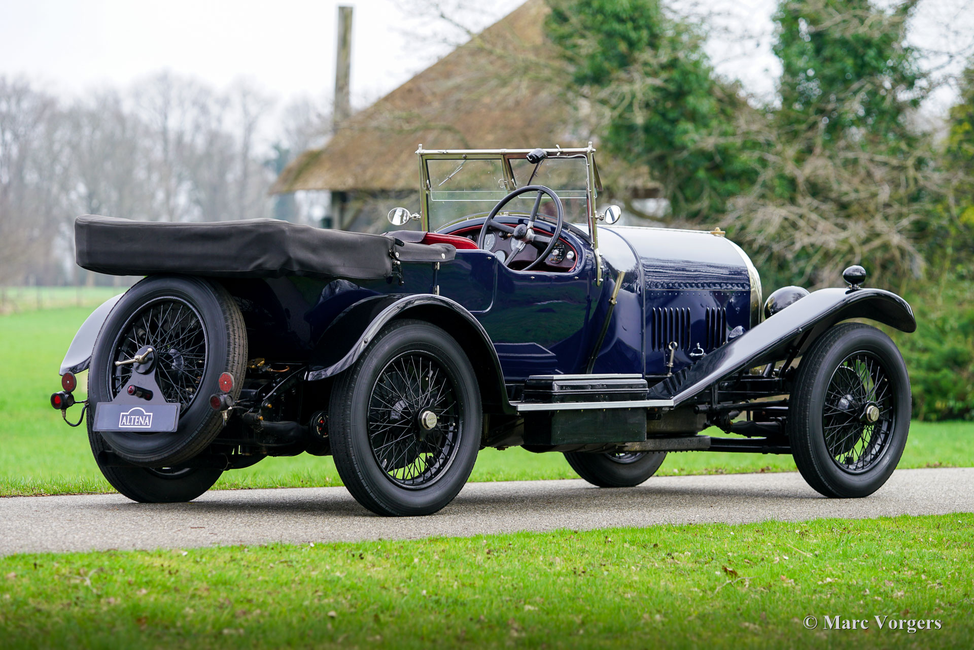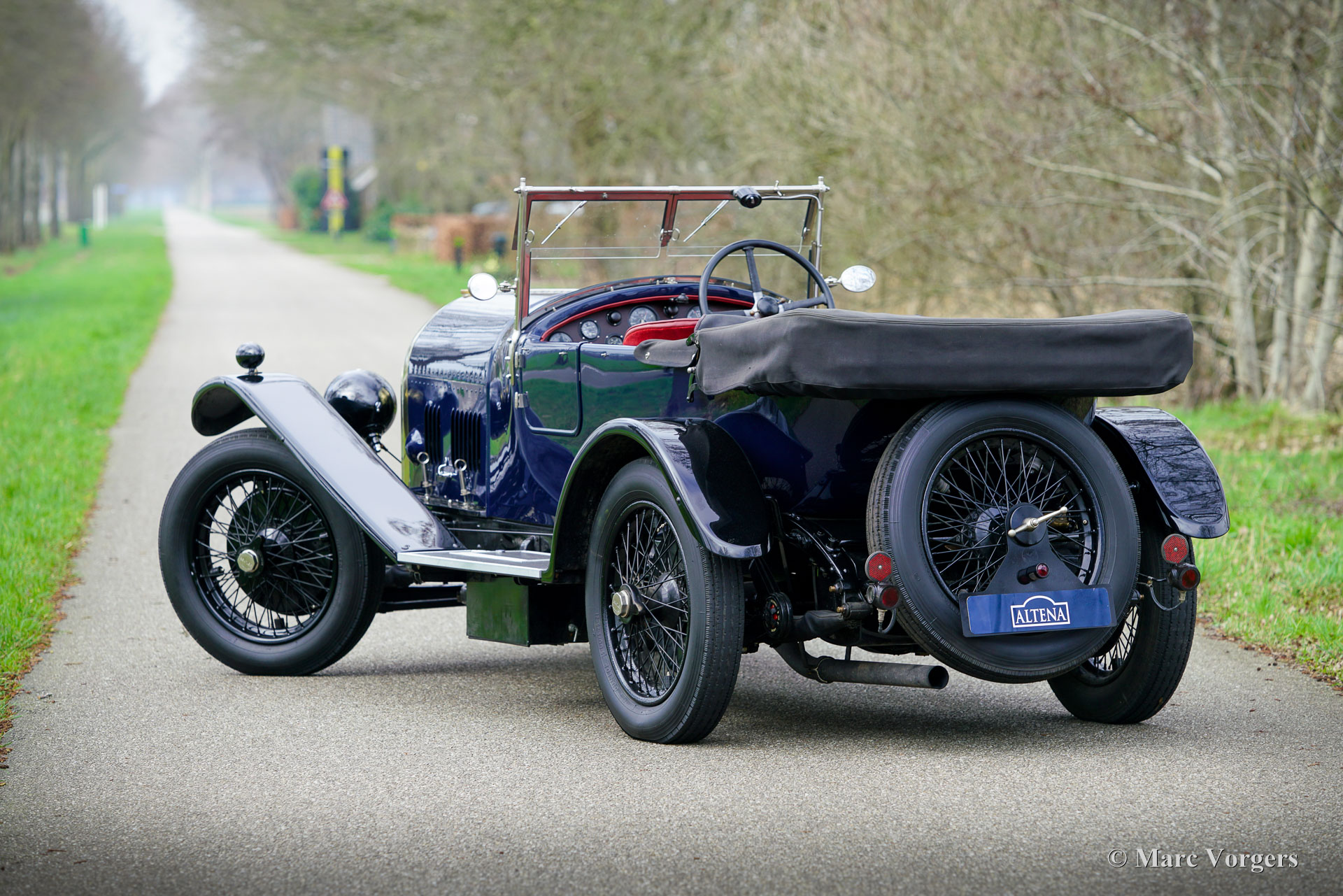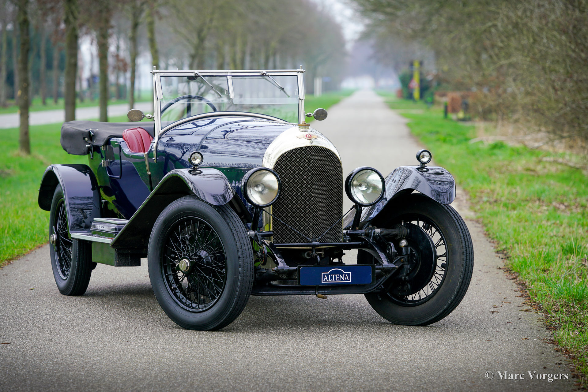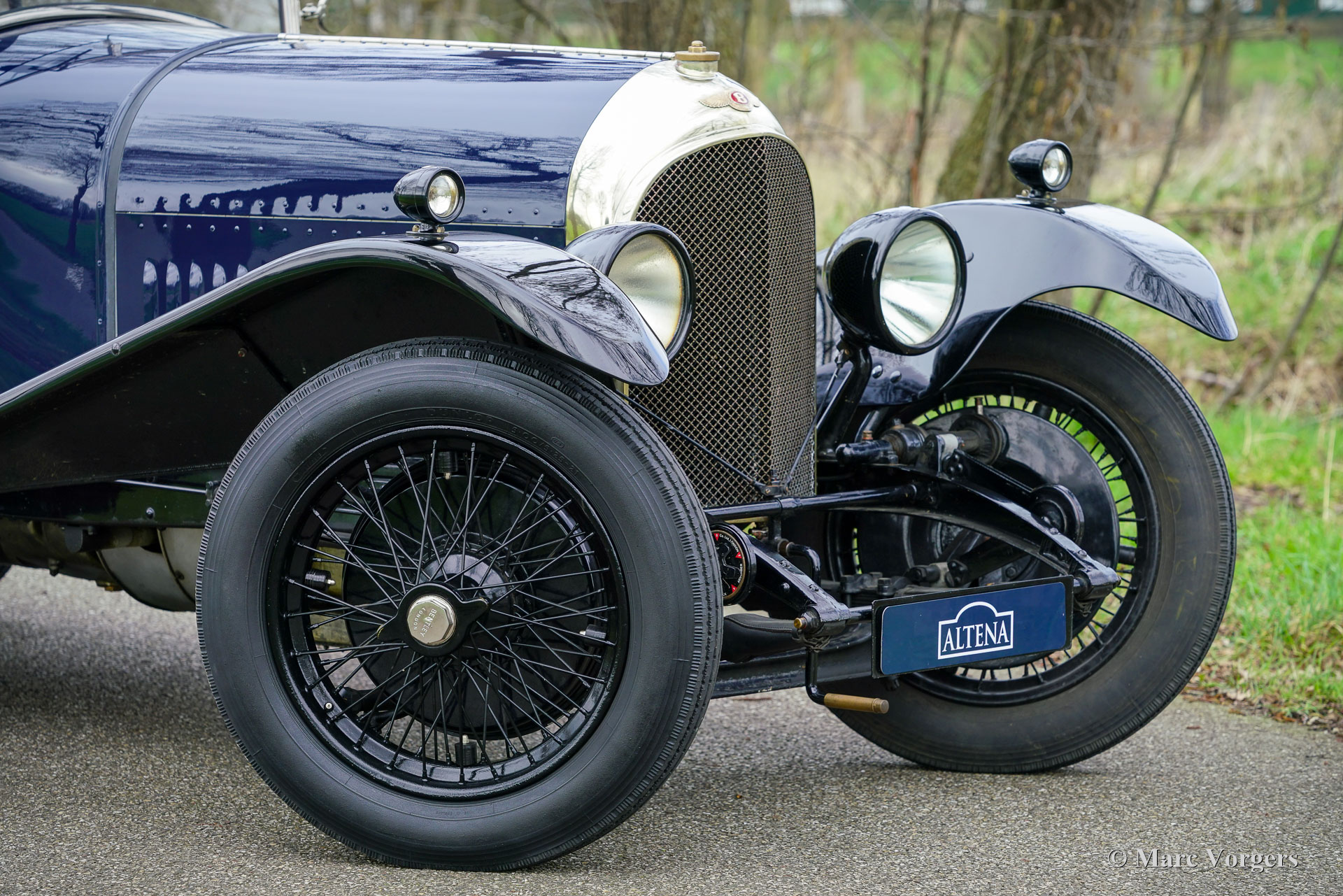 Bentley 3-Liter-Speed-Modell, Baujahr 1924. Farbe dunkelblau mit schwarzen Speichenrädern kombiniert mit einer roten Lederausstattung mit rotem Wollteppich. Schwarzes Verdeck, Verdeck Abdeckung und Persenning. Dieses originale Bentley 3-Liter ‚red badge‘ Speed-Modell mit kurzem Fahrgestell wurde im Vereinigten Königreich neu verkauft und war im Vergangenheit mit einer „Park Ward“-Karosserie ausgestattet. In späteren Jahren erhielt das Auto die aktuelle 4-Sitzer-Karosserie des offenen Tourers. Das Auto wurde von einem Bentley-Spezialisten mit Sinn für Originalität umfassend restauriert und überholt. Der Motor und alle mechanischen Teile wurden komplett überholt. Alle wichtigen Fahrgestell- und mechanischen Teile sind original ab Werk, die Nummern auf Fahrgestell, Motor, Getriebe, Lenkgetriebe und Hinterachse stimmen mit diesem Auto überein, wie es das Bentley Werk im Jahr 1924 verließ! Das Auto weist viele wundervolle Originaldetails auf, wie die bemerkenswerten Sloper-Vergaser und die mit Bentley gekennzeichneten Armaturenbrettinstrumente. Die gesamte Geschichte ist bekannt und dokumentiert, außerdem liegt ein Fotobericht der umfangreichen Restaurierung vor. Dieses Bentley 3-Litre Speed-Modell wird im Buch „Bentley The Vintage Years“ erwähnt, einem Standardwerk über Bentley von Clare Hay. Dieser herrliche Bentley 3-Liter ist in einem wunderbaren und sehr guten Zustand. Das Automobil atmet die Qualität von W.O. Bentley die er sich vorgestellt hat als er seinen „3-Liter“ entwickelte; „Ein schnelles Auto, ein gutes Auto, das Beste seiner Klasse.“ Der 3-Liter-Motor verfügte als eines der erste in der Welt über vier Ventilen pro Zylinder, Trockensumpfschmierung und einer obenliegenden Nockenwelle. Das erste 3-Liter-Chassis wurde 1919 auf der London (Olympia) Motor Show gezeigt und 1921 erstmals an Kunden ausgeliefert. Zwischen der Show und 1921 war viel Arbeit nötig, um die Verfeinerung zu verbessern. Als W.O. schrieb später: „Ich hasse Lärm um des Lärms willen. 70 Meilen pro Stunde in der Stille sind weitaus mehr lobenswert als laute 80 Meilen pro Stunde.“ Der 3-Liter wurde von der Automobilpresse sehr gut aufgenommen. Sammy Davis von Autocar schrieb: „Für den Mann, der ein wirklich sportliches, leichtes Auto für den Einsatz auf einer Kontinentaltour sucht – wo Geschwindigkeitsbegrenzungen nicht eingehalten werden dürfen – ist der 3-Liter-Bentley zweifellos das Auto schlechthin.“ ” Von Anfang an wurde der robuste und leistungsstarke 3-Liter-Bentley bei Wettbewerben und Rennen eingesetzt. Der 3-Liter gewann unzählige Rennen, unter anderem die legendären 24 Stunden von Le Mans in den Jahren 1924 und 1927. Ein Privatbesitzer (John Duff) stellte 1925 am Steuer eines Bentleys 3-Liter auch 21 Weltrekorde in 24 Stunden auf. Zwischen 1921 und 1929 wurden insgesamt 1622 Bentley 3-Liter-Modelle hergestellt. Dieses Bentley 3-Liter-Modell ist ein großartiges Produkt dieser abenteuerlichen frühen Bentley Motors-Periode. Ein wunderbares Sammlerstück und eine Traummaschine für Oldtimer-Bentley-Fahrer und Bentley-Enthusiasten.