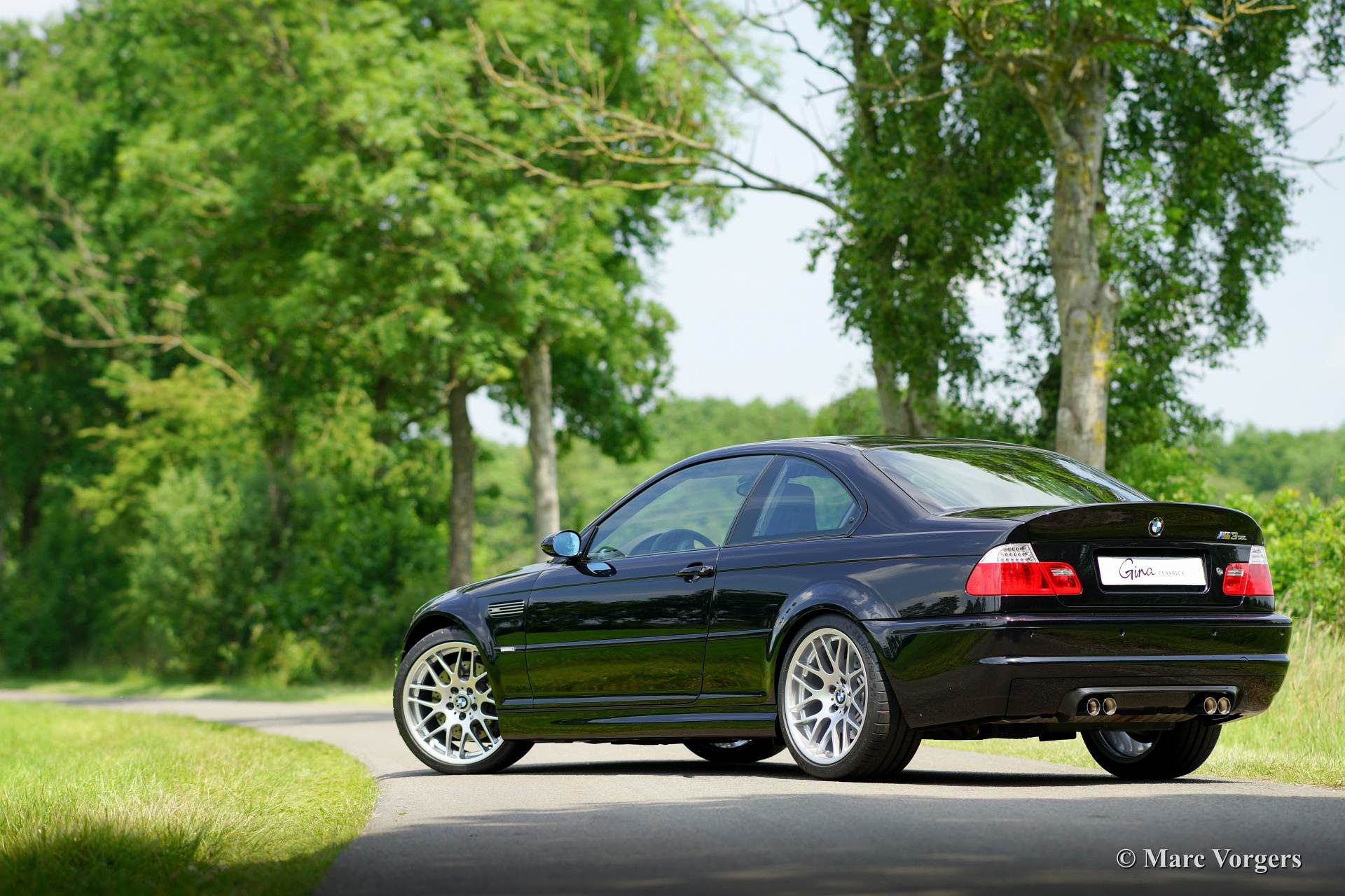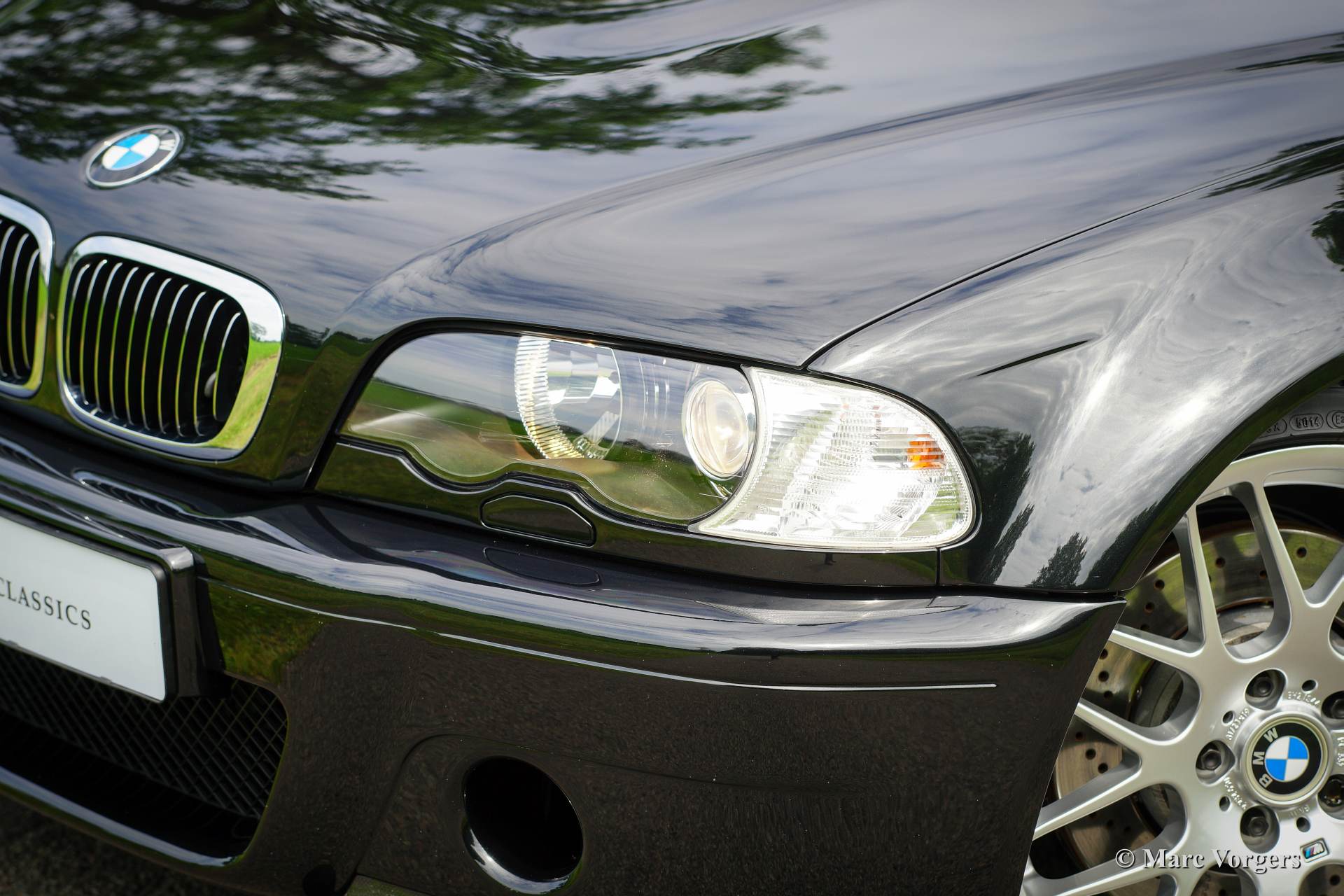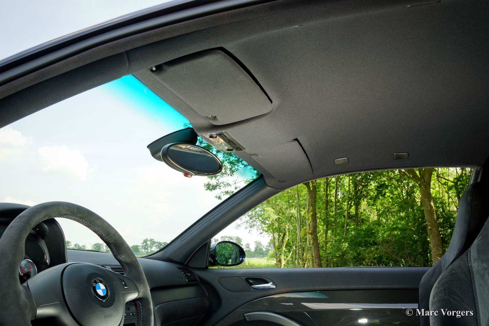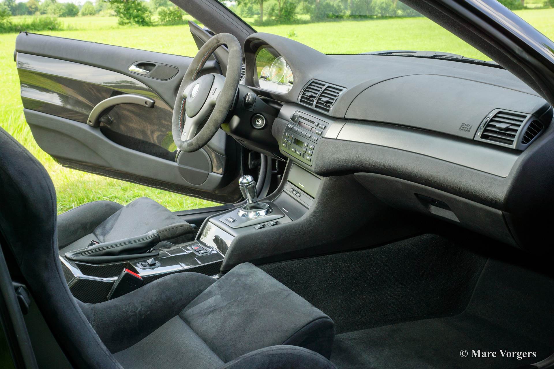 BMW M3 CSL, Jahr 2003. Farbe Saphir schwarz (Code 475) mit einem anthrazit / grau farbiges 'Amaretta Reflex' Innenraum. Dieses fabelhafte BMW M3 CSL (Modell E46) wurde neu geliefert in Deutschland. Der BMW M3 CSL ist wie alle BMW M-Modelle 'Geboren auf der Rennstrecke und zu Hause auf jeder Straße. Der M3 CSL (Coupé Sport Leichtbau) ist eine besondere und seltenes M3-Modell, Der CSL wurde in einer limitierten Auflage hergestellt von Juni bis Dezember 2003. Der CSL ist gebaut mit ultraleichten Kohlefaserteilen für das Dach und dem Kofferraumdeckel. Weiterhin wurde die Lenkung einen Hauch extra zusätzlichen Schärfe gegeben und der Motor bis zu 360 PS abgestimmt. Eine lustvolle 17 PS mehr als der "Standard" E46 M3. Der Wagen verfügt über einen automatischen 6-Gang-SMG-Getriebe mit Schalt "Paddel" an dem Lenkrad.