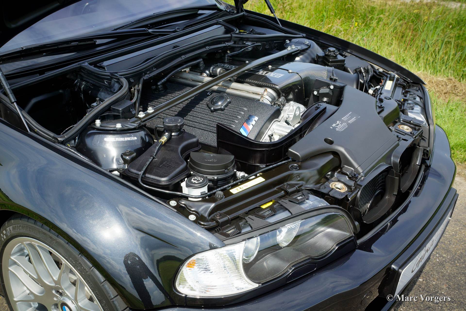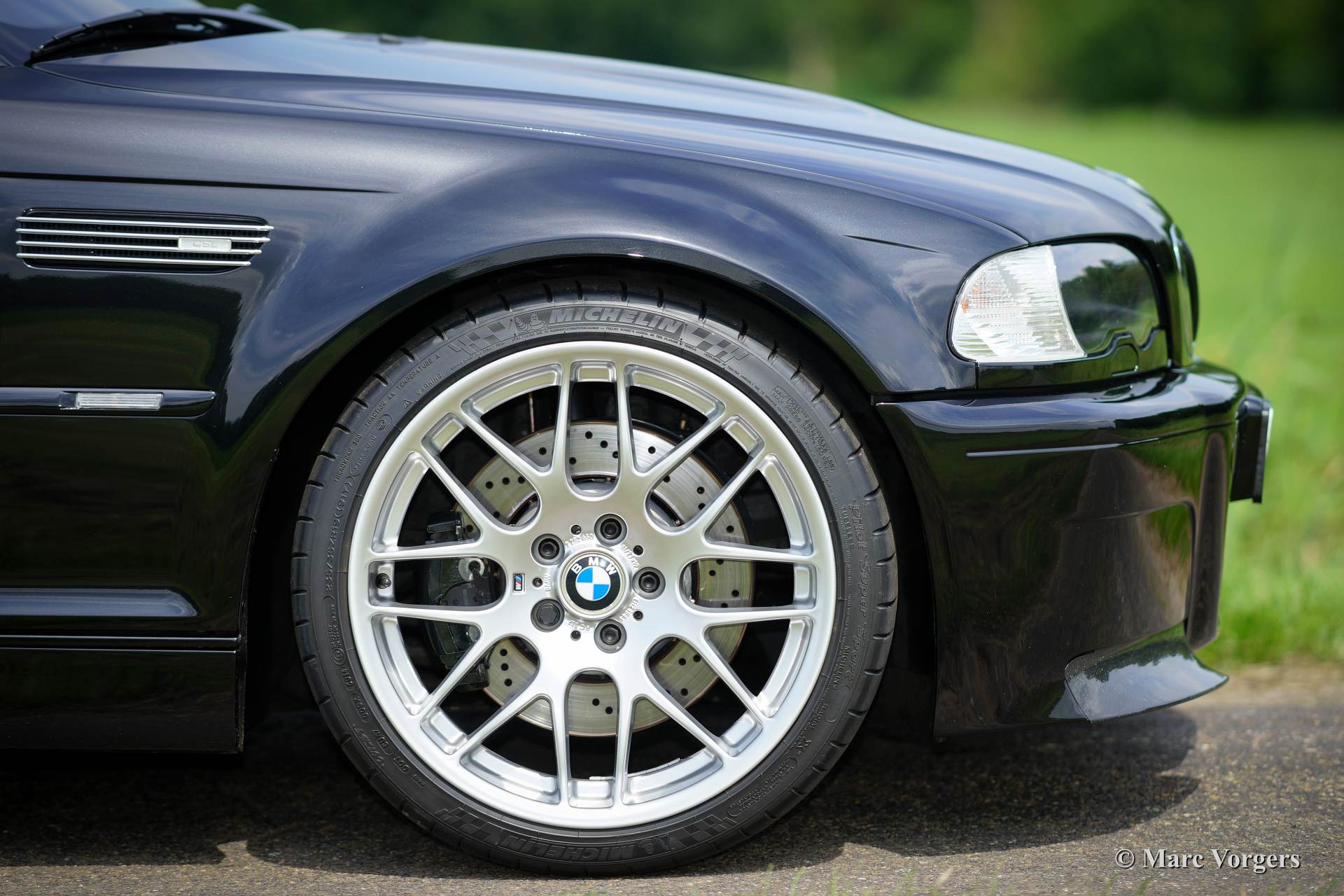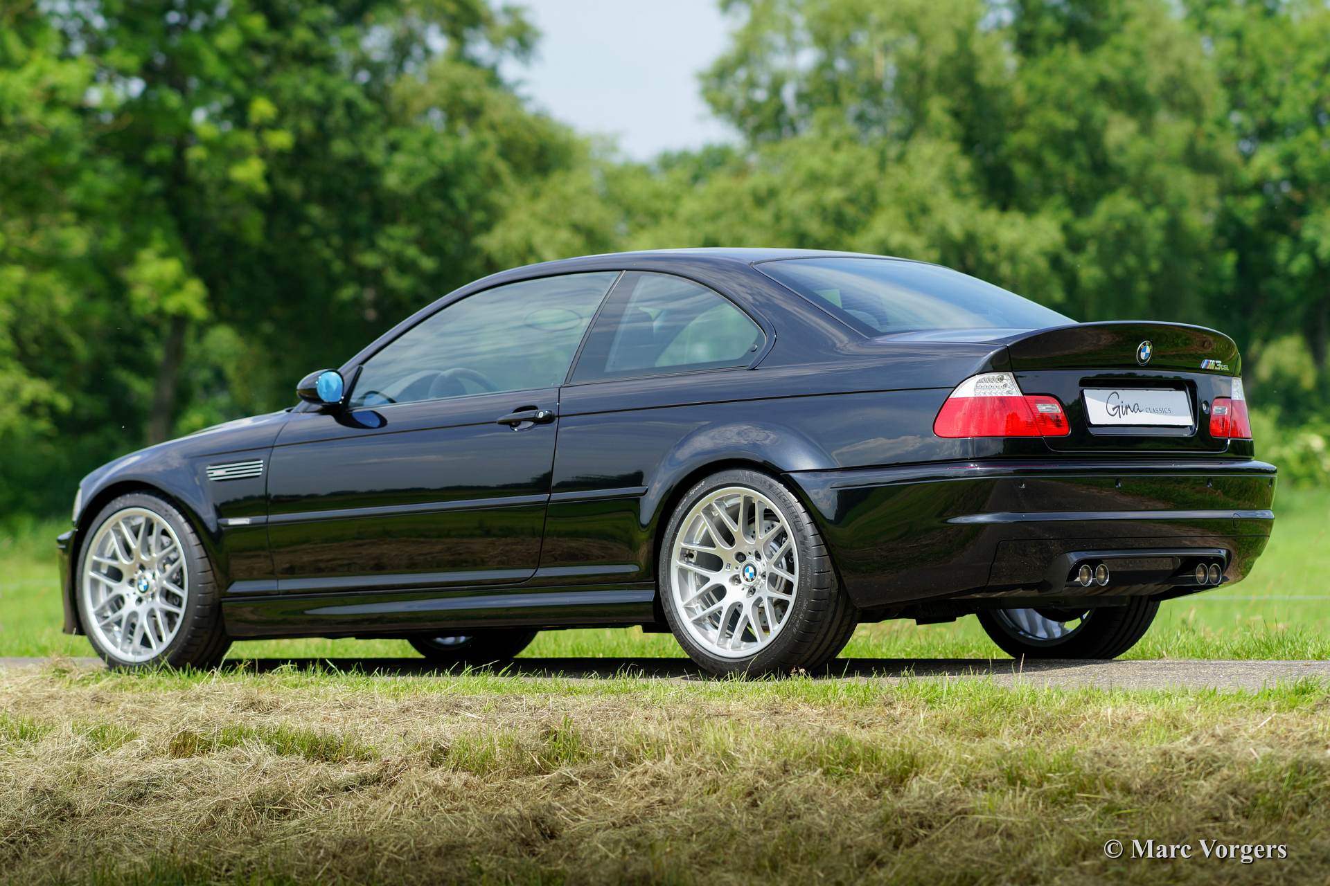 BMW M3 CSL, Jahr 2003. Farbe Saphir schwarz (Code 475) mit einem anthrazit / grau farbiges 'Amaretta Reflex' Innenraum. Dieses fabelhafte BMW M3 CSL (Modell E46) wurde neu geliefert in Deutschland. Der BMW M3 CSL ist wie alle BMW M-Modelle 'Geboren auf der Rennstrecke und zu Hause auf jeder Straße. Der M3 CSL (Coupé Sport Leichtbau) ist eine besondere und seltenes M3-Modell, Der CSL wurde in einer limitierten Auflage hergestellt von Juni bis Dezember 2003. Der CSL ist gebaut mit ultraleichten Kohlefaserteilen für das Dach und dem Kofferraumdeckel. Weiterhin wurde die Lenkung einen Hauch extra zusätzlichen Schärfe gegeben und der Motor bis zu 360 PS abgestimmt. Eine lustvolle 17 PS mehr als der "Standard" E46 M3. Der Wagen verfügt über einen automatischen 6-Gang-SMG-Getriebe mit Schalt "Paddel" an dem Lenkrad.