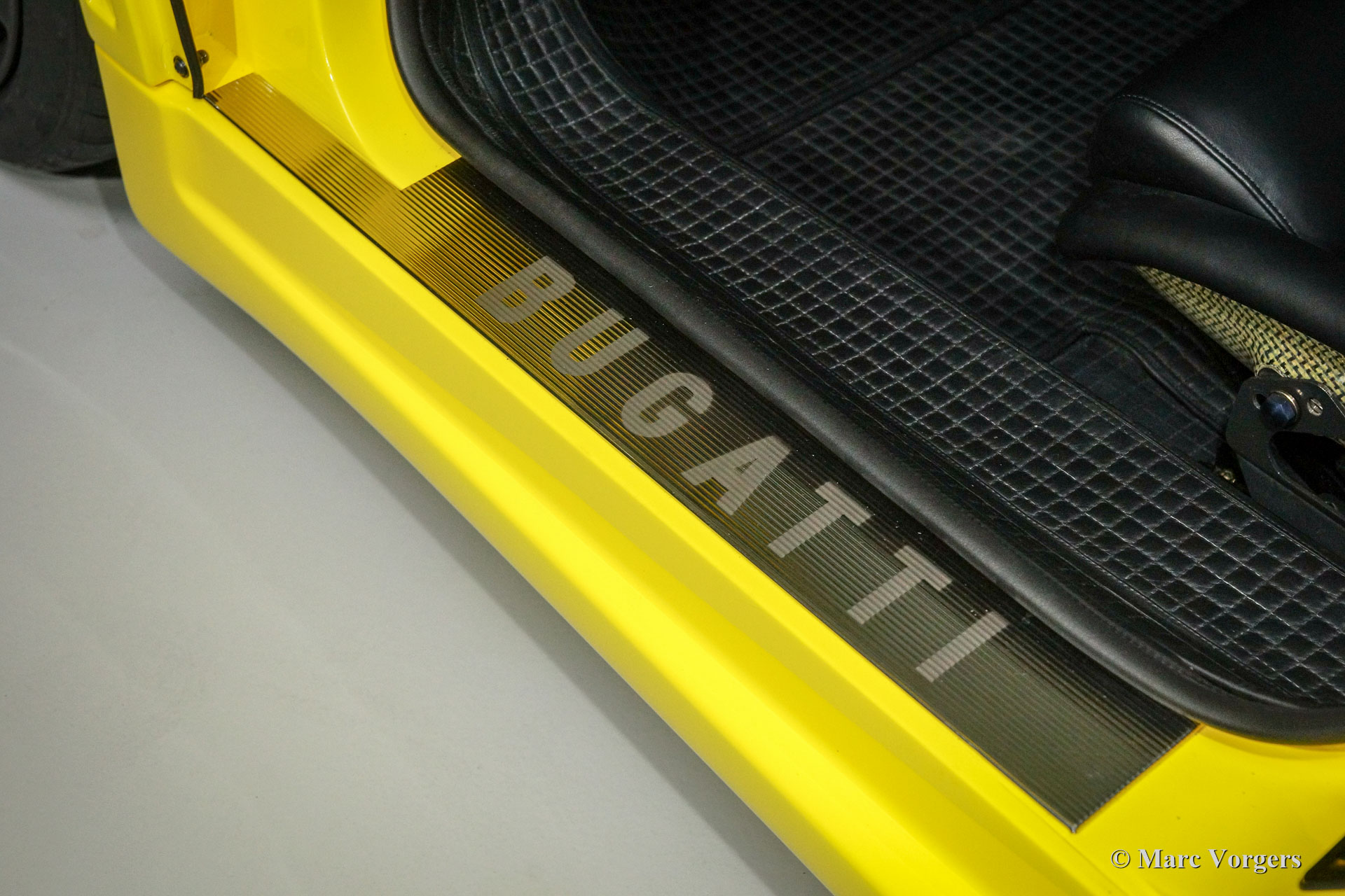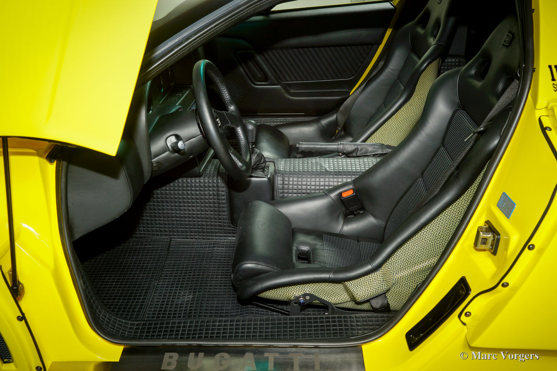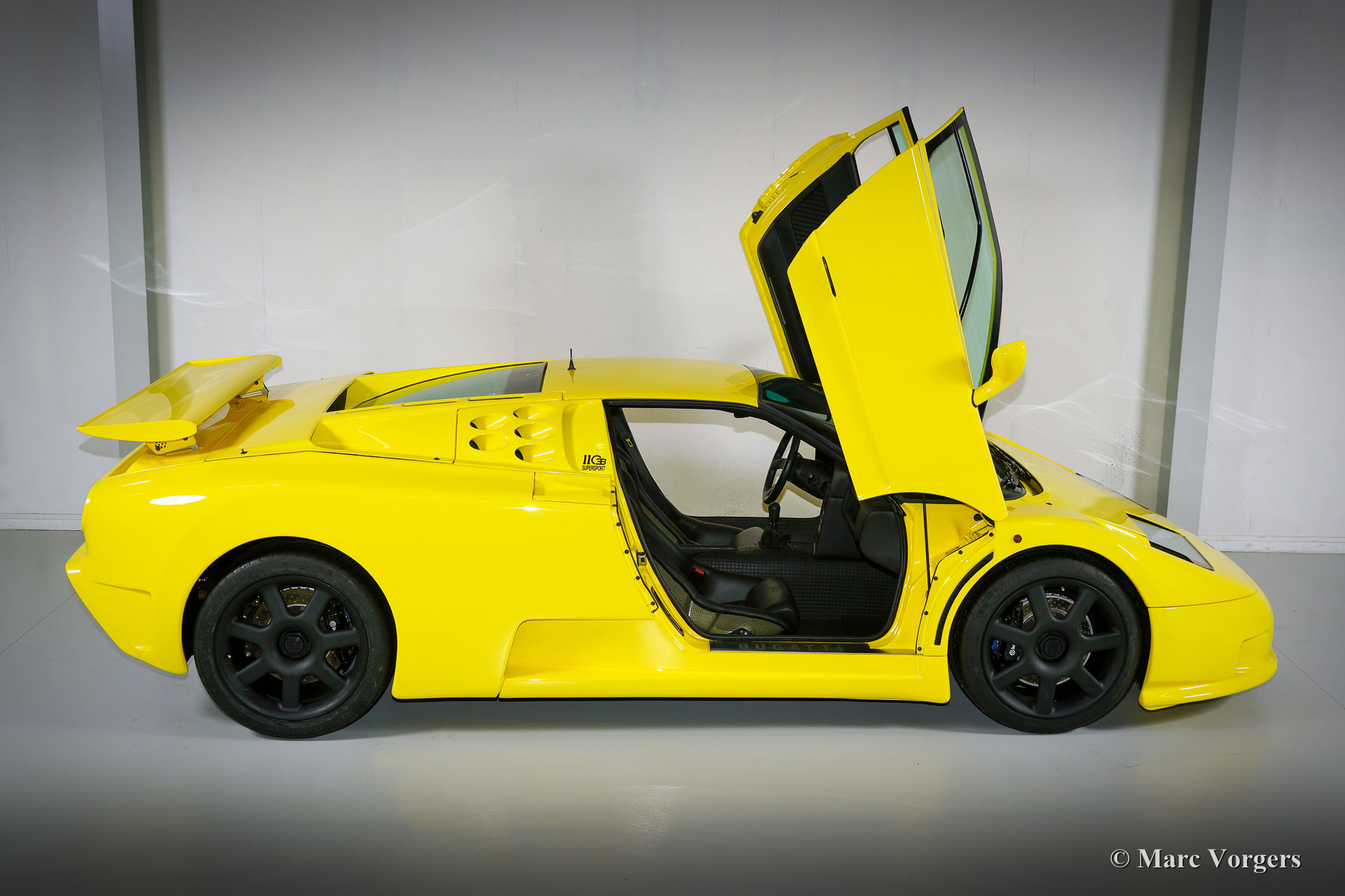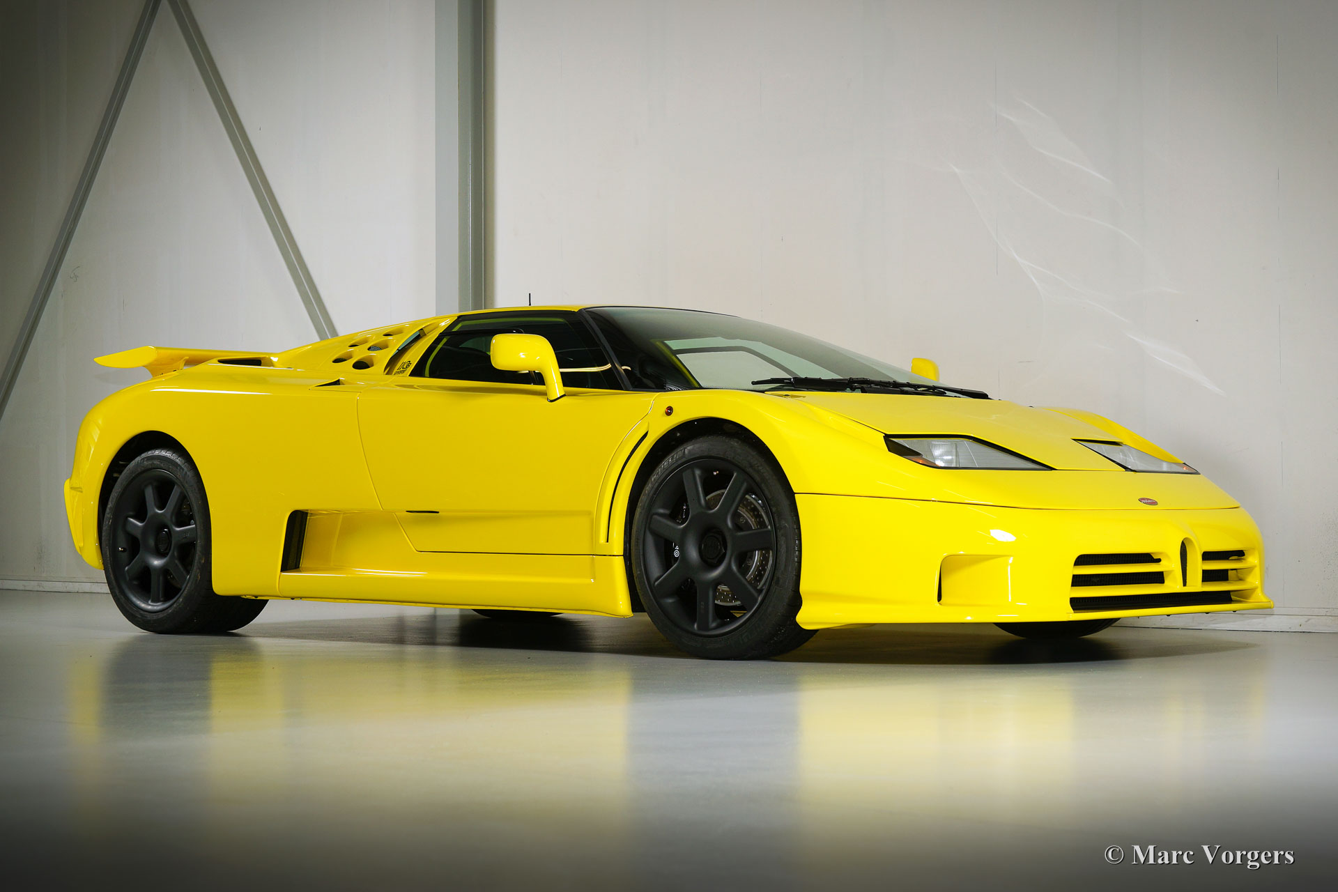 Bugatti EB110 SS (Super Sport), Jahr 1994. Farbe 'Giallo' (gelb) mit einer schwarzen Lederausstattung von Poltrona Frau. Dieses herrliche Bugatti EB110 SS ist eine der nur 33 EB110 Supersport-Modelle die je gebaut wurden. Nur vier dieser Autos wurden in gelb geliefert. Dieses Auto ist das einzige Beispiel, das die Fabrik mit schwarzen Rädern verlassen hat.
