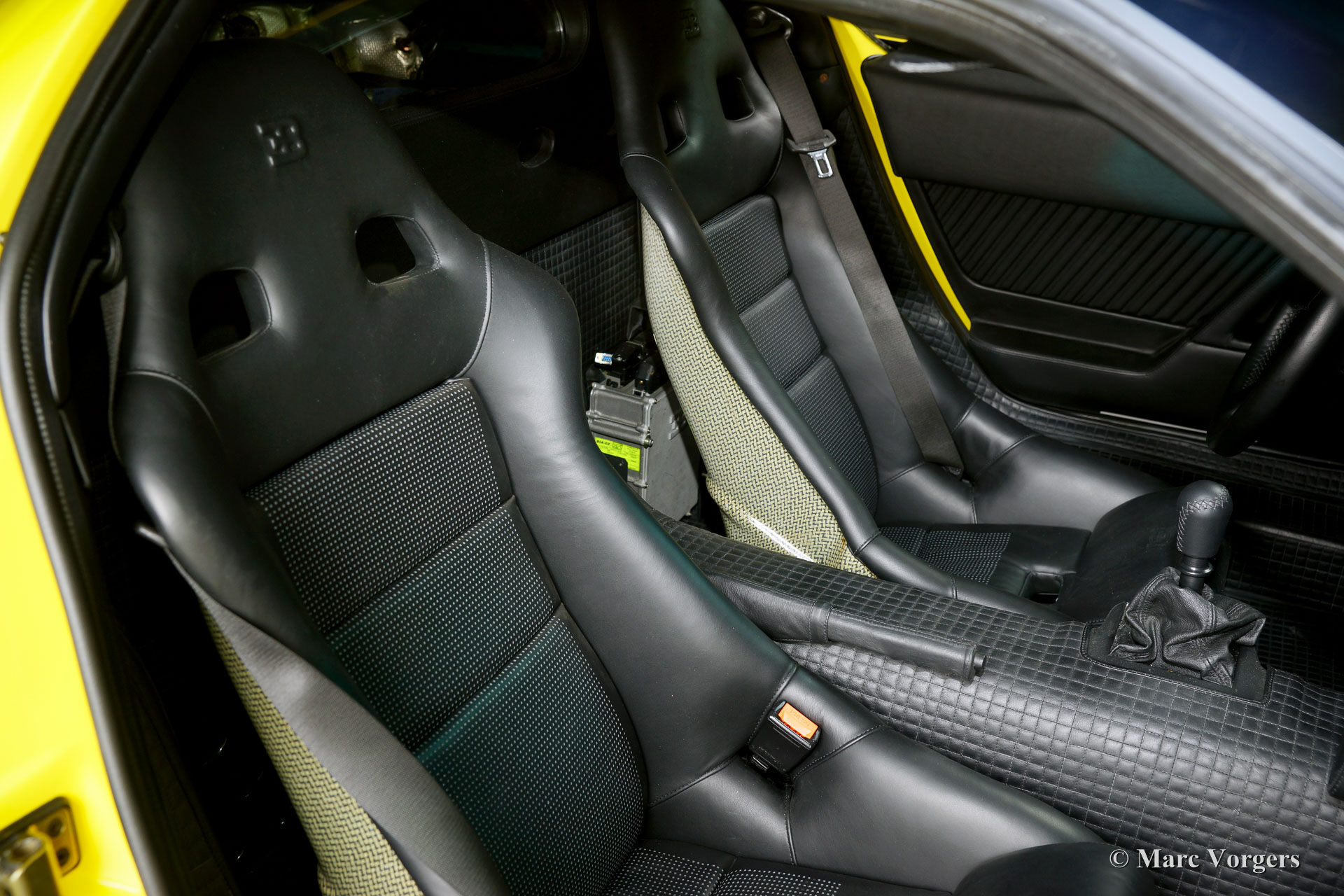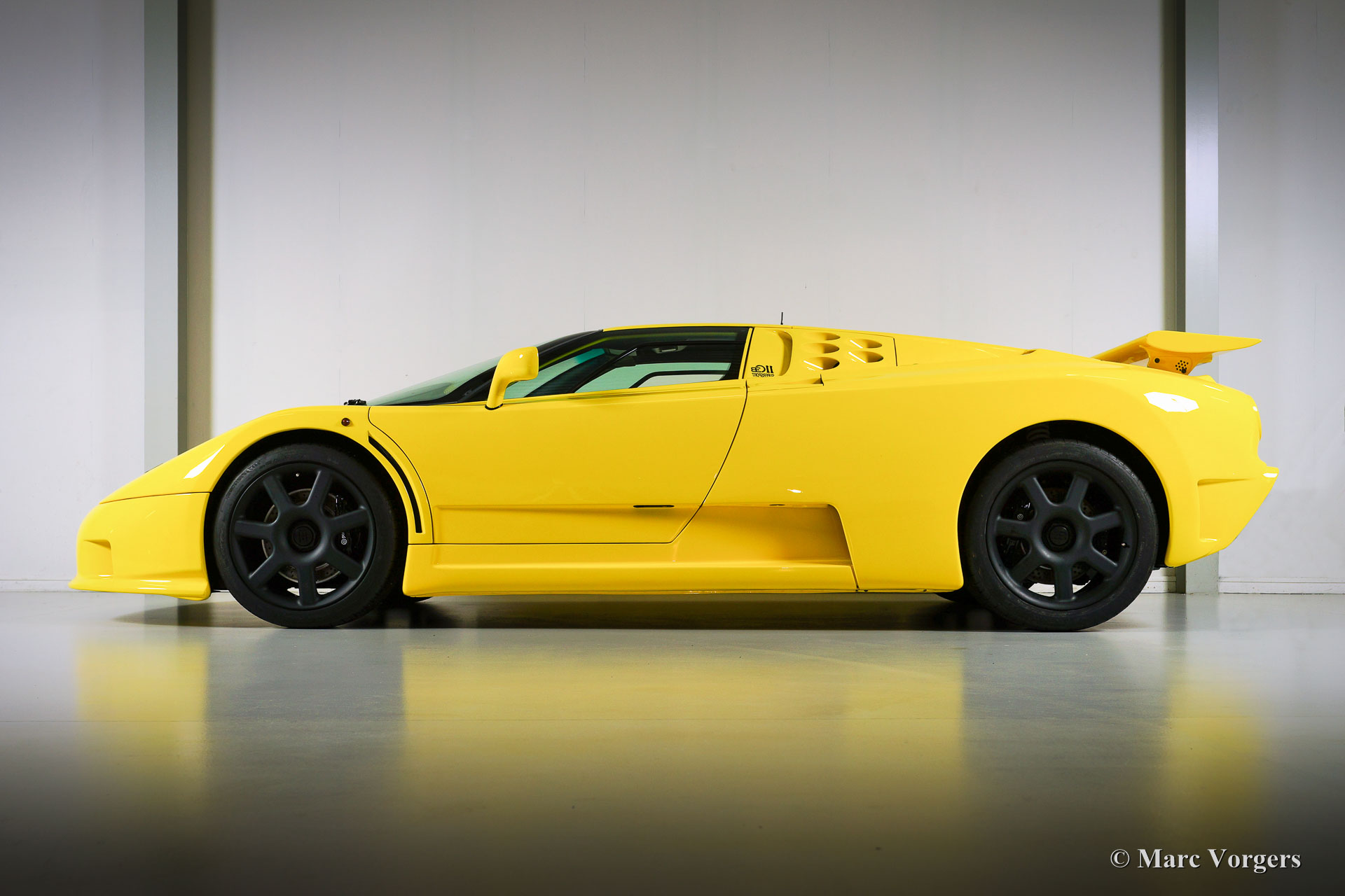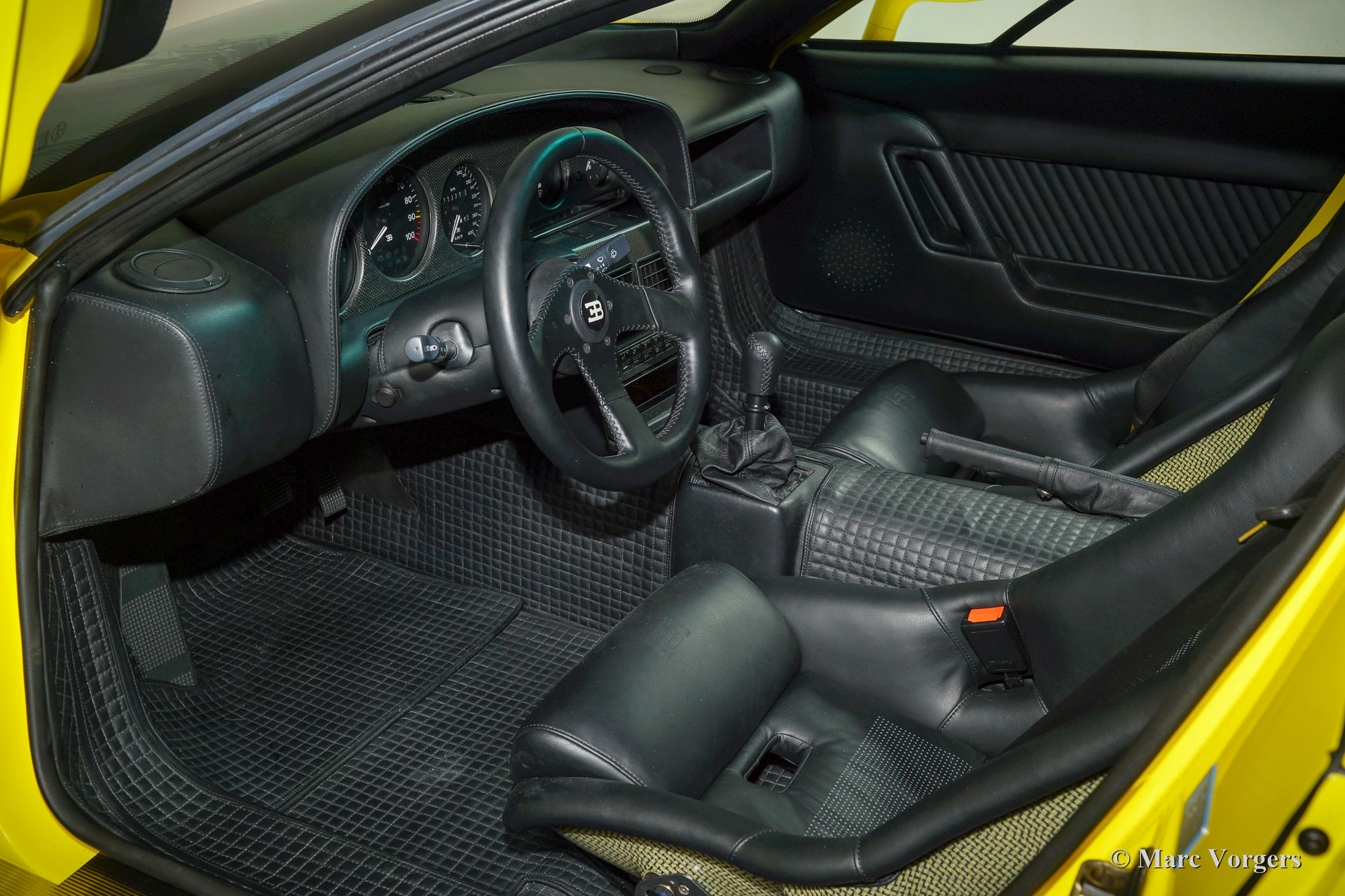 Bugatti EB110 SS (Super Sport), Jahr 1994. Farbe 'Giallo' (gelb) mit einer schwarzen Lederausstattung von Poltrona Frau. Dieses herrliche Bugatti EB110 SS ist eine der nur 33 EB110 Supersport-Modelle die je gebaut wurden. Nur vier dieser Autos wurden in gelb geliefert. Dieses Auto ist das einzige Beispiel, das die Fabrik mit schwarzen Rädern verlassen hat.