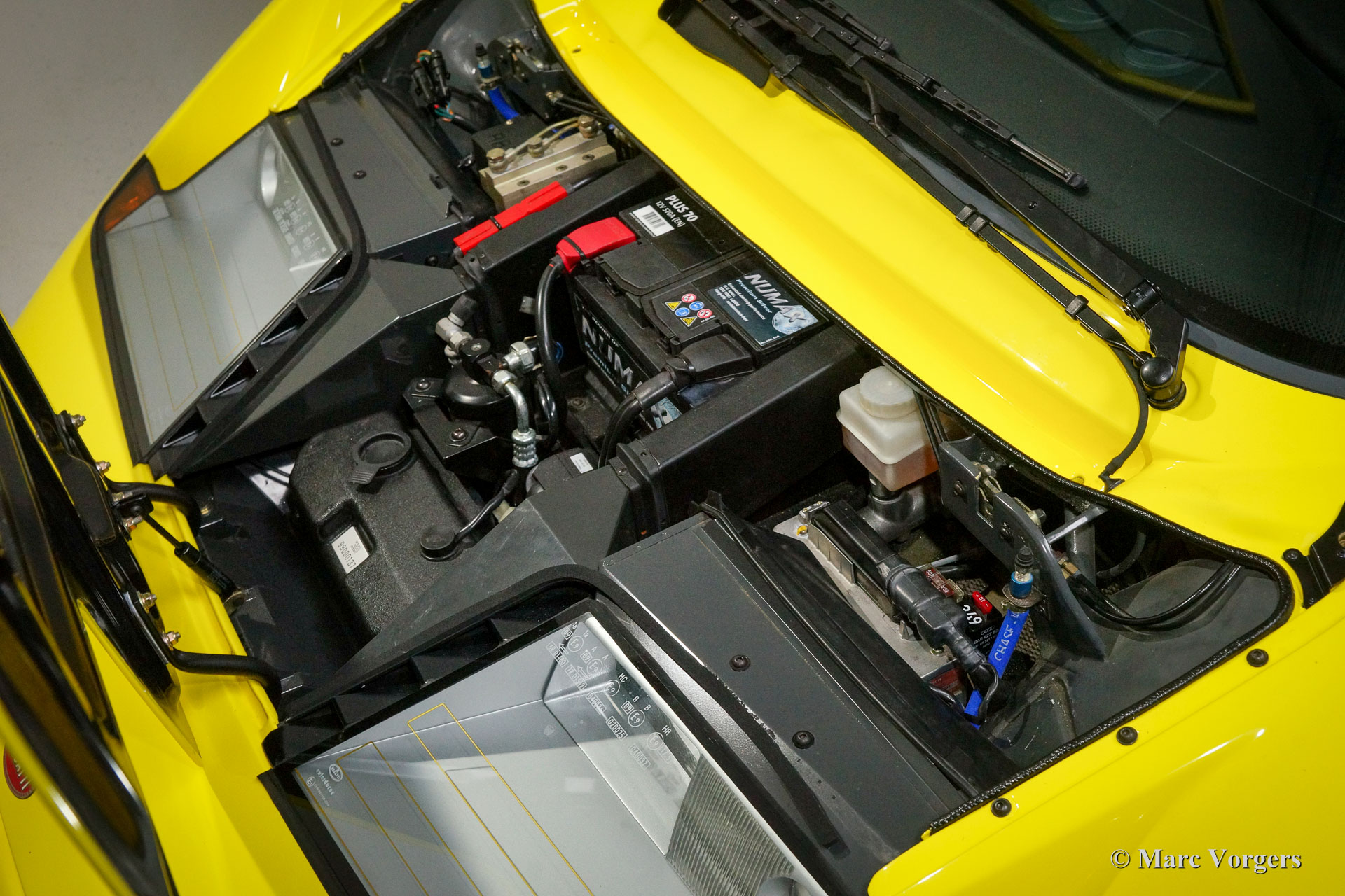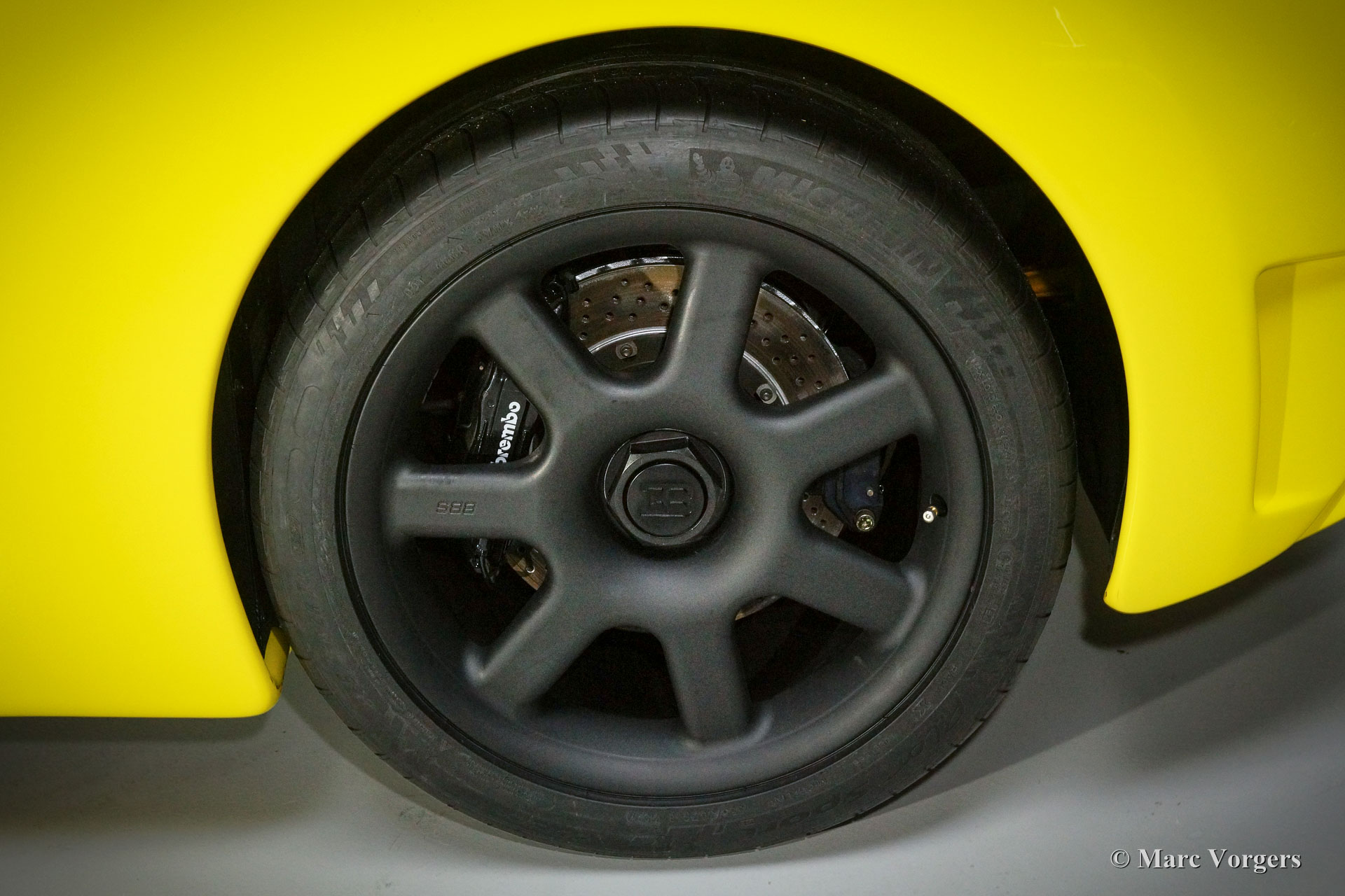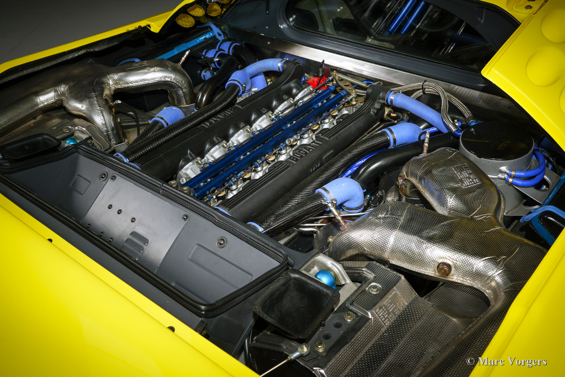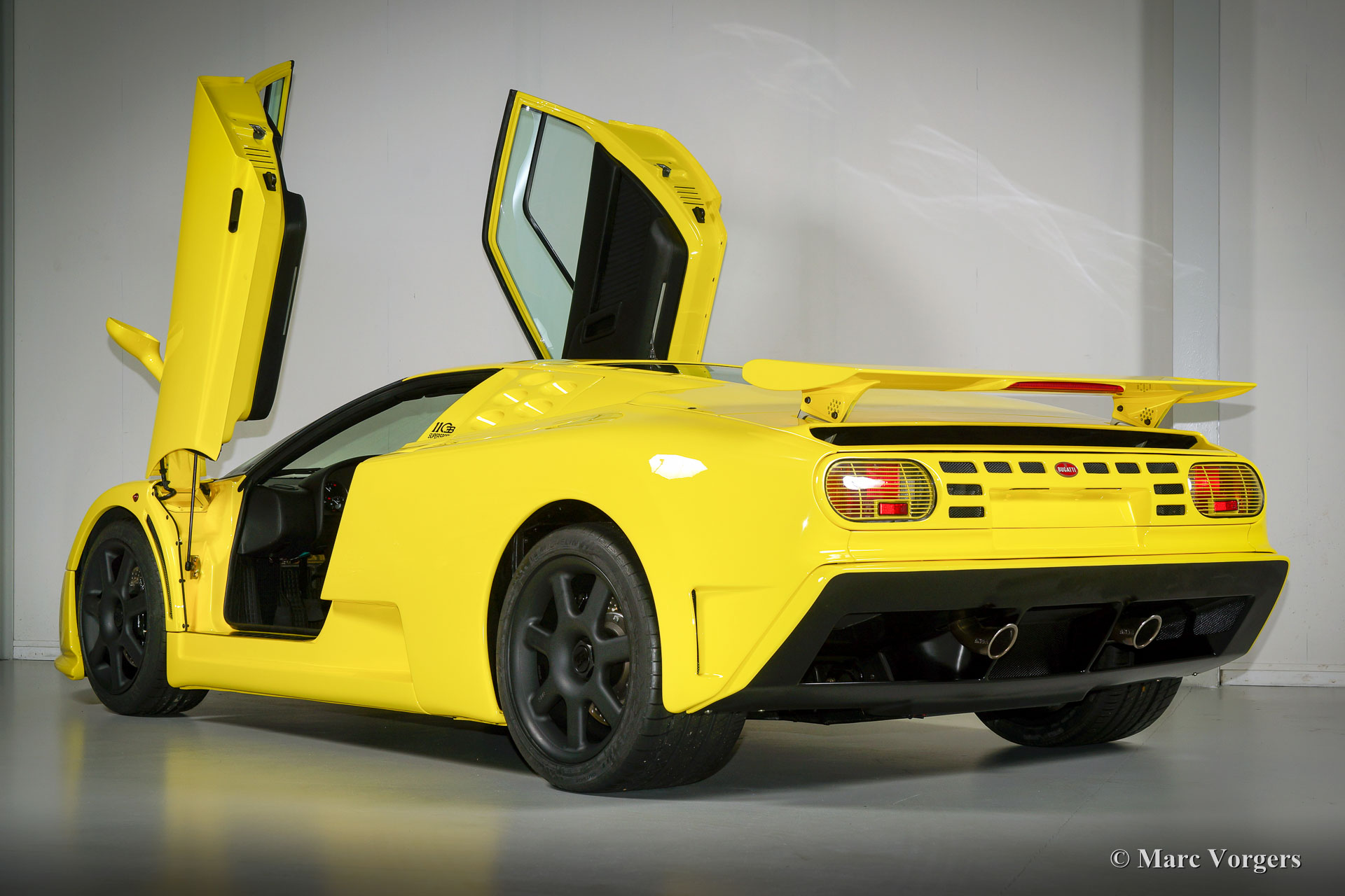 Bugatti EB110 SS (Super Sport), Jahr 1994. Farbe 'Giallo' (gelb) mit einer schwarzen Lederausstattung von Poltrona Frau. Dieses herrliche Bugatti EB110 SS ist eine der nur 33 EB110 Supersport-Modelle die je gebaut wurden. Nur vier dieser Autos wurden in gelb geliefert. Dieses Auto ist das einzige Beispiel, das die Fabrik mit schwarzen Rädern verlassen hat.