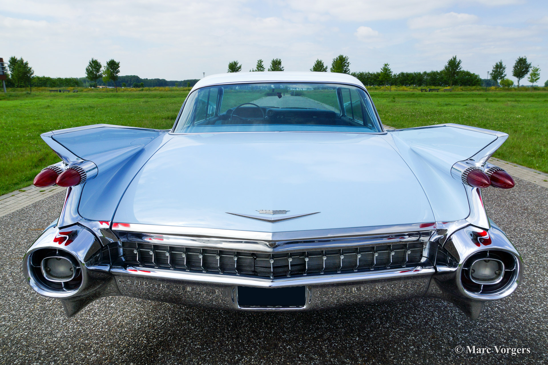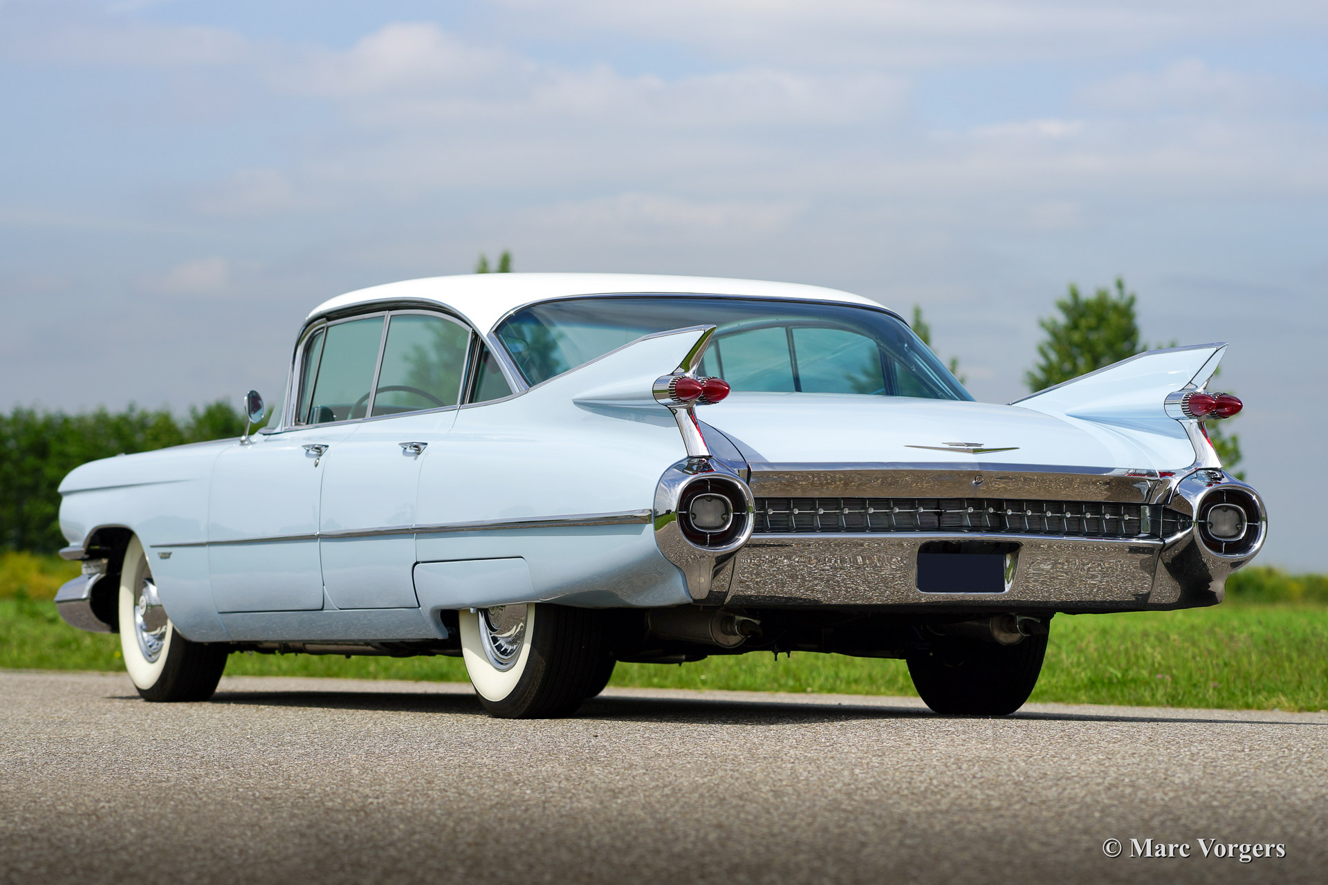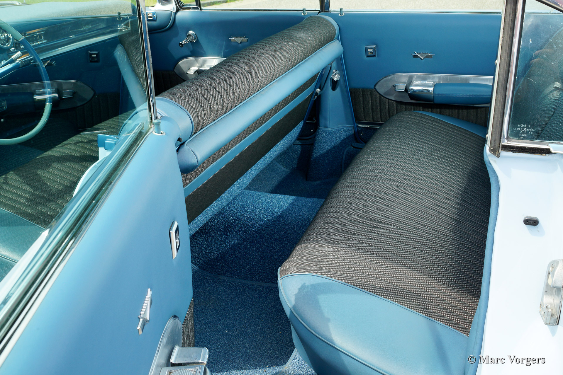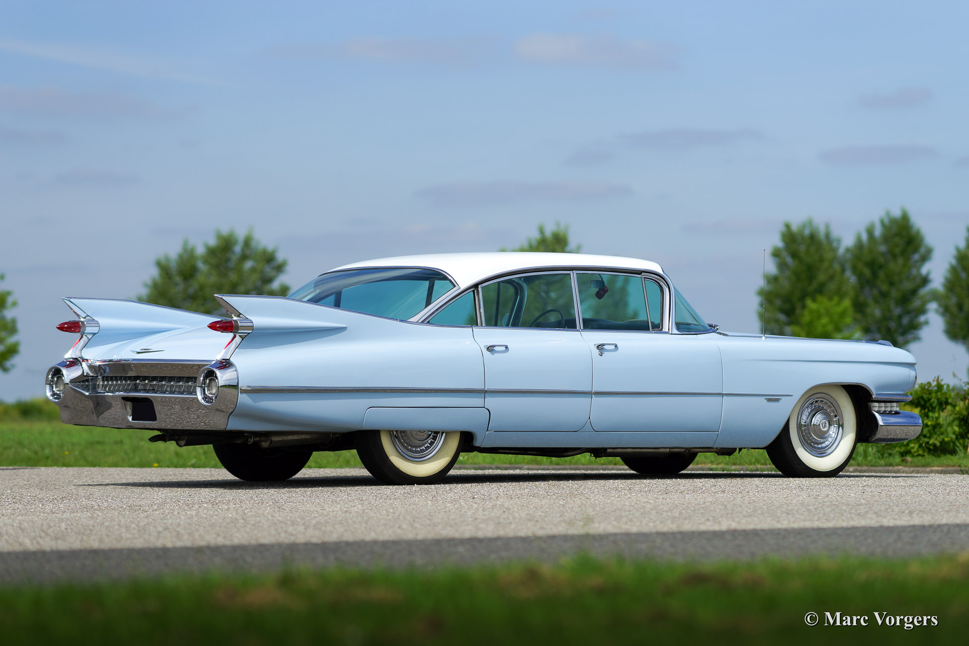 Cadillac Sedan de Ville, year 1959. Chassis number 59K086XXX. Colour light blue with a white roof top. Blue vinyl/grey fabric interior with blue carpet. This fabulous Cadillac Sedan de Ville has been superbly restored in recent years. The automobile is in concours (show) condition! The car shows all original details and it features an automatic gearbox. Ignore some dust under the bonnet, everywhere you look this impressive Cadillac is like new!