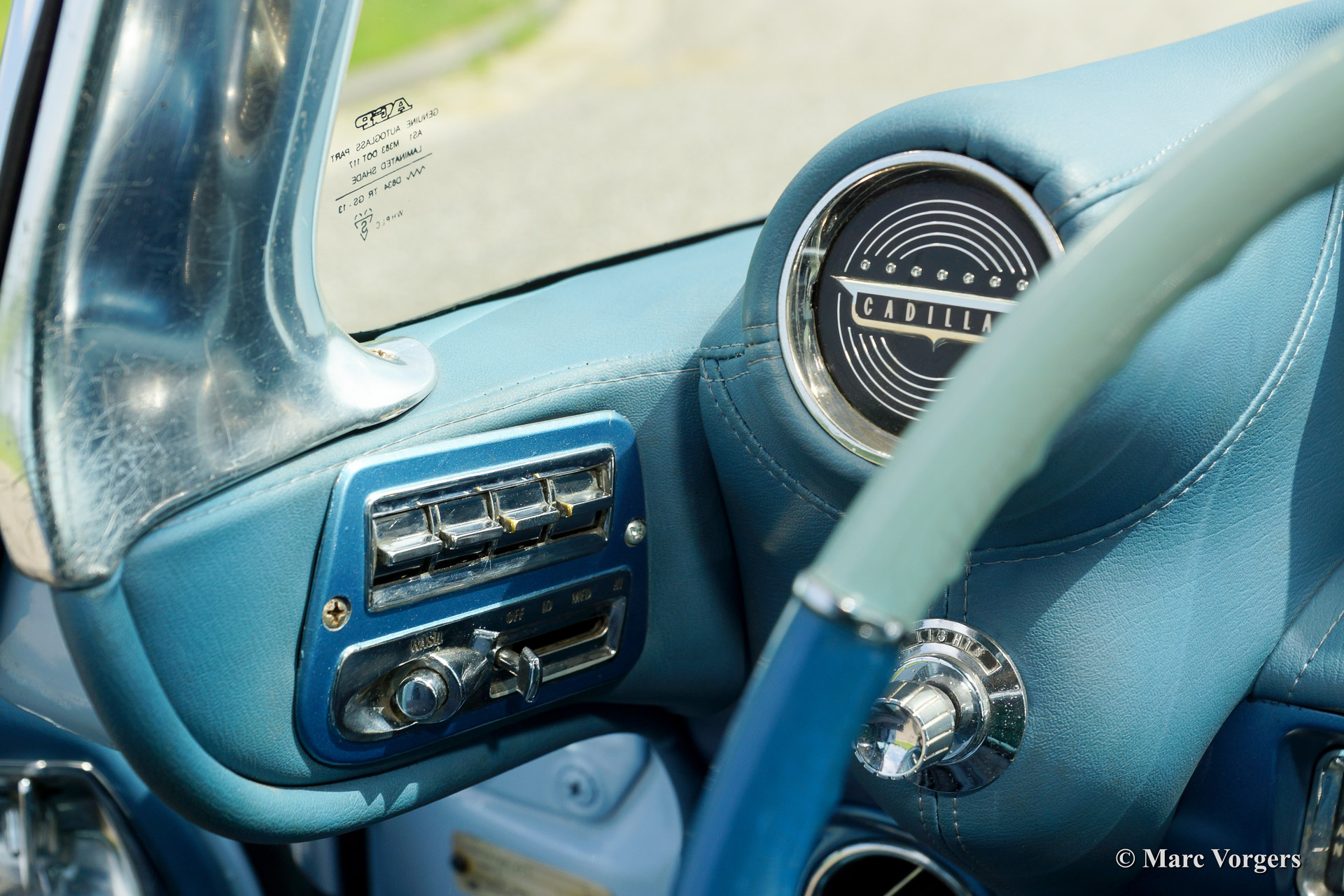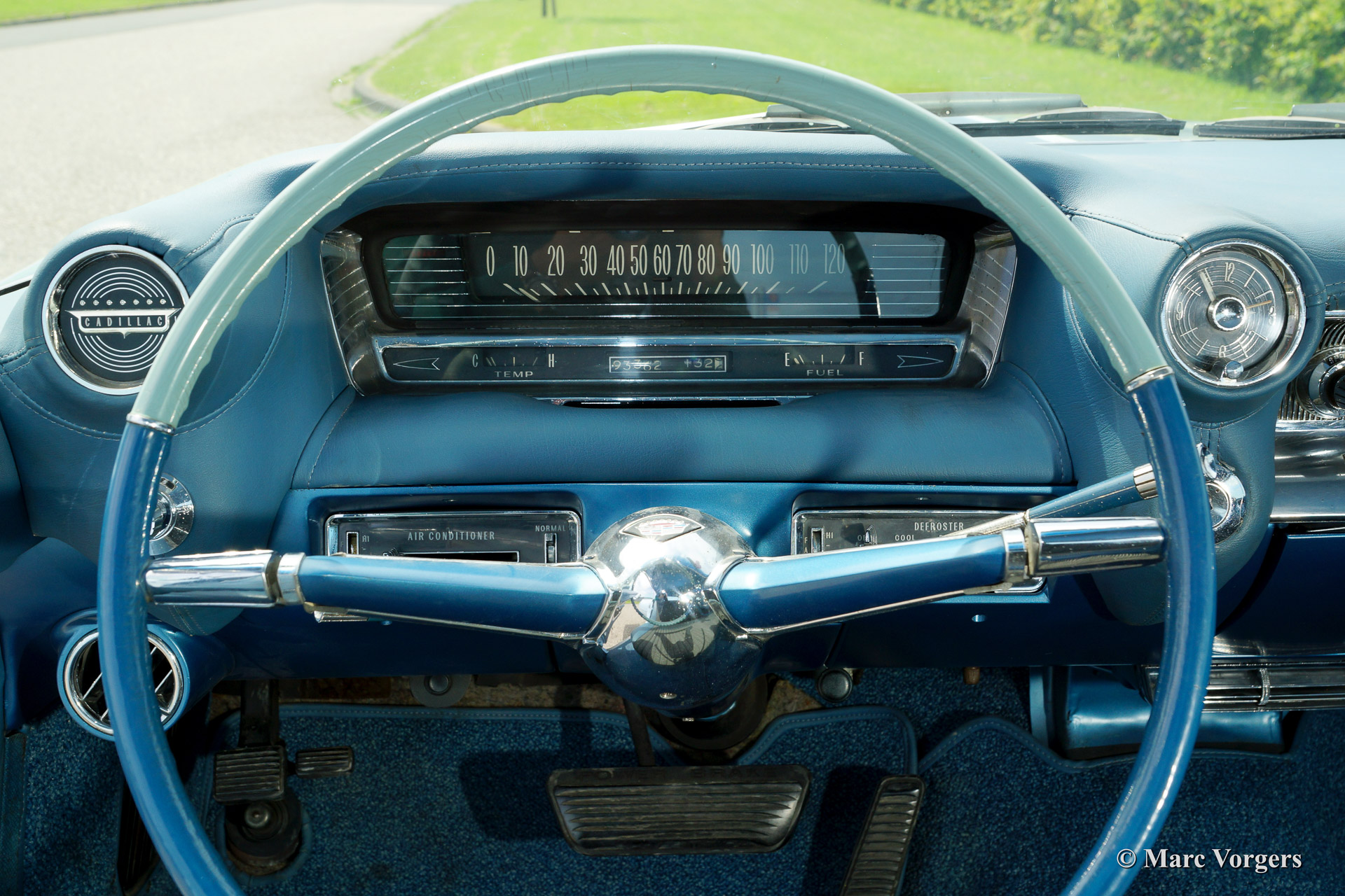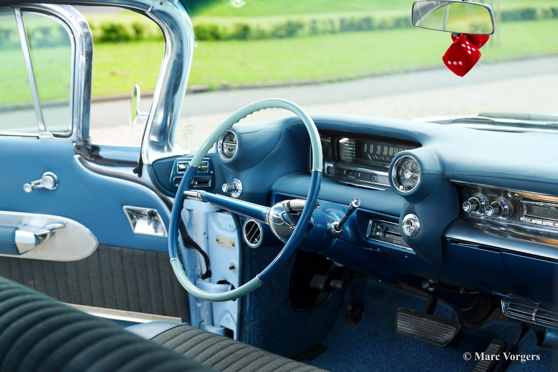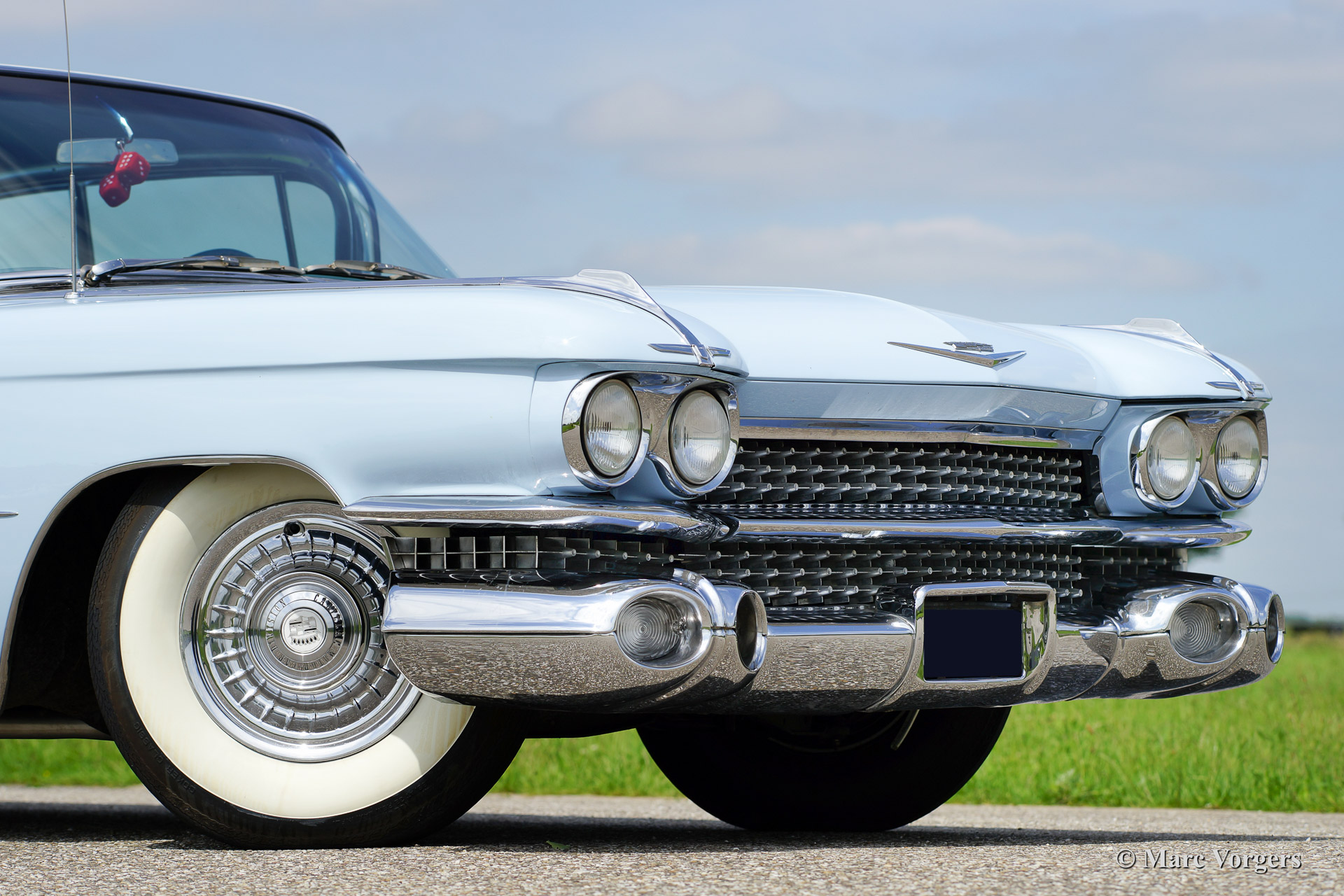 Cadillac Sedan de Ville, year 1959. Chassis number 59K086XXX. Colour light blue with a white roof top. Blue vinyl/grey fabric interior with blue carpet. This fabulous Cadillac Sedan de Ville has been superbly restored in recent years. The automobile is in concours (show) condition! The car shows all original details and it features an automatic gearbox. Ignore some dust under the bonnet, everywhere you look this impressive Cadillac is like new!