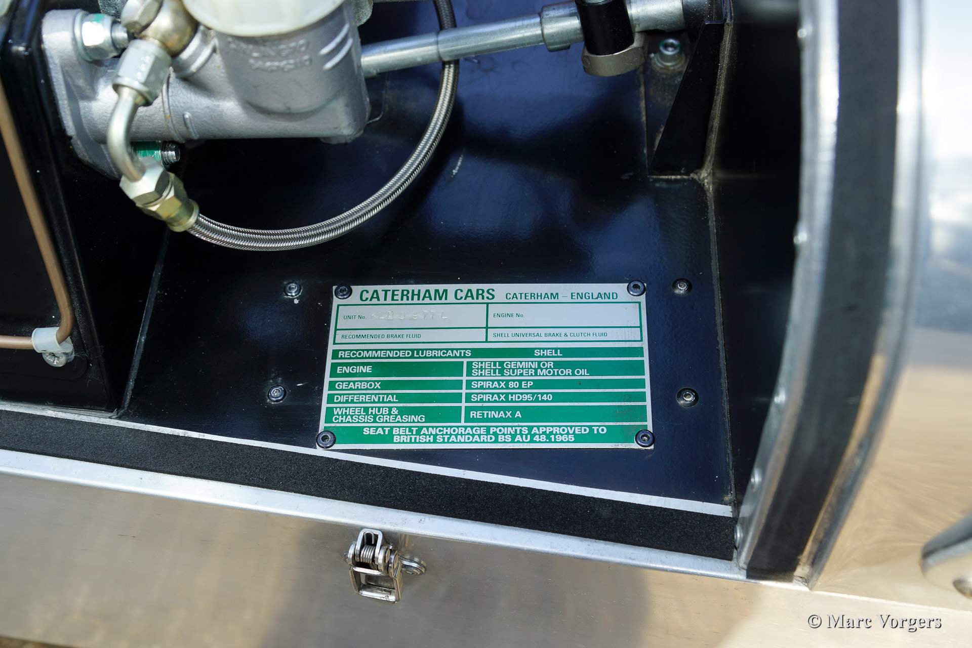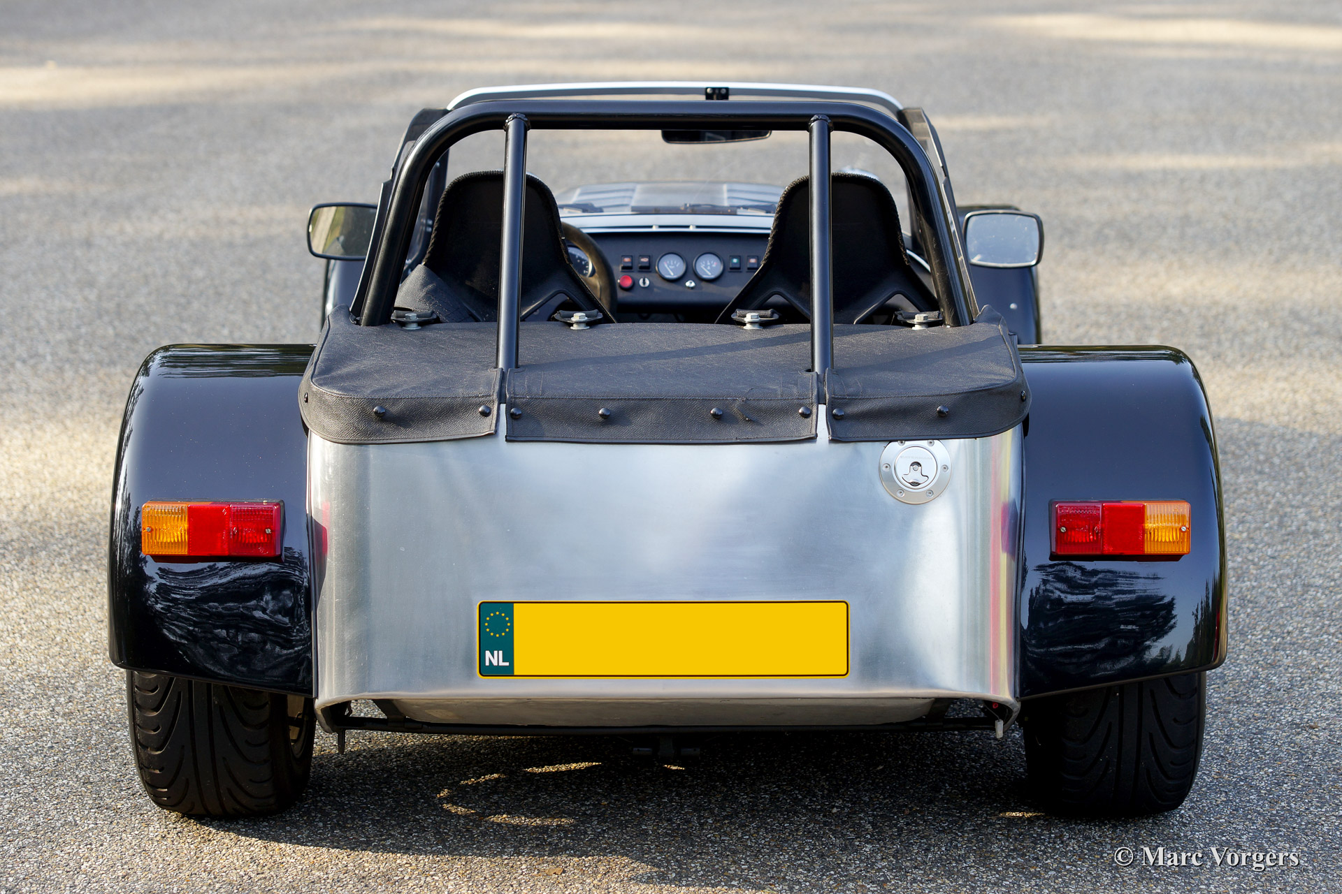 Caterham Super Seven 1600 GT, year 2007. Colour polished aluminium with black. Black interior. This Caterham features the Ford Sigma DOHC engine with 130 bhp. The automobile sports bucket seats with four point safety harnesses. The Super 7 is a very thrilling feather-light road racer and it feels very much at home at the racing track.