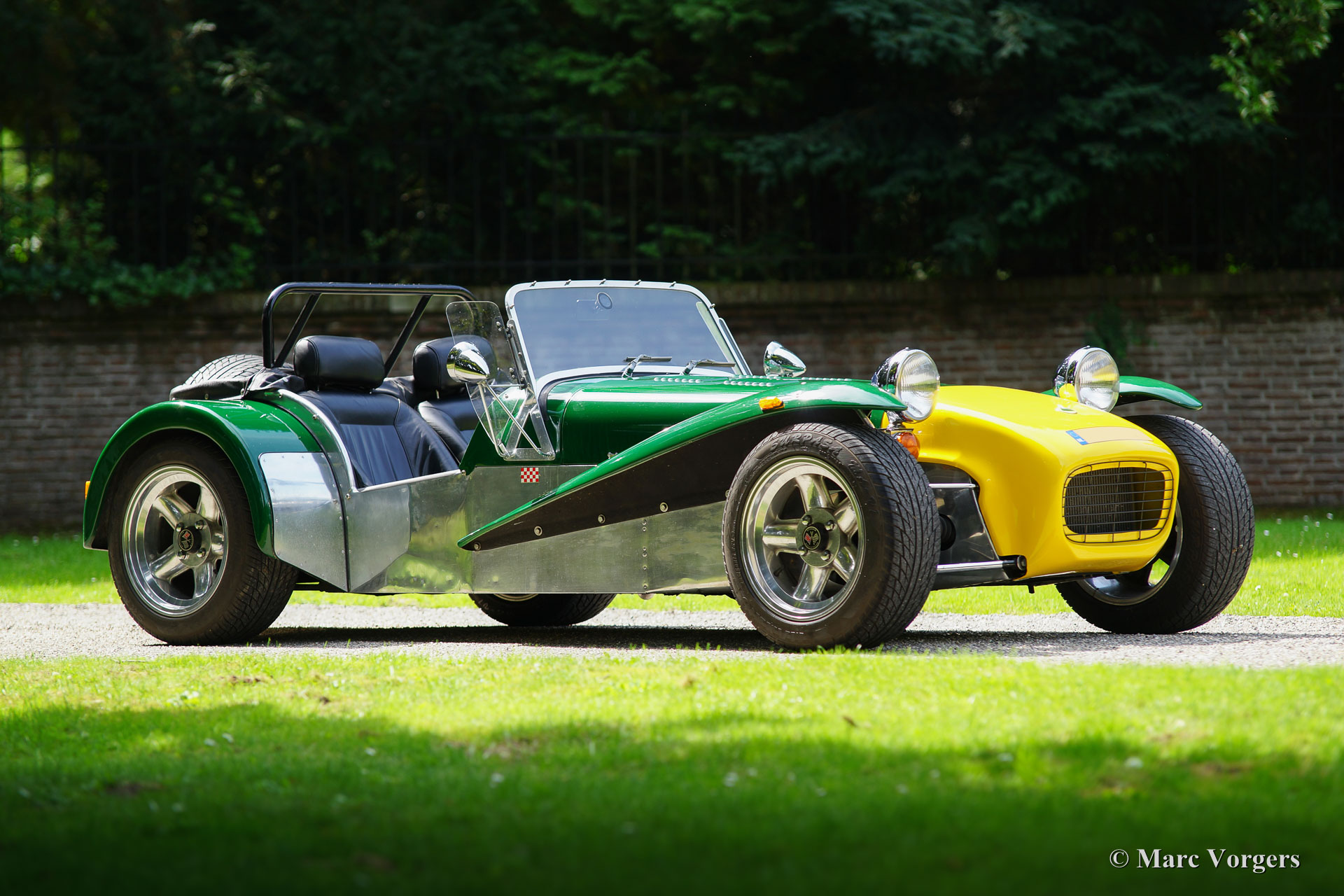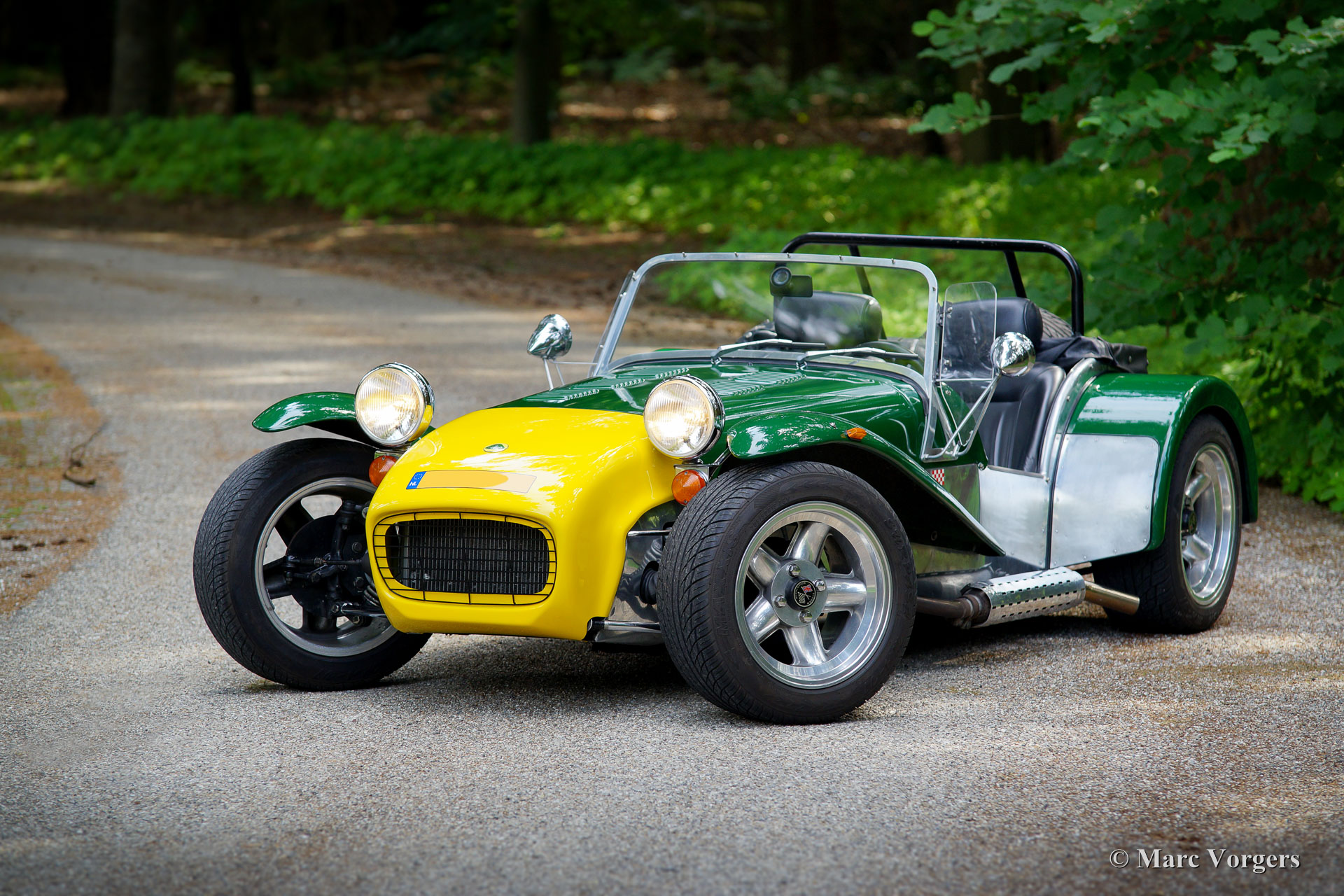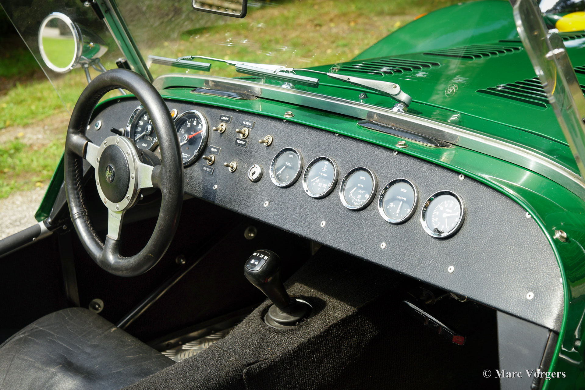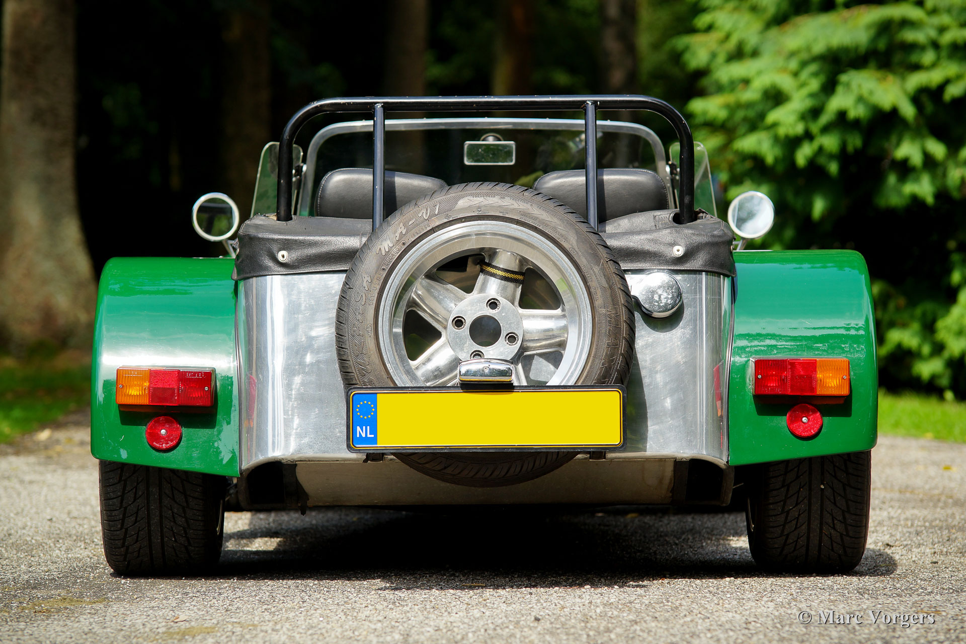 Caterham Super Seven Serie 3, Jahr 1973. Außenfarbe grün mit einer gelben ‘Nase‘ und einem schwarzen Leder Interieur. Dieser gewaltige Caterham Super Seven wurde von Willem Boterman gebaut, der in den 1970er Jahren der niederländische Caterham-Vertreter war. Boterman importierte 40 Caterham-Autos in die Niederlande. Dieses wunderschöne Caterham Super Seven ist wunderschön gepflegt und gewartet; Das Auto ist in einem hervorragenden Zustand! Vor zehn Jahren wurde das Auto weitgehend restauriert. Der Hubraum des Motors wurde bis zu 1700 ccm erweitert. Mit einem speziell modifizierten Zylinderkopf, einer ‘Schnelle‘ Nockenwelle und zwei doppelten 40mm Weber Vergaser liefert der Motor 118 PS. Die 118 ‘Pferde‘ müssen nur 540 Kilogramm antreiben; Sehr interessante Sportwagenfiguren! Das Auto wurde im Jahr 1981 zugelassen. Die Chassis Nummer ist WB2930, ‘WB‘ sind die Initialen von Willem Boterman. Diese feine Caterham verfügt über schöne Aluminium Fünf-Speichen 'Revolution' Räder. Dieser Caterham ist eine fantastische ‘Taschen-Rakete‘ in super Zustand!