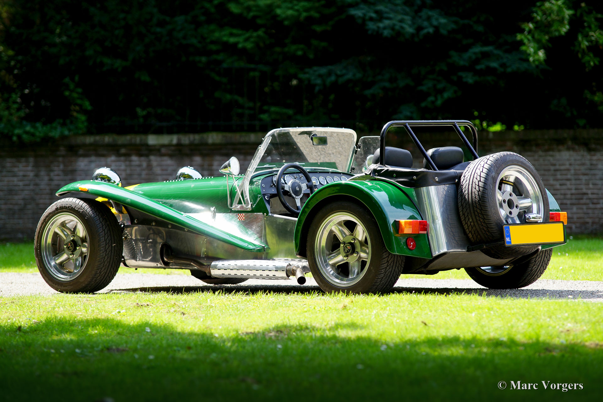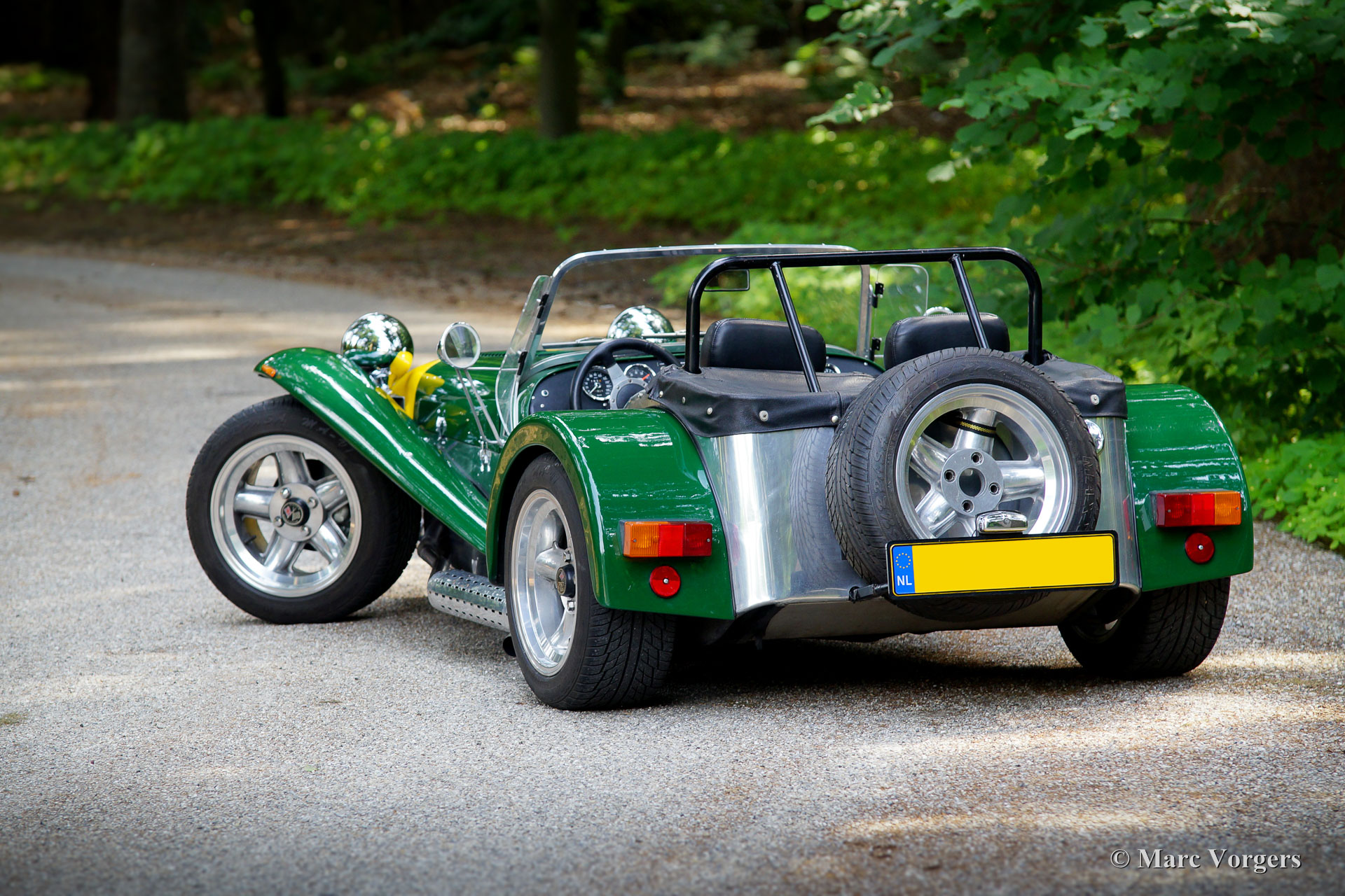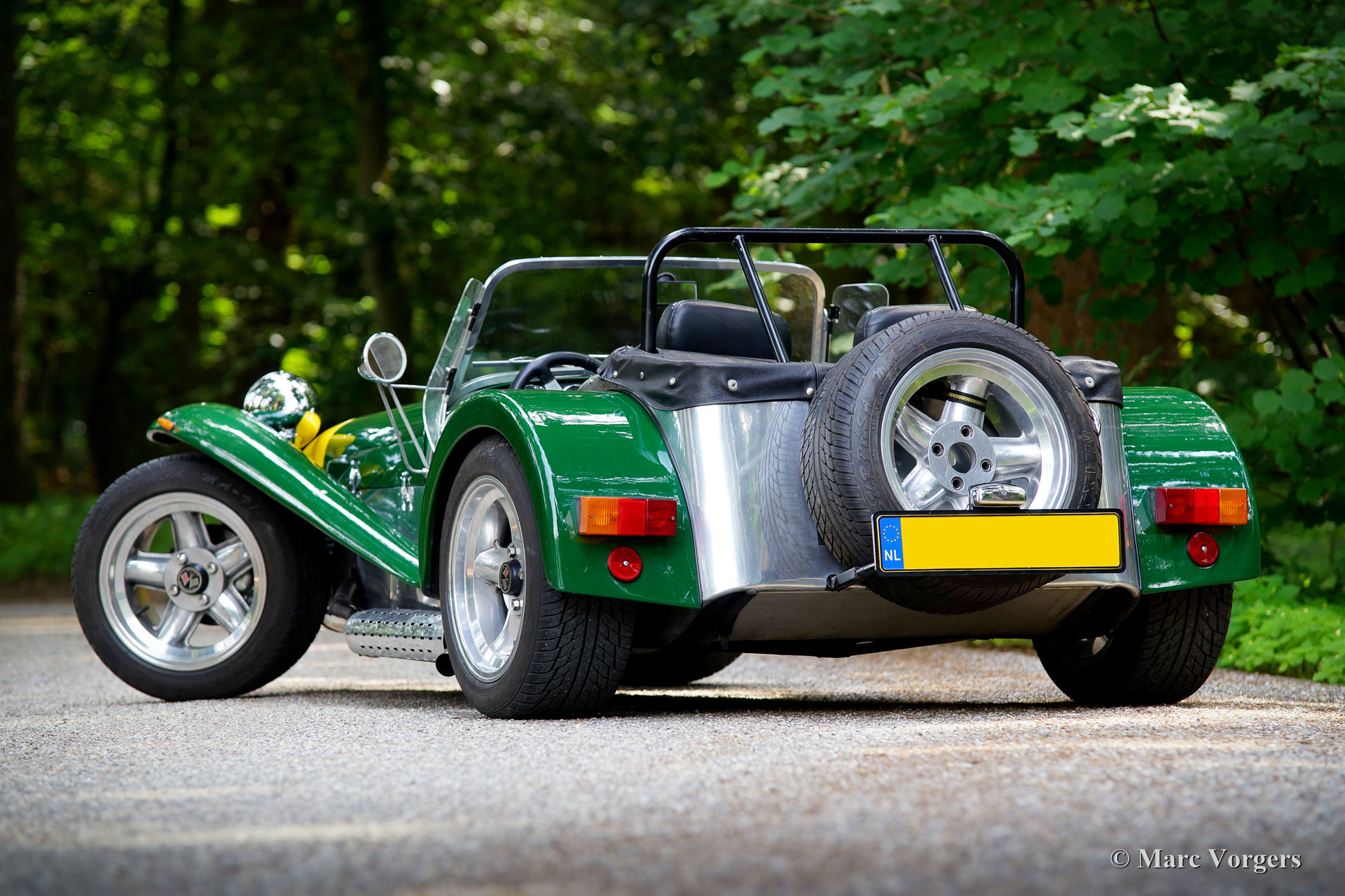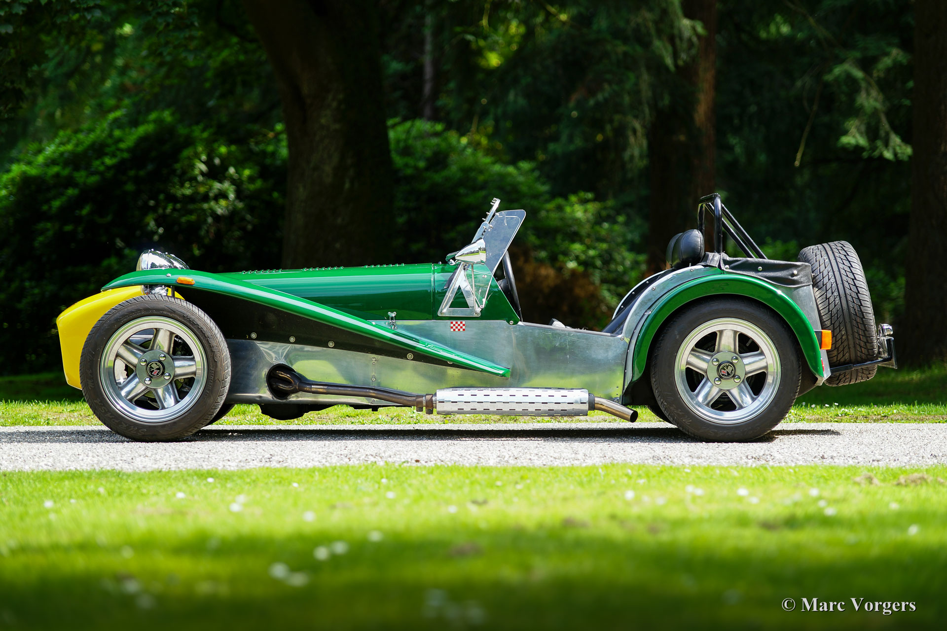 Caterham Super Seven Serie 3, Jahr 1973. Außenfarbe grün mit einer gelben ‘Nase‘ und einem schwarzen Leder Interieur. Dieser gewaltige Caterham Super Seven wurde von Willem Boterman gebaut, der in den 1970er Jahren der niederländische Caterham-Vertreter war. Boterman importierte 40 Caterham-Autos in die Niederlande. Dieses wunderschöne Caterham Super Seven ist wunderschön gepflegt und gewartet; Das Auto ist in einem hervorragenden Zustand! Vor zehn Jahren wurde das Auto weitgehend restauriert. Der Hubraum des Motors wurde bis zu 1700 ccm erweitert. Mit einem speziell modifizierten Zylinderkopf, einer ‘Schnelle‘ Nockenwelle und zwei doppelten 40mm Weber Vergaser liefert der Motor 118 PS. Die 118 ‘Pferde‘ müssen nur 540 Kilogramm antreiben; Sehr interessante Sportwagenfiguren! Das Auto wurde im Jahr 1981 zugelassen. Die Chassis Nummer ist WB2930, ‘WB‘ sind die Initialen von Willem Boterman. Diese feine Caterham verfügt über schöne Aluminium Fünf-Speichen 'Revolution' Räder. Dieser Caterham ist eine fantastische ‘Taschen-Rakete‘ in super Zustand!