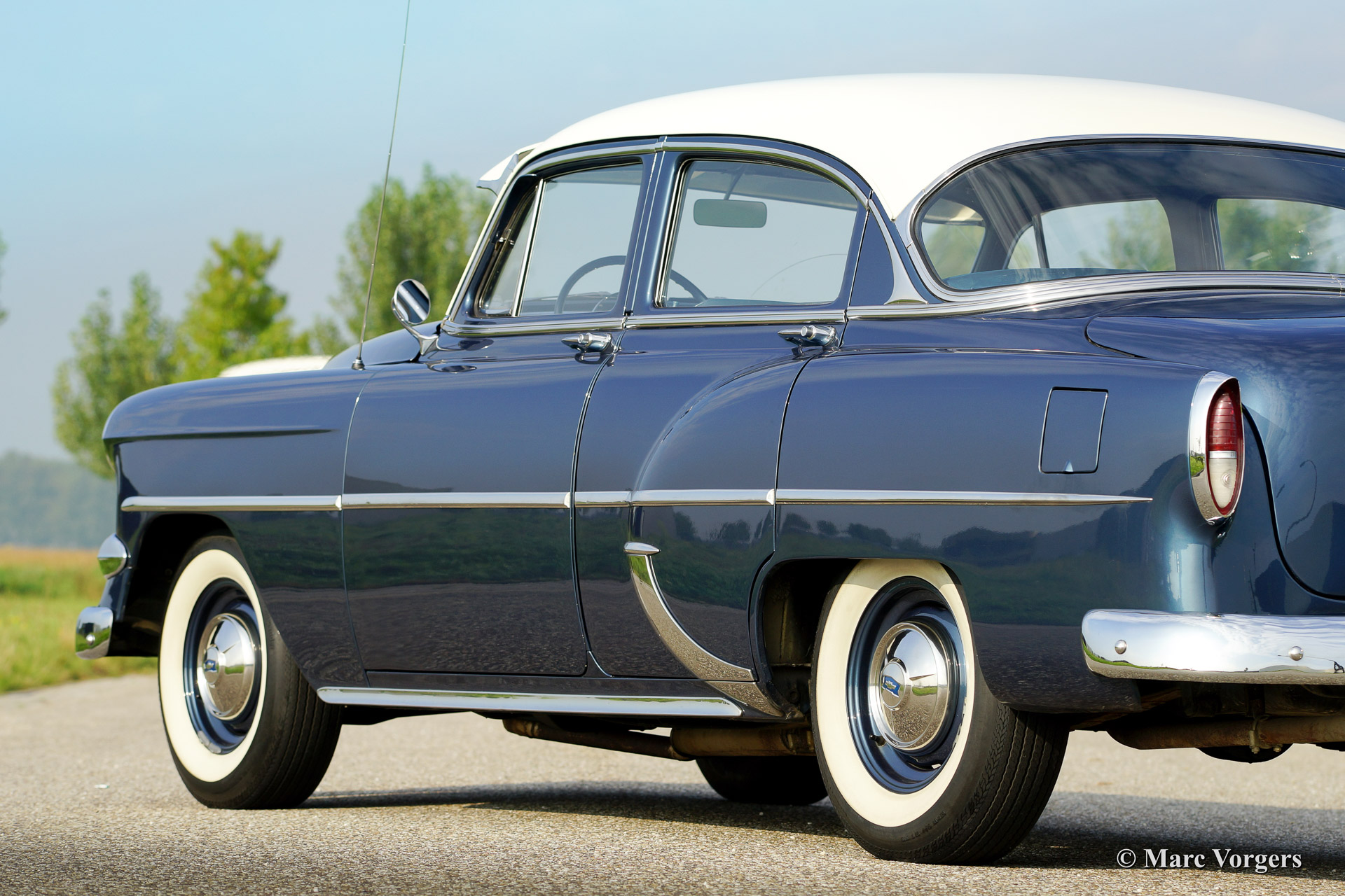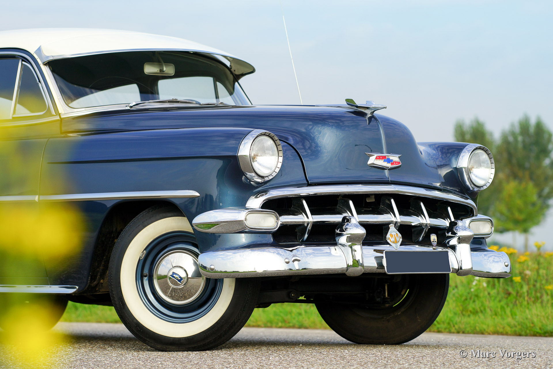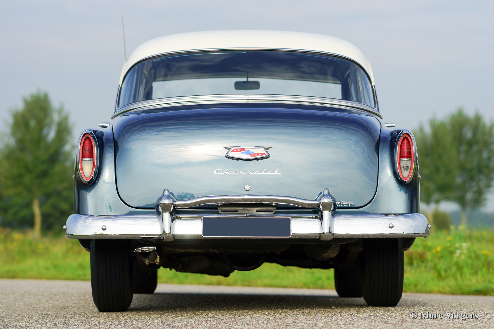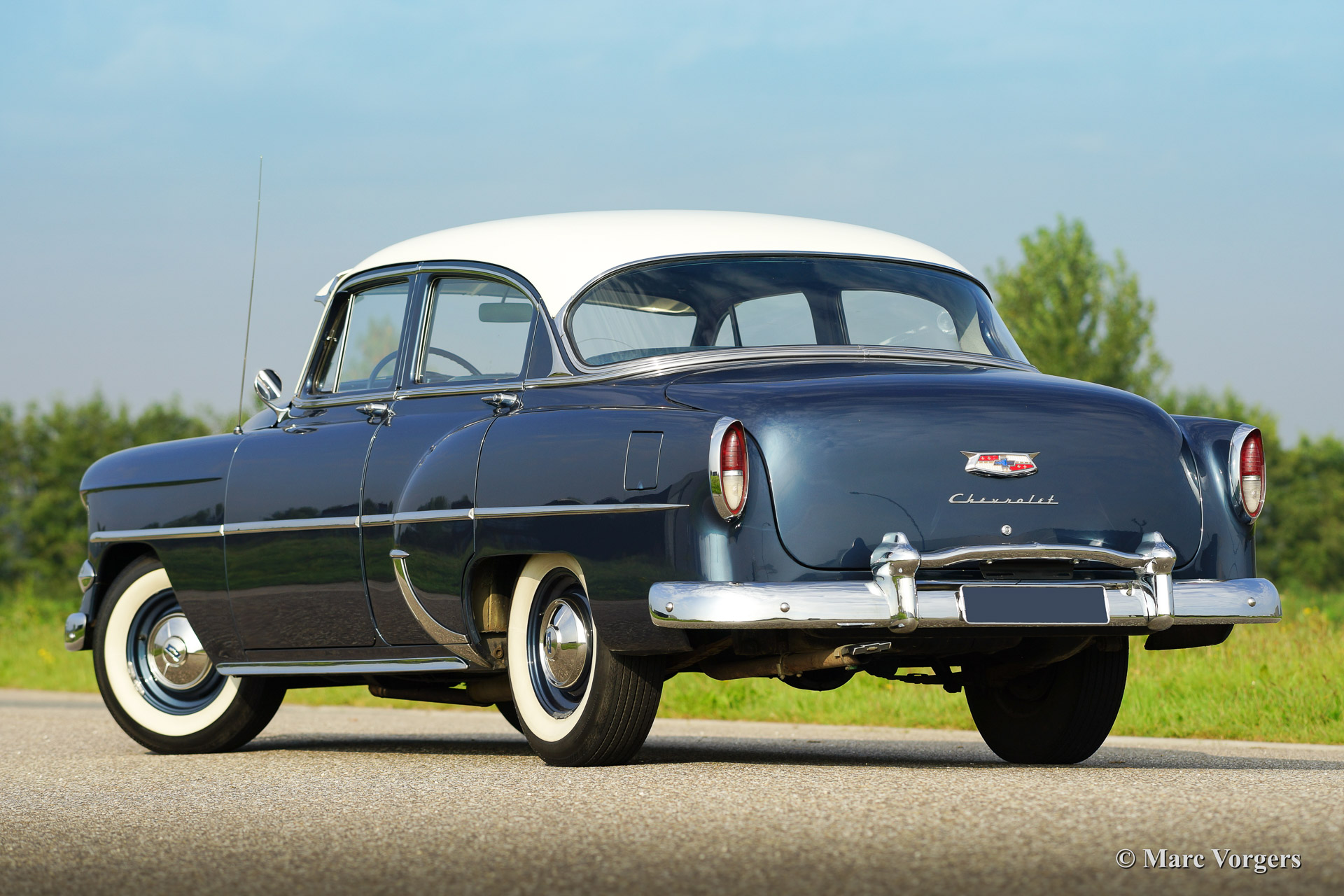 Chevrolet 210 sedan, year 1954. Chassis number 0795467FXXX. Colour blue metallic with a white roof top. blue cloth interior. This beautiful Chevrolet was extensively restored in the Netherlands. The automobile is in superb (excellent+) condition! This Chevrolet drives very comfortably, the car sports a smooth six cylinder engine and a manual 3-speed gearbox with steering column shift. This Chevrolet is fitted with a special sun shade above the windscreen, a period radio and tires with white side walls. A photo reportage of the restoration is present.