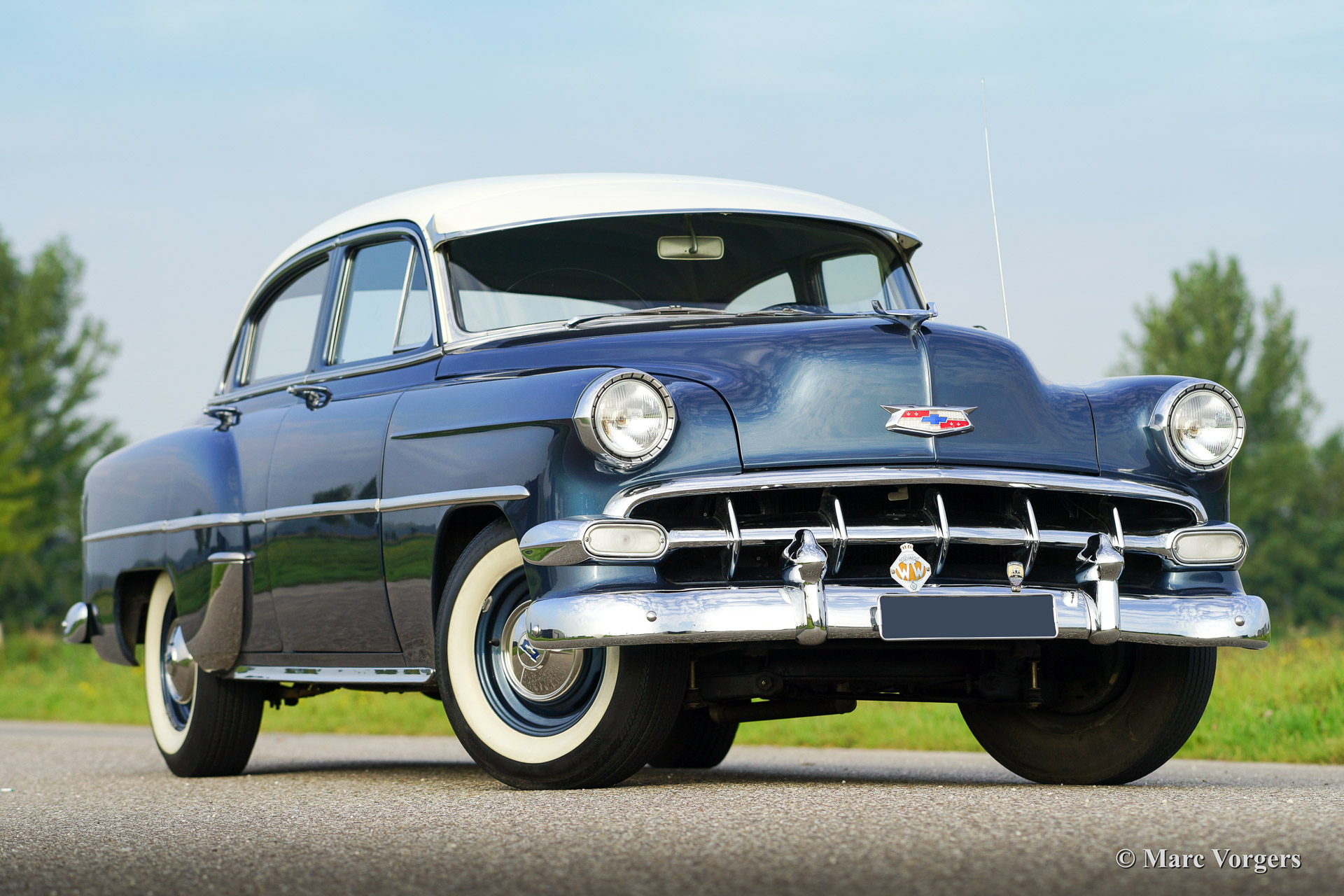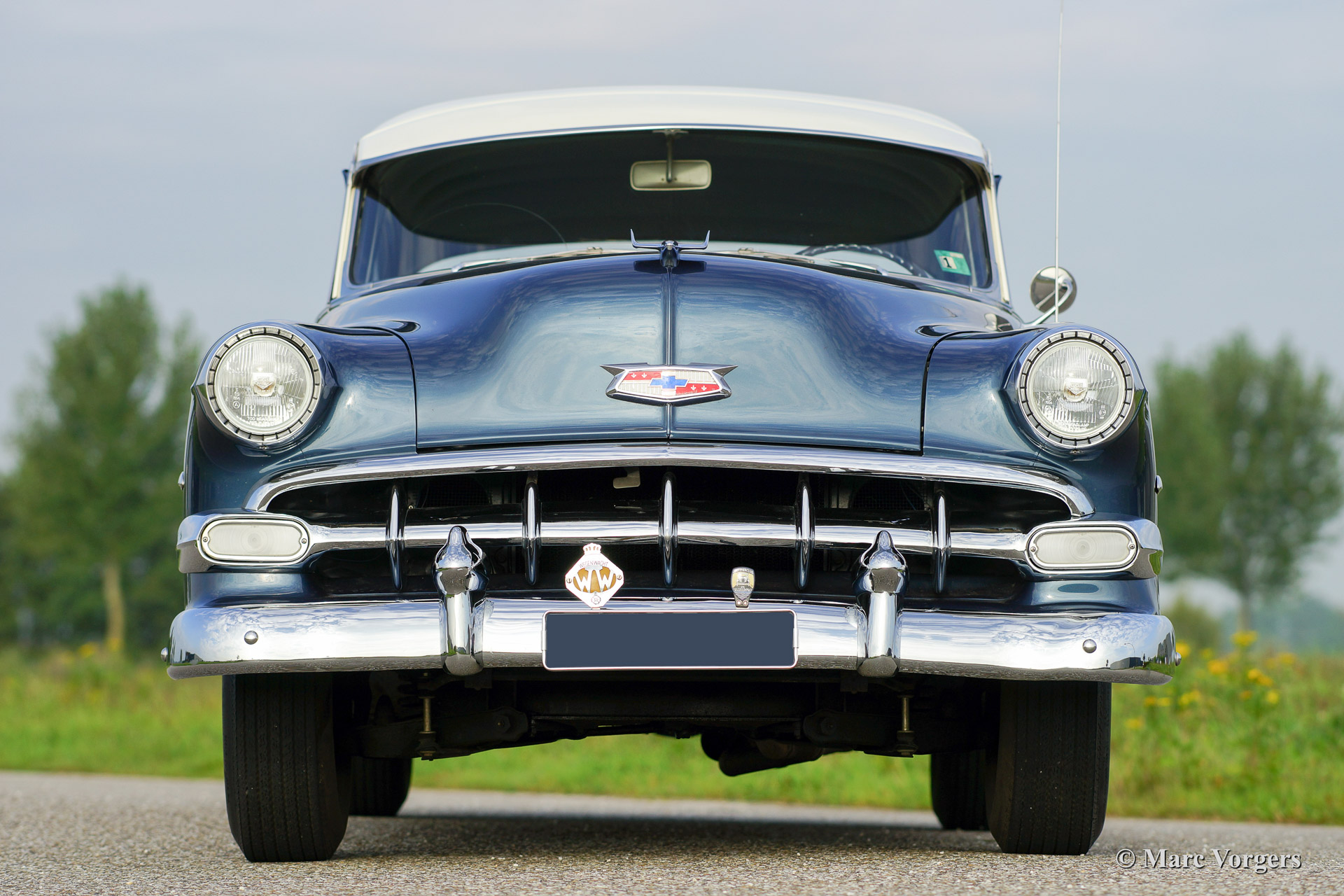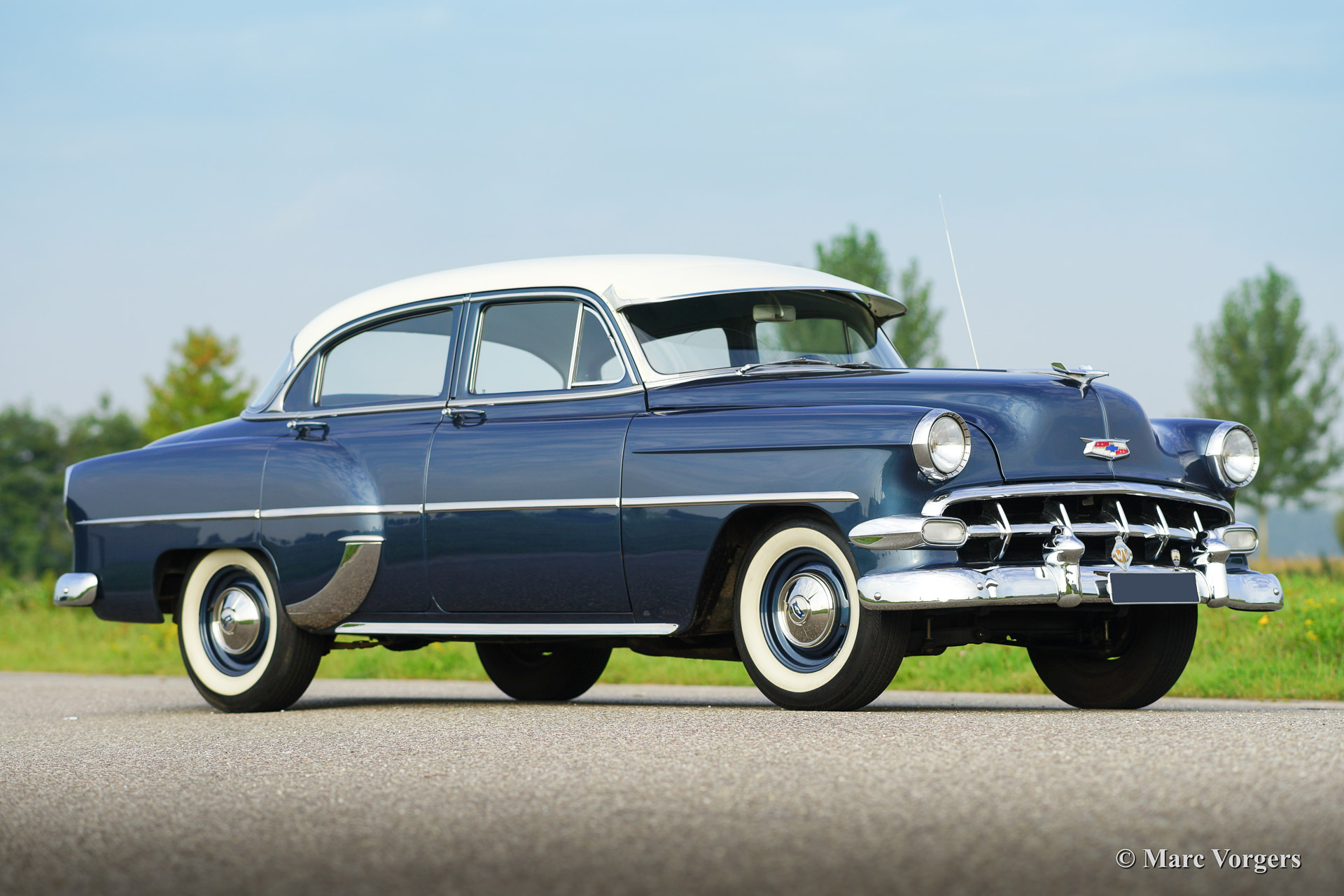Chevrolet 210 sedan, year 1954. Chassis number 0795467FXXX. Colour blue metallic with a white roof top. blue cloth interior. This beautiful Chevrolet was extensively restored in the Netherlands. The automobile is in superb (excellent+) condition! This Chevrolet drives very comfortably, the car sports a smooth six cylinder engine and a manual 3-speed gearbox with steering column shift. This Chevrolet is fitted with a special sun shade above the windscreen, a period radio and tires with white side walls. A photo reportage of the restoration is present.