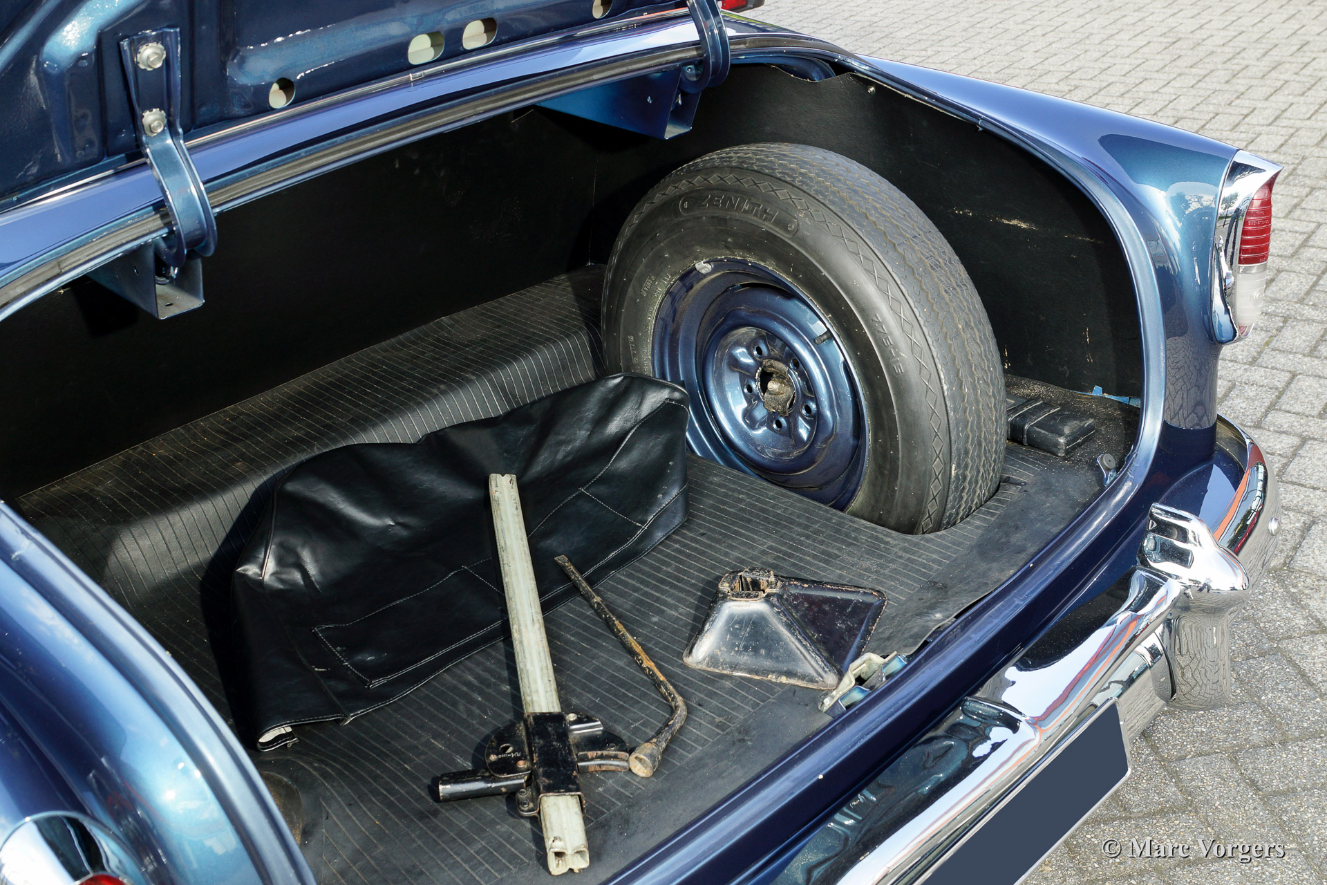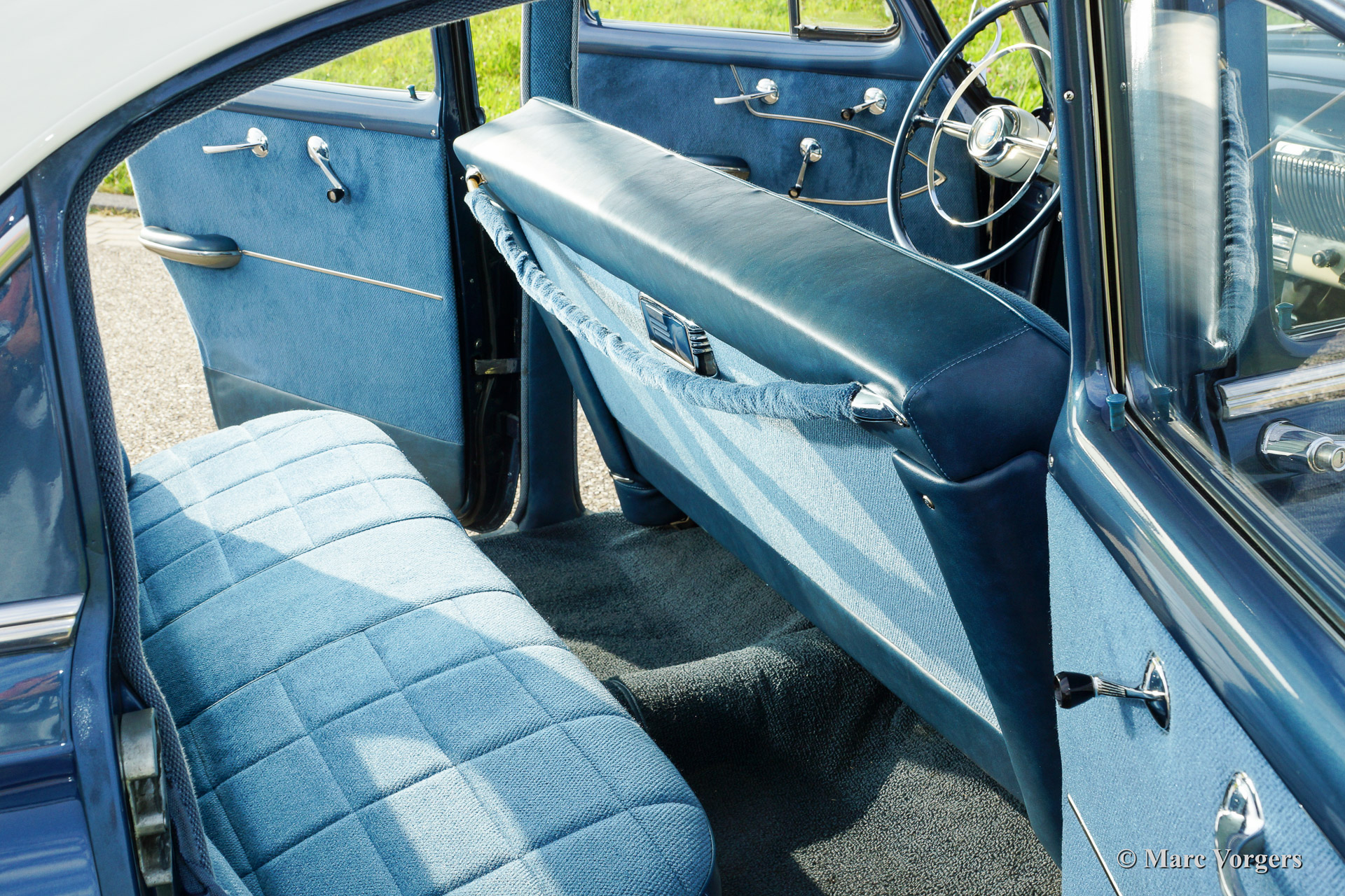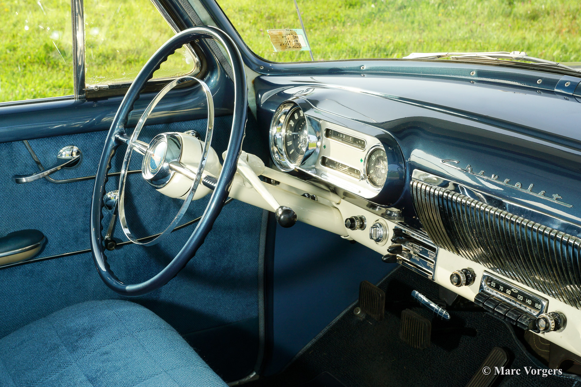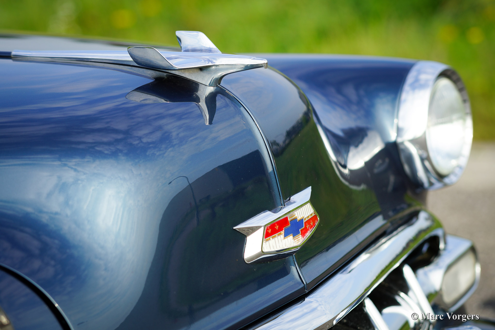 Chevrolet 210 sedan, year 1954. Chassis number 0795467FXXX. Colour blue metallic with a white roof top. blue cloth interior. This beautiful Chevrolet was extensively restored in the Netherlands. The automobile is in superb (excellent+) condition! This Chevrolet drives very comfortably, the car sports a smooth six cylinder engine and a manual 3-speed gearbox with steering column shift. This Chevrolet is fitted with a special sun shade above the windscreen, a period radio and tires with white side walls. A photo reportage of the restoration is present.