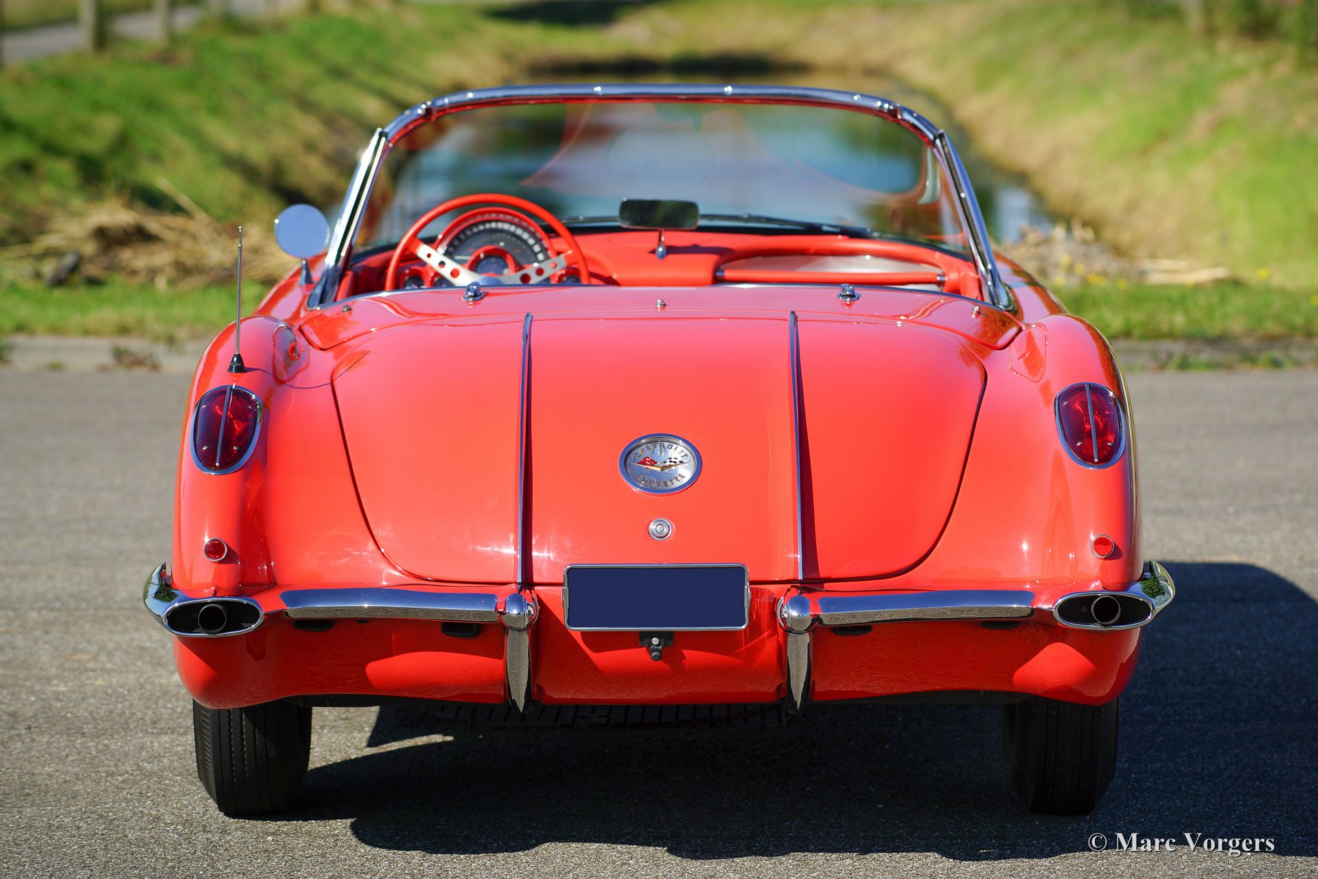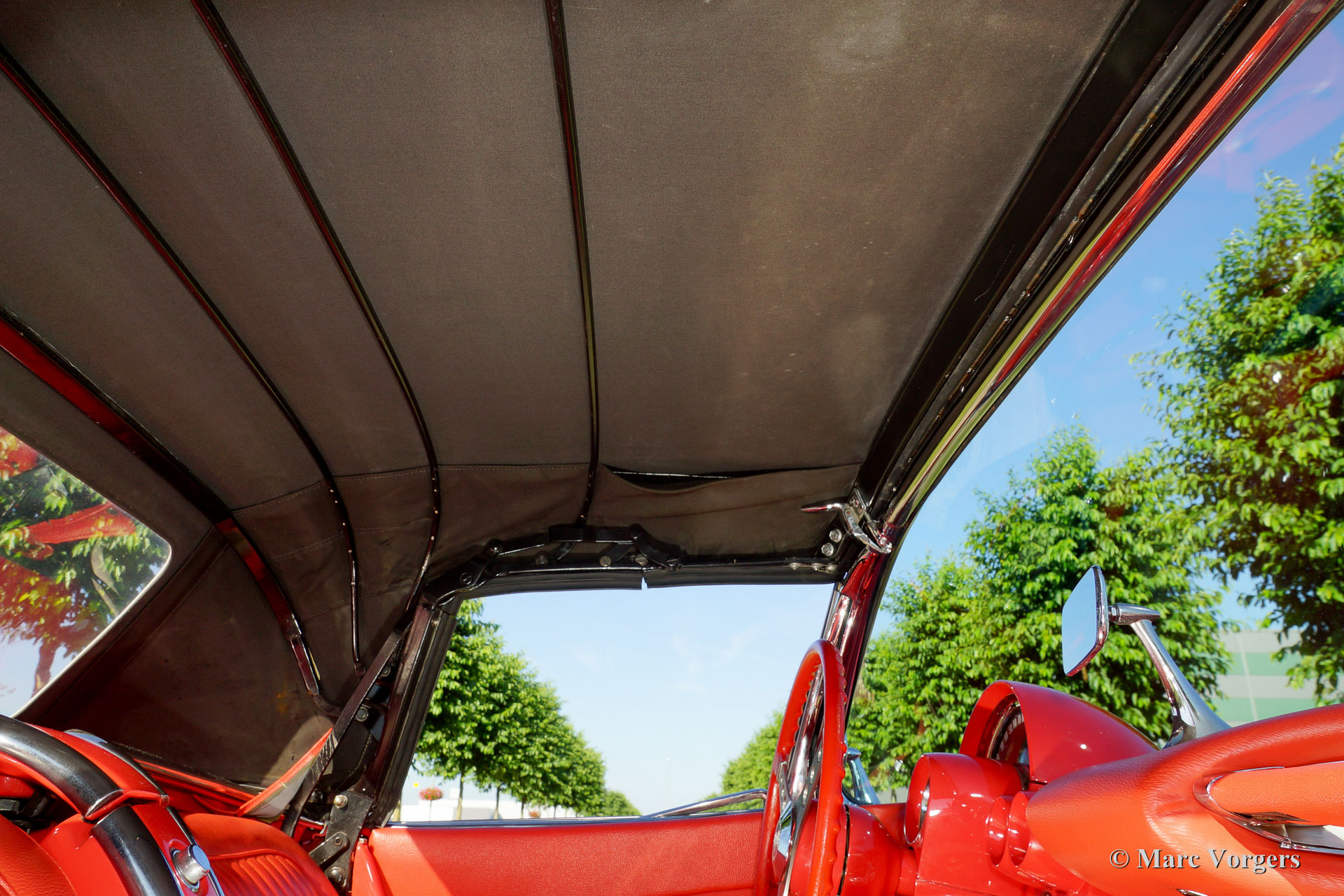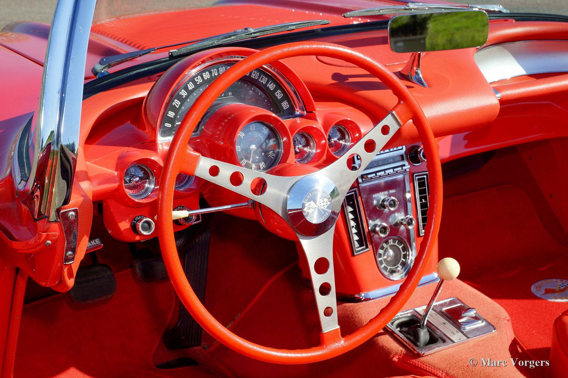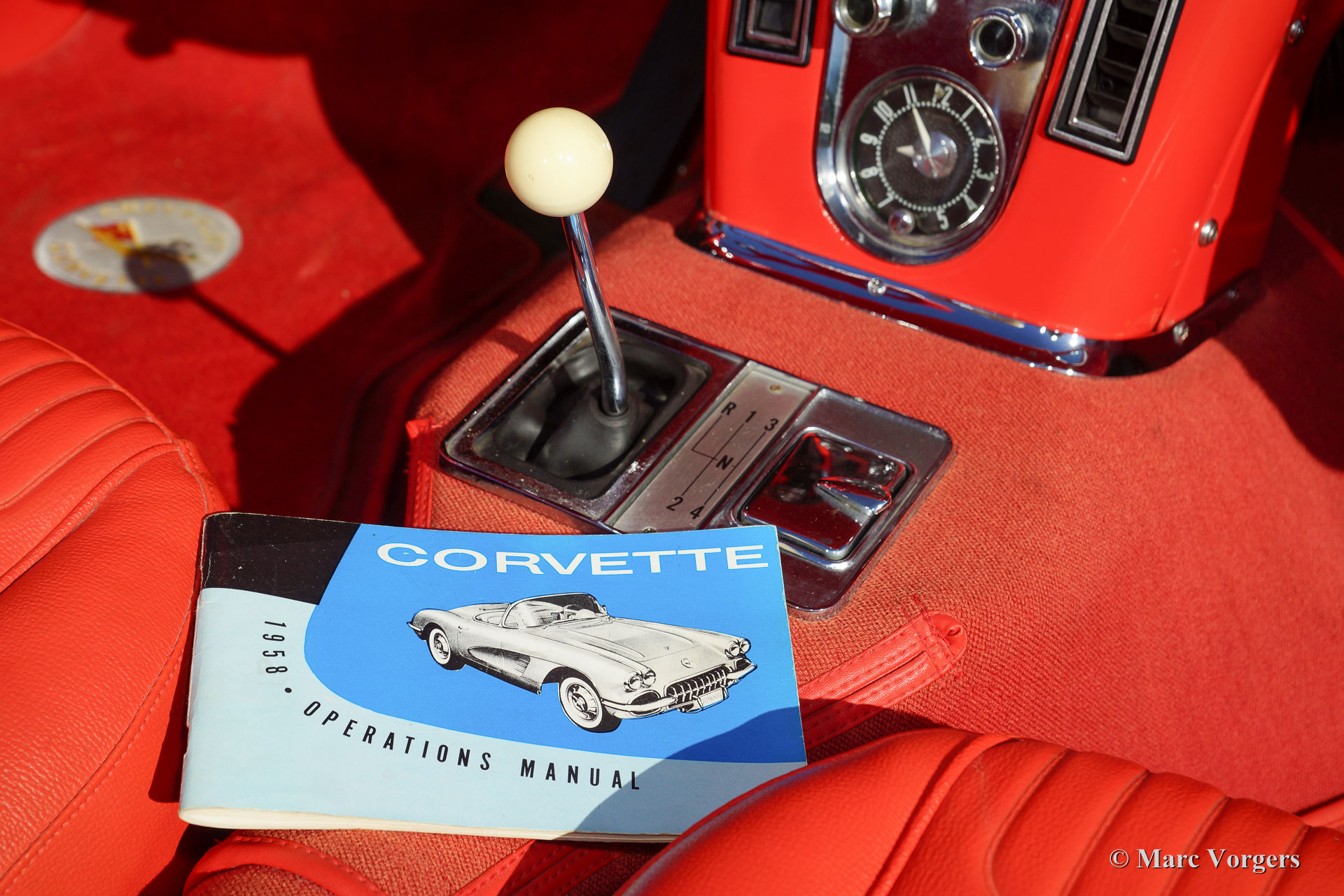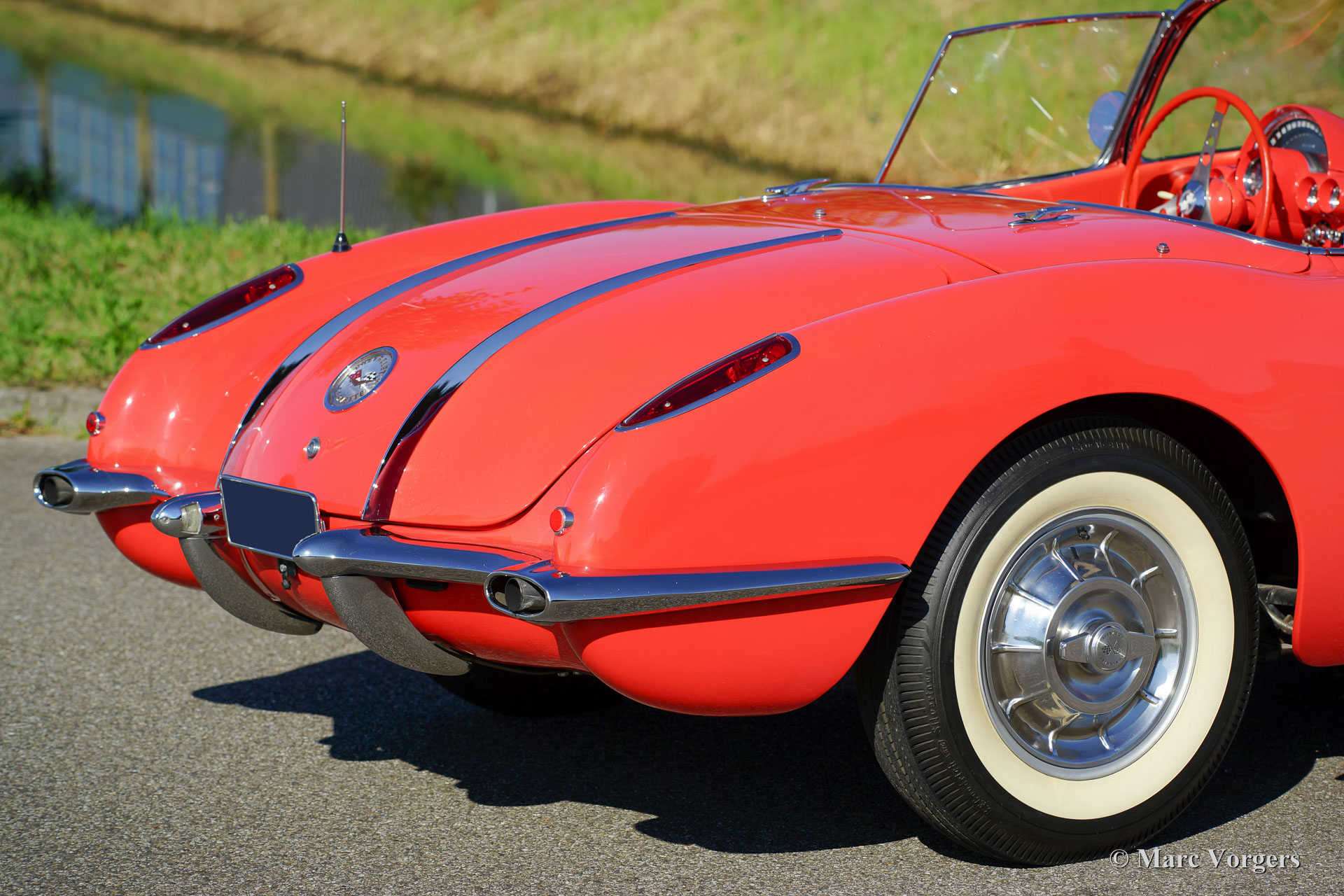 Chevrolet Corvette C1, Jahr 1958. VIN: J58S1064XX. Farbe ‘pumpkin red‘ mit einem roten Kunstleder Interieur und ein weißes Verdeck. Diese wunderschöne Corvette wurde neu verkauft in den USA. Da wurde das Auto in den späten 1990er Jahre umfangreich und perfekt nach Top-Zustand restauriert. Eine sehr umfangreiche Fotoreportage der Restauration und Überholung der Komponente ist vorhanden. Ebenfalls erhältlich ist eine massive Datei-Ordner mit Rechnungen und Geschichte. Diese Corvette ist in einem hervorragenden Top-Zustand; concours. Das 1958-Modell ist den meist begehrten Klassischen Corvette mit den vier Scheinwerfern, das schön geschwungene Heck und dem Tachometer, die bis 8000 Umdrehungen pro Minute abliest. Darüber hinaus ist diese mächtige Maschine ausgestattet mit das wünschenswerte vier-Gang-Schaltgetriebe und Klimaanlage! Die 1950er Jahre Chevrolet Corvette ist der einzige amerikanische Sportwagen mit europäischen Qualitäten; das Auto ist relativ leicht und kompakt mit seinem GRP-Kunststoff Karosserie und herrlichen Styling. Diese Tugenden sind kombiniert mit einer guten Straßenlage, ein sportlicher Komfort und einem herrlichen 250 PS starken V8-Motor! Dies ist ein US-ICON der 1950ern in einem Top-Zustand!