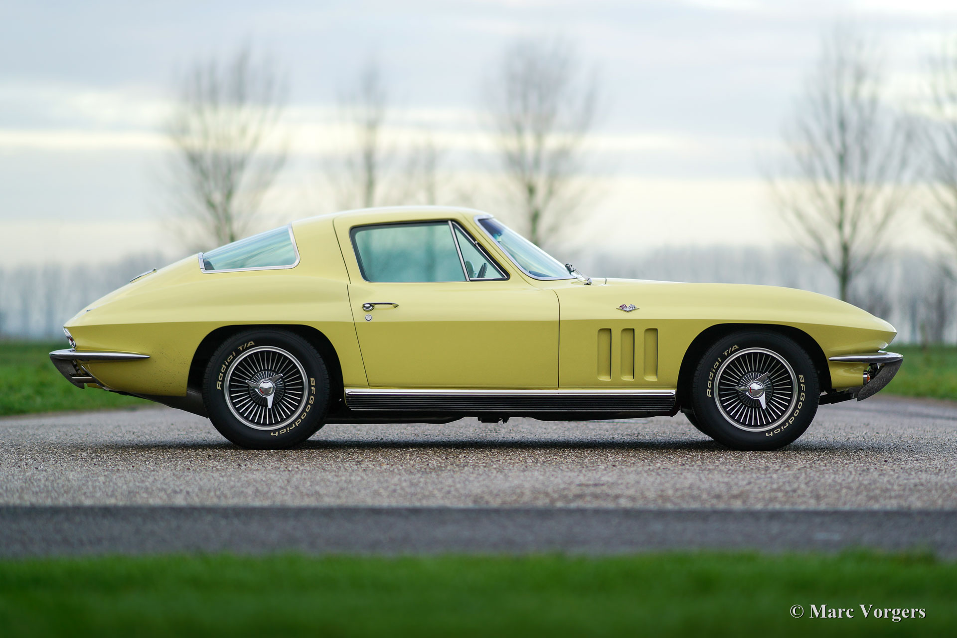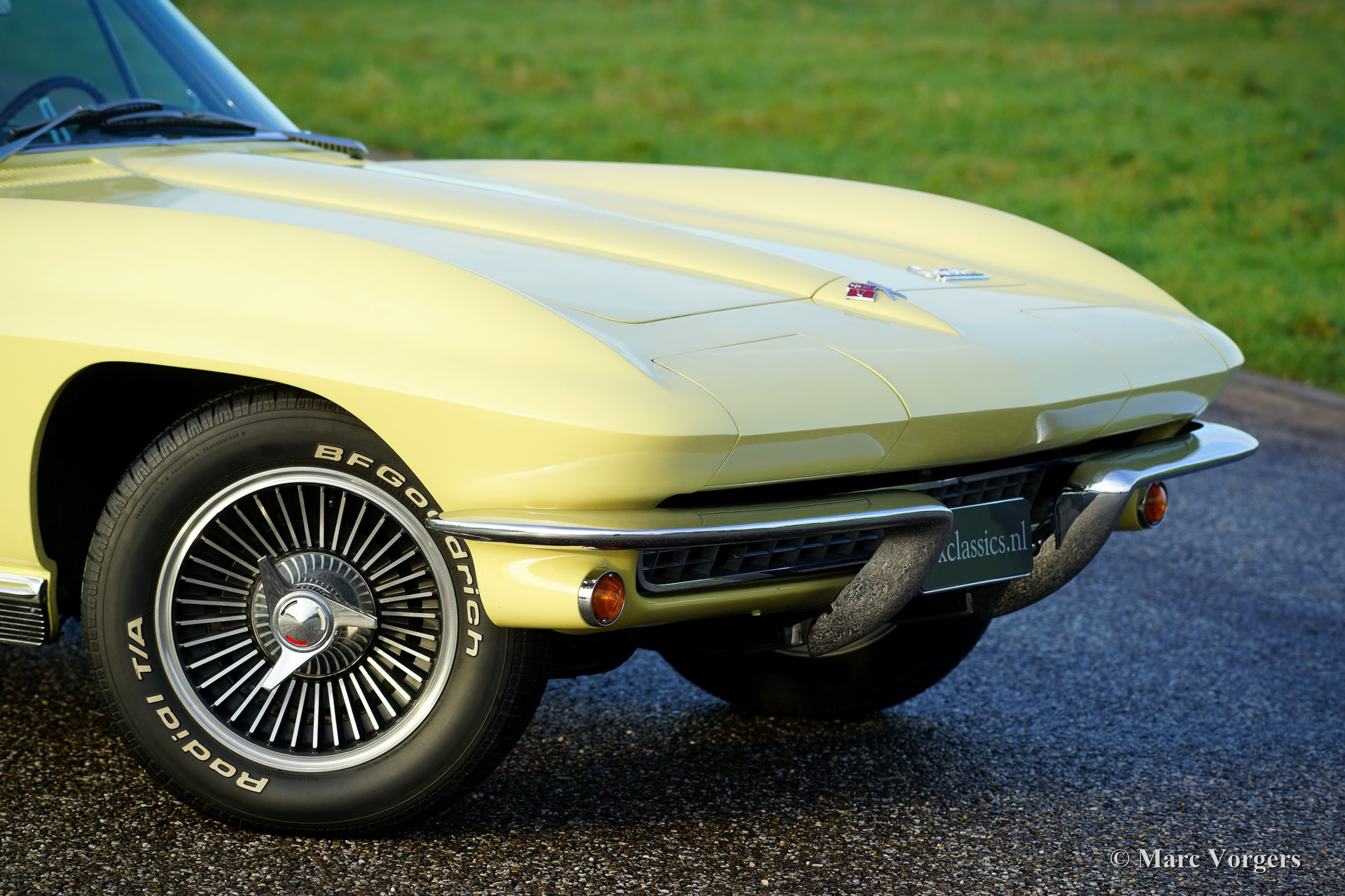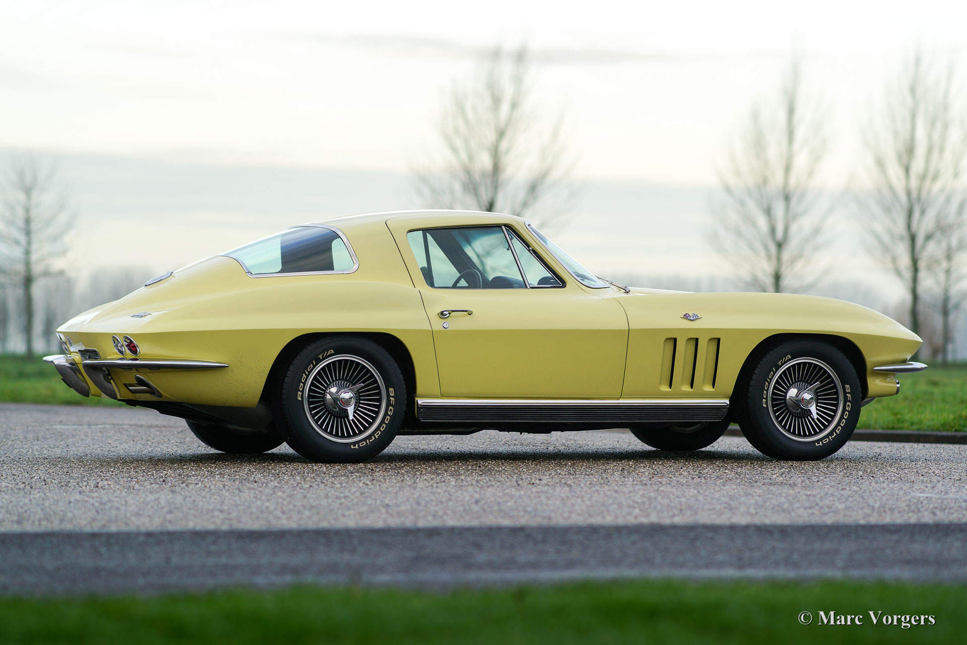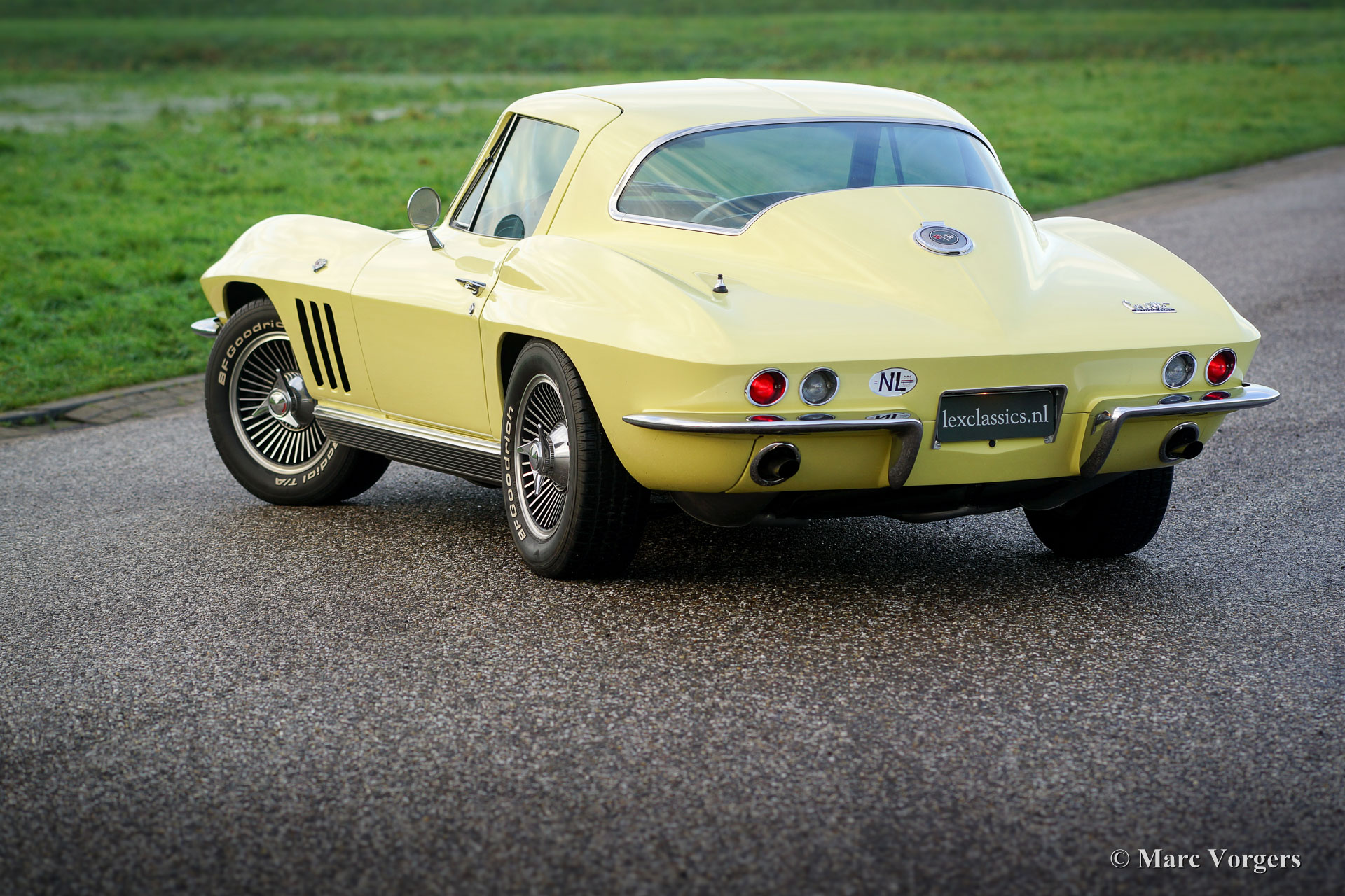 Chevrolet Corvette C2, year 1966. Colour pale yellow with a black interior. This impressive Chevrolet Corvette is in superb top-condition; Concours! In 1966 9.958 examples of this model were built. The car features a 350 bhp V8 engine and a manually operated 4-speed gearbox.
