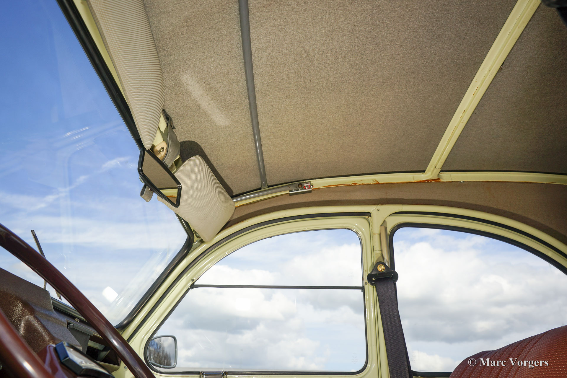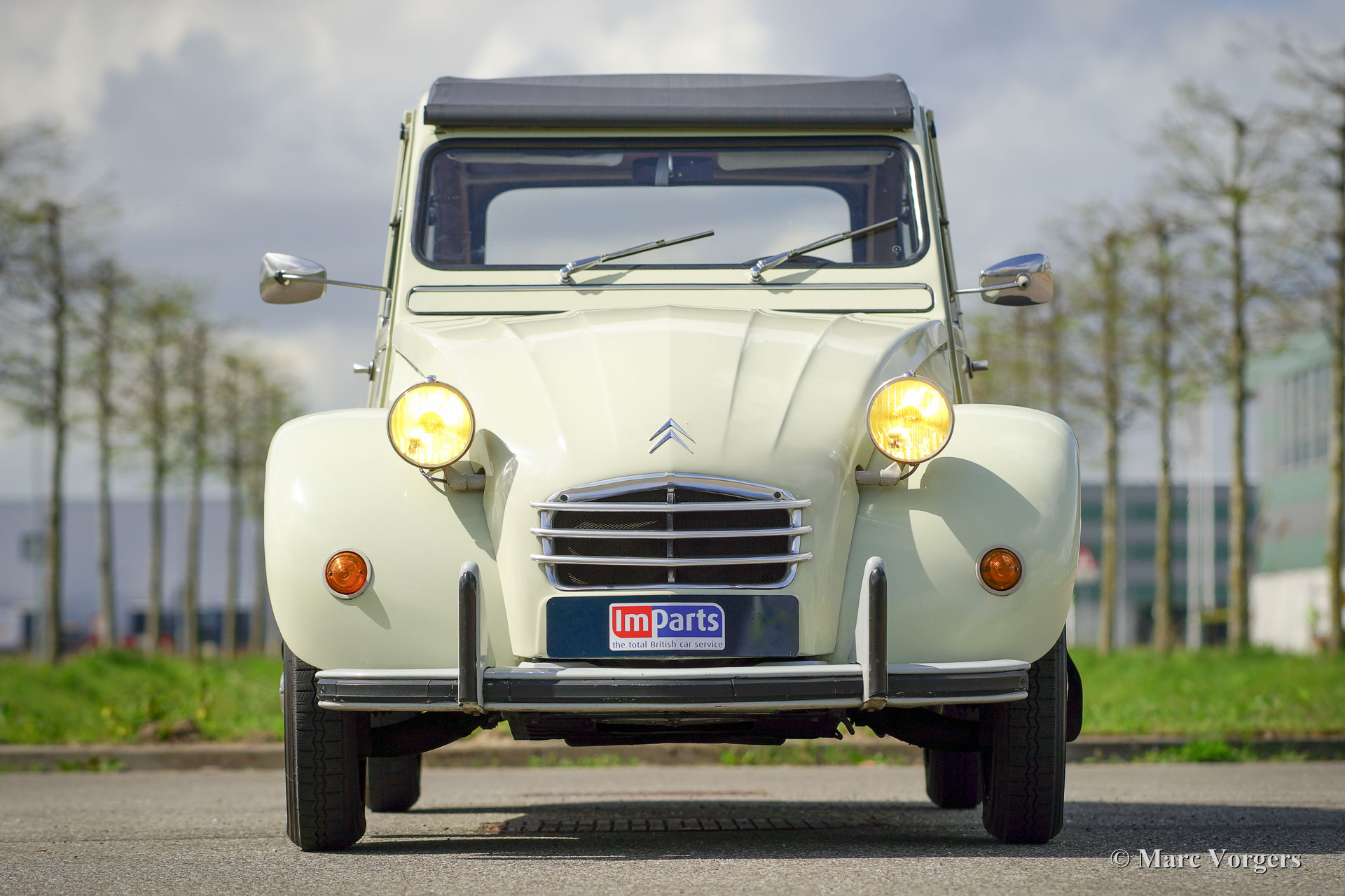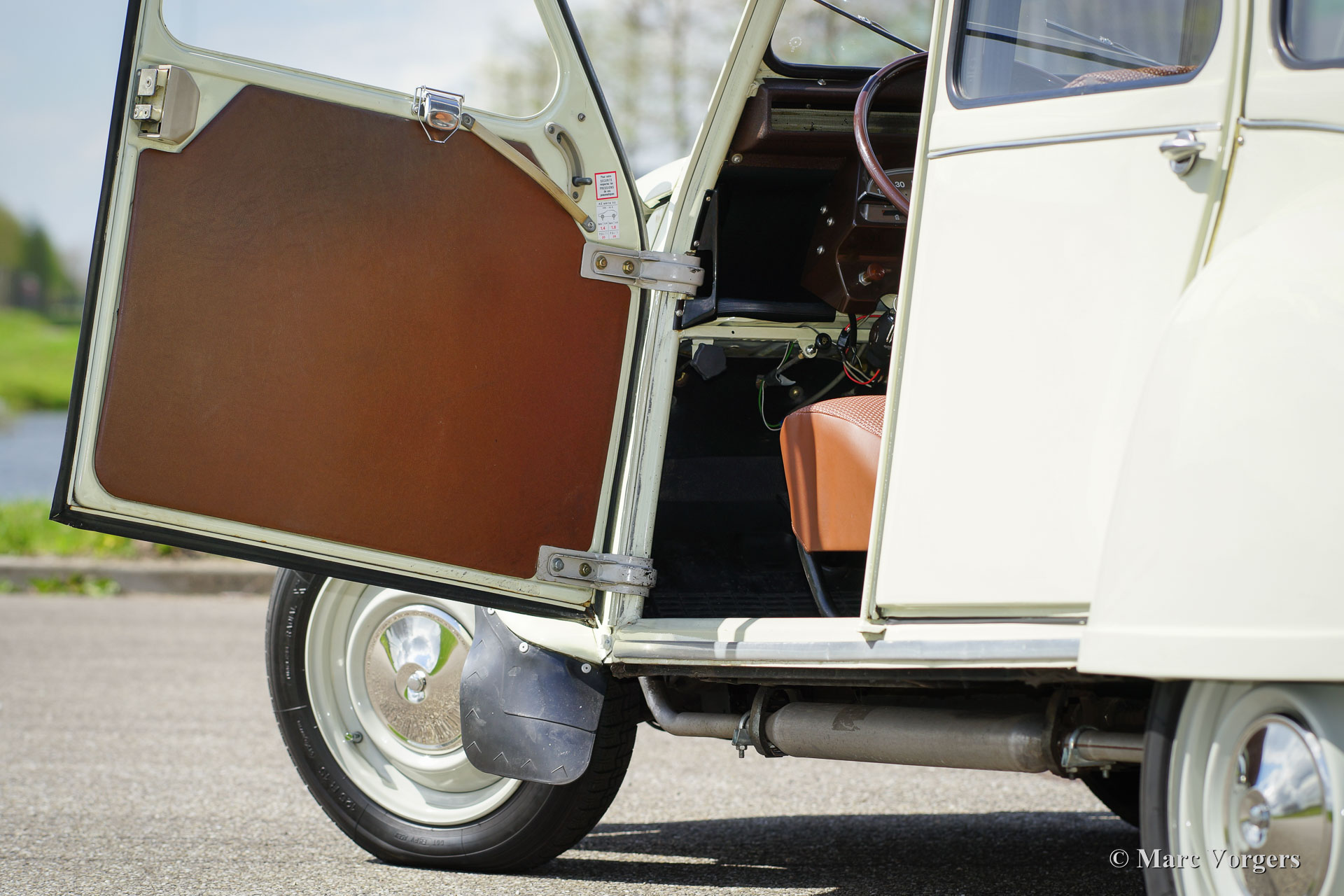 Citroën 2CV4, Jahr 1974. Farbe weißlich mit einem Hauch von hellgrün. Braun Vinyl Interieur mit schwarzem Gummi Teppich. Dieses herrliche 2CV4 ‘Ente‘ wurde ausgiebig und wunderschön restauriert; das Auto ist in einem hervorragenden Zustand. Dieser Citroën zeigt alle ursprünglichen Details und das Auto verfügt über die richtigen Michelin-Reifen. Ein 2CV4 zu fahren, ist immer ein besonderes Erlebnis!
