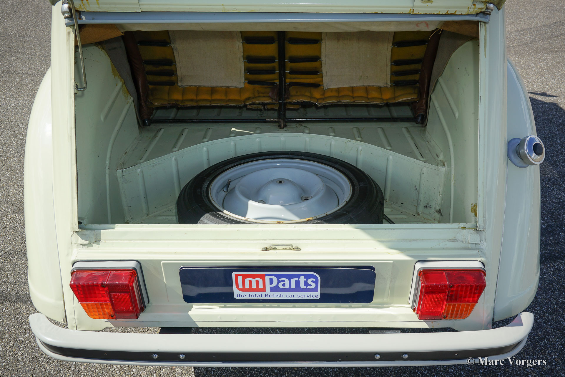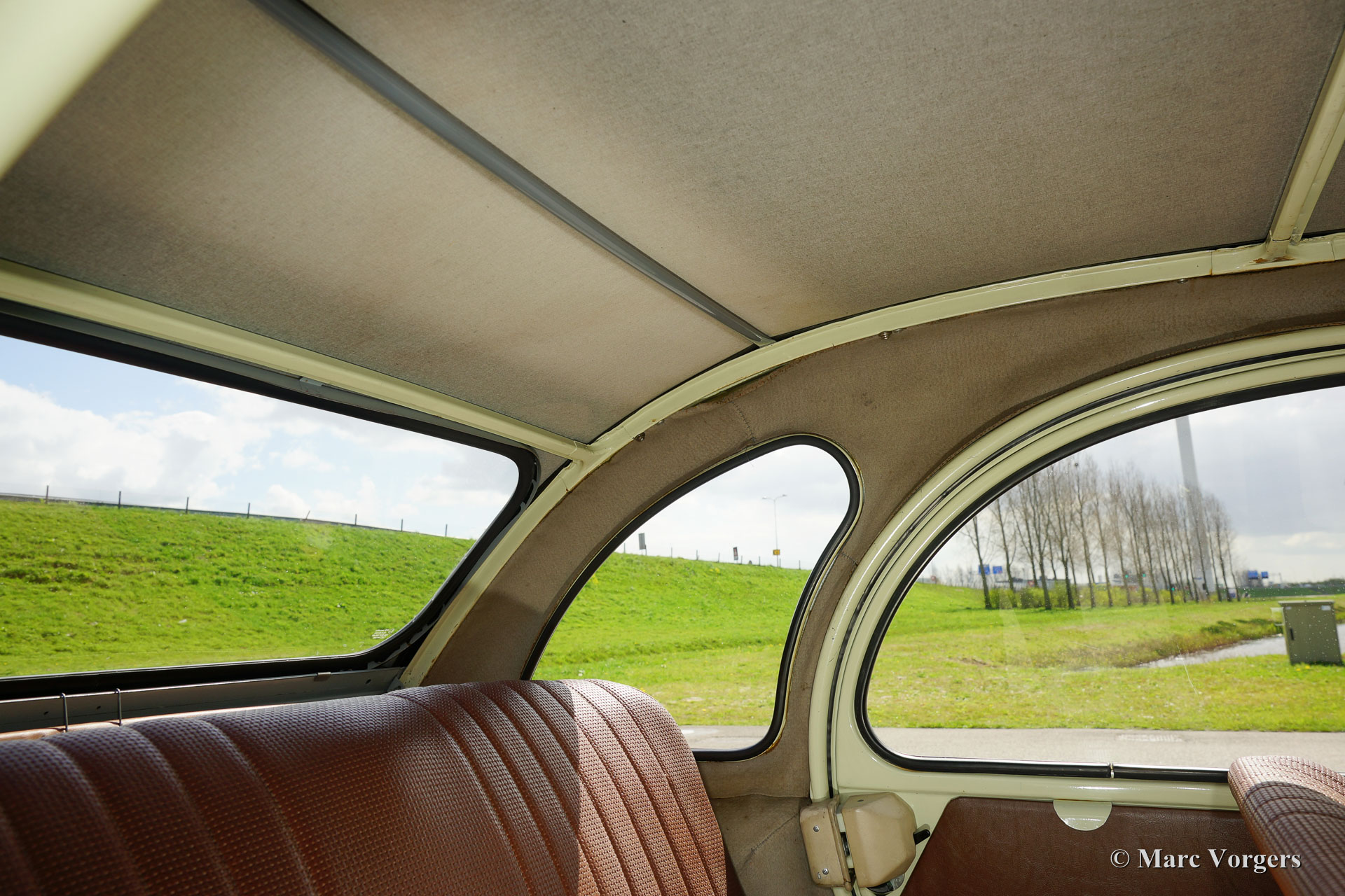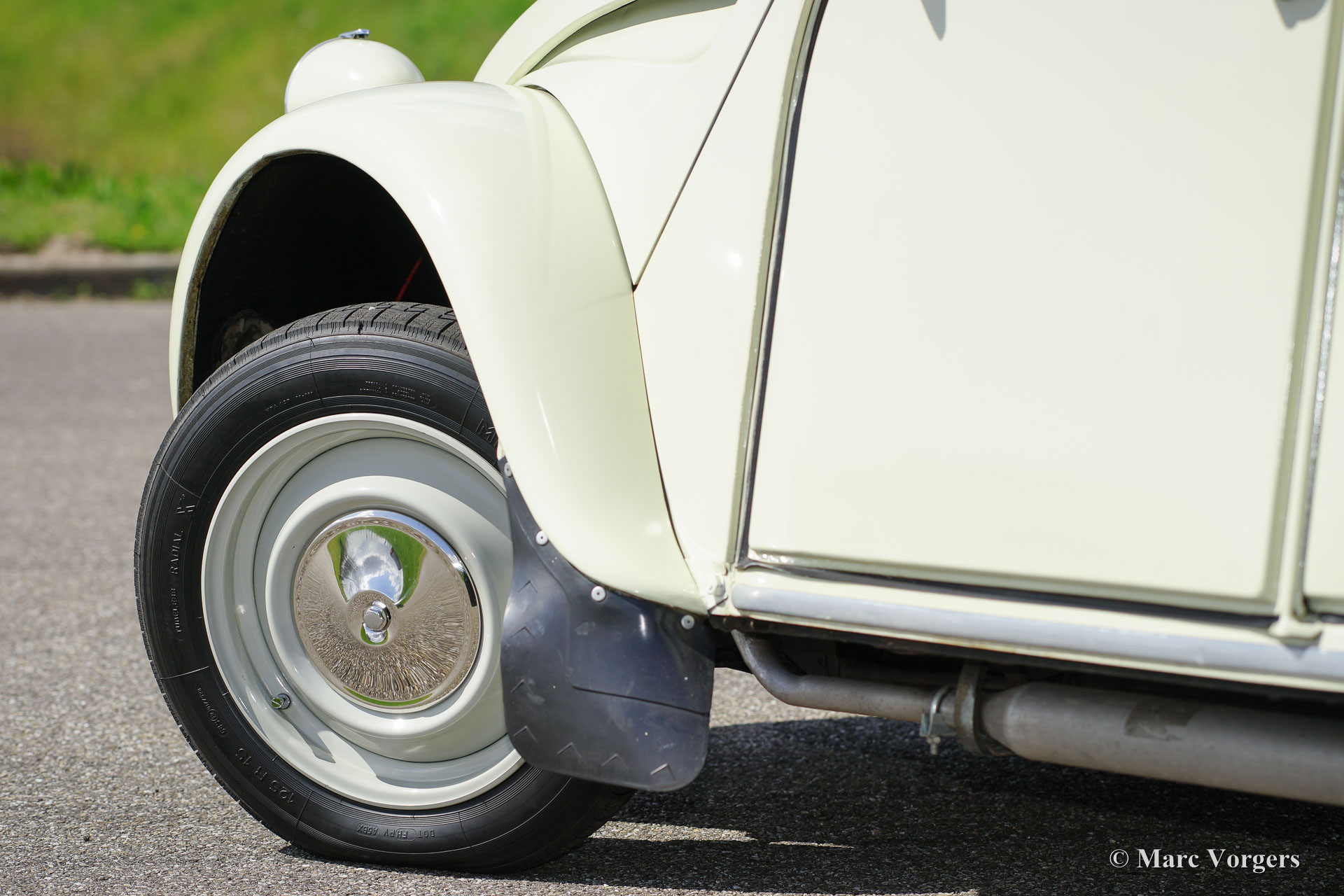 Citroën 2CV4, Jahr 1974. Farbe weißlich mit einem Hauch von hellgrün. Braun Vinyl Interieur mit schwarzem Gummi Teppich. Dieses herrliche 2CV4 ‘Ente‘ wurde ausgiebig und wunderschön restauriert; das Auto ist in einem hervorragenden Zustand. Dieser Citroën zeigt alle ursprünglichen Details und das Auto verfügt über die richtigen Michelin-Reifen. Ein 2CV4 zu fahren, ist immer ein besonderes Erlebnis!