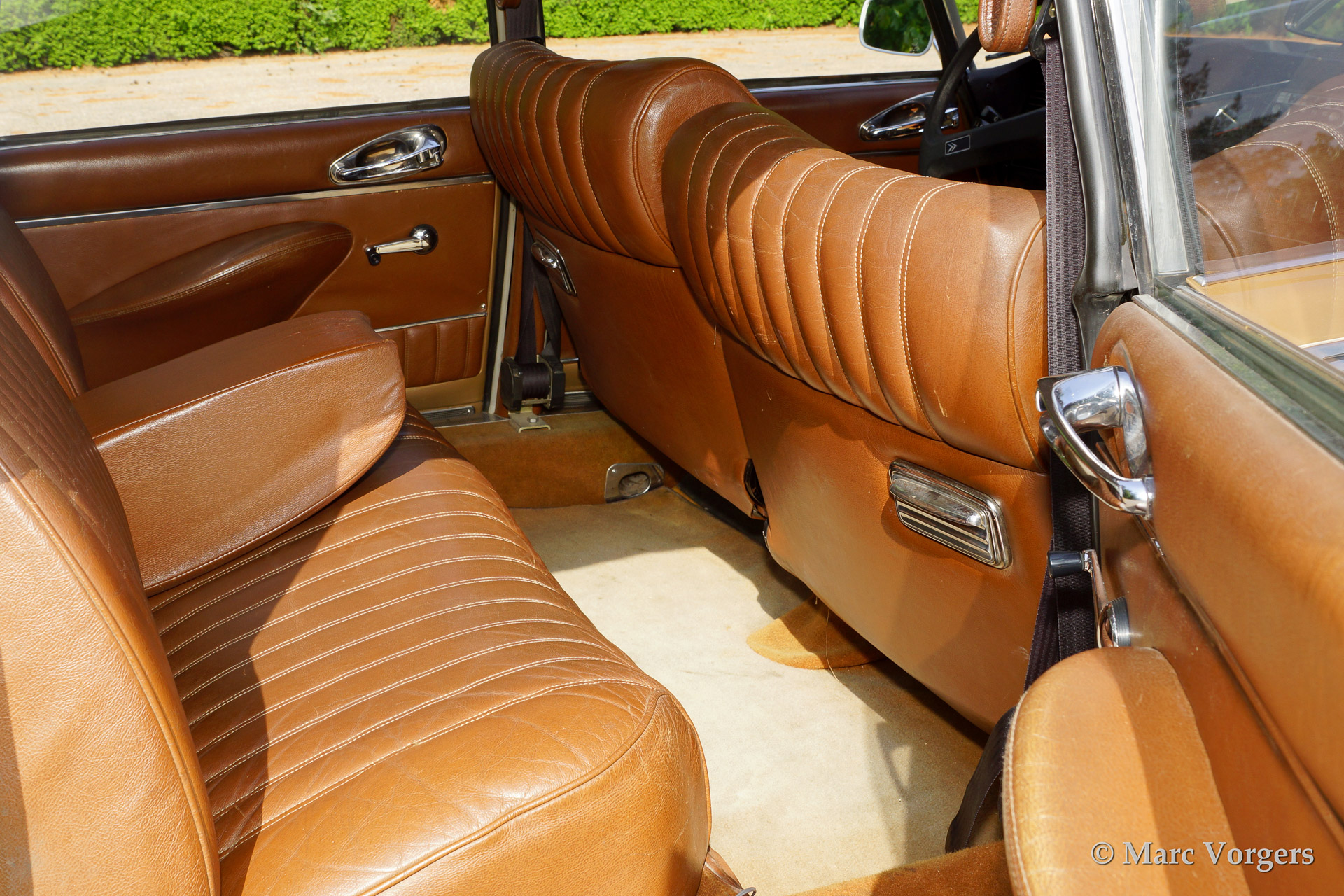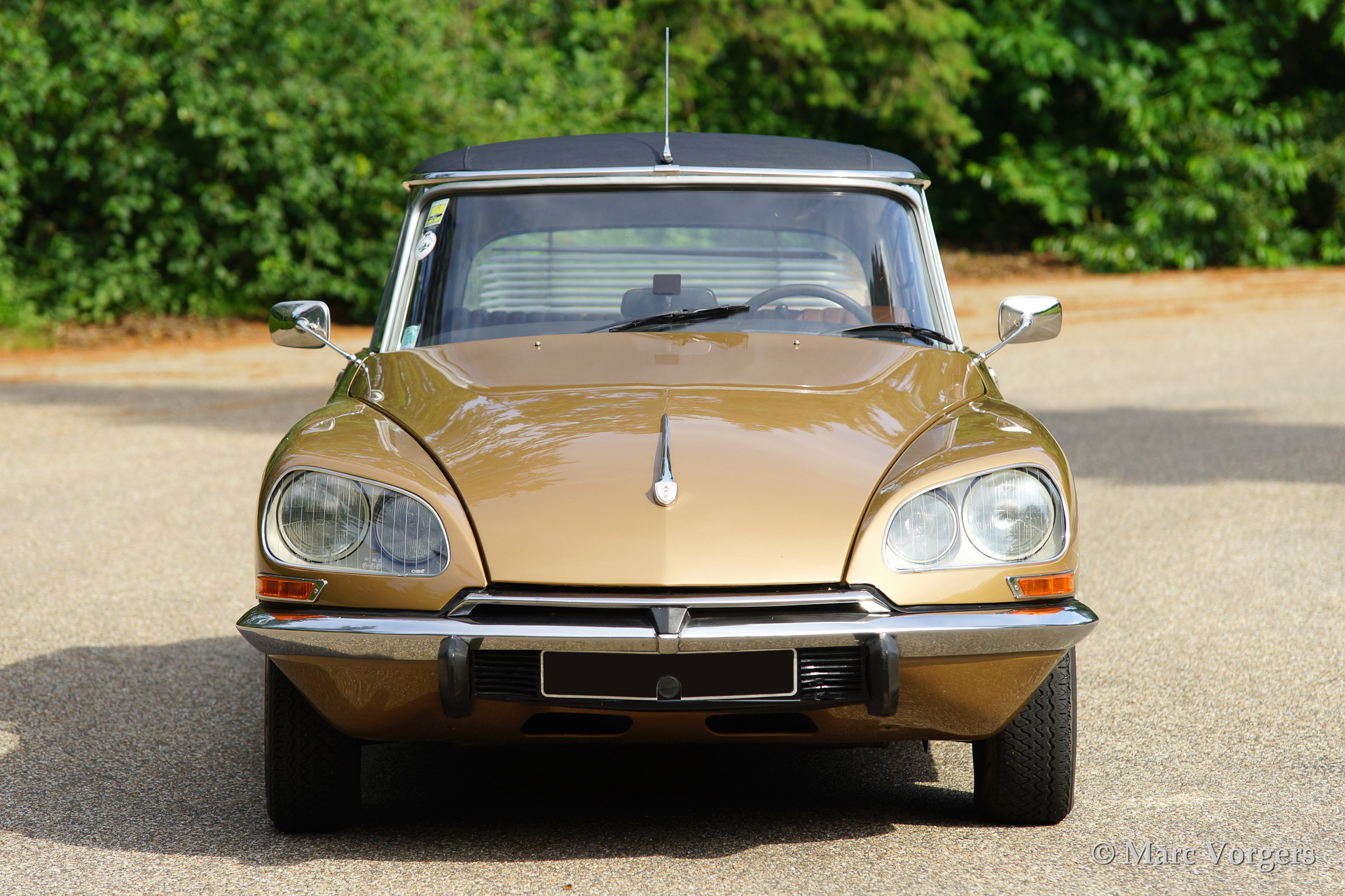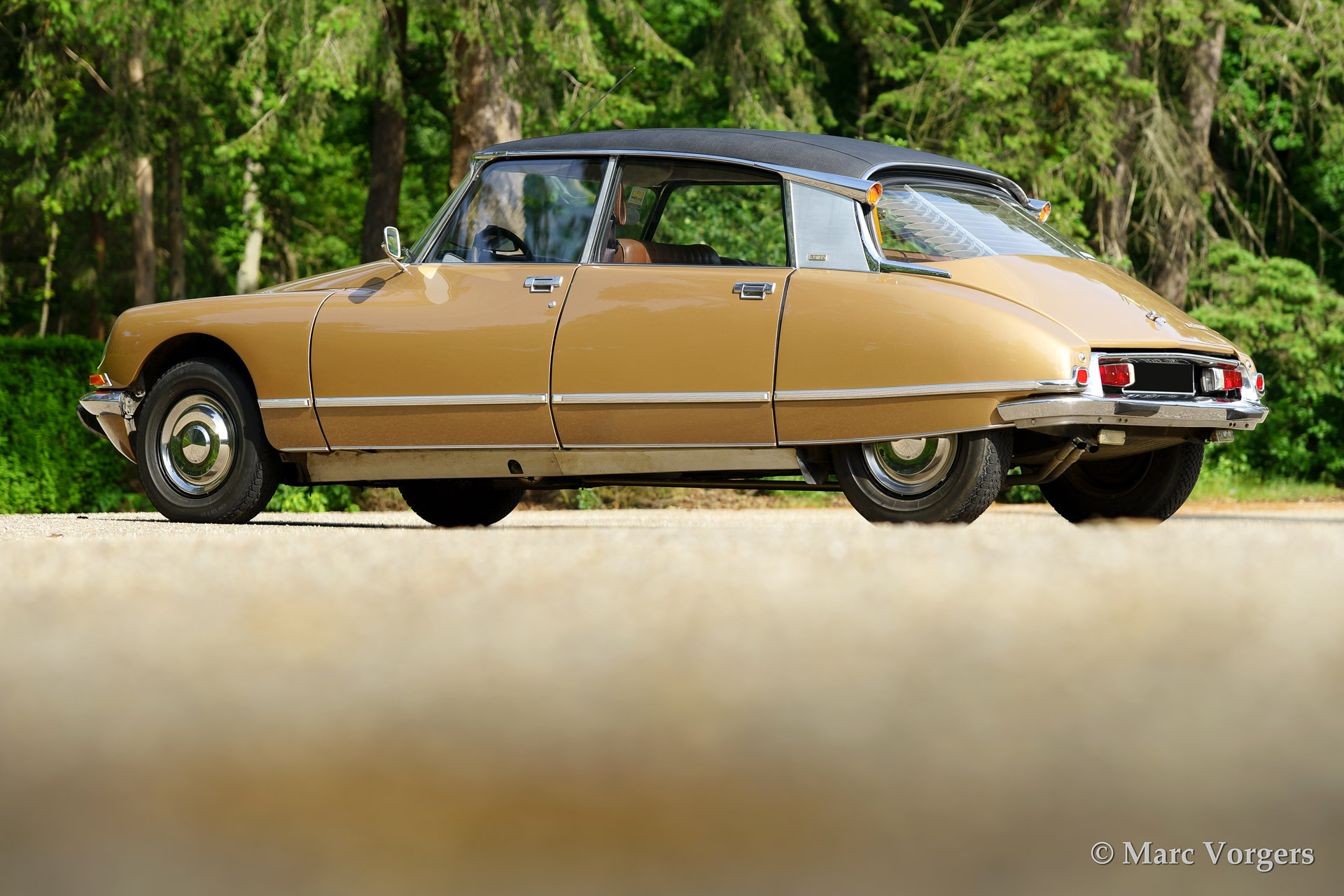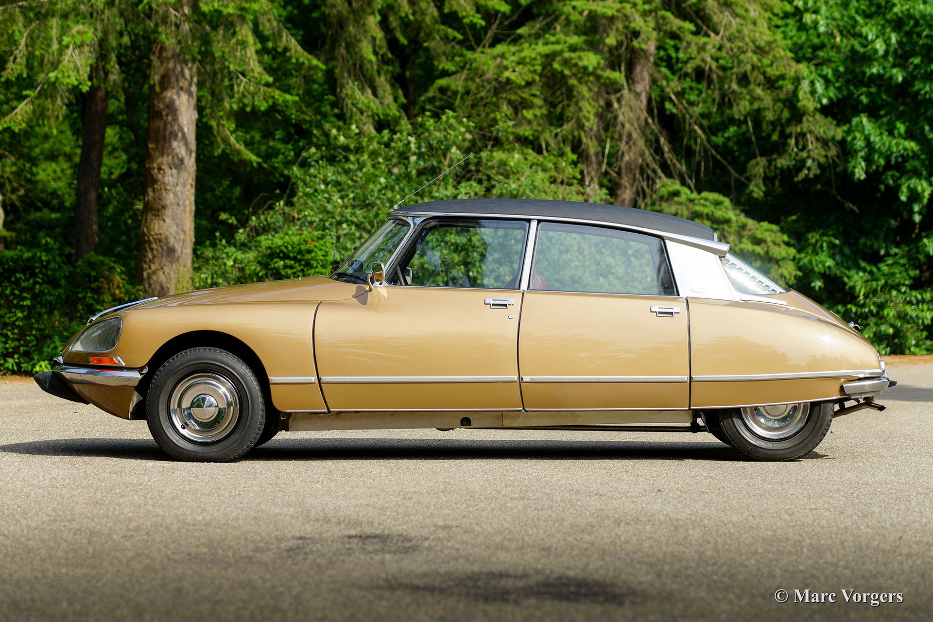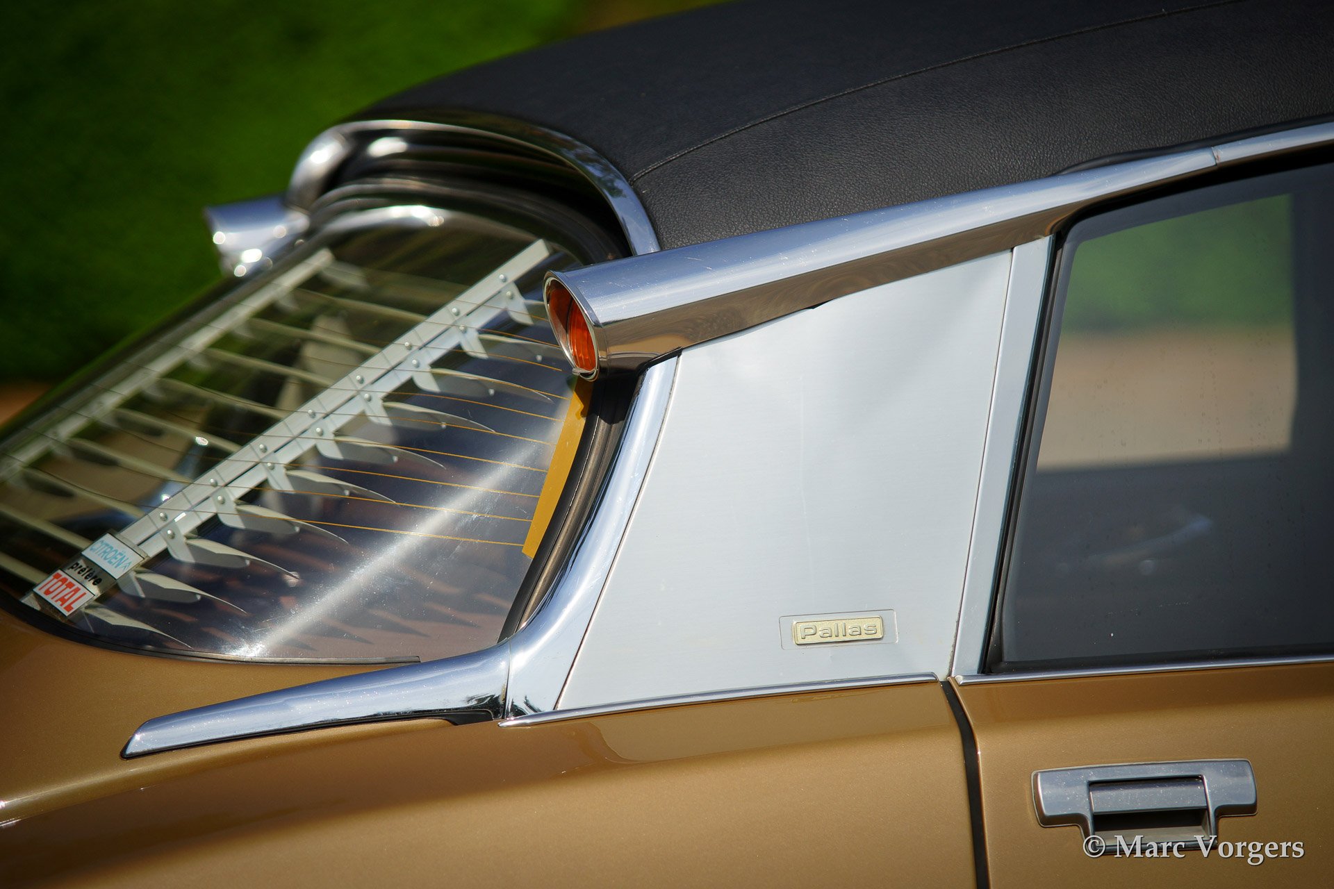 Citroen DS 23 Pallas, year 1974. Colour bronze metallic with a black vinyl roof top. Brown full leather interior and brown carpet. This fabulous Citroen DS 23 is a genuine Pallas featuring the magnificent round gauges and a semi-automatic gearbox. This DS shows all original details.