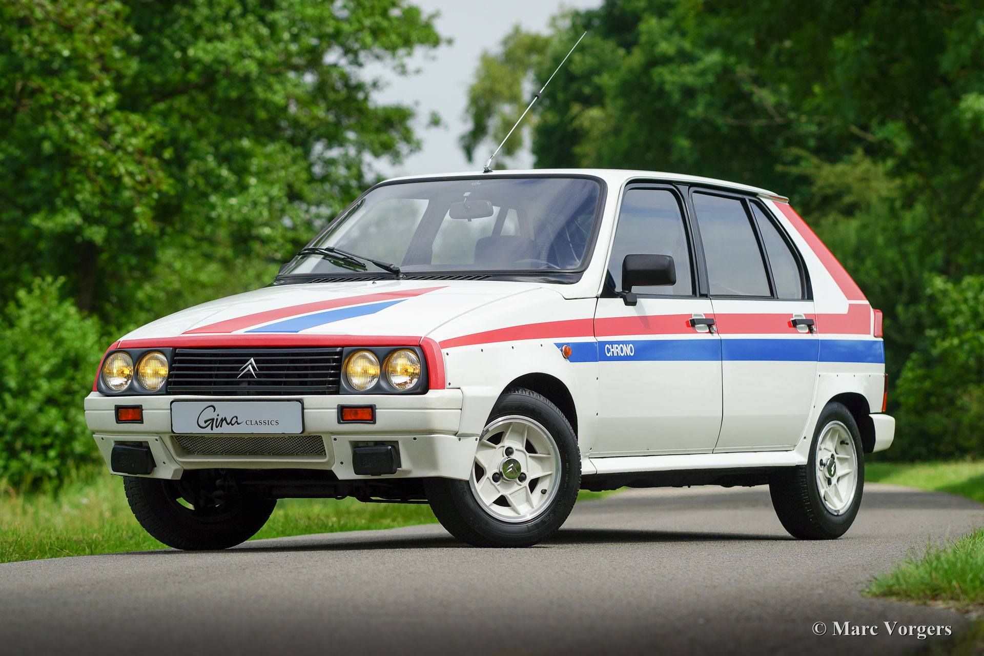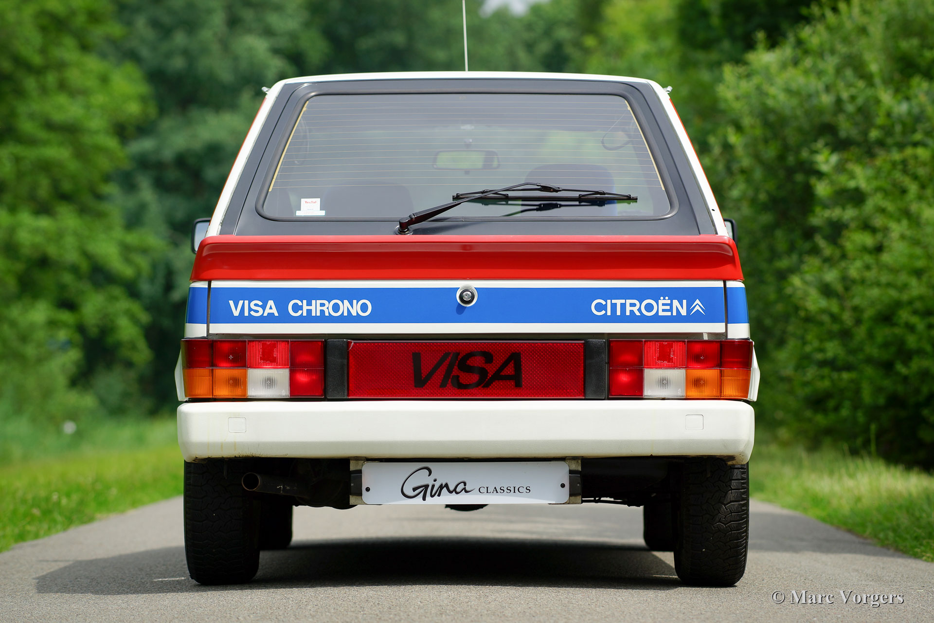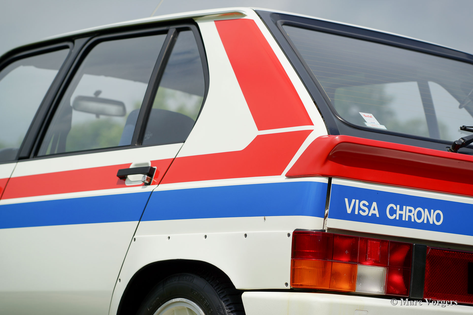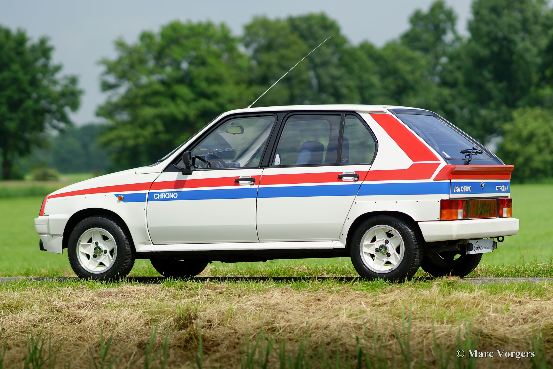 Citroën Visa Chrono, Jahr 1983. Farbe Weiß (Blanc Meije) mit einem schwarz / blauen Stoff Innenraum. Die Chrono wurde in Französische / Niederländische / und deutschen Farben geliefert. Weiß mit rot und blau ‘striping‘ für die niederländischen und Französischen Autos. Die Visa Chrono verfügt über ein einzigartiges Armaturenbrett mit schönen Jaeger Instrumente das nur im Chrono geliefert wurde. In den 1980ern Jahre war die Visa Chrono ein Wettbewerber des Renault R5 GT und den Peugeot 205 GTI. Mit einer Leistung von 80 PS. und einem Gewicht von nur 900 Kilogramm ist das Auto ein richtiger ‘hot hatch'.