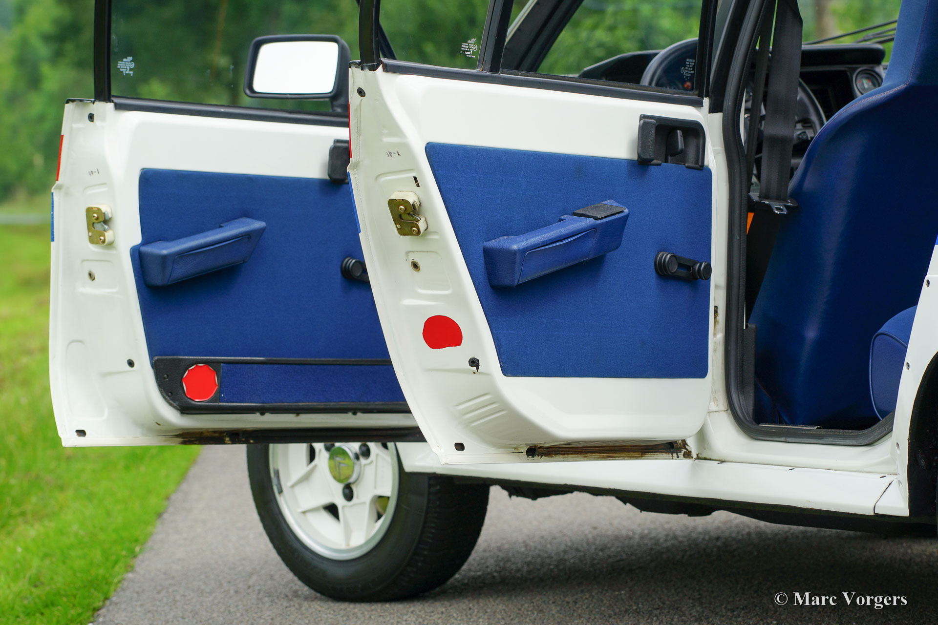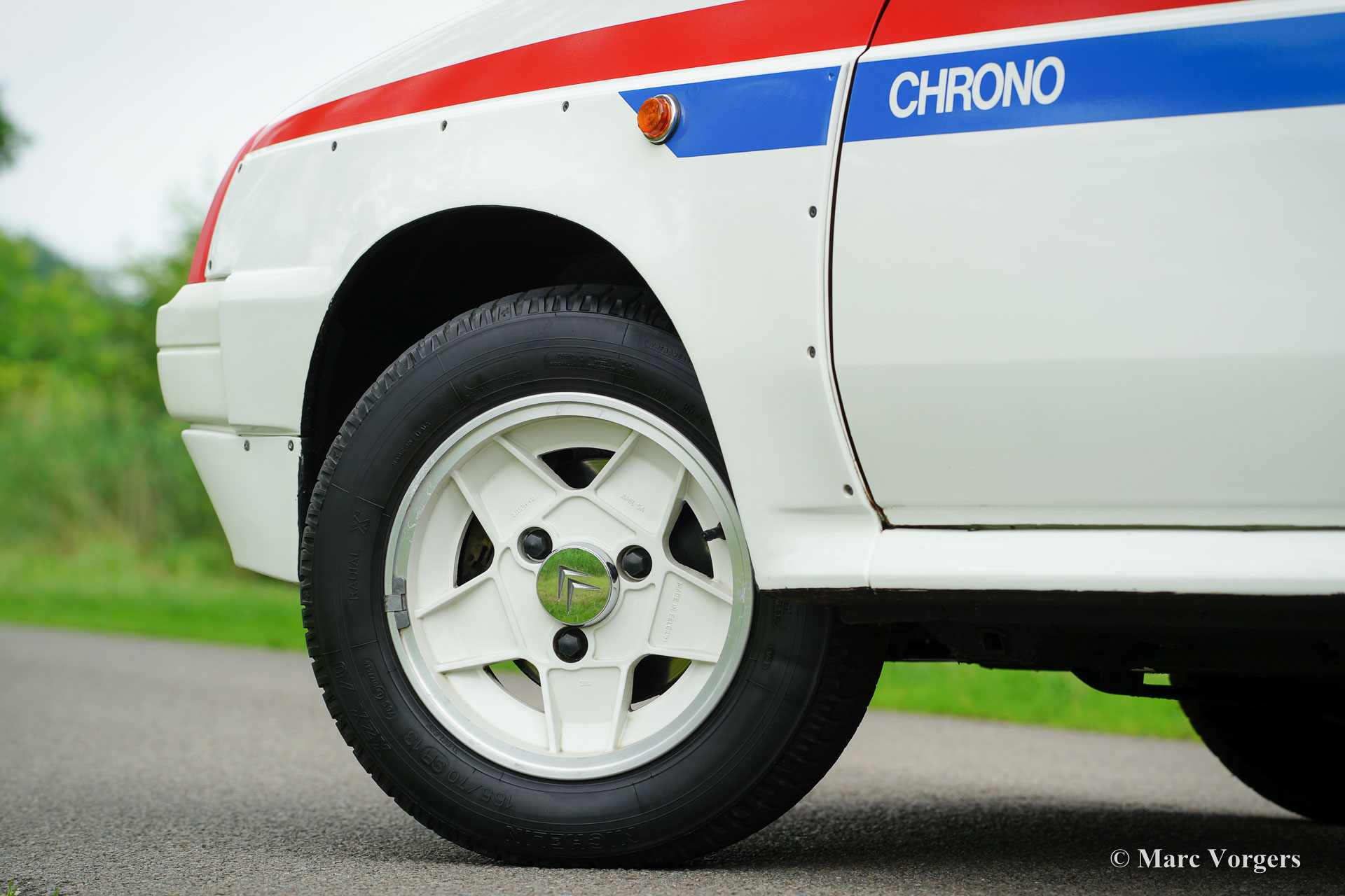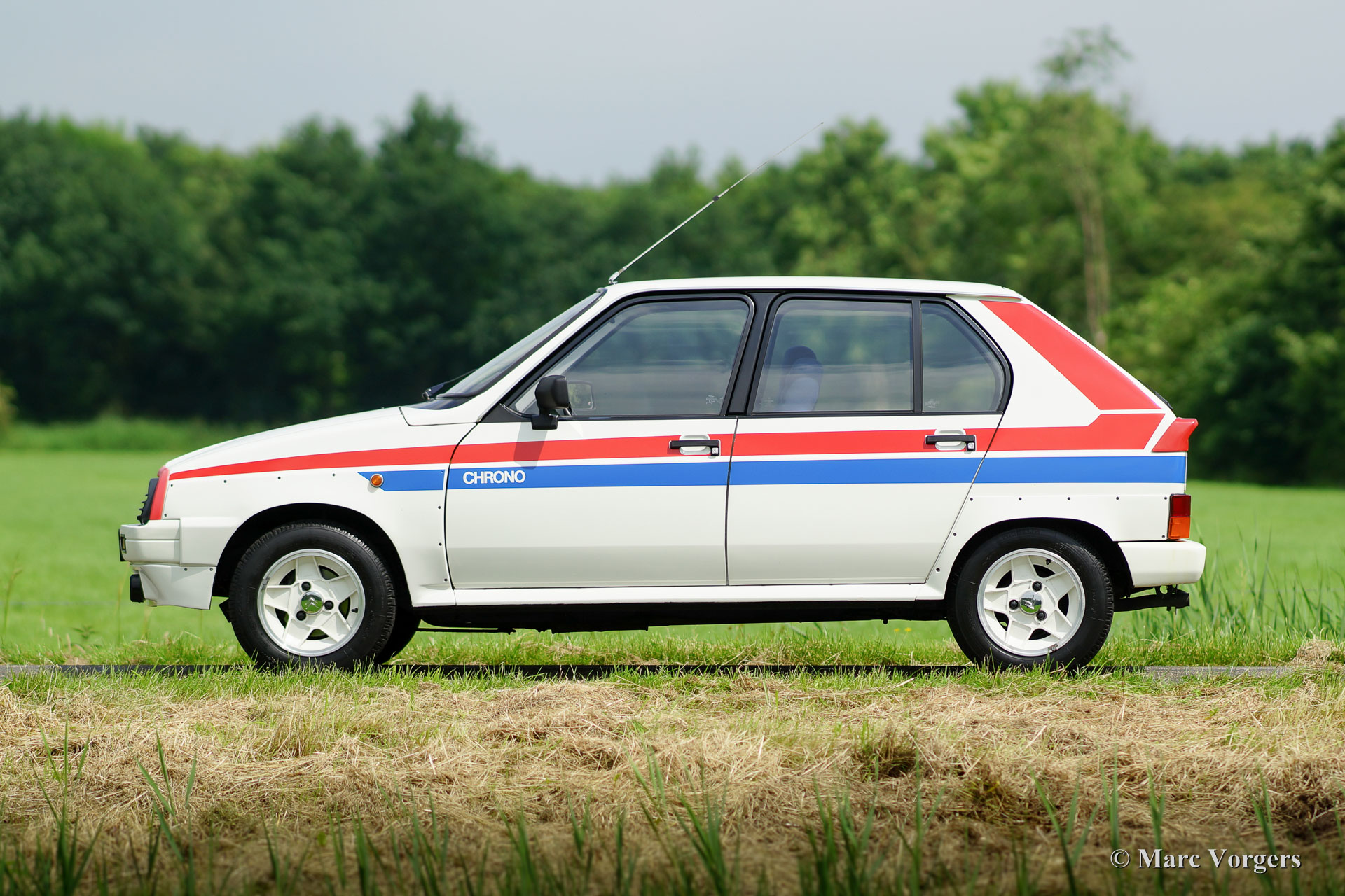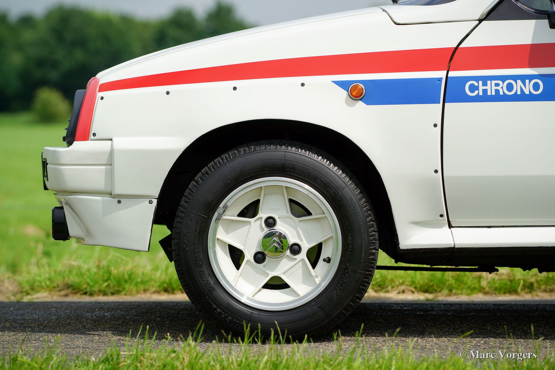Citroën Visa Chrono, Jahr 1983. Farbe Weiß (Blanc Meije) mit einem schwarz / blauen Stoff Innenraum. Die Chrono wurde in Französische / Niederländische / und deutschen Farben geliefert. Weiß mit rot und blau ‘striping‘ für die niederländischen und Französischen Autos. Die Visa Chrono verfügt über ein einzigartiges Armaturenbrett mit schönen Jaeger Instrumente das nur im Chrono geliefert wurde. In den 1980ern Jahre war die Visa Chrono ein Wettbewerber des Renault R5 GT und den Peugeot 205 GTI. Mit einer Leistung von 80 PS. und einem Gewicht von nur 900 Kilogramm ist das Auto ein richtiger ‘hot hatch'.