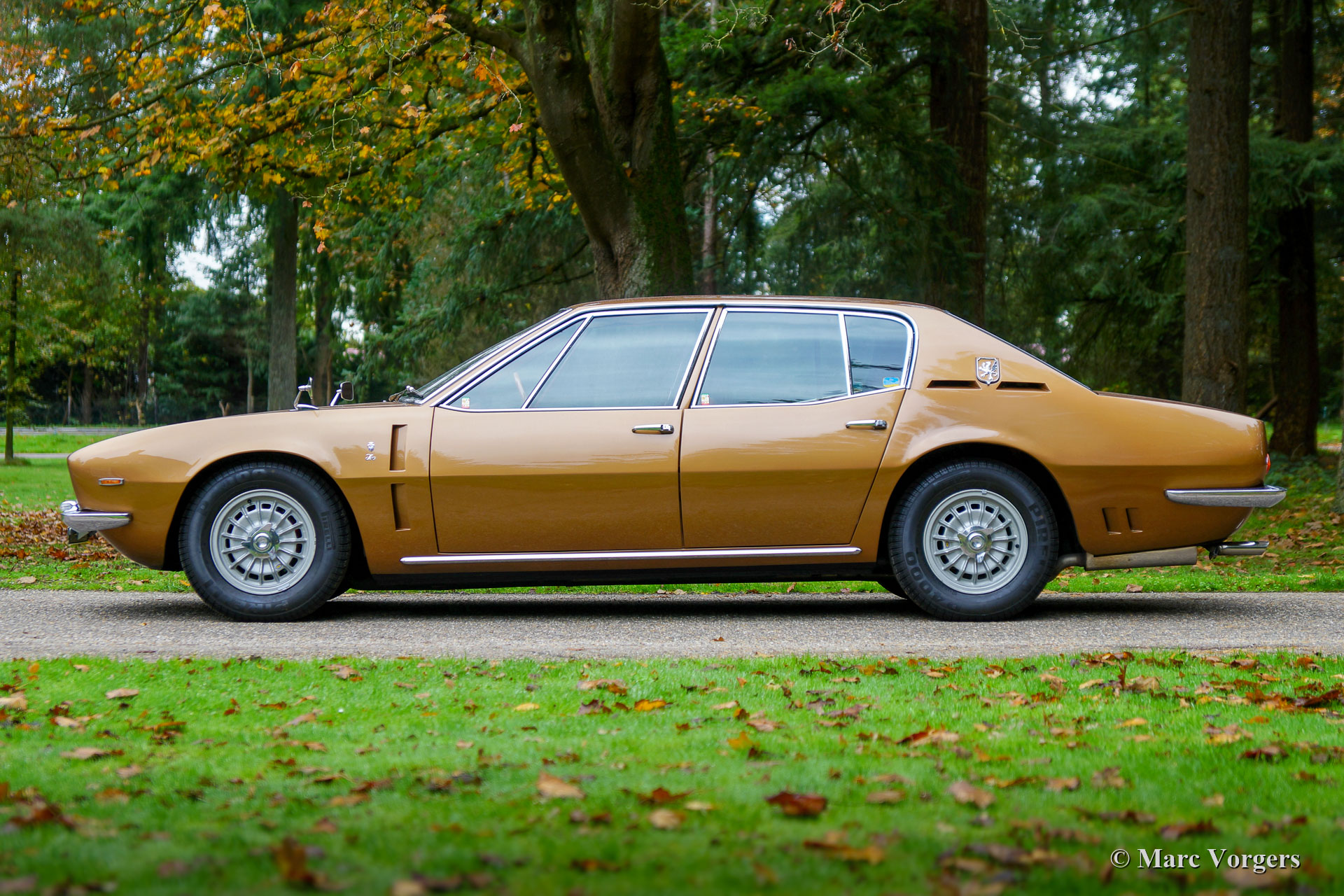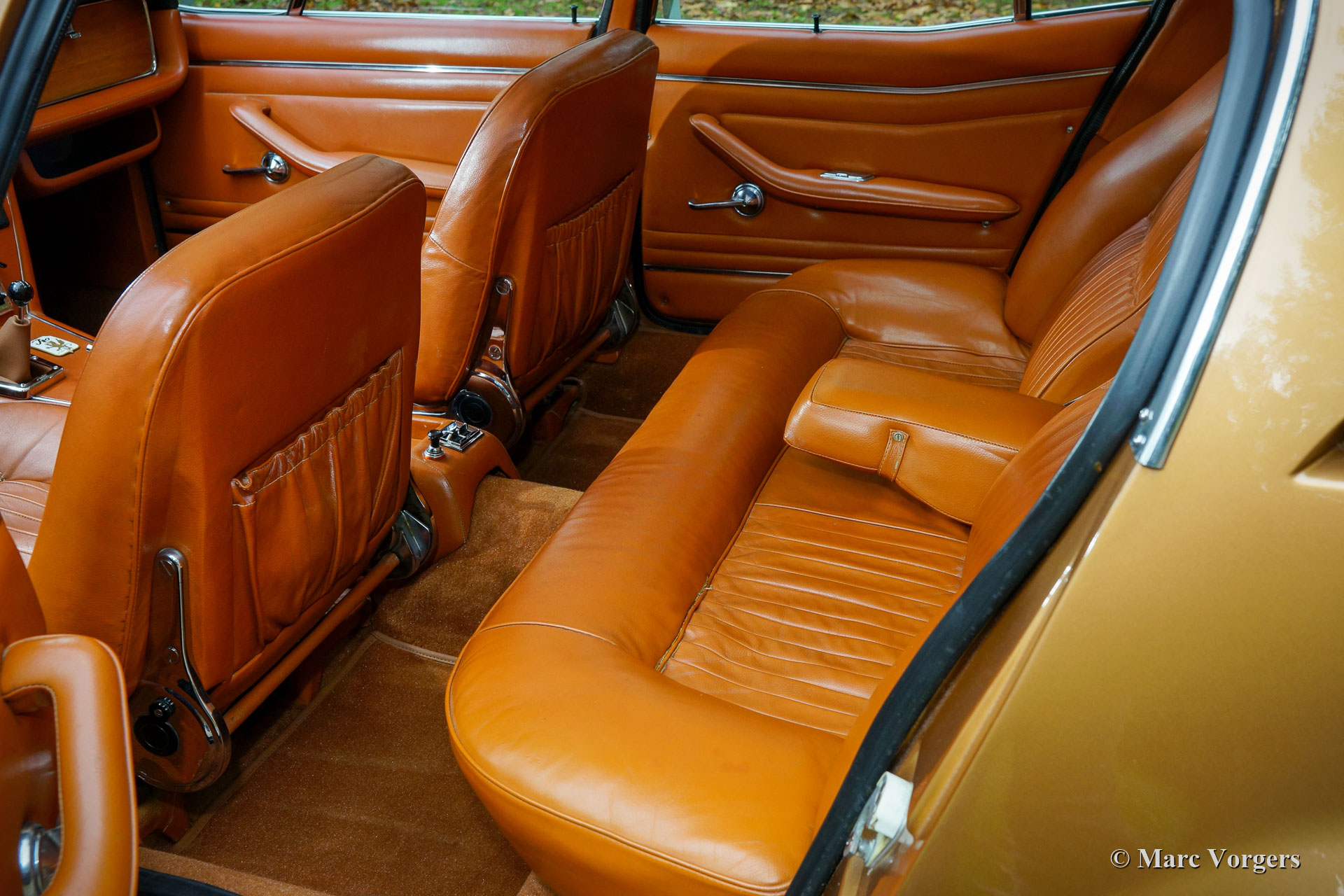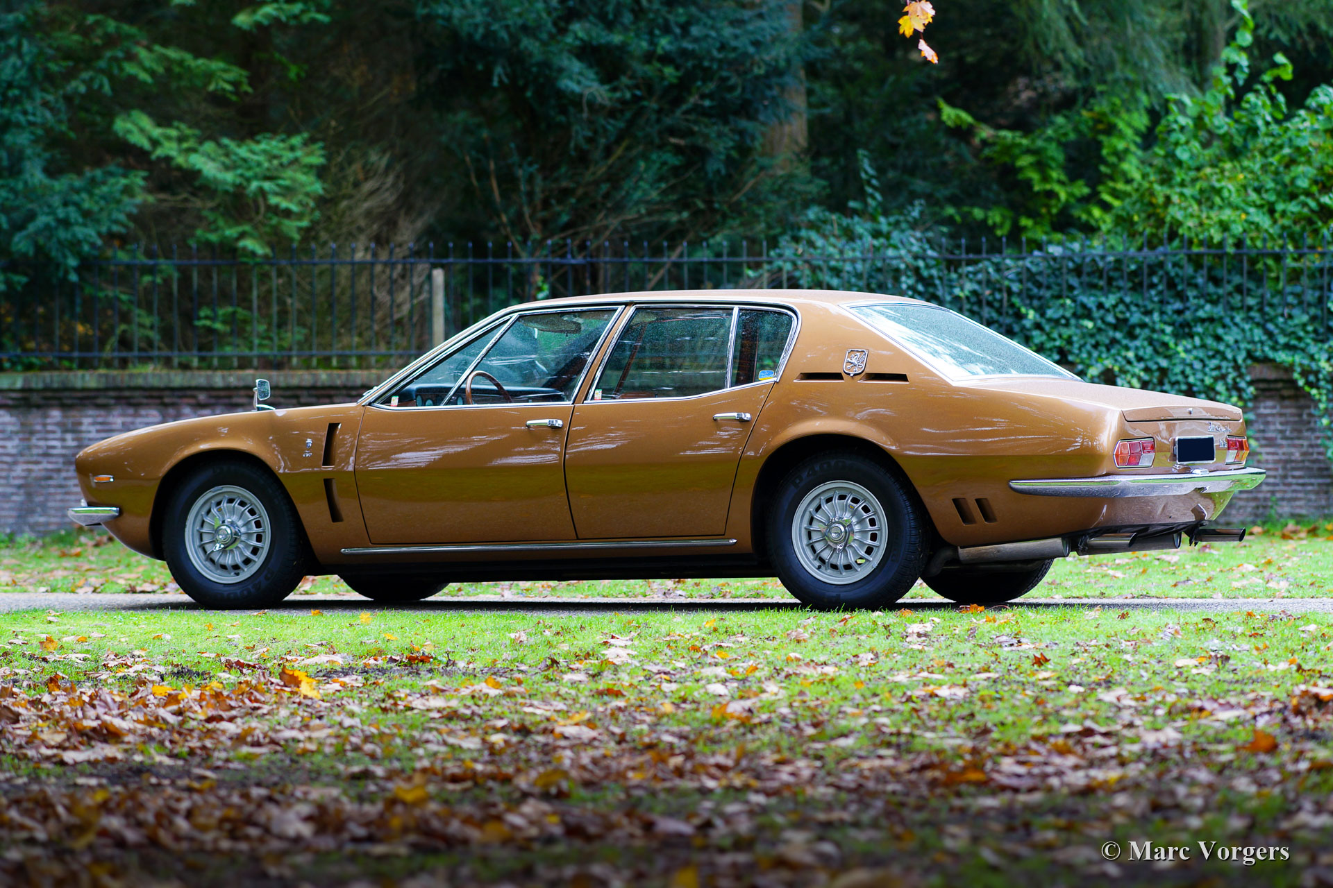 Iso Rivolta Fidia, Jahr 1969. Farbe gold / braun metallic kombiniert mit einer cognacfarbenen Lederausstattung und hellbraunem Teppich. Diese beeindruckende und sehr seltene Iso Fidia wurde in der Schweiz neu verkauft. Im Februar 2015 wurde das Automobil in die Niederlande importiert. Der Iso Fidia ist sehr selten, nur 192 Exemplare wurden von 1967 bis 1974 gebaut. Der von Giugiaro bei Ghia entworfene Iso Fidia gehörte zu den schnellsten viertürigen Limousinen der Zeit. Wie die Sportwagen von Iso Rivolta wurde auch der Fidia von robustem, zuverlässigem und sehr leistungsstarkem Chevrolet (Corvette) V8-Motoren (Ford V8-Motoren von 1973) angetrieben. Dieses wunderschöne Beispiel ist mit einem 5,4-Liter-V8-Motor ausgestattet, der mit einem Viergang-Schaltgetriebe (Vollsynchronisation) kombiniert ist. Die Hinterachse verfügt über ein Sperrdifferential, um die Kraft von 350 Pferden richtig auf die Straße zu bringen. Dieser Iso Fidia ist innen und außen in ausgezeichnetem Zustand und das Auto fährt perfekt! Es ist ein ganz besonderes Gefühl, eine große italienische Luxuslimousine mit V8-Antrieb zu fahren. Das Lederinterieur mit dem hölzernen Armaturenbrett atmet puren Luxus der spät 1960er Jahre, die Servolenkung ist ein Genuss und das Murren des großartigen V8-Motors im Hintergrund rundet das Erlebnis ab. Das Auto ist versehen von wunderschönen Original-Leichtmetallrädern, Pirelli P4000-Reifen und einem Becker Mexico-Stereo-Kassettenradio der Spitzenklasse aus den 1970er Jahren. Dieser Iso Rivolta Fidia ist ein ist ein hervorragendes Beispiel!