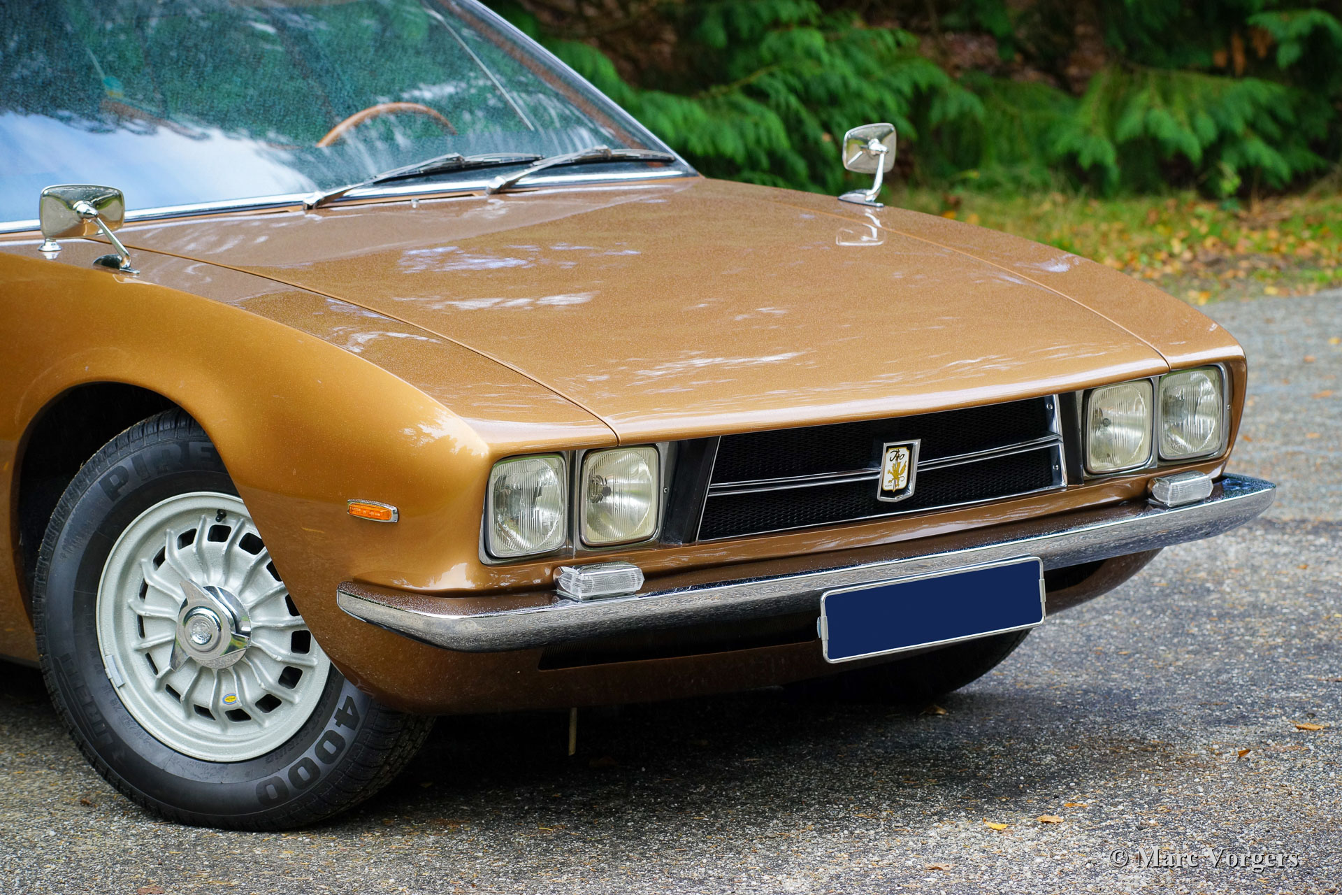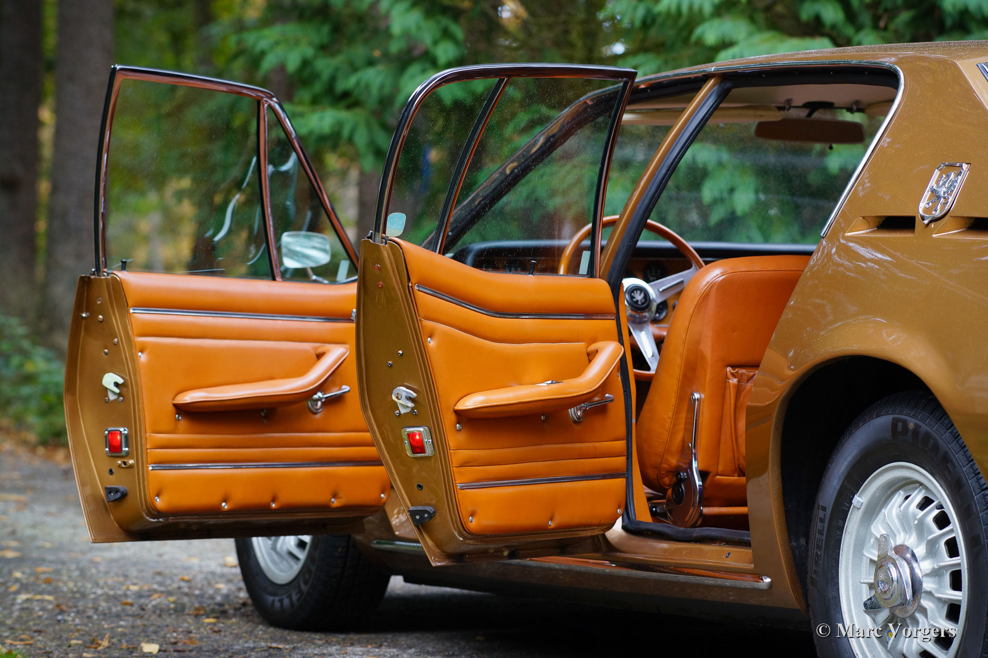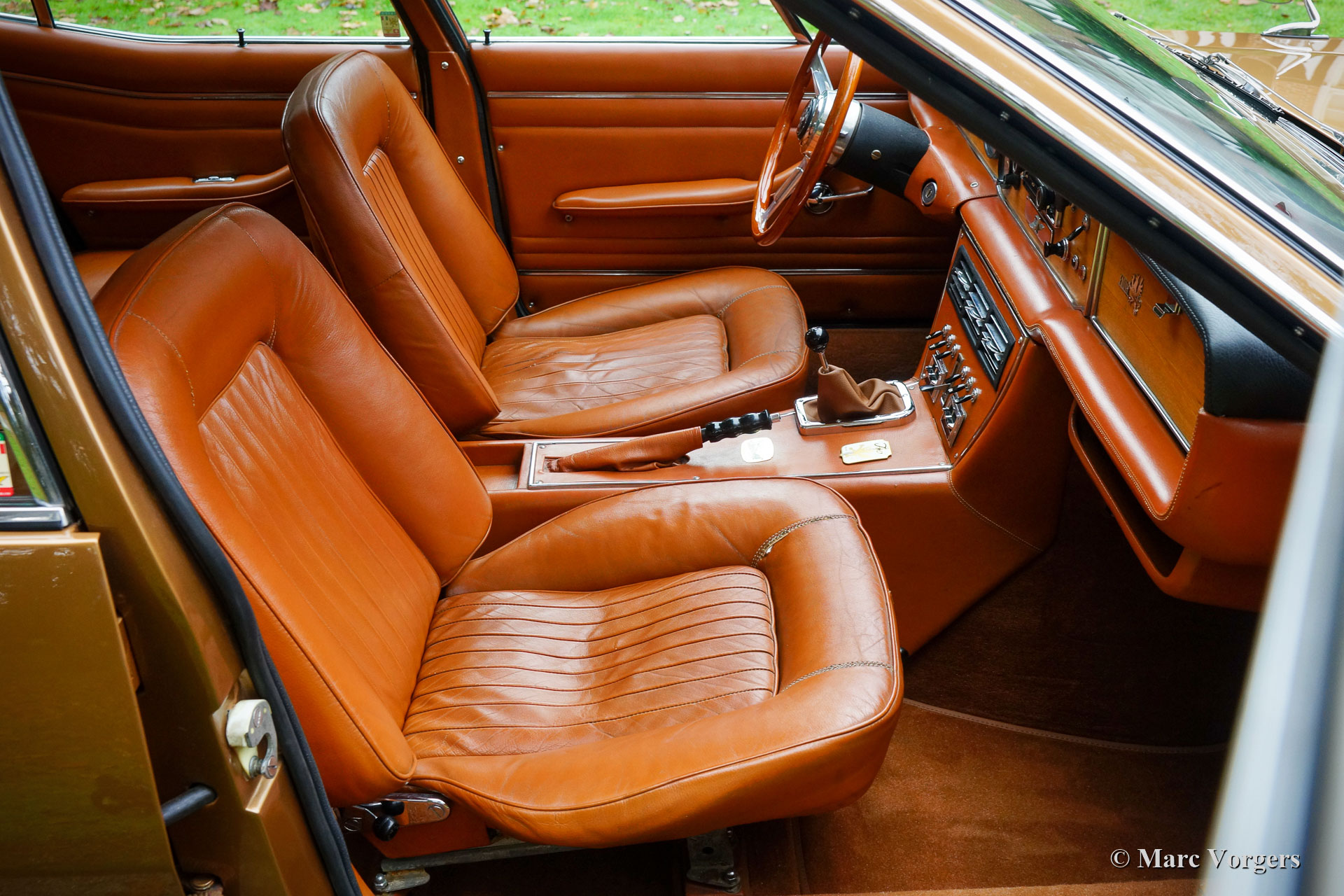 Iso Rivolta Fidia, Jahr 1969. Farbe gold / braun metallic kombiniert mit einer cognacfarbenen Lederausstattung und hellbraunem Teppich. Diese beeindruckende und sehr seltene Iso Fidia wurde in der Schweiz neu verkauft. Im Februar 2015 wurde das Automobil in die Niederlande importiert. Der Iso Fidia ist sehr selten, nur 192 Exemplare wurden von 1967 bis 1974 gebaut. Der von Giugiaro bei Ghia entworfene Iso Fidia gehörte zu den schnellsten viertürigen Limousinen der Zeit. Wie die Sportwagen von Iso Rivolta wurde auch der Fidia von robustem, zuverlässigem und sehr leistungsstarkem Chevrolet (Corvette) V8-Motoren (Ford V8-Motoren von 1973) angetrieben. Dieses wunderschöne Beispiel ist mit einem 5,4-Liter-V8-Motor ausgestattet, der mit einem Viergang-Schaltgetriebe (Vollsynchronisation) kombiniert ist. Die Hinterachse verfügt über ein Sperrdifferential, um die Kraft von 350 Pferden richtig auf die Straße zu bringen. Dieser Iso Fidia ist innen und außen in ausgezeichnetem Zustand und das Auto fährt perfekt! Es ist ein ganz besonderes Gefühl, eine große italienische Luxuslimousine mit V8-Antrieb zu fahren. Das Lederinterieur mit dem hölzernen Armaturenbrett atmet puren Luxus der spät 1960er Jahre, die Servolenkung ist ein Genuss und das Murren des großartigen V8-Motors im Hintergrund rundet das Erlebnis ab. Das Auto ist versehen von wunderschönen Original-Leichtmetallrädern, Pirelli P4000-Reifen und einem Becker Mexico-Stereo-Kassettenradio der Spitzenklasse aus den 1970er Jahren. Dieser Iso Rivolta Fidia ist ein ist ein hervorragendes Beispiel!