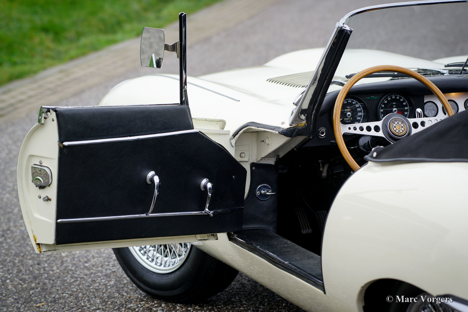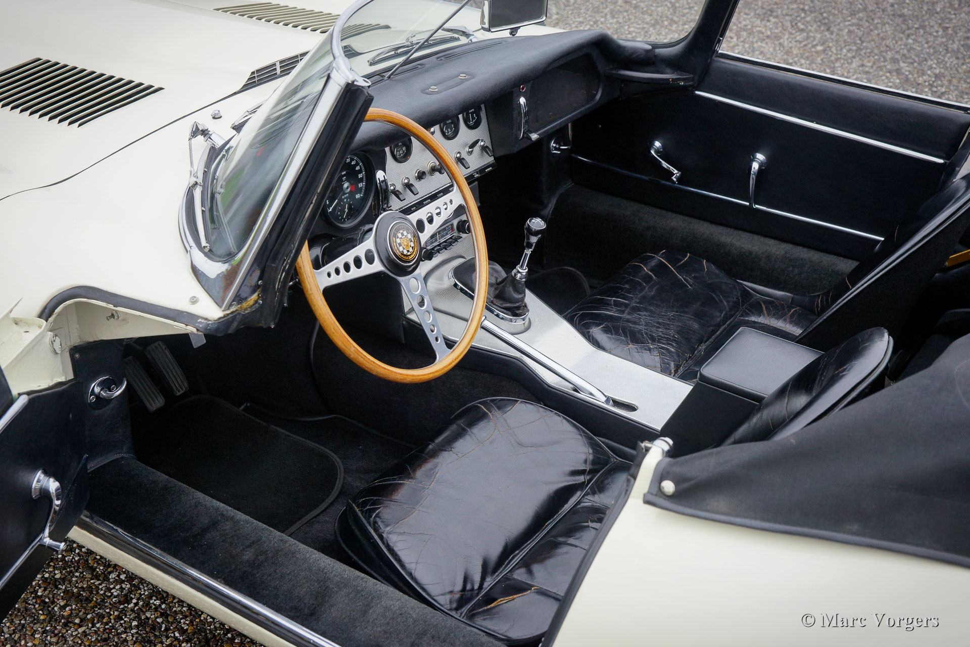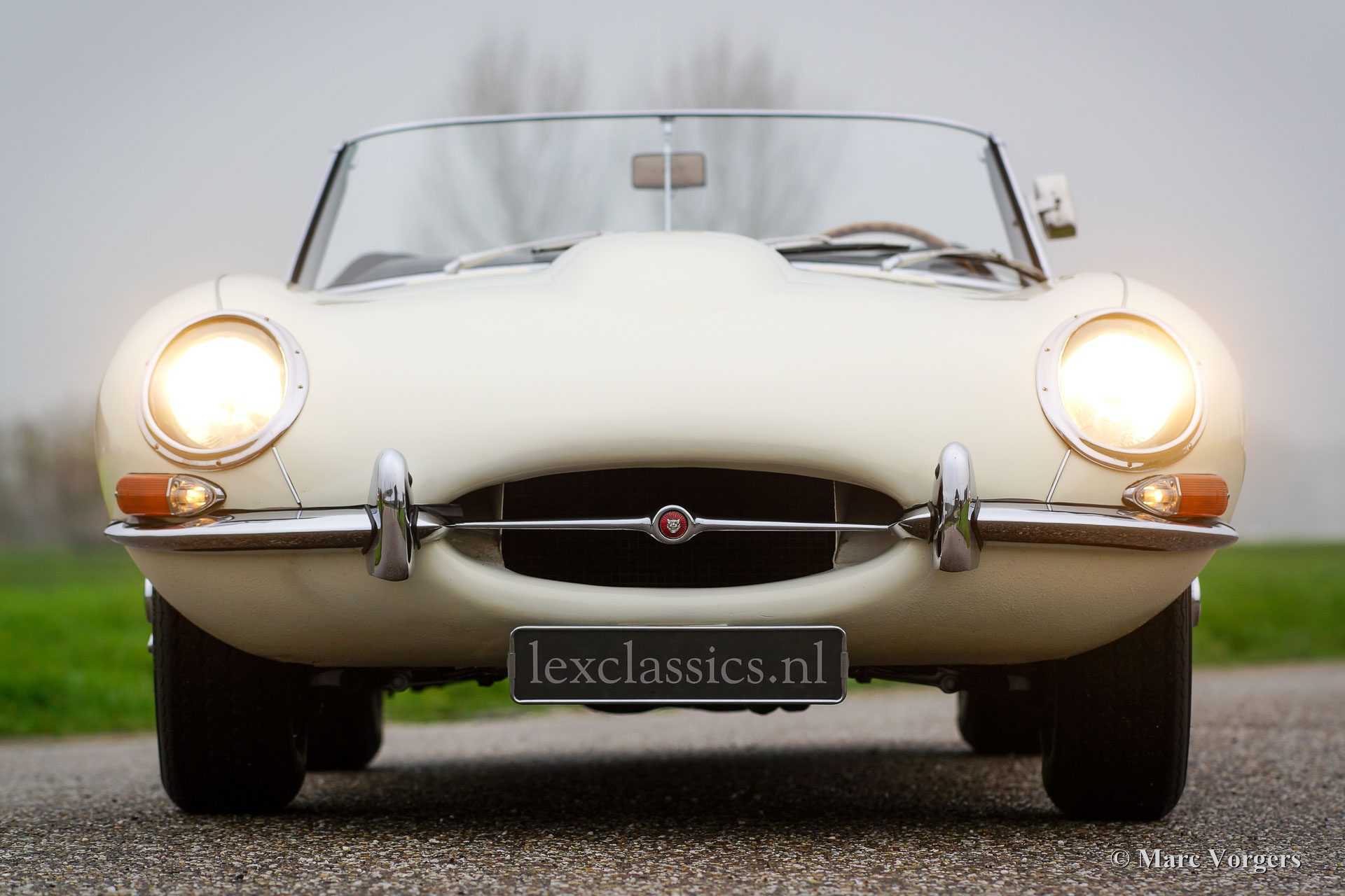 Jaguar E-Type 3,8 Liter OTS Serie 1, Jahr 1962. Farbe Old English White mit schwarzer Lederausstattung und schwarzem Teppich. Schwarzes Mohair-Verdeck und Verdeck-Abdeckung. Dieser prächtige Jaguar E-Type OTS (Open Two Seater, auch Roadster genannt) wurde von Stanley's Motor Services in Sheffield an einen Amerikaner verkauft, der das Auto in Monaco abliefern ließ. Die Originalrechnung ist vorhanden! Im Jahr 1973 wechselte das Auto den Besitzer und es wurde nach Großbritannien exportiert. Im Jahr 2005 wurde das Auto von einem Jaguar-Enthusiasten aus den Niederlanden gekauft. Dieser schöne Jaguar E-Type ist in einem sehr guten Zustand mit leichten Gebrauchs- und Altersspuren. Das Auto fährt hervorragend, und der kraftvolle 3,8-Liter-Motor ist eine wahre Freude! Der E-Type verfügt über Chromspeichenräder, verchromte "knock-off" -Radmuttern, einen Edelstahl-Auspuff und eine elektronische Zündung.