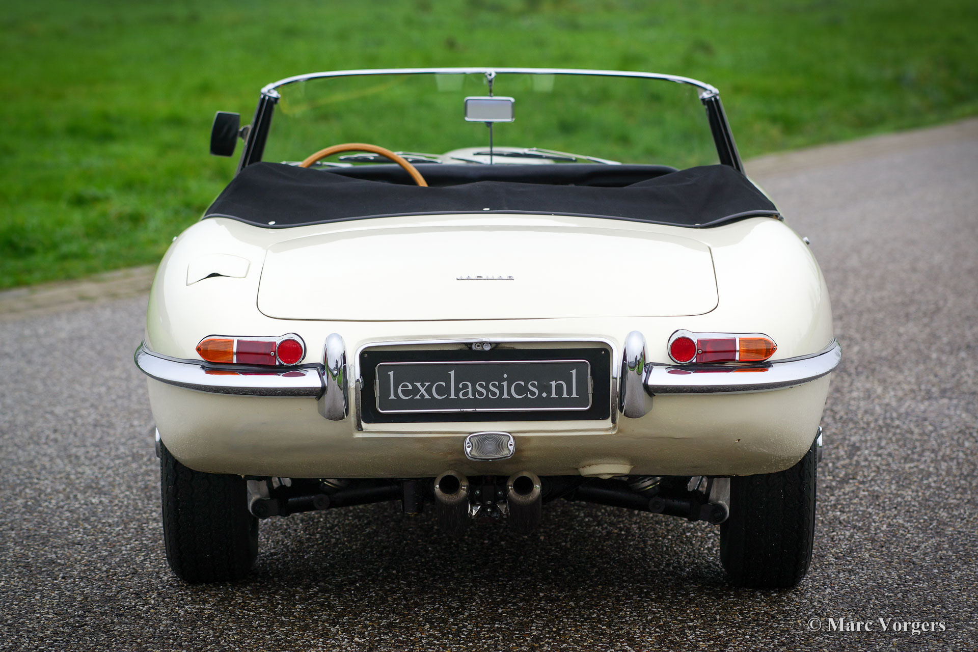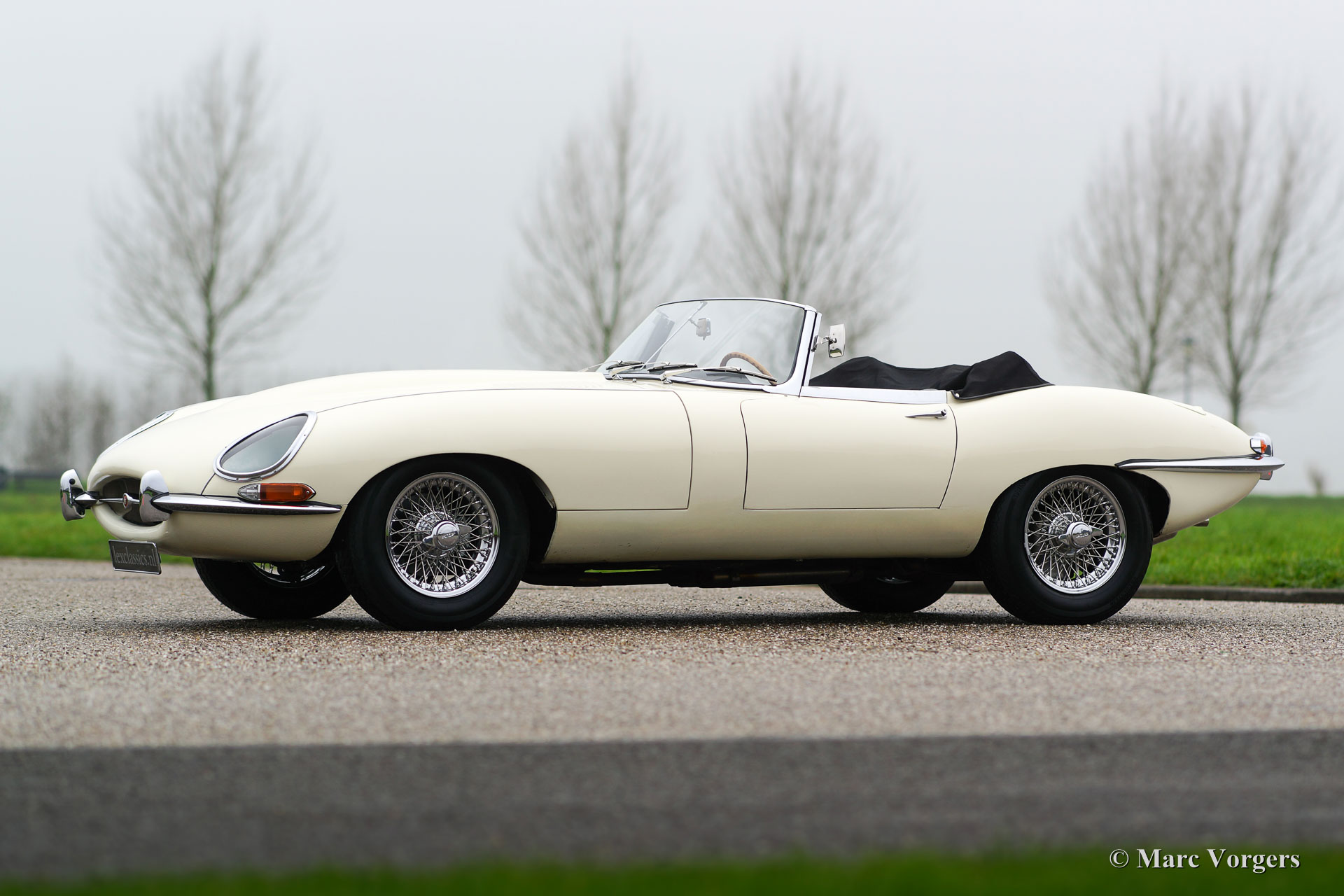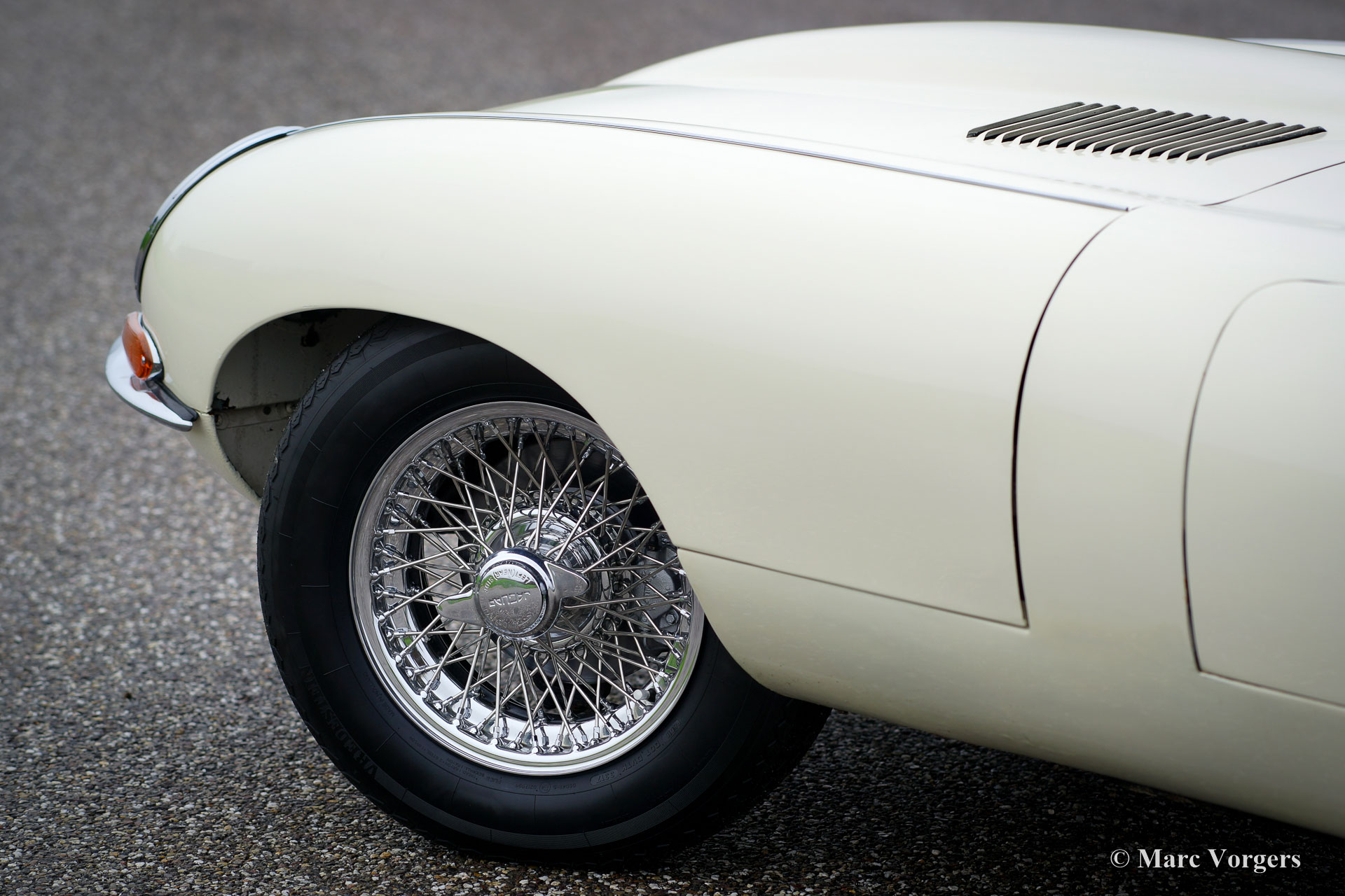 Jaguar E-Type 3,8 Liter OTS Serie 1, Jahr 1962. Farbe Old English White mit schwarzer Lederausstattung und schwarzem Teppich. Schwarzes Mohair-Verdeck und Verdeck-Abdeckung. Dieser prächtige Jaguar E-Type OTS (Open Two Seater, auch Roadster genannt) wurde von Stanley's Motor Services in Sheffield an einen Amerikaner verkauft, der das Auto in Monaco abliefern ließ. Die Originalrechnung ist vorhanden! Im Jahr 1973 wechselte das Auto den Besitzer und es wurde nach Großbritannien exportiert. Im Jahr 2005 wurde das Auto von einem Jaguar-Enthusiasten aus den Niederlanden gekauft. Dieser schöne Jaguar E-Type ist in einem sehr guten Zustand mit leichten Gebrauchs- und Altersspuren. Das Auto fährt hervorragend, und der kraftvolle 3,8-Liter-Motor ist eine wahre Freude! Der E-Type verfügt über Chromspeichenräder, verchromte "knock-off" -Radmuttern, einen Edelstahl-Auspuff und eine elektronische Zündung.
