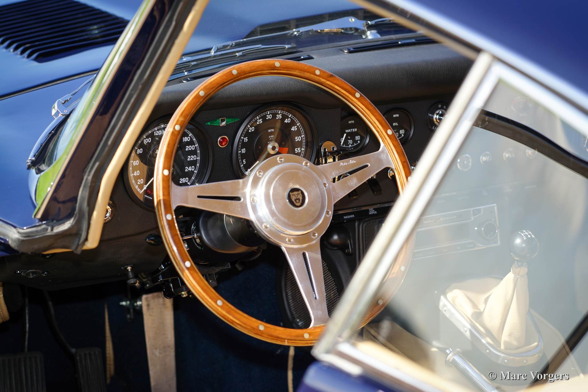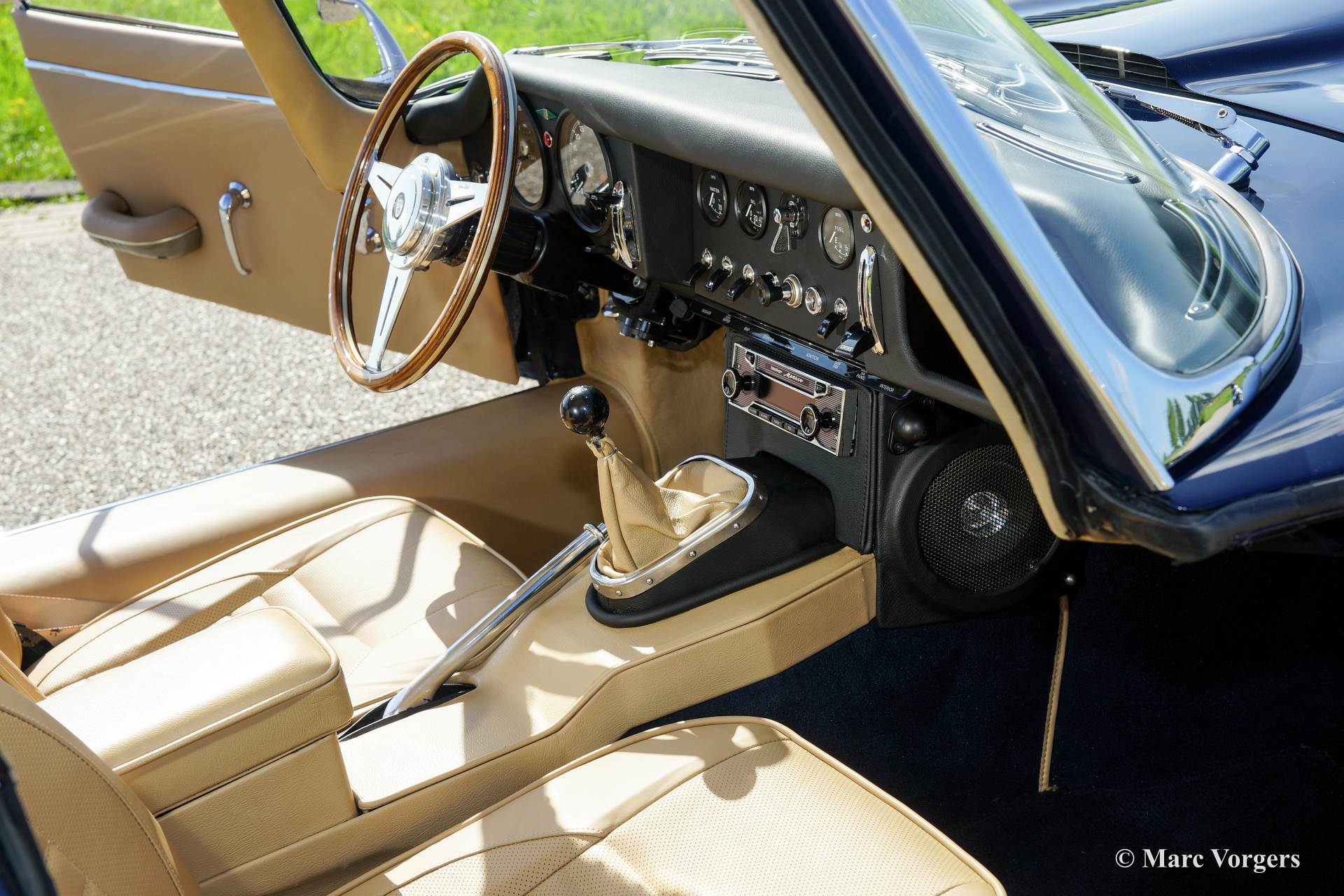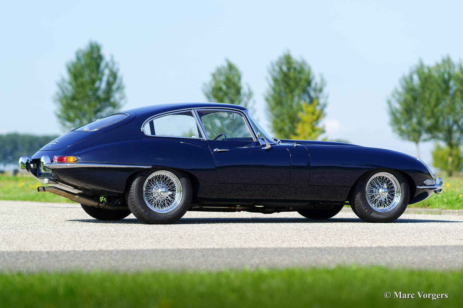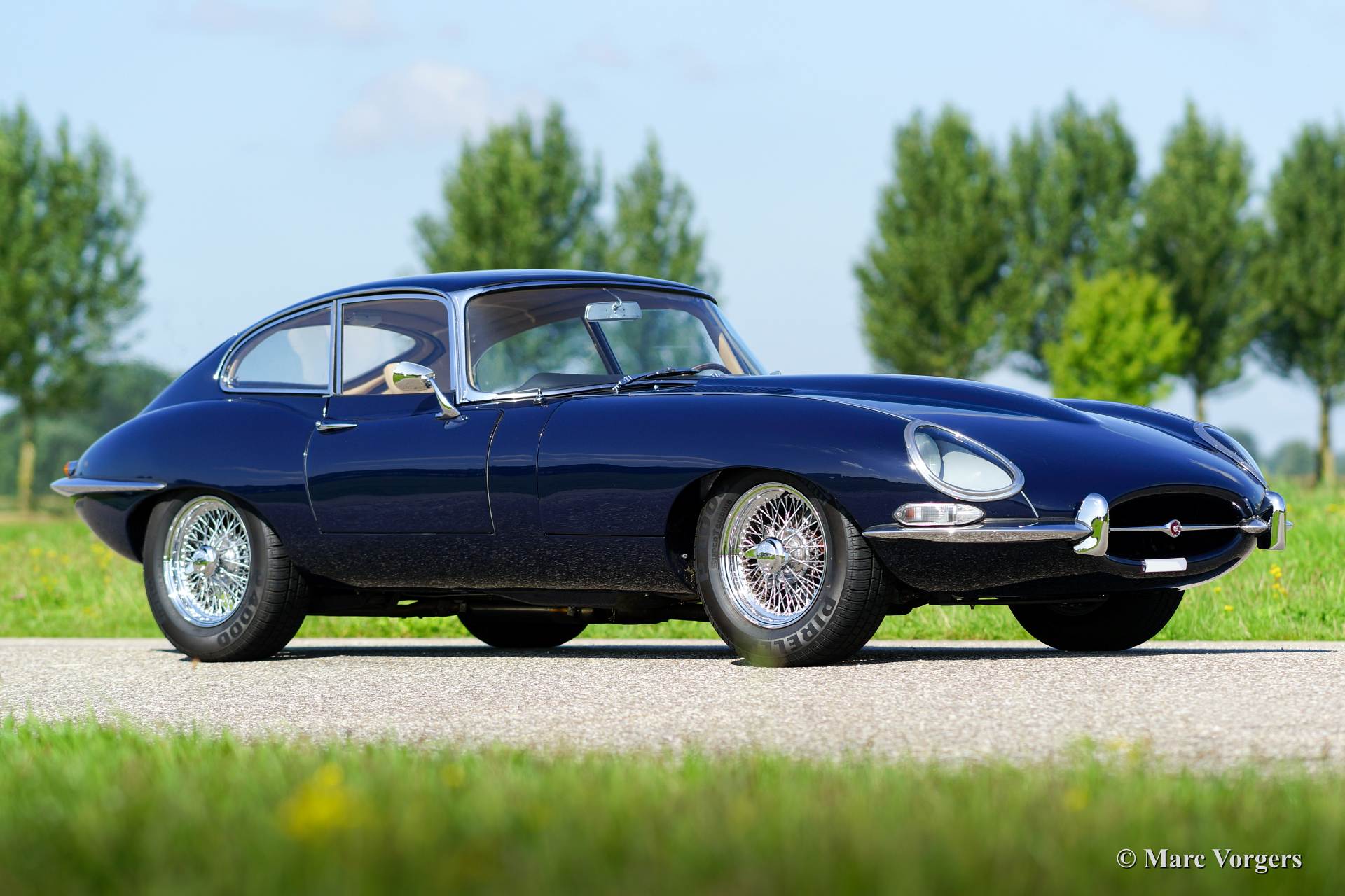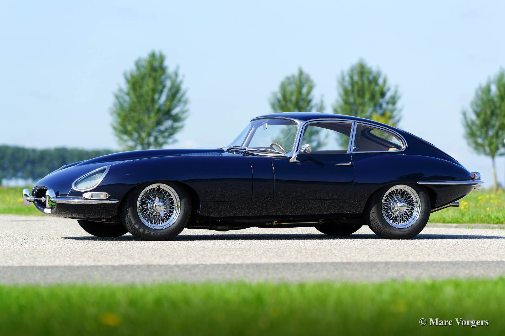 Jaguar E-Type 4.2 Liter FHC, Jahr 1966. Farbe dunkelblau mit einem beigen Leder Interieur. Dieser großartige Jaguar E-Type ‘Fixed Head Coupe‘ (FHC) wurde in den Jahren 2011 - 2014 von einer Restaurationsfirma in den Niederlanden ausgiebig und wunderschön restauriert. Eine umfangreiche Fotoreportage der Restauration ist vorhanden. Der Motor wurde von der renommierten Firma van Giersbergen überholt. Das Bremssystem wurde hoch verbessert und kräftiger gemacht. Dieser wunderschöne Jaguar E-Type Coupé ist im Pracht-TOP-Zustand! Die Fahrgestellnummer und die Motornummer haben ‘Matching Numbers‘, ein Heritage-Zertifikat, das die nummern bestätigt, ist vorhanden. Dieser fabelhafte Jaguar verfügt über ein Getrag 5-Gang-Schaltgetriebe, neue Chromdrahträder mit Michelin-Reifen, ein Moto-Lita Sportlenkrad mit Holzkranz und ein Edelstahl-Auspuff. Dieser E-Typ fährt perfekt, ein TOP-Exemplar!