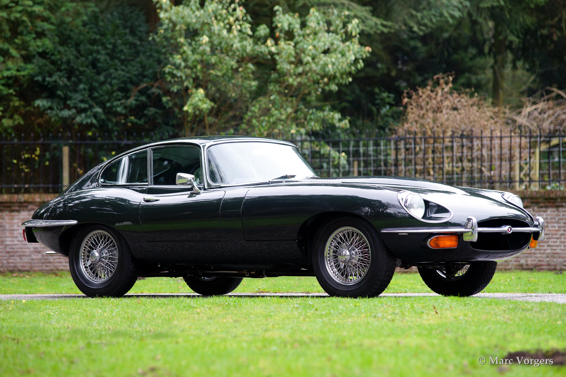 Jaguar E-type 4.2 Litre FHC (Fixed Head Coupe) series 2, year 1969. Colour British Racing Green with a black leather interior. This E-type was extensively restored. The engine was ovehauled to European specifications and fitted with 3 S.U. carburettors