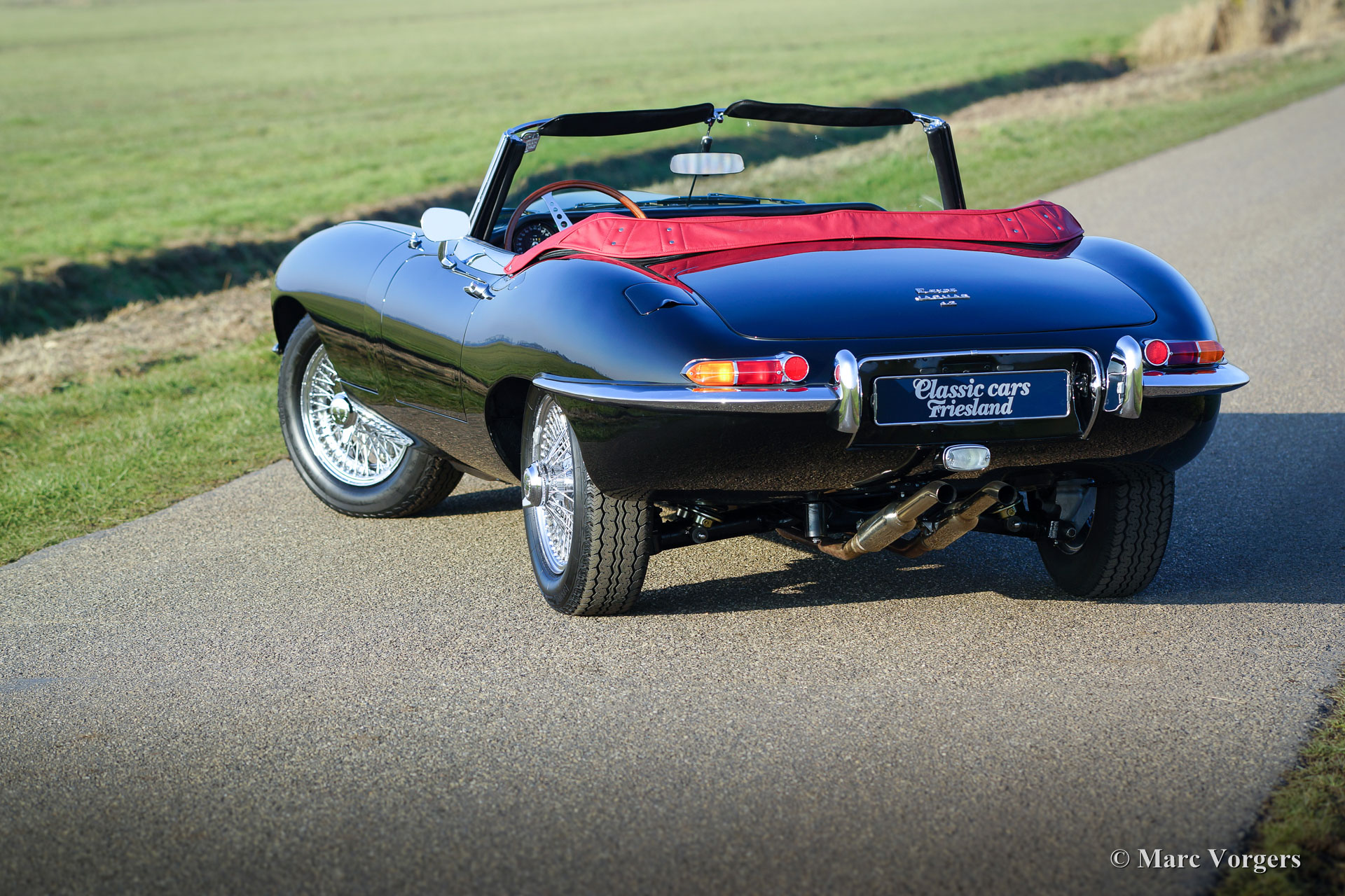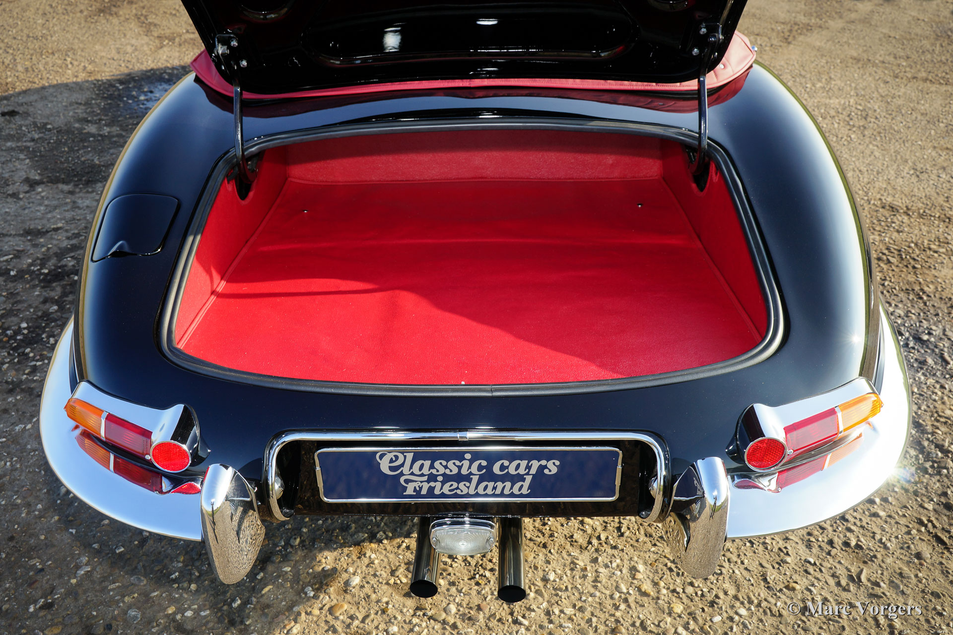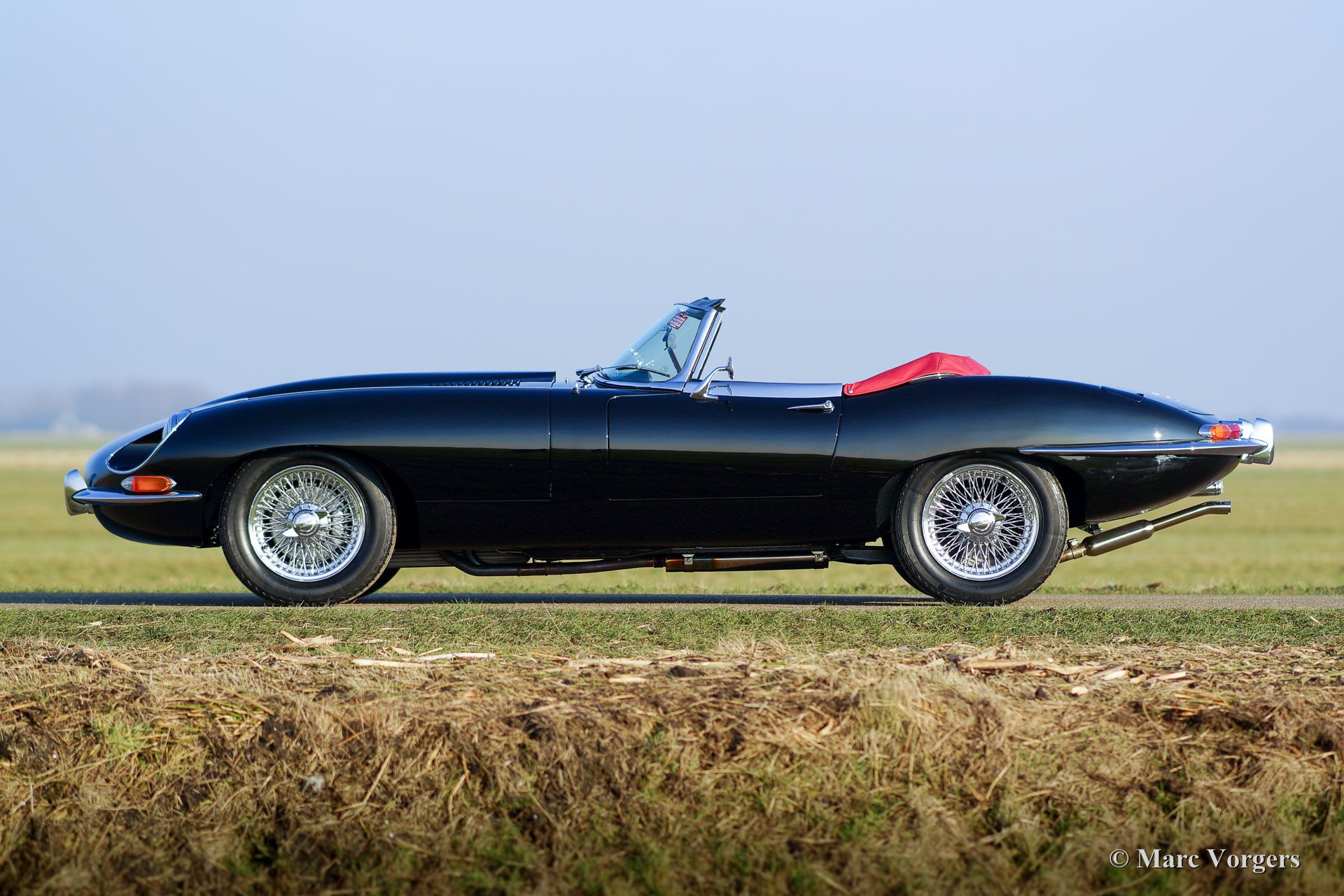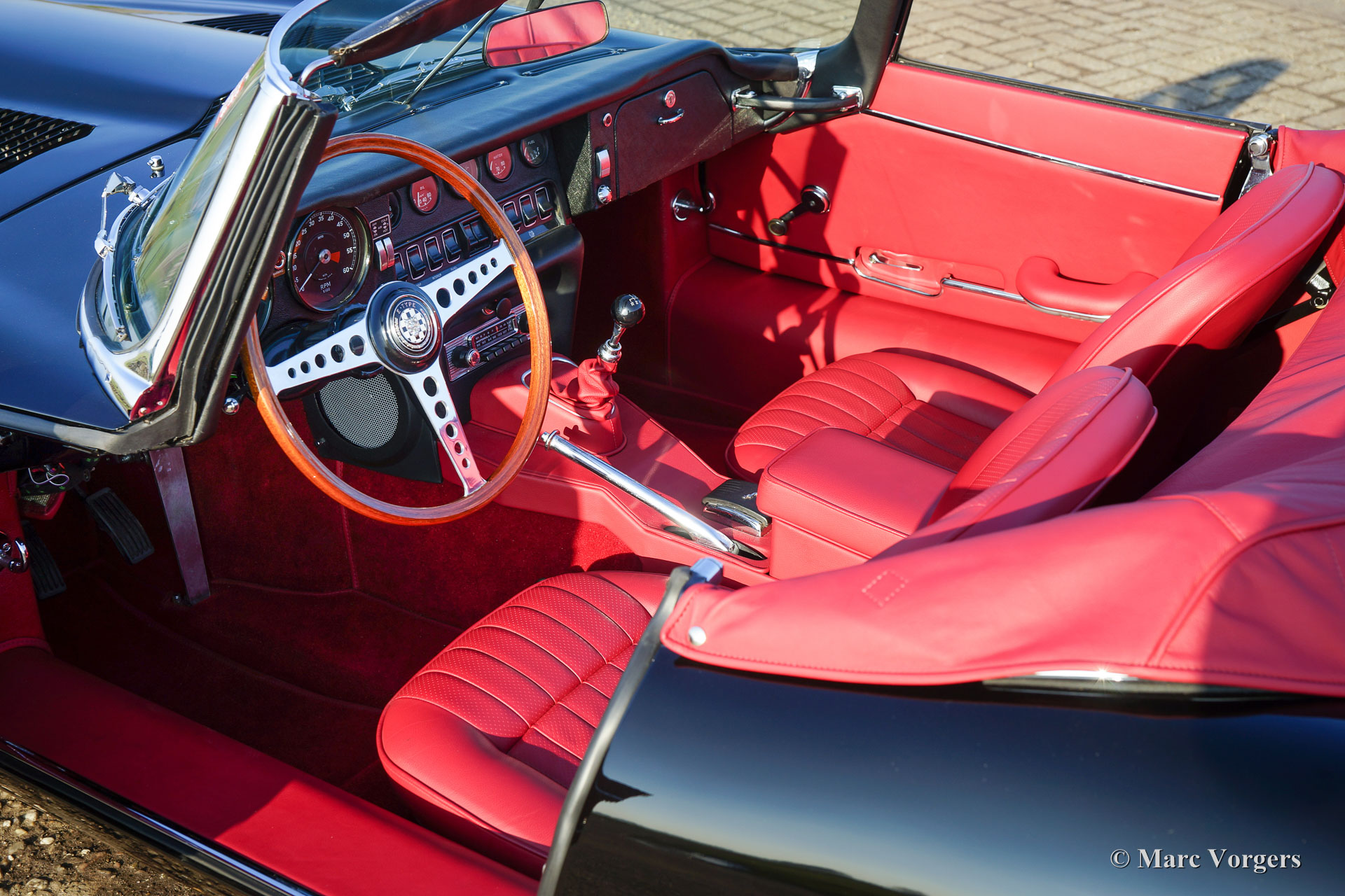 Jaguar E-Type 4,2 Liter OTS Serie 1½, Jahr 1967. Farbe schwarz mit einem roten Leder-Interieur und rotem Teppich. Schwarzes Mohair-Soft-Top und einer roten Verdeck Abdeckung. Dieser wunderbare Jaguar wurde in der Zeit von 2012 bis 2016 komplett restauriert und überholt. Die Restauration wurde sehr sorgfältig durchgeführt, um absolute Perfektion zu erreichen. Die Karosseriearbeit zeigt perfekte Passform, die Chrom Teile sind hervorragend, sowie das brandneu gepolsterte Interieur. Natürlich wurden alle Mechanische und elektrischen Teile überholt und / oder erneuert; Der Motor und das Getriebe wurden selbstverständlich überholt. Eine umfangreiche Fotoreportage der Restauration ist vorhanden, sowie eine Datei mit Rechnungen. Diese wunderschöne Jaguar E-Type (oder XK-E in den USA) ist in einem perfekten concours Zustand und das Auto hat ‘matching numbers‘. Das Auto ist ausgestattet mit Chrom Speichen Räder, Vredestein Sprint Classic-Reifen, ein Edelstahl-Auspuff und ein Original-Moto-Lita Lenkrad mit Holzkranz. Dieser Jaguar E-Type Open Two Seater (OTS), auch Roadster genannt, ist ein TOP-exemplar!